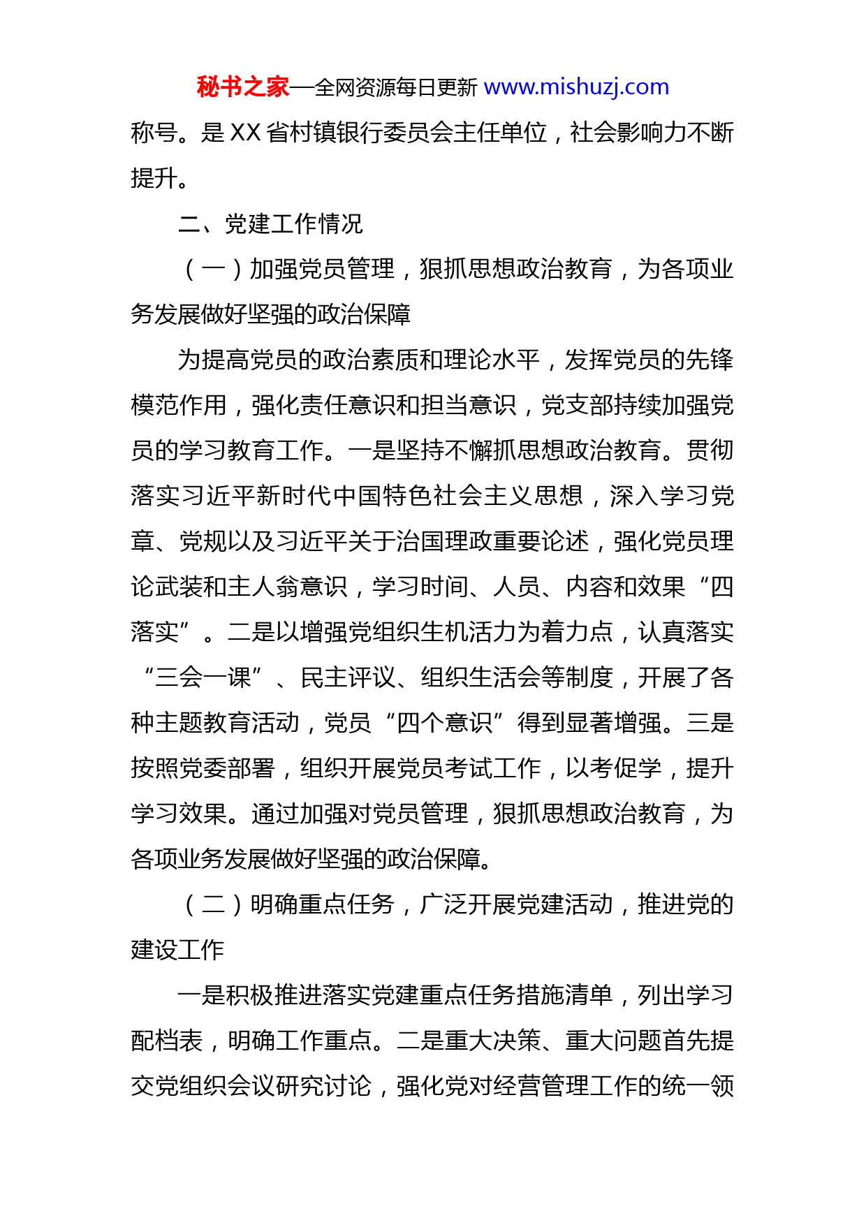 秘书之家—全网资源每日更新www.mishuzj.com某村镇银行2022年半年党建工作报告在总行党委、村镇银行管理部党委的坚强领导下,XX村镇银行深入贯彻党的十九大和十九届二中、三中、四中、五中、六中全会精神,深刻领会习近平总书记新时代中国特色社会主义思想,坚持党建引领,加强党员管理,发挥党支部的战斗堡垒作用和党员的先锋模范作用,为推进我行稳健发展提供了坚强政治保障、组织保障。下面将党建工作情况汇报如下:一、基本情况(一)党支部情况中共XX村镇银行党支部设支部书记1名、纪检委员兼组织委员1名、宣传委员兼青年委员1名,党员共33名。(二)总体经营情况今年以来,我行坚持党建引领,不忘初心,牢记“支农支小”使命,按照“强化管理、调整结构、提质增效、稳健发展”的经营方针,不断强化合规管理和品牌建设,总体保持稳健发展。在全省118家村镇银行中,我行存款、贷款排名第五位,利润排名第三位,XX8家村行中继续保持首位,获“全国百强村镇银行”、省级“文明单位”,荣获“XX区支持实体经济突出贡献单位”、“XX纳税百强企业”、“XX市金融统计工作先进集体”等荣誉秘书之家—全网资源每日更新www.mishuzj.com称号。是XX省村镇银行委员会主任单位,社会影响力不断提升。二、党建工作情况(一)加强党员管理,狠抓思想政治教育,为各项业务发展做好坚强的政治保障为提高党员的政治素质和理论水平,发挥党员的先锋模范作用,强化责任意识和担当意识,党支部持续加强党员的学习教育工作。一是坚持不懈抓思想政治教育。贯彻落实习近平新时代中国特色社会主义思想,深入学习党章、党规以及习近平关于治国理政重要论述,强化党员理论武装和主人翁意识,学习时间、人员、内容和效果“四落实”。二是以增强党组织生机活力为着力点,认真落实“三会一课”、民主评议、组织生活会等制度,开展了各种主题教育活动,党员“四个意识”得到显著增强。三是按照党委部署,组织开展党员考试工作,以考促学,提升学习效果。通过加强对党员管理,狠抓思想政治教育,为各项业务发展做好坚强的政治保障。(二)明确重点任务,广泛开展党建活动,推进党的建设工作一是积极推进落实党建重点任务措施清单,列出学习配档表,明确工作重点。二是重大决策、重大问题首先提交党组织会议研究讨论,强化党对经营管理工作的统一领秘书之家—全网资源每日更新www.mishuzj.com导。三是实施“书记项目、党员公关项目”,党支部书记为第一责任人,带头抓党建,使基层党建工作化“虚”为“实”。四是对日常学习内容列出清单,加强督导,并对党员笔记定期检查通报。目前我行共121名干部职工,其中共产党员33人,占全部员工的27.3%。党支部按照“三会一课”要求,每月组织召开支部会议,组织全体党员集中学习。今年以来召开支部会议16次,召开民主生活会1次,召开党课10次,及时传达党委会议精神,开展了抗疫党员志愿服务、街道结对共建活动,党建引领携手促进精准扶贫,公益环保活动等。(三)完善相关设施,加强党的标准化建设按照标准化要求,不断完善软硬件设施。一是修订完善支部学习制度、会议制度等,完善制度体系,营造良好的党建文化氛围。二是对党员活动室制度上墙,进一步优化了党员学习活动环境,活动室配置了健身器、跑步机、乒乓球台等健身娱乐设施,员工利用休息时间进行体育锻炼和休闲娱乐,丰富员工文体生活。三是党组织紧密联系群众,对党员干部职工思想动态变化及时掌握,春节期间对员工进行家访,帮助解决实际困难,让他们全身心地投入到工作中。(四)加强纪检工作,高度重视案件防控秘书之家—全网资源每日更新www.mishuzj.com上半年全面开展员工行为排查,通过工商、征信、涉诉以及账户监控等方式对全员进行异常行为排查。建立员工直系亲属经商名录,对员工进行警示教育,7月份召开了全行警示教育会议;加强案防合规学习,完成案防合规考试全员覆盖工作。另外平时注重加强飞行检查,加强违规处罚,严防员工八小时内外的道德风险,杜绝各类案防和事件的发生。三、下一步的工作计划结合党建工作实际,下一步我行将从以下几方面进行完善:(一)强化理论学习,加强思想教育一是学习内容更加深入。更加系统深入的学习贯彻党的二十大会议精神、习近平新时代中国特色社会主义思想以及习近平总书记系列重要讲话精神。加强对党章、党规、纪律处分条例、廉洁自律准则的集中培训,引导党员干部不断增强四个意识,切实提高风险意识、危机意识和责任意识。扎实开展好“不忘初心、牢记使命”主题教育。二是学习方式更加丰富。做好学习计划,扩展学习方式,积极通过学习考试、知识竞赛、演讲比赛等方式,进一步活跃学习气氛,提升学习效果。三是理论与实际相结合。对学习的相关理论知识,与实际工作相结合,对照要求、分析不足、剖析原因、积极改进,切实将学习的知识秘书之家—全网资源每日更新www.mishuzj.com应用到实际工作中和日常生活中,学以致用。(二)加强作风建设,发挥党员带头作用一是强化责任担当意识。各级领导干部以身作则,严格要求自己,提高党员的政治意识,带头冲锋,身先士卒,积极争先,为全行员工树立榜样,并优先提拔敢于担当、迎难而上的干部,切实发挥党员的模范带头作用,发挥党支部战斗堡垒作