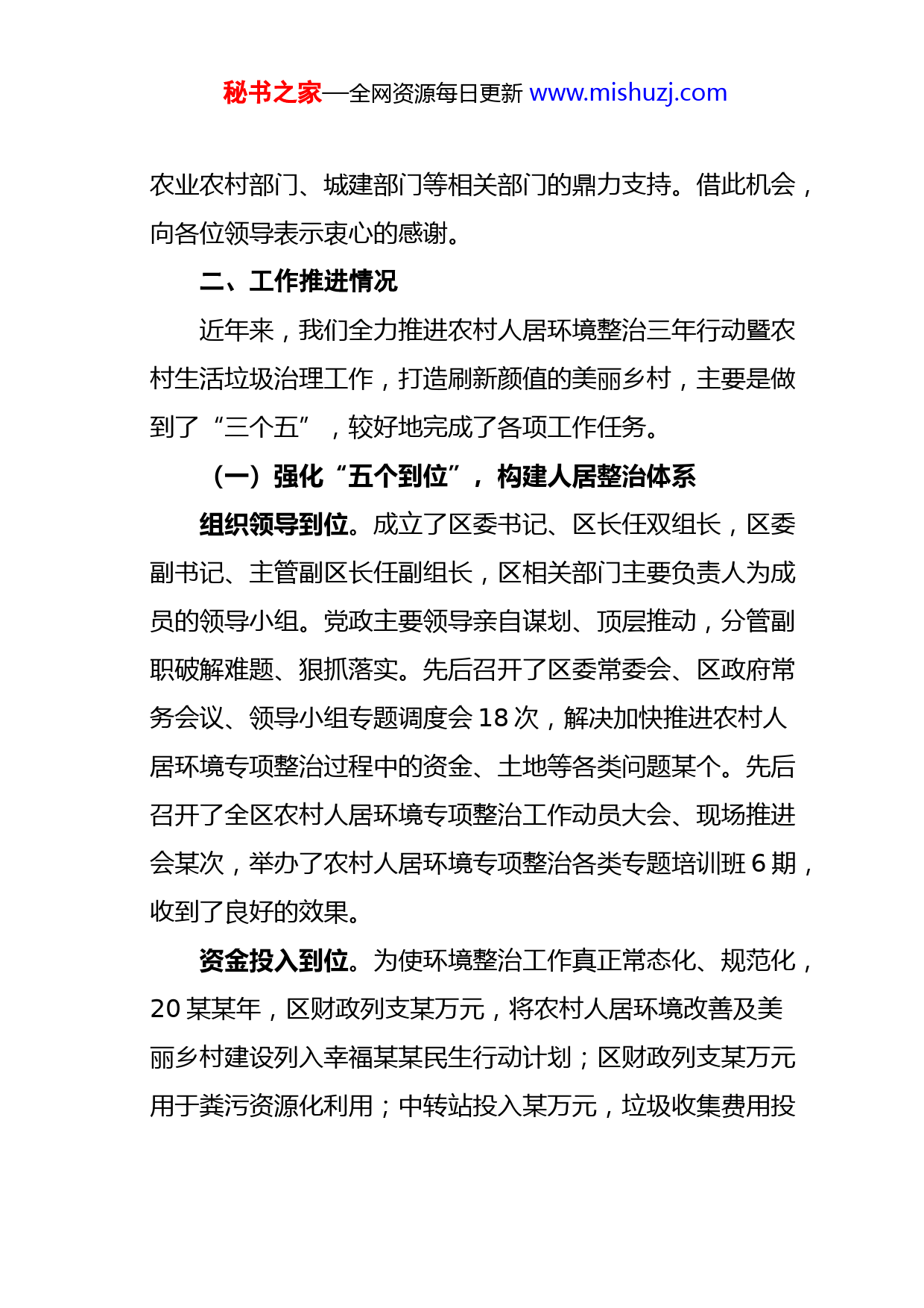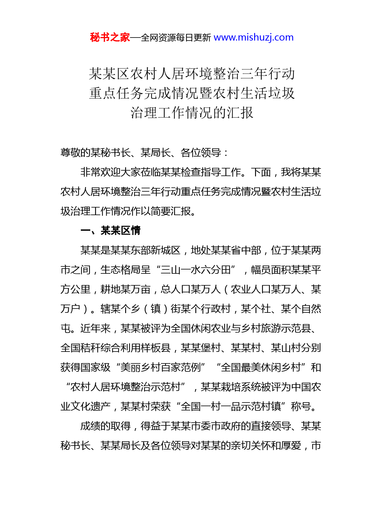 秘书之家—全网资源每日更新www.mishuzj.com某某区农村人居环境整治三年行动重点任务完成情况暨农村生活垃圾治理工作情况的汇报尊敬的某秘书长、某局长、各位领导:非常欢迎大家莅临某某检查指导工作。下面,我将某某农村人居环境整治三年行动重点任务完成情况暨农村生活垃圾治理工作情况作以简要汇报。一、某某区情某某是某某东部新城区,地处某某省中部,位于某某两市之间,生态格局呈“三山一水六分田”,幅员面积某某平方公里,耕地某万亩,总人口某万人(农业人口某万人、某万户)。辖某个乡(镇)街某个行政村,某个社、某个自然屯。近年来,某某被评为全国休闲农业与乡村旅游示范县、全国秸秆综合利用样板县,某某堡村、某某村、某山村分别获得国家级“美丽乡村百家范例”“全国最美休闲乡村”和“农村人居环境整治示范村”,某某栽培系统被评为中国农业文化遗产,某某村荣获“全国一村一品示范村镇”称号。成绩的取得,得益于某某市委市政府的直接领导、某某秘书长、某某局长及各位领导对某某的亲切关怀和厚爱,市秘书之家—全网资源每日更新www.mishuzj.com农业农村部门、城建部门等相关部门的鼎力支持。借此机会,向各位领导表示衷心的感谢。二、工作推进情况近年来,我们全力推进农村人居环境整治三年行动暨农村生活垃圾治理工作,打造刷新颜值的美丽乡村,主要是做到了“三个五”,较好地完成了各项工作任务。(一)强化“五个到位”,构建人居整治体系组织领导到位。成立了区委书记、区长任双组长,区委副书记、主管副区长任副组长,区相关部门主要负责人为成员的领导小组。党政主要领导亲自谋划、顶层推动,分管副职破解难题、狠抓落实。先后召开了区委常委会、区政府常务会议、领导小组专题调度会18次,解决加快推进农村人居环境专项整治过程中的资金、土地等各类问题某个。先后召开了全区农村人居环境专项整治工作动员大会、现场推进会某次,举办了农村人居环境专项整治各类专题培训班6期,收到了良好的效果。资金投入到位。为使环境整治工作真正常态化、规范化,20某某年,区财政列支某万元,将农村人居环境改善及美丽乡村建设列入幸福某某民生行动计划;区财政列支某万元用于粪污资源化利用;中转站投入某万元,垃圾收集费用投秘书之家—全网资源每日更新www.mishuzj.com入某万元;某个行政村每村从村集体收入或转移支付中列支某万元,共计某万元用于人居环境整治,通过财政年均人居环境投入某亿元,带动社会资本、公益资金、群众自筹等投入某亿元,形成多元化投入格局,把某某乡村建设成生活舒适的乐园、道德示范的家园、生态良好的田园、乡愁记忆的故园。规划落实到位。某某市农村人居环境整治工作动员大会召开后,某某区委区政府高度重视,迅速行动,先后出台了《某某区美丽乡村建设总体规划》《某某市某某区关于开展农村人居环境集中整治行动的实施意见》《某某区农村人居环境改善工程实施方案》等某个文件,将任务层层分解。坚持区、乡(镇、街)村三级书记抓,发挥好包乡包村包户领导、行业干部等力量作用,统筹推进村容村貌提升、生活垃圾治理、厕所改造、污水治理、畜禽粪污治理等“五项工程”,练好人居环境的内功。考核督导到位。制定出台了《某某区农村人居环境整治考核细则》《某某区河长制考核问责办法》等系列考核,年终兑现奖惩,并实行“一票否决”制。定期督导,下发通报、简报,利用智慧乡村平台加强监测,加大问责力度,做到了责任清晰、标准清楚。明确了横向到边,纵向到底的监管职秘书之家—全网资源每日更新www.mishuzj.com责,人居环境整治不断取得新成效。机制建立到位。建立健全了村庄道路清扫保洁长效机制、违法用地和违法建设查处机制、人居环境建设和管护长效机制;健全完善了环境治理依效付费制度、服务绩效评价考核机制等一系列长效机制,确保如期完成人居环境整治硬任务。(二)开展“五项行动”,打造美丽宜居乡村典型示范引领行动。依托地域优势、资源禀赋、产业特色和文化形态,突出重点、分类打造清水产业带动型、马鞍山三产融合型、平安堡旅游拉动型、山咀扶贫推动型、龙家堡整治提升型、大贝村民自治型六种农村人居环境集中整治模式。通过示范引领,推进农业展现新质态,农村展现新面貌,农民展现新风采。乡村环境提升行动。美丽乡村既要有外在美,更要有内涵和品质。某某区既着力提升农村人居环境质量和村庄美化效果,提高农民生活品质,又彰显各地鲜明特色,注重乡情、乡风、乡愁和乡土气息的挖掘和传承,保持农村田园风貌,促进人与自然和谐共生,村庄形态与自然环境相得益彰。大力实施“四边两村一大道”绿美工程,村屯植绿950公里,跳跃的新绿携手迎风,构建生态家园。全民参与共建行动。人居环境的治本之策在于群众参与。秘书之家—全网资源每日更新www.mishuzj.com家家树新风,才能村村换新貌。抓村规民约推动,按照每人每天5分钱收取环境卫生费,增强群众的主体意识。抓积分奖励促动,开展网络投票,评选“干净人家”、“美丽庭院”,开办积分奖励兑换超市,以丰富的物质奖励,促进户户比卫生、家家比干净良好习惯的养成。抓志愿服务带动,组建某支志愿服务队,出动某万名志愿者进村庄、进庭院,
