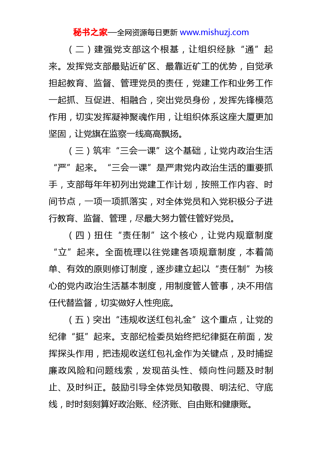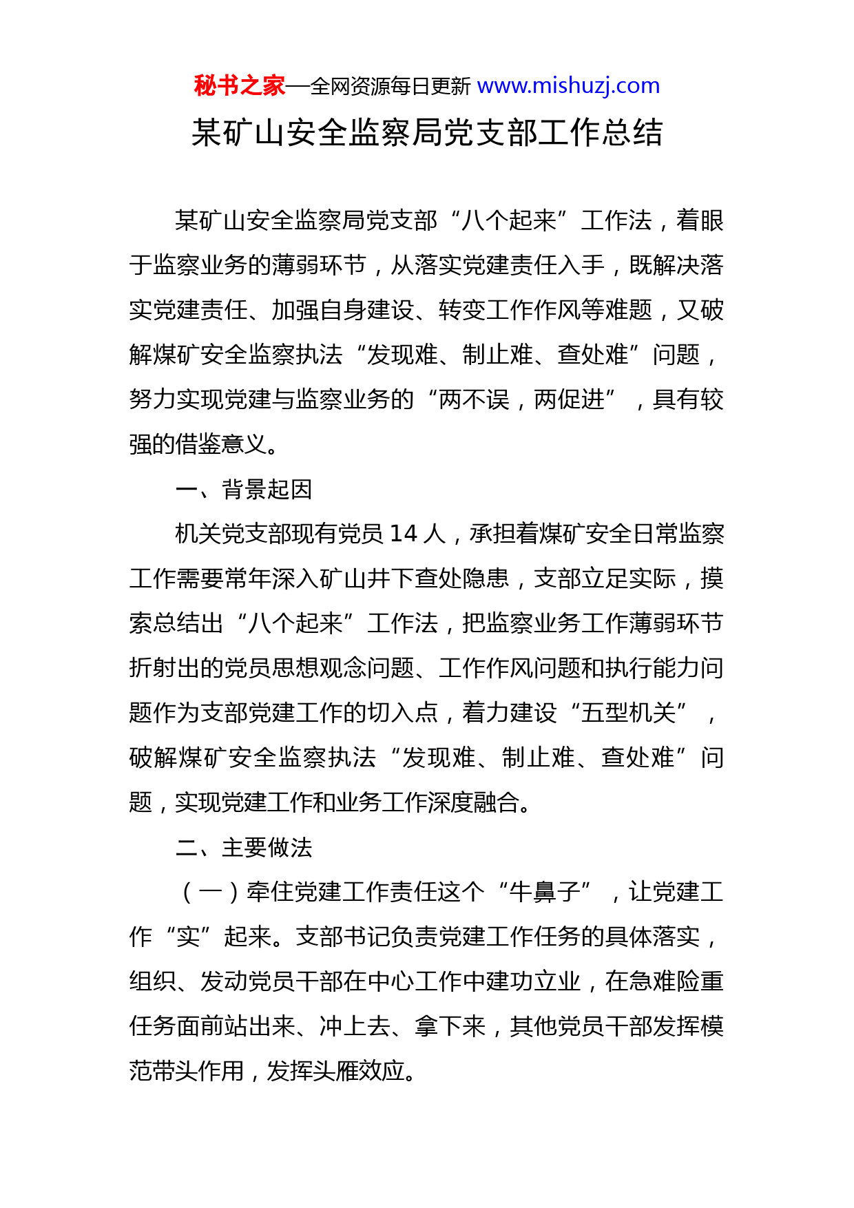 秘书之家—全网资源每日更新www.mishuzj.com某矿山安全监察局党支部工作总结某矿山安全监察局党支部“八个起来”工作法,着眼于监察业务的薄弱环节,从落实党建责任入手,既解决落实党建责任、加强自身建设、转变工作作风等难题,又破解煤矿安全监察执法“发现难、制止难、查处难”问题,努力实现党建与监察业务的“两不误,两促进”,具有较强的借鉴意义。一、背景起因机关党支部现有党员14人,承担着煤矿安全日常监察工作需要常年深入矿山井下查处隐患,支部立足实际,摸索总结出“八个起来”工作法,把监察业务工作薄弱环节折射出的党员思想观念问题、工作作风问题和执行能力问题作为支部党建工作的切入点,着力建设“五型机关”,破解煤矿安全监察执法“发现难、制止难、查处难”问题,实现党建工作和业务工作深度融合。二、主要做法(一)牵住党建工作责任这个“牛鼻子”,让党建工作“实”起来。支部书记负责党建工作任务的具体落实,组织、发动党员干部在中心工作中建功立业,在急难险重任务面前站出来、冲上去、拿下来,其他党员干部发挥模范带头作用,发挥头雁效应。秘书之家—全网资源每日更新www.mishuzj.com(二)建强党支部这个根基,让组织经脉“通”起来。发挥党支部最贴近矿区、最靠近矿工的优势,自觉承担起教育、监督、管理党员的责任,党建工作和业务工作一起抓、互促进、相融合,突出党员身份,发挥先锋模范作用,切实发挥凝神聚魂作用,让组织体系这座大厦更加坚固,让党旗在监察一线高高飘扬。(三)筑牢“三会一课”这个基础,让党内政治生活“严”起来。“三会一课”是严肃党内政治生活的重要抓手,支部每年年初列出党建工作计划,按照工作内容、时间节点,一项一项抓落实,对全体党员和入党积极分子进行教育、监督、管理,尽最大努力管住管好党员。(四)扭住“责任制”这个核心,让党内规章制度“立”起来。全面梳理以往党建各项规章制度,本着简单、有效的原则修订制度,逐步建立起以“责任制”为核心的党内政治生活基本制度,用制度管人管事,决不用信任代替监督,切实做好人性兜底。(五)突出“违规收送红包礼金”这个重点,让党的纪律“挺”起来。支部纪检委员始终把纪律挺在前面,发挥探头作用,把违规收送红包礼金作为关键点,及时捕捉廉政风险和问题线索,发现苗头性、倾向性问题及时制止、及时纠正。鼓励引导全体党员知敬畏、明法纪、守底线,时时刻刻算好政治账、经济账、自由账和健康账。秘书之家—全网资源每日更新www.mishuzj.com(六)利用好新媒体这个工具,让全体党员“动”起来。根据煤矿安全监察工作监察任务重,人员难以集中的特点,支部灵活运用微信群、视频会商系统、OA系统、学习强国等适时推送学习材料。组织党员过好组织生活,既亲身感受组织温暖,又在煤矿安全监察工作中得到锻炼和成长。(七)紧扣“中央八项规定精神”这个切入口,让工作作风“转”起来。始终把两清单管理贯穿党员教育、监督、管理的全过程,每半年对其执行情况进行一次回头看式的对照检查,发现问题,及时纠正,抓早抓小。支部委员带头转变工作作风,坚持理论学习走在前,学懂弄通做示范,担当作为树标杆,在竭诚为民中、在煤矿安全监察中锤炼党性。(八)紧抓年轻干部这个群体,让党组织的血液“活”起来。成立青年理论学习小组,组织开展青年读书活动、选树青年学习标兵,培养青年党员运用马克思主义观点和方法分析解决煤矿安全监察工作中问题的能力,建立青年突击队,分配一些临时性、艰巨性工作任务,培养青年党员驾驭全局的组织协调能力,在急难险重中磨练青年党员。三、成效启示通过大力推行“八个起来”工作法,机关党支部党的秘书之家—全网资源每日更新www.mishuzj.com建设取得了新进展,支部战斗堡垒作用和党员的先锋模范作用得到充分发挥,基层党建工作和监察业务工作做到了“两不误,两促进”。2017至2022年连续六年被省委直属机关工委评定为“五星级党支部”荣誉称号,2021年9月被省委直属机关工委命名为“省直机关标准化规范化建设示范党支部”。