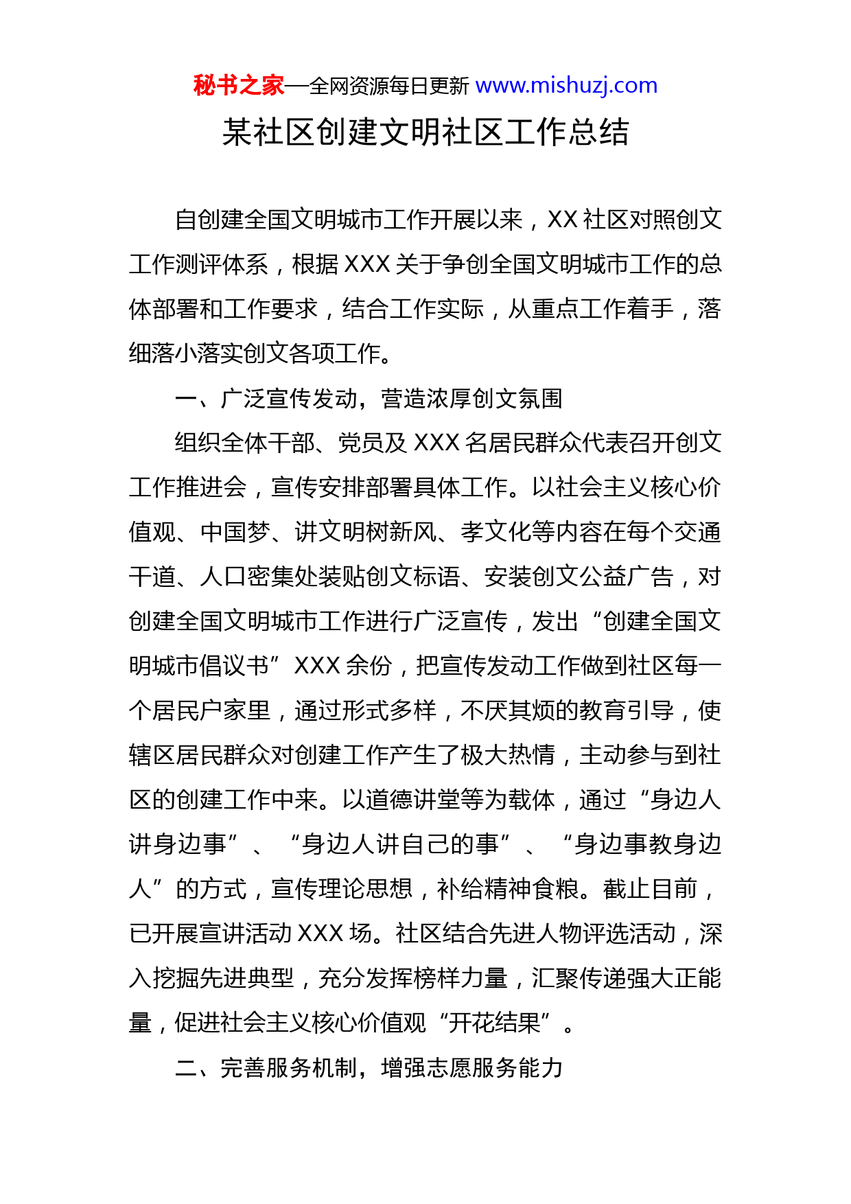 秘书之家—全网资源每日更新www.mishuzj.com某社区创建文明社区工作总结自创建全国文明城市工作开展以来,XX社区对照创文工作测评体系,根据XXX关于争创全国文明城市工作的总体部署和工作要求,结合工作实际,从重点工作着手,落细落小落实创文各项工作。一、广泛宣传发动,营造浓厚创文氛围组织全体干部、党员及XXX名居民群众代表召开创文工作推进会,宣传安排部署具体工作。以社会主义核心价值观、中国梦、讲文明树新风、孝文化等内容在每个交通干道、人口密集处装贴创文标语、安装创文公益广告,对创建全国文明城市工作进行广泛宣传,发出“创建全国文明城市倡议书”XXX余份,把宣传发动工作做到社区每一个居民户家里,通过形式多样,不厌其烦的教育引导,使辖区居民群众对创建工作产生了极大热情,主动参与到社区的创建工作中来。以道德讲堂等为载体,通过“身边人讲身边事”、“身边人讲自己的事”、“身边事教身边人”的方式,宣传理论思想,补给精神食粮。截止目前,已开展宣讲活动XXX场。社区结合先进人物评选活动,深入挖掘先进典型,充分发挥榜样力量,汇聚传递强大正能量,促进社会主义核心价值观“开花结果”。二、完善服务机制,增强志愿服务能力秘书之家—全网资源每日更新www.mishuzj.com社区以急民之所急为宗旨,建立了以文化教育、科普宣传、消防安全、便民服务、环保护绿等项目的学雷锋志愿服务队,社区对志愿者服务情况作出详细记录,进行统一规范的管理,并制定志愿服务工作制度及优秀志愿者评定与嘉奖办法。今年以来,已开展了义务植树、环境清洁、科普实验、关爱留守儿童等志愿服务活动XXX余次,有效地提高了辖区广大群众对创文的知晓率。针对不同年龄阶段、文化层次、需求类别、思想境界的居民群众,开展形式新颖多样,富有时代色彩,突出群众性、参与性、娱乐性的各类宣传活动,做到活动开展与宣传内容传播渗透同步进行。进一步提升了群众的文明素质,受到了群众的肯定和称赞。三、整合服务资源,不断提升文明素质社区综合大厅具备提供宣传文化、党员教育、科学普及、体育健身、老年人、未成年人活动等各种服务及功能,为各类活动的开展夯实了基础,提供了保障,服务供给水平得到了有效的提高。充分发挥年轻人对网络信息交流运用熟练的优势,利用微信、网站、QQ等新媒体加强党的理论、路线、方针、政策的传达,坚持正面宣传。同时,收集群众困难问题、意见建议,帮助群众排忧解难。进一步扩大文化服务影响力,弘扬社会主义核心价值观,开展系列社会主义核心价值观,地震安全知识、卫生科普秘书之家—全网资源每日更新www.mishuzj.com知识、志愿者招募等宣传工作,以“中国梦”、社会主义核心价值观等社会和谐为导向的文体活动,并与派出所共同开展社区“以案说防”、禁毒、交通安全等专题系列教育活动等。坚持将创城工作与XXXXX相结合,围绕“学党史、悟思想、办实事、开新局”的主题,深入开展了具有特色的志愿服务活动,定期对辖区孤寡老人、困难群众提供服务及帮助。充分发挥街道及社区党组织和党员干部队伍的先锋模范作用,动员社会力量广泛参与,形成全民创建、共建共享的工作局面。四、开展教育活动,关爱未成年人成长社区按照创文工作要求,在社区综合文化服务中心建立家长学校,并结合社区实际,以未成年人思想教育道德为主题,开展形式多样的家庭教育实践活动XXX余次。结合“我们的节日”,组织未成年人参加“学雷锋”做好事、“清明网上祭英烈”等活动;充分利用社区资源,开展“亲子齐阅读、诵读活动”、乒乓球比赛等活动;开展做孩子最好的老师、未成年人生理知识讲座等等一系列活动。实现了“学校、社会、家庭”三结合教育体系,引导未成年人在活动中体验,在体验中成长,提升道德文明层次,引领创文工作显成效。实现了“学校、社会、家庭”三结合教育体系,引导未成年人在活动中体验,在体验中成长,提升道德文明层次,引领创文工作显成效。秘书之家—全网资源每日更新www.mishuzj.com五、提升人居环境,文明创建工作出实效按照“网格化模式、精细化管理、常态化保持”的思路,在治理环境脏乱差上下真功夫,组建了“三支队伍”(社区干部队伍、社区志愿者队伍、群众志愿者队伍)进行垃圾分类管理和环境卫生集中清理整治。对重点区域,主要路段,实行责任包干,做到分工明确,责任到人。对责任区域卫生死角、牛皮癣、社会治安、乱搭乱建、车辆乱停乱放、衣物乱晒乱挂等现象全面排查和梳理,一项不漏,对存在的问题在规定时间节点认真整改落实。下一步,社区将继续坚持严格对标对表“创文”工作标准,不折不扣抓好贯彻落实,增强群众的“创文”获得感,通过实实在在的措施解民忧、纾民困、排民难。