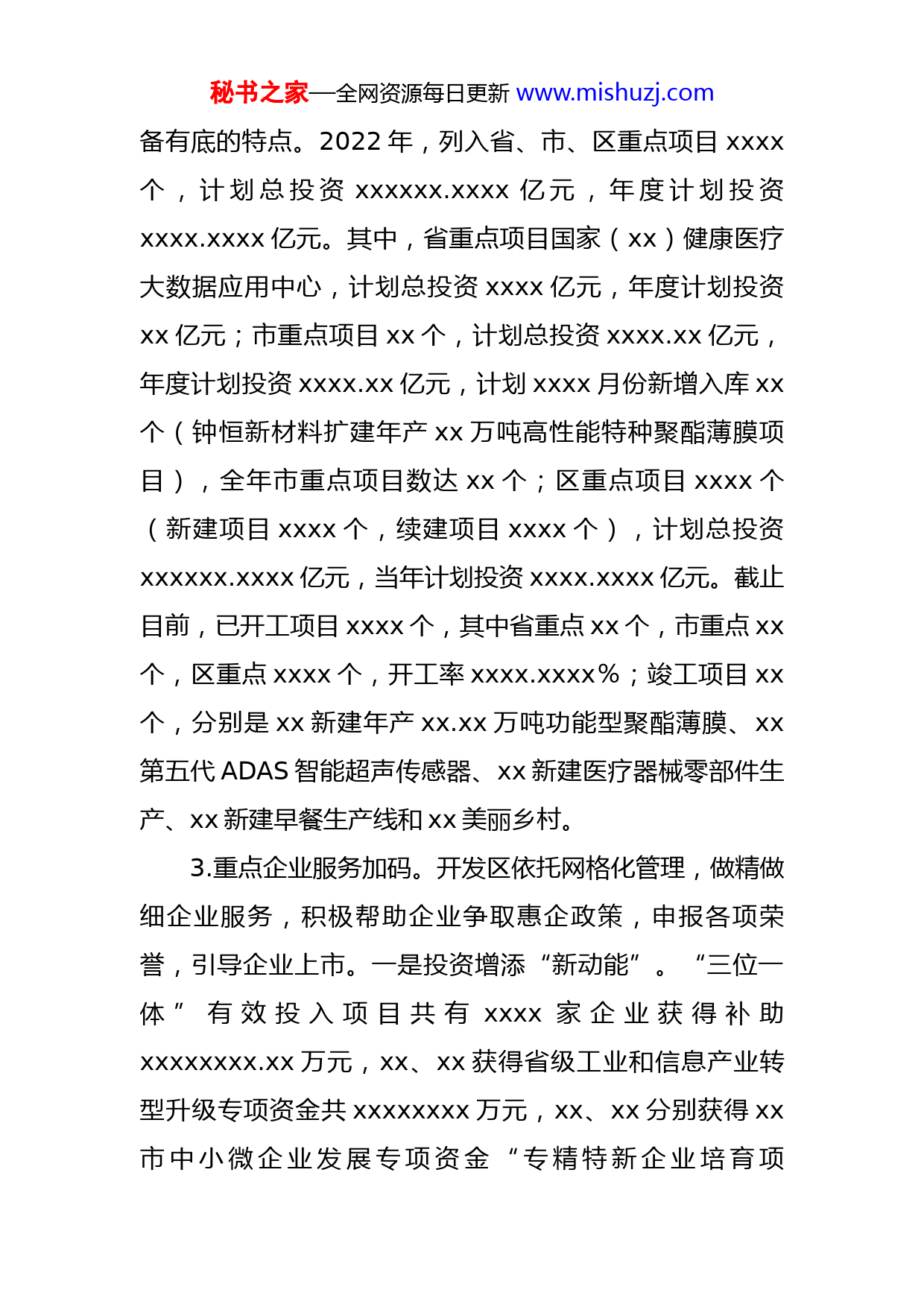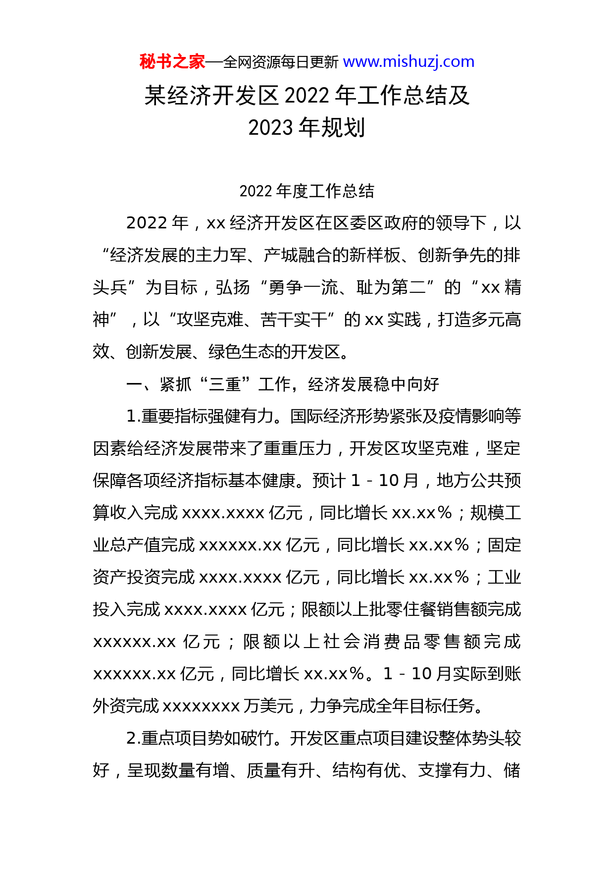 秘书之家—全网资源每日更新www.mishuzj.com某经济开发区2022年工作总结及2023年规划2022年度工作总结2022年,xx经济开发区在区委区政府的领导下,以“经济发展的主力军、产城融合的新样板、创新争先的排头兵”为目标,弘扬“勇争一流、耻为第二”的“xx精神”,以“攻坚克难、苦干实干”的xx实践,打造多元高效、创新发展、绿色生态的开发区。一、紧抓“三重”工作,经济发展稳中向好1.重要指标强健有力。国际经济形势紧张及疫情影响等因素给经济发展带来了重重压力,开发区攻坚克难,坚定保障各项经济指标基本健康。预计1-10月,地方公共预算收入完成xxxx.xxxx亿元,同比增长xx.xx%;规模工业总产值完成xxxxxx.xx亿元,同比增长xx.xx%;固定资产投资完成xxxx.xxxx亿元,同比增长xx.xx%;工业投入完成xxxx.xxxx亿元;限额以上批零住餐销售额完成xxxxxx.xx亿元;限额以上社会消费品零售额完成xxxxxx.xx亿元,同比增长xx.xx%。1-10月实际到账外资完成xxxxxxxx万美元,力争完成全年目标任务。2.重点项目势如破竹。开发区重点项目建设整体势头较好,呈现数量有增、质量有升、结构有优、支撑有力、储秘书之家—全网资源每日更新www.mishuzj.com备有底的特点。2022年,列入省、市、区重点项目xxxx个,计划总投资xxxxxx.xxxx亿元,年度计划投资xxxx.xxxx亿元。其中,省重点项目国家(xx)健康医疗大数据应用中心,计划总投资xxxx亿元,年度计划投资xx亿元;市重点项目xx个,计划总投资xxxx.xx亿元,年度计划投资xxxx.xx亿元,计划xxxx月份新增入库xx个(钟恒新材料扩建年产xx万吨高性能特种聚酯薄膜项目),全年市重点项目数达xx个;区重点项目xxxx个(新建项目xxxx个,续建项目xxxx个),计划总投资xxxxxx.xxxx亿元,当年计划投资xxxx.xxxx亿元。截止目前,已开工项目xxxx个,其中省重点xx个,市重点xx个,区重点xxxx个,开工率xxxx.xxxx%;竣工项目xx个,分别是xx新建年产xx.xx万吨功能型聚酯薄膜、xx第五代ADAS智能超声传感器、xx新建医疗器械零部件生产、xx新建早餐生产线和xx美丽乡村。3.重点企业服务加码。开发区依托网格化管理,做精做细企业服务,积极帮助企业争取惠企政策,申报各项荣誉,引导企业上市。一是投资增添“新动能”。“三位一体”有效投入项目共有xxxx家企业获得补助xxxxxxxx.xx万元,xx、xx获得省级工业和信息产业转型升级专项资金共xxxxxxxx万元,xx、xx分别获得xx市中小微企业发展专项资金“专精特新企业培育项秘书之家—全网资源每日更新www.mishuzj.com目”xxxx万元奖励资金。二是专业打造“新名片”。组织企业申报认定xx市信用贯标企业、xx制造创新产品、节能发展循环经济项目等奖项。其中,xx通过xx省工业设计中心认定,xx微亿智造科技有限公司智能质检车间,成为全省第一个“xxG+智慧工厂”,获第三届全国“绽放杯”xxG应用征集大赛一等奖;xx斩获“xx互联网行业综合竞争力xxxx强”;xx是全区唯一入围2022年中国优秀工业设计奖的复评产品。三是上市翻开“新篇章”。2022年xx、xx分别于在xx月和xx月在香港上市和创业板成功挂牌上市。截止目前,开发区上市企业累计xxxx家,其中IPO上市xx家(xx)、境外上市xx家(xx)、香港上市xx家(xx、新三板上市xx家(xx),储备上市后备企业xx家。二、积蓄发展动力,产业质态持续提升4.招商引资量质并举。一是启动驻外服务中心。今年5月,xx经济开发区正式启动驻外企业服务中心工作,短期内迅速制定实施方案,完成团队组建、选址等前期筹备工作,召开动员大会。xx月,深圳企业服务中心正式启动,围绕企业服务、项目招引、宣传推介以及建章立制等内容积极开展各类工作,顺利完成深圳招商活动周、xx深交所上市等工作任务,并积极拓展了xx、xx、xx等项目资源。二是完成签约项目xxxx个。包括国家(xx)健康医疗大数秘书之家—全网资源每日更新www.mishuzj.com据应用中心、xx能力中心项目、高端汽车零部件产业园等xx个总投资超xxxx亿元项目;xx等xx个总投资超xx亿元项目;完成xx等xx个总投资超xxxxxxxx万元的项目。经初步统计,目前开发区共完成高附加值项目xxxx个。三是重点在谈项目xxxx个。包括xx、xx、xx等大数据产业类项目;以及xx用地类项目;xx等本地企业扩产扩能项目,以及xx等厂房租赁类项目。5.载体平台虹吸增强。一是xx大数据产业园成功开园。xxxx万平方米新建办公载体中,首幢xx万平方米已对外亮相,新入驻以xx为代表的十多家大数据产业类企业,预计年底将超xxxxxxxx名办公人员入驻园区。xx大数据产业园以大数据产业为代表的“三新经济”发展势头强劲,“智慧健康云”、“xx工业云”两朵行业专有云建设初见成效。xx大数据产业园展示中心占地约xxxxxxxx平方米,已先后接待了省工信厅等相关领导xxxx批次。二是高新技术产业园加紧建设。成功招引xx个市重点项目,分别是xx及xx产业园项目、xx智能家居项目、xx高端汽车零部件产业园项目以及恒源活性炭项目。2022期间,xx产业园正式开工,项目占地xxxxxx亩,总投资xxxx亿元,项目建成后将重点引入新光源和新兴照明、新一代信息技术等高新技术产业,预计新增年销售xxxx亿元、利税xxxxxxxx万元,对加速构建“科技引领+本土制造+渠道秘书之家—全网资源每日更新www.mishuzj.com销售”的新型照明产业生态圈起到积极示范效应。三是创业载体日趋成熟。开发区基本形成“众创空间-孵化器-加速器-科技园区”孵化链条。现有国家级孵化器xx个(xxxx高新技术创
