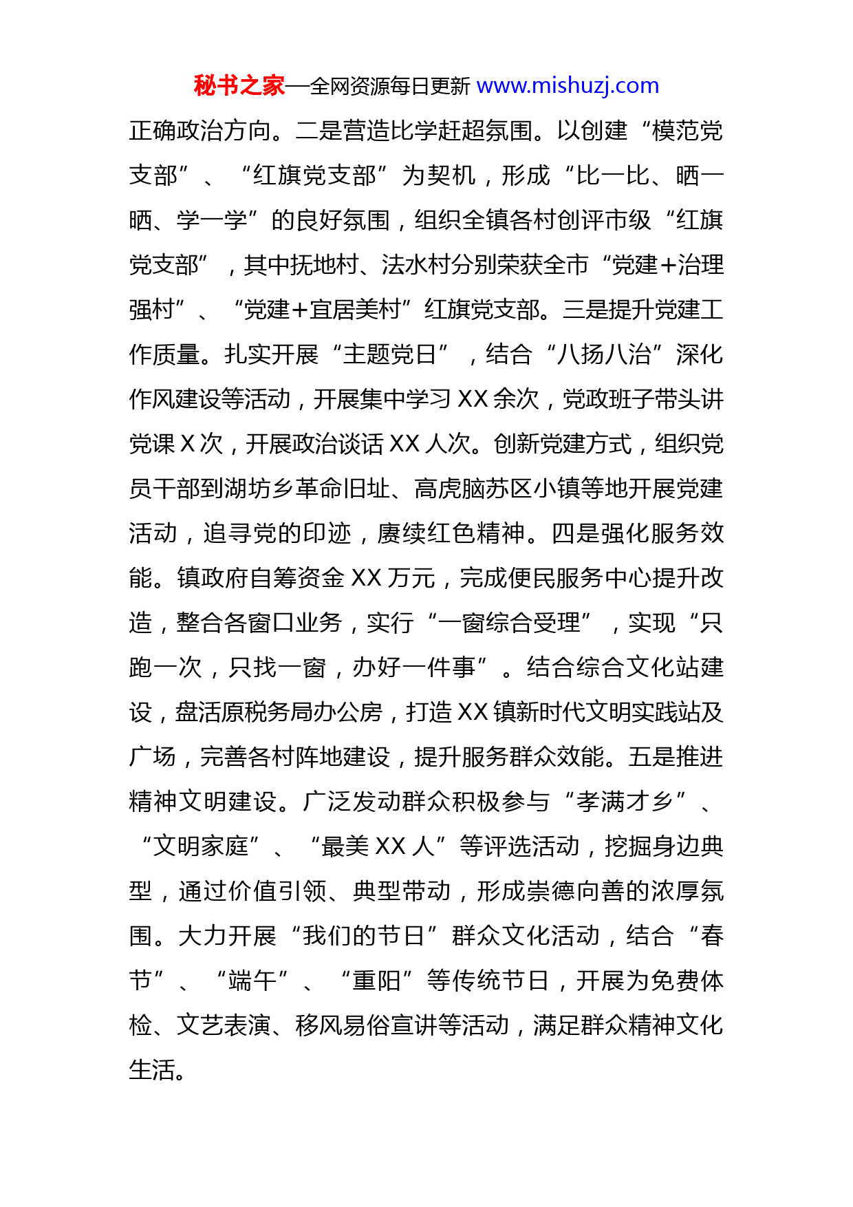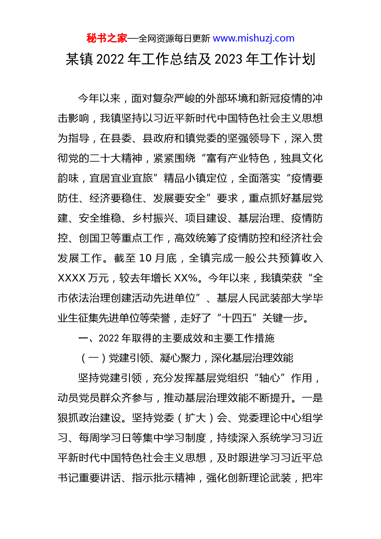 秘书之家—全网资源每日更新www.mishuzj.com某镇2022年工作总结及2023年工作计划今年以来,面对复杂严峻的外部环境和新冠疫情的冲击影响,我镇坚持以习近平新时代中国特色社会主义思想为指导,在县委、县政府和镇党委的坚强领导下,深入贯彻党的二十大精神,紧紧围绕“富有产业特色,独具文化韵味,宜居宜业宜旅”精品小镇定位,全面落实“疫情要防住、经济要稳住、发展要安全”要求,重点抓好基层党建、安全维稳、乡村振兴、项目建设、基层治理、疫情防控、创国卫等重点工作,高效统筹了疫情防控和经济社会发展工作。截至10月底,全镇完成一般公共预算收入XXXX万元,较去年增长XX%。今年以来,我镇荣获“全市依法治理创建活动先进单位”、基层人民武装部大学毕业生征集先进单位等荣誉,走好了“十四五”关键一步。一、2022年取得的主要成效和主要工作措施(一)党建引领、凝心聚力,深化基层治理效能坚持党建引领,充分发挥基层党组织“轴心”作用,动员党员群众齐参与,推动基层治理效能不断提升。一是狠抓政治建设。坚持党委(扩大)会、党委理论中心组学习、每周学习日等集中学习制度,持续深入系统学习习近平新时代中国特色社会主义思想,及时跟进学习习近平总书记重要讲话、指示批示精神,强化创新理论武装,把牢秘书之家—全网资源每日更新www.mishuzj.com正确政治方向。二是营造比学赶超氛围。以创建“模范党支部”、“红旗党支部”为契机,形成“比一比、晒一晒、学一学”的良好氛围,组织全镇各村创评市级“红旗党支部”,其中抚地村、法水村分别荣获全市“党建+治理强村”、“党建+宜居美村”红旗党支部。三是提升党建工作质量。扎实开展“主题党日”,结合“八扬八治”深化作风建设等活动,开展集中学习XX余次,党政班子带头讲党课X次,开展政治谈话XX人次。创新党建方式,组织党员干部到湖坊乡革命旧址、高虎脑苏区小镇等地开展党建活动,追寻党的印迹,赓续红色精神。四是强化服务效能。镇政府自筹资金XX万元,完成便民服务中心提升改造,整合各窗口业务,实行“一窗综合受理”,实现“只跑一次,只找一窗,办好一件事”。结合综合文化站建设,盘活原税务局办公房,打造XX镇新时代文明实践站及广场,完善各村阵地建设,提升服务群众效能。五是推进精神文明建设。广泛发动群众积极参与“孝满才乡”、“文明家庭”、“最美XX人”等评选活动,挖掘身边典型,通过价值引领、典型带动,形成崇德向善的浓厚氛围。大力开展“我们的节日”群众文化活动,结合“春节”、“端午”、“重阳”等传统节日,开展为免费体检、文艺表演、移风易俗宣讲等活动,满足群众精神文化生活。秘书之家—全网资源每日更新www.mishuzj.com(二)超前谋划、稳扎稳打,全面推进乡村振兴全镇始终把巩固脱贫攻坚成果和乡村振兴有效衔接工作摆在头等位置来抓,狠抓责任落实和工作落实,扎实有序推进巩固拓展脱贫攻坚成果同乡村振兴有效衔接。一是夯实农业生产基础,筑牢粮食安全底线。坚决制止耕地抛荒、防止耕地“非粮化”,压实粮食生产任务,加快高标准农田建设速度,完成高标准农田建设XXX亩,新修建农业灌溉水渠X条XXXX余米,新修建姜山农场机耕道路XXX米。狠抓抛荒耕地整治,完成耕地抛荒整治XXXX余亩。今年以来,共完成早稻种植面积为XXXX余亩,中稻种植XXXX余亩,晚稻种植XXXX余亩。统筹兼顾粮食生产和蔬菜发展,落实设施蔬菜面积XXX余亩,笋竹两用林XXXX余亩,食用菌XX亩,有力保障粮食安全和重要农产品供给安全。二是加快产业项目建设,不断增添发展动力。加强项目谋划储备,推动重点项目落实落地。今年以来共谋划储备项目XX余个,总资金达XXXX万元以上,共争取到各类项目XX个,总投资XXXX万元。杜兰公路正在立项,冠合山泉水厂建设已完成规划设计,防洪工程正在筹备建设,三源公路已开工建设,招引的鱼得水数字经济企业已开始运营。立足资源优势,积极发展笋竹两用林基地,引进XX东坡笋业有限公司在法水村流转毛竹林XXXX亩,正在进行基地建设,预计今年完成笋竹两用林基地建秘书之家—全网资源每日更新www.mishuzj.com设XXXX亩。三是坚持农业升级,实施产业发展规划。稳步推动农业升级,探索发展特色农业,出台乡村振兴产业发展规划,根据当前产业现状,结合各村地理资源优势,有序推进“茶叶、蔬菜、有机稻、中草药、菌菇、笋竹两用林”六大特色产业发展,壮大村集体经济。四是强化监测帮扶,守牢防返贫底线。聚焦“两不愁三保障”和饮水安全,进一步完善“四线三监测”平台,认真抓好成效考核反馈问题整改,持续巩固拓展脱贫攻坚成果。今年以来,我镇新增三类人员X户XX人,风险消除X户X人,做到“应纳尽纳,应消尽消”。(三)共建共治、建管并重,打出平安建设“组合拳”全镇持续巩固“五型”政府建设各项举措,政府的公信力、干部的执行力、制度的约束力进一步提高。一是重点抓好信访维稳。学习借鉴“枫桥经验”,不断加大突出矛盾纠纷和重点人员排查调处力度。严格落实领导包案及重点人员分析研判等制度,深入开展矛盾纠纷化解排查工作。2022年以来我镇收到信访件共X件,调处矛盾纠纷XX起,无群众集体上访事件发生。二是落实落细常态化疫情防控措施。落实网格化管理制度,压紧压实防控责任,加强外来人员及返乡人员登记