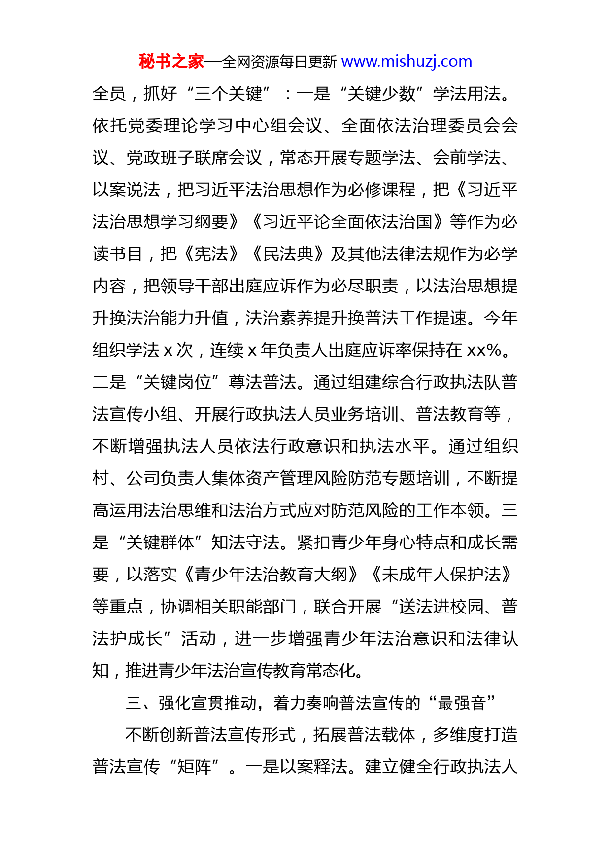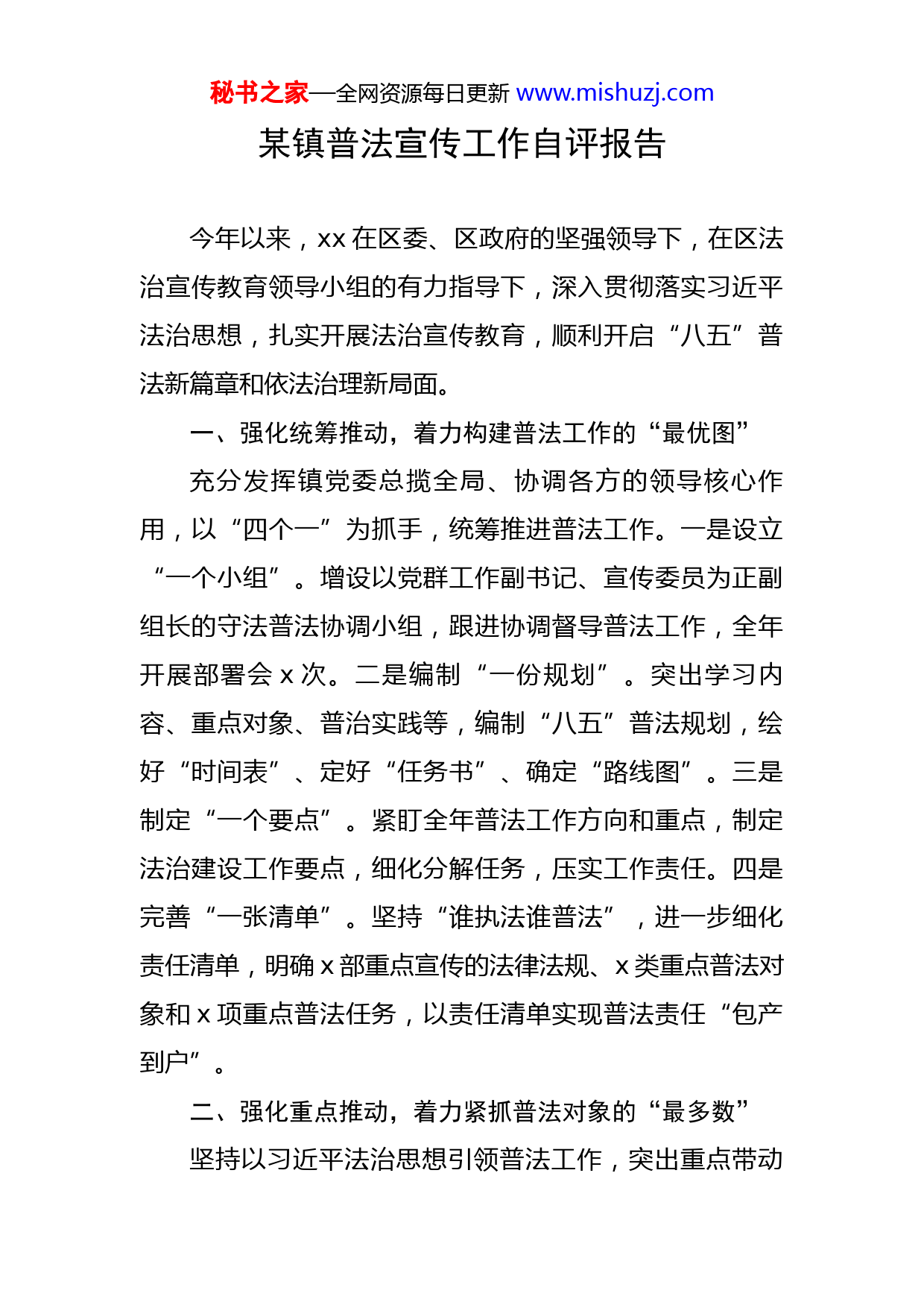 秘书之家—全网资源每日更新www.mishuzj.com某镇普法宣传工作自评报告今年以来,xx在区委、区政府的坚强领导下,在区法治宣传教育领导小组的有力指导下,深入贯彻落实习近平法治思想,扎实开展法治宣传教育,顺利开启“八五”普法新篇章和依法治理新局面。一、强化统筹推动,着力构建普法工作的“最优图”充分发挥镇党委总揽全局、协调各方的领导核心作用,以“四个一”为抓手,统筹推进普法工作。一是设立“一个小组”。增设以党群工作副书记、宣传委员为正副组长的守法普法协调小组,跟进协调督导普法工作,全年开展部署会x次。二是编制“一份规划”。突出学习内容、重点对象、普治实践等,编制“八五”普法规划,绘好“时间表”、定好“任务书”、确定“路线图”。三是制定“一个要点”。紧盯全年普法工作方向和重点,制定法治建设工作要点,细化分解任务,压实工作责任。四是完善“一张清单”。坚持“谁执法谁普法”,进一步细化责任清单,明确x部重点宣传的法律法规、x类重点普法对象和x项重点普法任务,以责任清单实现普法责任“包产到户”。二、强化重点推动,着力紧抓普法对象的“最多数”坚持以习近平法治思想引领普法工作,突出重点带动秘书之家—全网资源每日更新www.mishuzj.com全员,抓好“三个关键”:一是“关键少数”学法用法。依托党委理论学习中心组会议、全面依法治理委员会会议、党政班子联席会议,常态开展专题学法、会前学法、以案说法,把习近平法治思想作为必修课程,把《习近平法治思想学习纲要》《习近平论全面依法治国》等作为必读书目,把《宪法》《民法典》及其他法律法规作为必学内容,把领导干部出庭应诉作为必尽职责,以法治思想提升换法治能力升值,法治素养提升换普法工作提速。今年组织学法x次,连续x年负责人出庭应诉率保持在xx%。二是“关键岗位”尊法普法。通过组建综合行政执法队普法宣传小组、开展行政执法人员业务培训、普法教育等,不断增强执法人员依法行政意识和执法水平。通过组织村、公司负责人集体资产管理风险防范专题培训,不断提高运用法治思维和法治方式应对防范风险的工作本领。三是“关键群体”知法守法。紧扣青少年身心特点和成长需要,以落实《青少年法治教育大纲》《未成年人保护法》等重点,协调相关职能部门,联合开展“送法进校园、普法护成长”活动,进一步增强青少年法治意识和法律认知,推进青少年法治宣传教育常态化。三、强化宣贯推动,着力奏响普法宣传的“最强音”不断创新普法宣传形式,拓展普法载体,多维度打造普法宣传“矩阵”。一是以案释法。建立健全行政执法人秘书之家—全网资源每日更新www.mishuzj.com员、律师以案释法制度,在环境整治、违建拆除等专项执法过程中,围绕案件事实、证据程序和法律适用等问题,加强法律告知和释法说理,让行政执法有法度更显温度。二是摆摊讲法。在禁毒宣传日、普法宣传周、侨法宣传月和《法律援助法》《xx预防未成年人犯罪条例》等新法实施节点,组织法治宣讲骨干走进田间地头、社区广场、企业车间,摆起“普法地摊”,送上“法律套餐”,让讲法说法接地气更冒热气。三是多维宣法。以法治文化长廊、村级法治公园、法治微景观、法治广场、户外电子屏等为主阵地,以微信公众号、视频号、微信塔群等为主平台,传统与创新相结合、线上与线下双驱动,深入开展普法宣传,让法律知识上指尖更入心间。四、强化融合推动,着力谋求普法效益的“最大值”全面落实全国、全市市域社会治理现代化试点工作要求,坚持普治并举,推进普法工作深度融入基层社会治理。一是融入乡村振兴。以推进乡村振兴和民主法治示范创建为契机,突出党建引领作用,把法治宣传、依法治理与村级服务有机融合,不断健全自治、法治、德治相结合的乡村治理体系;深入实施“法治带头人”“法律明白人”培养工程,不断提升村级干部法治能力;依法制定村规民约规范村民言行,积极搭建协商议事平台,促进乡风文明乡村振兴。二是融入疫情防控。注重把法治宣传融入秘书之家—全网资源每日更新www.mishuzj.com疫情防控管理、服务和执法工作全过程,深入开展“疫情防控,法治同行”主题宣传活动,通过入户走访、发宣传单、张贴海报、以案释法等方式,加强疫情防控法律法规宣传,组织多部门联动进行全天候检查巡查,引导市民增强依法防疫意识,确保疫情防控期间普法宣传不缺位。三是融入公共服务。建立法律顾问驻队机制,助力破解城市管理行政执法难题;引导律师参与信访工作,深入推进信访积案攻坚化解;不断完善公共法律服务供给,延伸法律服务触角,在产业园区设立集法治宣传、纠纷化解、法律援助等为一体的公共法律服务工作室,服务园区企业,助力优化法治营商环境。普法征程,永不止步。下一步,xx将坚持以习近平法治思想引领全民普法,聚焦党委、政府中心工作,深入实施“八五”普法规划,落实“谁执法谁普法”责任制,进一步深化法治创建,扎实推进全民法治意识提升工程,努力把全民普法守法的制度优势转化为依法治理效能,为经济社会发展营造更加良好的法治环境。