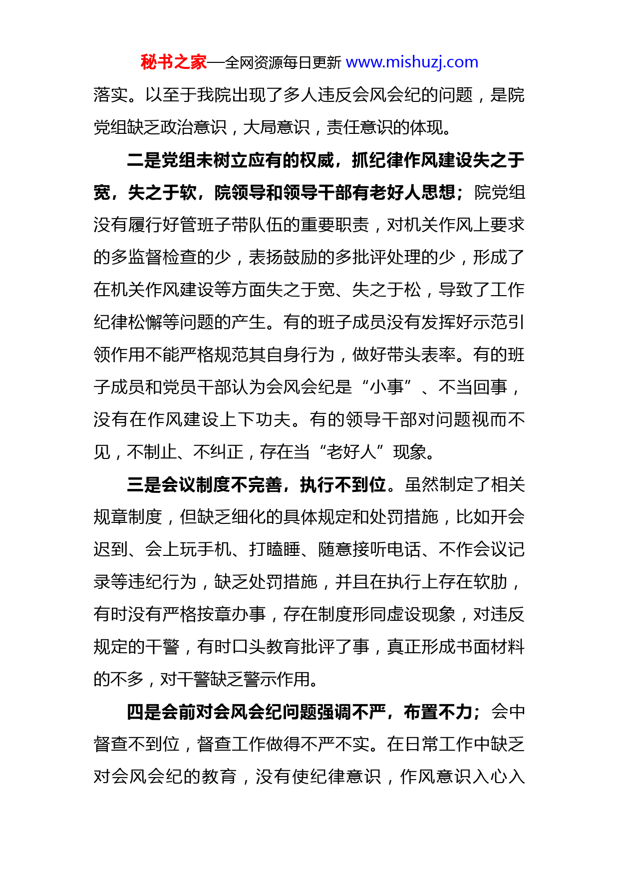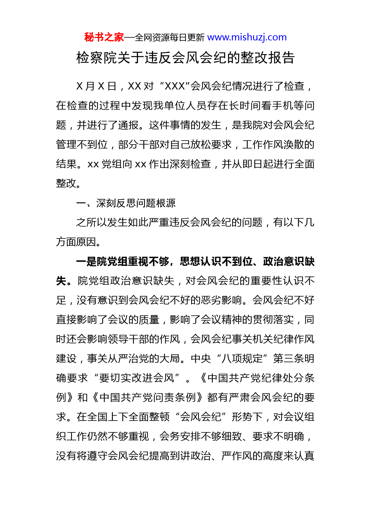 秘书之家—全网资源每日更新www.mishuzj.com检察院关于违反会风会纪的整改报告X月X日,XX对“XXX”会风会纪情况进行了检查,在检查的过程中发现我单位人员存在长时间看手机等问题,并进行了通报。这件事情的发生,是我院对会风会纪管理不到位,部分干部对自己放松要求,工作作风涣散的结果。xx党组向xx作出深刻检查,并从即日起进行全面整改。一、深刻反思问题根源之所以发生如此严重违反会风会纪的问题,有以下几方面原因。一是院党组重视不够,思想认识不到位、政治意识缺失。院党组政治意识缺失,对会风会纪的重要性认识不足,没有意识到会风会纪不好的恶劣影响。会风会纪不好直接影响了会议的质量,影响了会议精神的贯彻落实,同时还会影响领导干部的作风,会风会纪事关机关纪律作风建设,事关从严治党的大局。中央“八项规定”第三条明确要求“要切实改进会风”。《中国共产党纪律处分条例》和《中国共产党问责条例》都有严肃会风会纪的要求。在全国上下全面整顿“会风会纪”形势下,对会议组织工作仍然不够重视,会务安排不够细致、要求不明确,没有将遵守会风会纪提高到讲政治、严作风的高度来认真秘书之家—全网资源每日更新www.mishuzj.com落实。以至于我院出现了多人违反会风会纪的问题,是院党组缺乏政治意识,大局意识,责任意识的体现。二是党组未树立应有的权威,抓纪律作风建设失之于宽,失之于软,院领导和领导干部有老好人思想;院党组没有履行好管班子带队伍的重要职责,对机关作风上要求的多监督检查的少,表扬鼓励的多批评处理的少,形成了在机关作风建设等方面失之于宽、失之于松,导致了工作纪律松懈等问题的产生。有的班子成员没有发挥好示范引领作用不能严格规范其自身行为,做好带头表率。有的班子成员和党员干部认为会风会纪是“小事”、不当回事,没有在作风建设上下功夫。有的领导干部对问题视而不见,不制止、不纠正,存在当“老好人”现象。三是会议制度不完善,执行不到位。虽然制定了相关规章制度,但缺乏细化的具体规定和处罚措施,比如开会迟到、会上玩手机、打瞌睡、随意接听电话、不作会议记录等违纪行为,缺乏处罚措施,并且在执行上存在软肋,有时没有严格按章办事,存在制度形同虚设现象,对违反规定的干警,有时口头教育批评了事,真正形成书面材料的不多,对干警缺乏警示作用。四是会前对会风会纪问题强调不严,布置不力;会中督查不到位,督查工作做得不严不实。在日常工作中缺乏对会风会纪的教育,没有使纪律意识,作风意识入心入秘书之家—全网资源每日更新www.mishuzj.com脑。干警缺乏对严肃会议纪律、改进会风的重要性和必要性的正确认识,不能严格遵守会风会纪有关规定要求。会中缺少督导检查,对会议中存在的打接电话、玩手机等违反会风会纪的行为没有及时提醒、警示、督促整改,造成了长时间存在违纪行为的现象。二、采取措施一是事情发生以后,我院高度重视,接到视频截图后第一时间对违纪人员进行了核实,并进行上报。二是由主管纪检的领导对违纪人员分别进行了谈话,使违纪人员深刻认识到自己的错误。三是市院通报下发后。我院立即召开班子会议传达市院通报精神,明确下步整改措施确保此类事件不再发生。作出对违纪人员的处理决定,在全院范围内对相关违纪人员进行通报批评,并要求相关违纪人员作出书面检查,在全院大会进行检查。四是及时召开全院干警大会,宣布对违纪人员的处理决定,违纪人员在大会上进行检讨。五是重审工作纪律及会风会纪,是检察干警切实加强大局意识,责任意识,确保令行禁止,杜绝违反会风会纪的现象再次发生。三、整改措施一是强调重要性,提高思想认识。会风是反映一个单位精神面貌、文明程度和整体素质的镜子,院党组严格要求每位干警充分认识进一步加强会风会纪建设的重要性,秘书之家—全网资源每日更新www.mishuzj.com根据此次通报要求,实事求是进行自查自纠,并对照自身不足,制定整改措施,自觉规范自身会议行为,自觉纠正不良会风会纪。把严肃会风会纪作为贯彻落实省、市、区作风建设要求的重要举措,进一步增强责任意识和纪律意识,以好的会风会纪,积极推动各项决策部署的落实。二、规范会议管理。严格要求干警遵守会风会纪,不准请假,除极特殊情况需向检察长请假;不准迟到、早退、中途离场,参会时提前10分钟进入会场就座;不准穿着混装,必须严格按照相关规定着装;电话必须关机或静音,不准随意接打电话;不准在会场抽烟、打瞌睡、交头接耳。会议承办部门须坚持务实、节俭、高效原则,严格会议通知、落实参会人员。政治处、组织会议签到、如实记录参会情况,确保会议顺利进行。监察部门切实做好会议督察工作,建立会风会纪监督通报制度,出狠招、出实招,确保会议质量和效果,确保会风会纪专项整治工作取得明显成效。三要明确责任。领导干部要切实担负起会风会纪整顿工作的主体责任,充分起到带头、管理、监督作用,对会议期间出现问题的干警,及时进行教育提醒。监察部门要充分发挥监督执纪问责的职能作用,对本单位与会者会议期间接打电话、玩手机等不遵守会议纪律的问题,盯死看牢、抓住不放,该提醒的提醒、该通报的通报,该处分的秘书之家—全网资源每日更新www.mishuzj