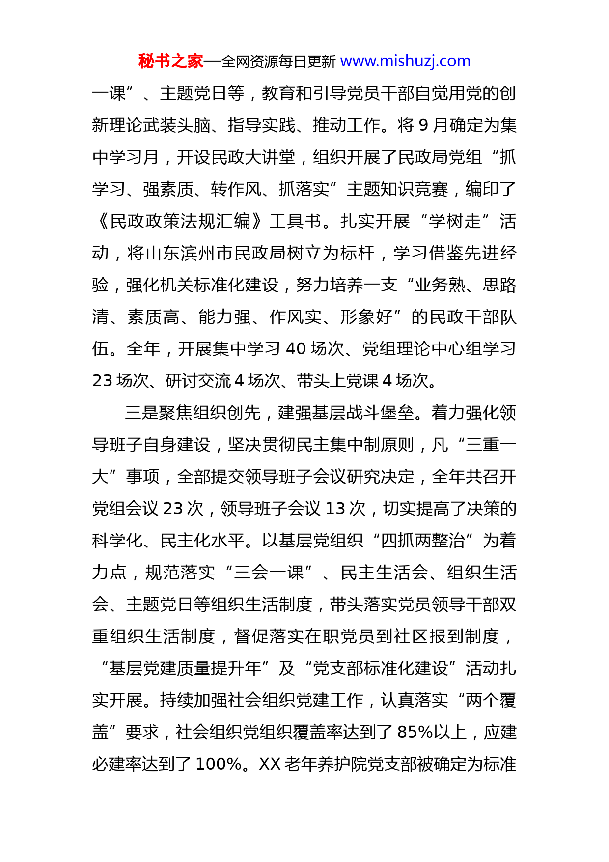 秘书之家—全网资源每日更新www.mishuzj.com民政局党组2022年抓党建述职工作报告根据安排,现就本人履行抓基层党建工作职责情况汇报如下:一、履职工作特色和亮点一是聚焦政治担当,筑牢党建责任体系。牢固树立“抓好党建是最大政绩”的理念,靠实主体责任、第一责任和党组成员“一岗双责”。年初,制定了XX民政局党组《2022年党建及精神文明建设安排意见》《深化拓展“基层党建质量提升年”活动工作方案》,签订了党的建设考核指标体系和重点任务清单。严格落实党组成员分工负责制,建立了三级联动负责体系和党组成员联系包抓支部的党建责任机制。认真落实意识形态工作责任制,牢牢把握意识形态工作领导权,党组会议4次研究意识形态工作,意识形态工作持续加强。狠抓突出问题整改,建立了问题清单、整改台账,整改一件销号一件,确保问题整改落实到位。全年,召开专题会议研究党建工作4次,部署党建工作12次,督查检查支部党建工作3次。二是聚焦思想建设,强化干部理论武装。始终把政治理论学习作为党员领导干部坚定政治方向、提高党性修养、正确履行职责的有力抓手,精心制定计划,细化学习内容,通过党组中心组理论学习会、干部周例会、“三会秘书之家—全网资源每日更新www.mishuzj.com一课”、主题党日等,教育和引导党员干部自觉用党的创新理论武装头脑、指导实践、推动工作。将9月确定为集中学习月,开设民政大讲堂,组织开展了民政局党组“抓学习、强素质、转作风、抓落实”主题知识竞赛,编印了《民政政策法规汇编》工具书。扎实开展“学树走”活动,将山东滨州市民政局树立为标杆,学习借鉴先进经验,强化机关标准化建设,努力培养一支“业务熟、思路清、素质高、能力强、作风实、形象好”的民政干部队伍。全年,开展集中学习40场次、党组理论中心组学习23场次、研讨交流4场次、带头上党课4场次。三是聚焦组织创先,建强基层战斗堡垒。着力强化领导班子自身建设,坚决贯彻民主集中制原则,凡“三重一大”事项,全部提交领导班子会议研究决定,全年共召开党组会议23次,领导班子会议13次,切实提高了决策的科学化、民主化水平。以基层党组织“四抓两整治”为着力点,规范落实“三会一课”、民主生活会、组织生活会、主题党日等组织生活制度,带头落实党员领导干部双重组织生活制度,督促落实在职党员到社区报到制度,“基层党建质量提升年”及“党支部标准化建设”活动扎实开展。持续加强社会组织党建工作,认真落实“两个覆盖”要求,社会组织党组织覆盖率达到了85%以上,应建必建率达到了100%。XX老年养护院党支部被确定为标准秘书之家—全网资源每日更新www.mishuzj.com化示范党支部。加强党员管理服务,严把发展党员“入口关”,年内培养发展正式党员1名、预备党员1名、入党积极分子3名,对5名优秀党员进行了表彰,对2名困难党员进行了走访慰问。四是聚焦作风创优,加强党风廉政建设。紧紧扭住落实全面从严治党“牛鼻子”,认真履行党组党风廉政建设主体责任制和党组成员“一岗双责”,切实把责任扛在肩上、工作抓在手上。强化“六位一体”廉政教育,适时组织开展学党章党规党纪活动,深入开展反腐倡廉警示教育2场次,扎实开展廉政约谈4场次,干部职工拒腐防变、廉政守纪意识进一步增强。严格落实中央八项规定及实施细则精神,全面强化监督问效,坚持服务对象、工程项目、民政资金延伸到哪里,跟踪问效就跟进到哪里。着力打造高素质干部队伍,持续深化“作风建设年”活动,扎实开展“强责任、勇担当、重成效”主题活动,持续用力整治形式主义、官僚主义,推进干部作风转变、能力提升。五是聚焦党建引领,提升民生服务保障。紧紧围绕“兜底线、保民生、促发展”主线,充分发挥党组织的战斗堡垒作用和党员的先锋引领作用,以党建工作服务中心、推动发展为有力抓手,建立了党员承诺践诺机制,组织党员干部设岗定责、依岗承诺、积极践诺。扎实开展民政系统便民利民专项行动,对城乡低保、临时救助、婚姻秘书之家—全网资源每日更新www.mishuzj.com登记、社会组织登记等15项为民服务事项进一步简化办理程序、压缩办理时限,切实提高了为民服务效能。全力推进重大项目建设,投资1.6亿元的XX生态园林公墓已投入运营,投资XX亿元的老年养护院项目和投资7619万元的殡仪馆附属工程进展顺利,XX2个乡镇老年人活动中心主体已完工。今年以来,各民政服务窗口共计办理为民服务事项XX件,办理新增低保特困XX户XX人,救助困难群众5余万人次,发放困难群众救助资金XX亿元,为帮扶村办实事2件,为共驻共建社区解决实际问题5件。XX社会福利院被命名为省级卫生单位,婚姻登记处被确定为全省婚俗改革示范点。二、存在的问题及原因分析一是党建责任落实还不够严。在落实党建“第一责任人”责任上,督办提醒多,动真问责少,党组成员抓党建“一岗双责”不到位,个别基层党组织负责人履行“第一责任人”责任不实;党组对党建工作的领导作用发挥的不够充分,党建责任压力层层递减现象不同程度存在。二是党员学习教育还需加强。党组中心组、党员大会集中学习的多,专题讲座、研讨交流式学习的少,党员干部对党的新思想、新理论的精神实质和精髓要义掌握不全面、理解不深入,理论联系实际