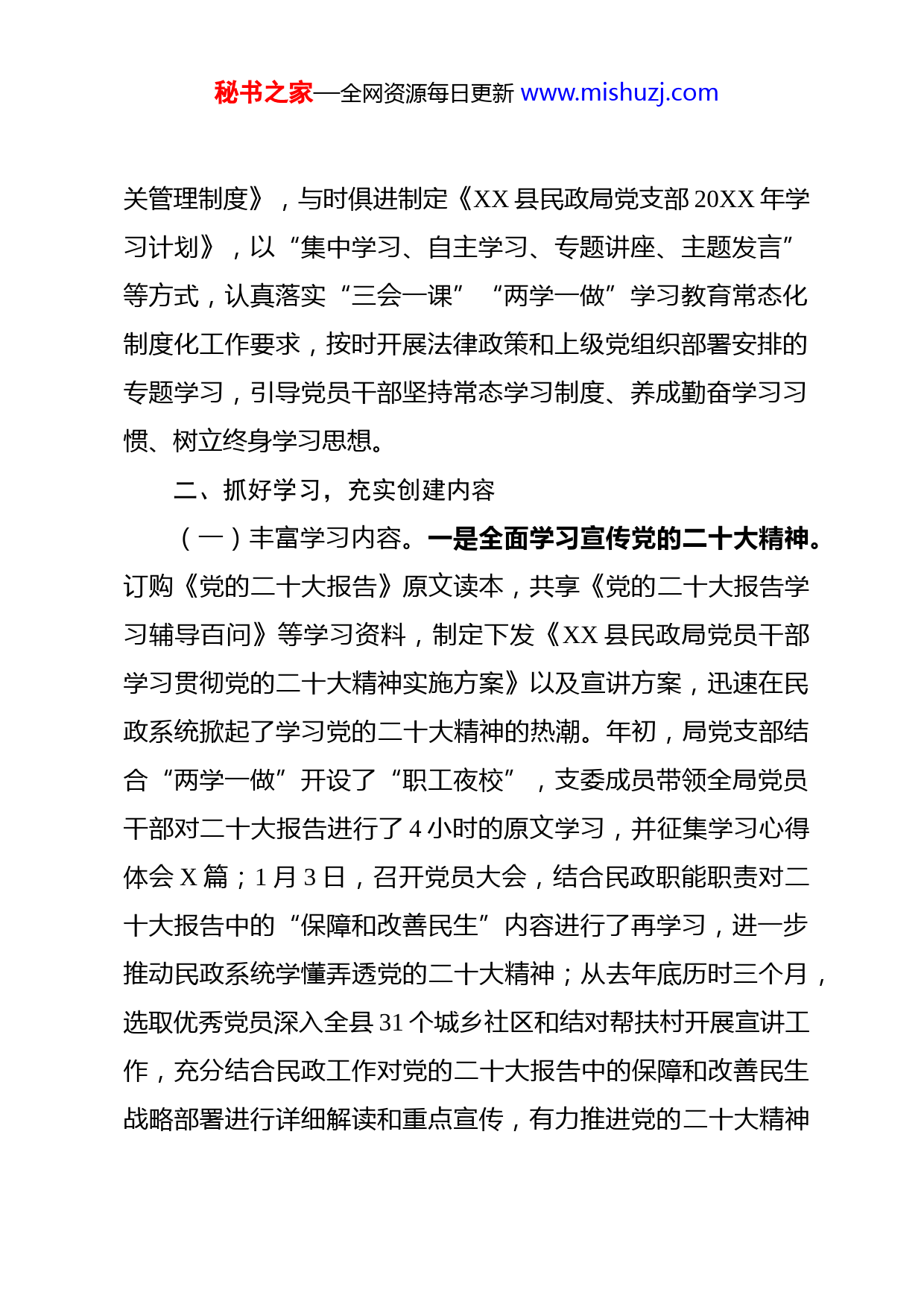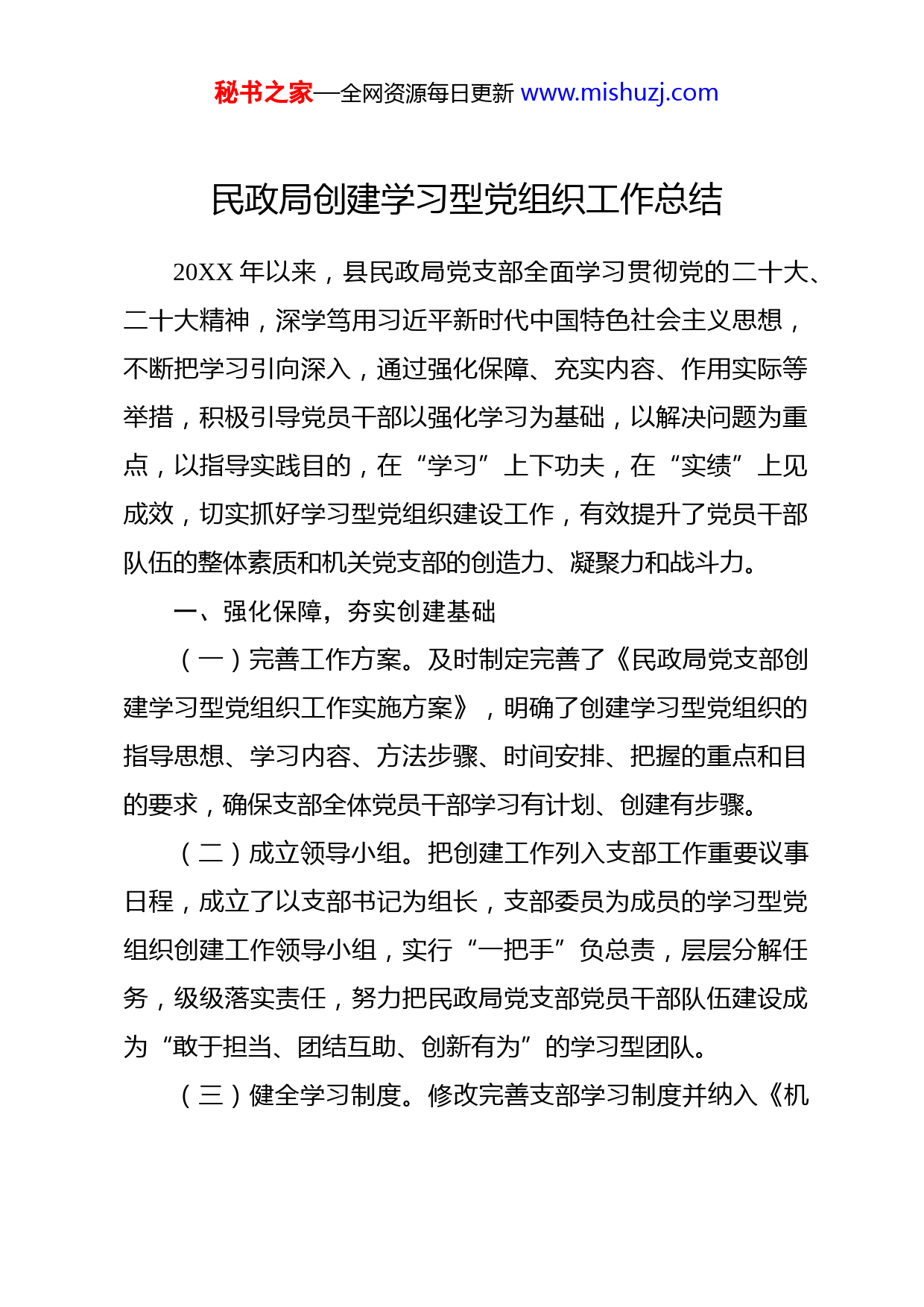 秘书之家—全网资源每日更新www.mishuzj.com民政局创建学习型党组织工作总结20XX年以来,县民政局党支部全面学习贯彻党的二十大、二十大精神,深学笃用习近平新时代中国特色社会主义思想,不断把学习引向深入,通过强化保障、充实内容、作用实际等举措,积极引导党员干部以强化学习为基础,以解决问题为重点,以指导实践目的,在“学习”上下功夫,在“实绩”上见成效,切实抓好学习型党组织建设工作,有效提升了党员干部队伍的整体素质和机关党支部的创造力、凝聚力和战斗力。一、强化保障,夯实创建基础(一)完善工作方案。及时制定完善了《民政局党支部创建学习型党组织工作实施方案》,明确了创建学习型党组织的指导思想、学习内容、方法步骤、时间安排、把握的重点和目的要求,确保支部全体党员干部学习有计划、创建有步骤。(二)成立领导小组。把创建工作列入支部工作重要议事日程,成立了以支部书记为组长,支部委员为成员的学习型党组织创建工作领导小组,实行“一把手”负总责,层层分解任务,级级落实责任,努力把民政局党支部党员干部队伍建设成为“敢于担当、团结互助、创新有为”的学习型团队。(三)健全学习制度。修改完善支部学习制度并纳入《机秘书之家—全网资源每日更新www.mishuzj.com关管理制度》,与时俱进制定《XX县民政局党支部20XX年学习计划》,以“集中学习、自主学习、专题讲座、主题发言”等方式,认真落实“三会一课”“两学一做”学习教育常态化制度化工作要求,按时开展法律政策和上级党组织部署安排的专题学习,引导党员干部坚持常态学习制度、养成勤奋学习习惯、树立终身学习思想。二、抓好学习,充实创建内容(一)丰富学习内容。一是全面学习宣传党的二十大精神。订购《党的二十大报告》原文读本,共享《党的二十大报告学习辅导百问》等学习资料,制定下发《XX县民政局党员干部学习贯彻党的二十大精神实施方案》以及宣讲方案,迅速在民政系统掀起了学习党的二十大精神的热潮。年初,局党支部结合“两学一做”开设了“职工夜校”,支委成员带领全局党员干部对二十大报告进行了4小时的原文学习,并征集学习心得体会X篇;1月3日,召开党员大会,结合民政职能职责对二十大报告中的“保障和改善民生”内容进行了再学习,进一步推动民政系统学懂弄透党的二十大精神;从去年底历时三个月,选取优秀党员深入全县31个城乡社区和结对帮扶村开展宣讲工作,充分结合民政工作对党的二十大报告中的保障和改善民生战略部署进行详细解读和重点宣传,有力推进党的二十大精神秘书之家—全网资源每日更新www.mishuzj.com在XX民政领域落地生根、开花结果。二是深学笃用习近平新时代中国特色社会主义思想。认真做好学习习近平总书记重要讲话精神和学习习近平总书记治国理政新理念新思想新战略到学习习近平新时代中国特色社会主义思想的融会贯通,着重抓好习近平总书记视察XX重要讲话精神、参加XX代表团审议时重要讲话精神和扶贫重要论述等内容的学习。3月X日,在学习习近平总书记视察XX重要讲话精神后,全局党员干部重温了习近平总书记2016年初视察XX重要讲话精神,进一步牢记习近平总书记对XX的提出的“两点”定位和“两地”目标。5月X日,在县委十三届四次全会召开后,全局党员干部集中学习了习近平总书记参加XX代表团审议时重要讲话精神,提高了对“形成风清气正的政治生态”“领导干部要讲政德”“多积尺寸之功”等重要论述的理解认识,进一步从思想上推动了我局加强政治建设,肃清孙政才恶劣影响和薄熙来、王立军流毒,加强法治和德治,严肃党内政治生活、树立正确选人用人导向、持之以恒正风肃纪、发展积极健康的党内政治文化等工作。10月起,局党支部结合局脱贫攻坚专题会议集中组织学习了《习近平扶贫论述摘编》,通过读原著、学原文,引导全局党员干部深刻领会习近平总书记关于扶贫重要论述的精神实质和核心要义,把思想和行动统一到论述上来,在脱贫攻坚秘书之家—全网资源每日更新www.mishuzj.com实际工作中切实履好“民政为民,民政爱民”工作理念,充分发挥民政兜底保障职能,扛起责任、勇于担当、攻坚克难,全力助推我县精准打赢脱贫攻坚这场硬仗。三是持续学用党内规章制度、重要行政法律和民政政策知识。12月X日,全体党员干部参加了党风廉政教育专题党课,并在局党组书记的带领下从“党章的地位和作用”“党章的历史演变”“党章的主要内容”“如何学习党章”四个方面对新党章进行了深入学习,切实增强全局党员干部“学习党章、尊崇党章、维护党章”的自觉性。9月X日,局党支部将《中国共产党纪律处分条例》分享至局机关工作群,并由局党组成员带头对《条例》进行了逐条逐句的剖析理解。4月X日和5月X日,局党支部先后通过支委会和组织生活会,邀请法律专家为全体党员干部对《宪法修正案》《中华人民共和国监察法》进行了细致解读学习20XX年以来,我局利用民政工作会、村干部培训会、“两项治理”动员培训会、“三区计划”项目推进会等会议,多次对全县民政干部、村社区干部进行了民政政策解读和指导,充分保证我县民政系统工作人员对新时代民政工作政策制度的理解与时俱进,切实提高民政队伍的政策运用能力素质。(二)创