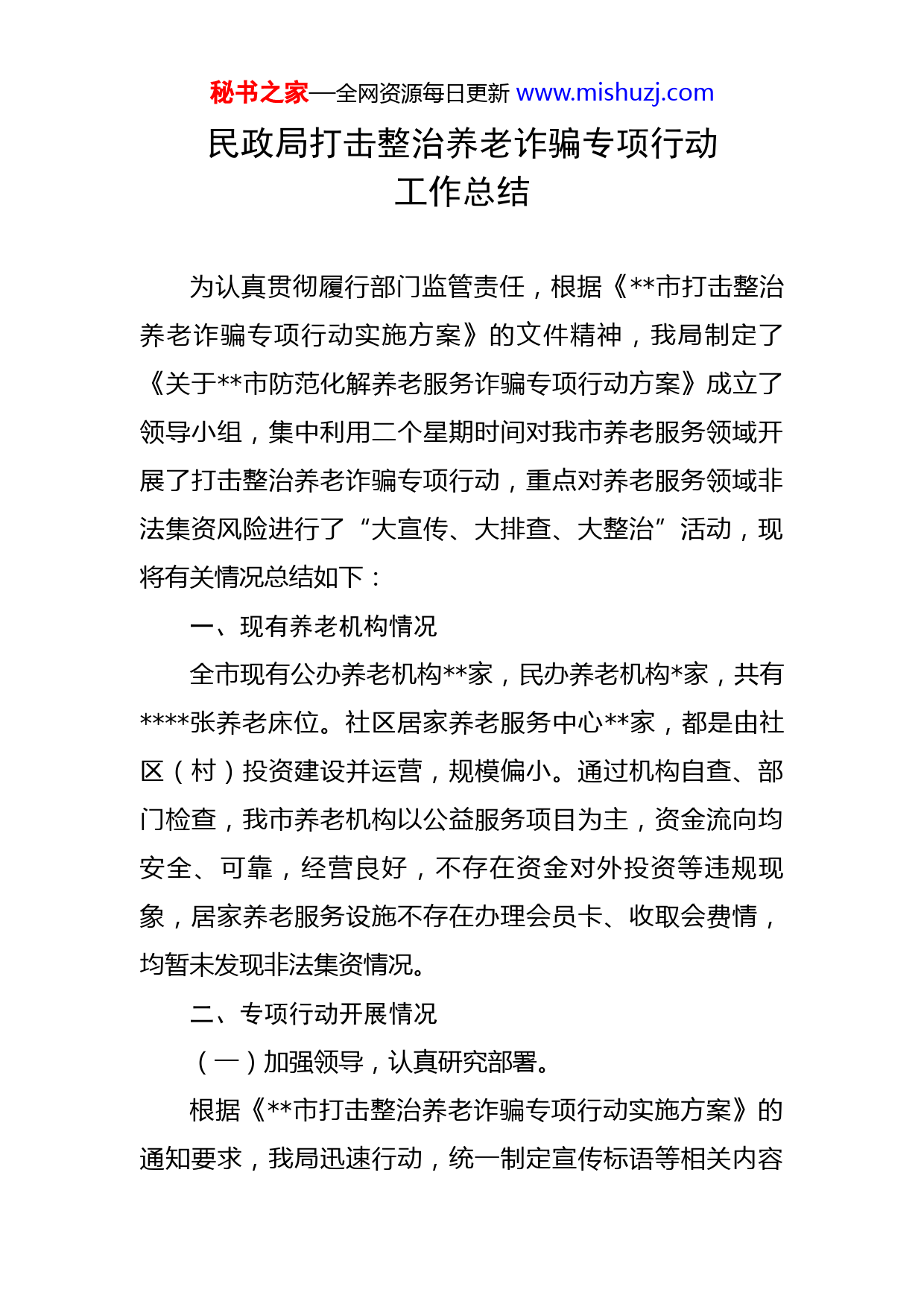 秘书之家—全网资源每日更新www.mishuzj.com民政局打击整治养老诈骗专项行动工作总结为认真贯彻履行部门监管责任,根据《市打击整治养老诈骗专项行动实施方案》的文件精神,我局制定了《关于市防范化解养老服务诈骗专项行动方案》成立了领导小组,集中利用二个星期时间对我市养老服务领域开展了打击整治养老诈骗专项行动,重点对养老服务领域非法集资风险进行了“大宣传、大排查、大整治”活动,现将有关情况总结如下:一、现有养老机构情况全市现有公办养老机构家,民办养老机构家,共有张养老床位。社区居家养老服务中心家,都是由社区(村)投资建设并运营,规模偏小。通过机构自查、部门检查,我市养老机构以公益服务项目为主,资金流向均安全、可靠,经营良好,不存在资金对外投资等违规现象,居家养老服务设施不存在办理会员卡、收取会费情,均暂未发现非法集资情况。二、专项行动开展情况(一)加强领导,认真研究部署。根据《市打击整治养老诈骗专项行动实施方案》的通知要求,我局迅速行动,统一制定宣传标语等相关内容秘书之家—全网资源每日更新www.mishuzj.com由乡镇民政办牵头,明确责任、锁定目标、分步开展。(二)找准重点,全面杜绝隐患。广泛宣传。为做好我市养老服务领域非法集资的宣传工作,我们将养老服务机构、社区养老服务站点作为宣传重点。同时,充分发挥社区、村委会干部及综治网格员作用,在社区、村人口聚集的公共区域和各小区重点出入卡口以及老年人常去的休闲场所周边,以挂横幅、宣传栏、电子屏,贴宣传画,板报,开主题会等多种形式,围绕“非法集资的社会危害性、主要表现形式和特征、相关的法律法规、金融欺诈法律制度”等进行宣传普及。提醒老年人及亲属,不为高额回报所诱惑,不参与非法集资,并提醒、劝阻身边的亲朋好友,守好自己的养老钱。各职能部门排查活动中暂未发现各自主(监)管领域内存在未经许可超范围经营从事非法吸收公众存款和发布涉嫌非法集资广告资讯等行为。动态管理。按照上级部门提供的养老服务机构拒绝诈骗集资承诺书、养老服务机构诈骗风险隐患排查情况统计表、未经登记但开展养老服务活动的场所风险隐患排查情况统计表分类造册,全面掌握重点人员动向,为政府落地稳控责任提供精准的数据支撑。(三)联合执法,形成监管合力。一是牵头组织乡镇(街道)、乡填民政办等部门在全市范围内的所有养老服秘书之家—全网资源每日更新www.mishuzj.com务机构、居家养老服务设施及社区开展一次全面深入细致的摸排自查,充分发挥社区片警、网格化管理和基层群众自治的经验和优势,深入养老服务机构、社区等老年人经常活动区域,贴近群众开展摸排工作。二是要求全市养老服务机构规范自身,坚决不参与涉及非法集资、诈骗的违法金融活动;开展非法金融内部自查,切实防止机构内部管理服务人员参与非法金融活动;完善内部管理制度,坚决阻止任何形式的养老服务领域非法金融活动。三是对排查出的风险隐患建立台账,认真研判,采取有效措施,分类处置,确定处置整改期限、整改责任人,扎实推进整改任务。对明显违法犯罪的企业和机构,公安机关将依法立即立案查处。三、下一步工作下一步,我局将持续开展相关活动推动我市养老诈骗专项行动,进一步总结经验,确保取得实效。一是加大重点领域排查。对我市已备案养老机构、名称或经营范围中含有养老服务、健康管理、疗养康复、营养保健等老年、居家服务等字样的机构开展服务质量建设专项行动,按照重点排查主体、重点排查内容、重点宣传进行专账、专户管理,加强养老机构政策解读,健全养老服务机构安全管理规定和相关服务标准,督导养老机构不断加强运营管理。秘书之家—全网资源每日更新www.mishuzj.com二是加强网络舆情监督。利用网络等新型媒体,常态化宣传防范非法集资公益知识,播放养老防范非法集资公益宣传片。增强行业监管部门职责,通过排查电台、报纸、期刊等媒体发布的涉及养老领域广告资讯信息,及时清理涉嫌非法集资广告资讯信息,同时,加强对旅游公司监管,规范养老旅游市场。三是形成完善工作机制。将老年人列入重点宣传对象,通过各类媒介载体开展贴近基层、贴近群众、贴近生活形式多样的宣传活动,推动宣传教育活动进机关、进社区、进村组、进家庭,特别是定期对养老机构及入住老人进行常态化宣传,形成长效机制。四是总结活动工作经验。我局将以此次专项行动为契机,及时做好工作总结,对排查中存在的问题,组织各单位认真分析、研判风险,梳理经验和不足。同时进一步加强对我市现有养老机构日常监督和管理。通过各单位行业职责,向老年人宣传“投资有风险、风险须自担”的风险意识,保障老年群体财产安全不受侵犯。防范和处置非法集资工作是一项长期、复杂而艰巨的工作,为防范和打击非法集资行为,维护我市养老领域秩序和社会稳定,我局将动态监管,逐步建立长期监管机制,同时进一步加大处非宣传工作,强化群众识别风险、防范风险、承担风险责任意识,打造一个和谐、稳定的生秘书之家—全网资源每日更新www.mishuzj.com活环境。