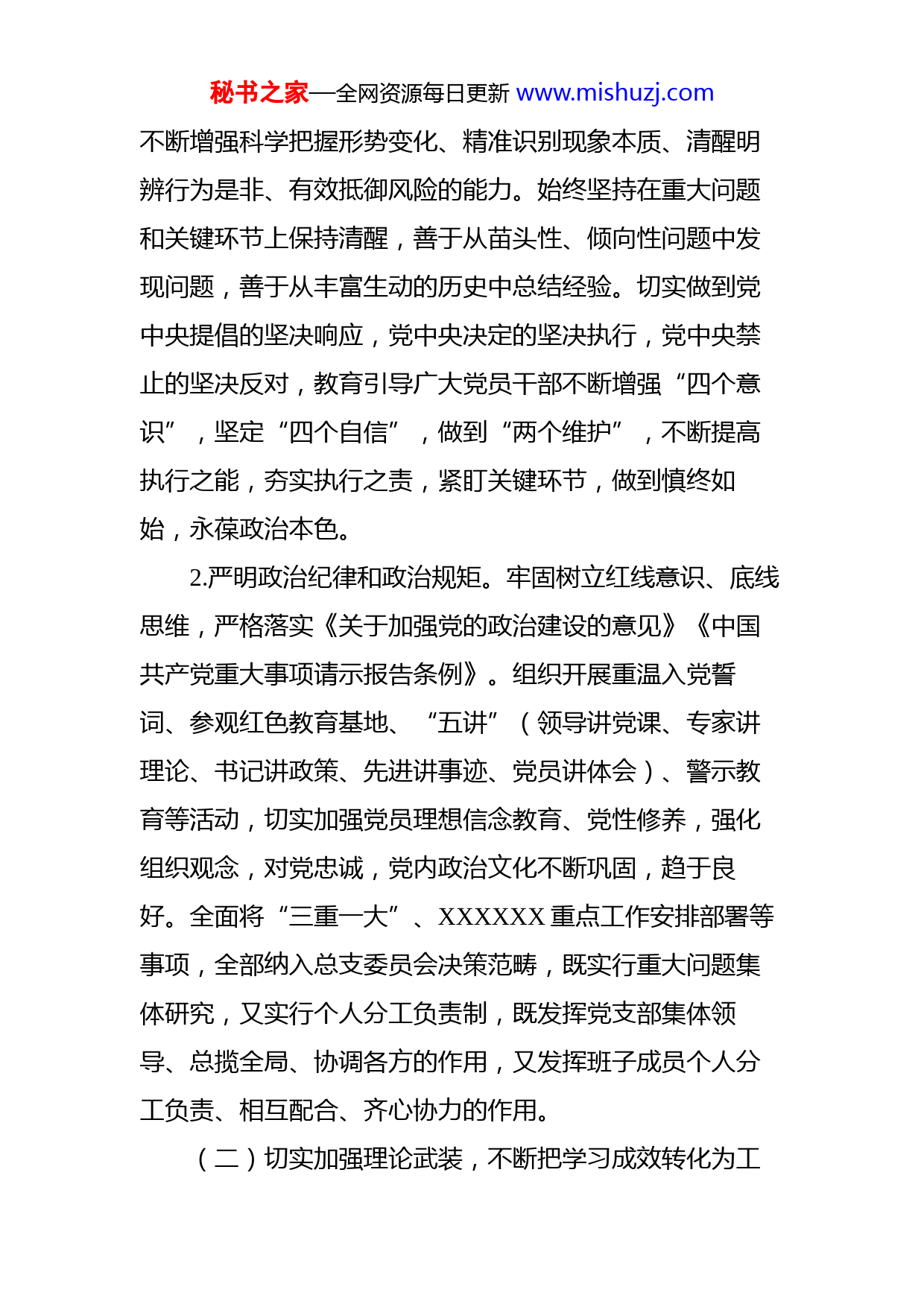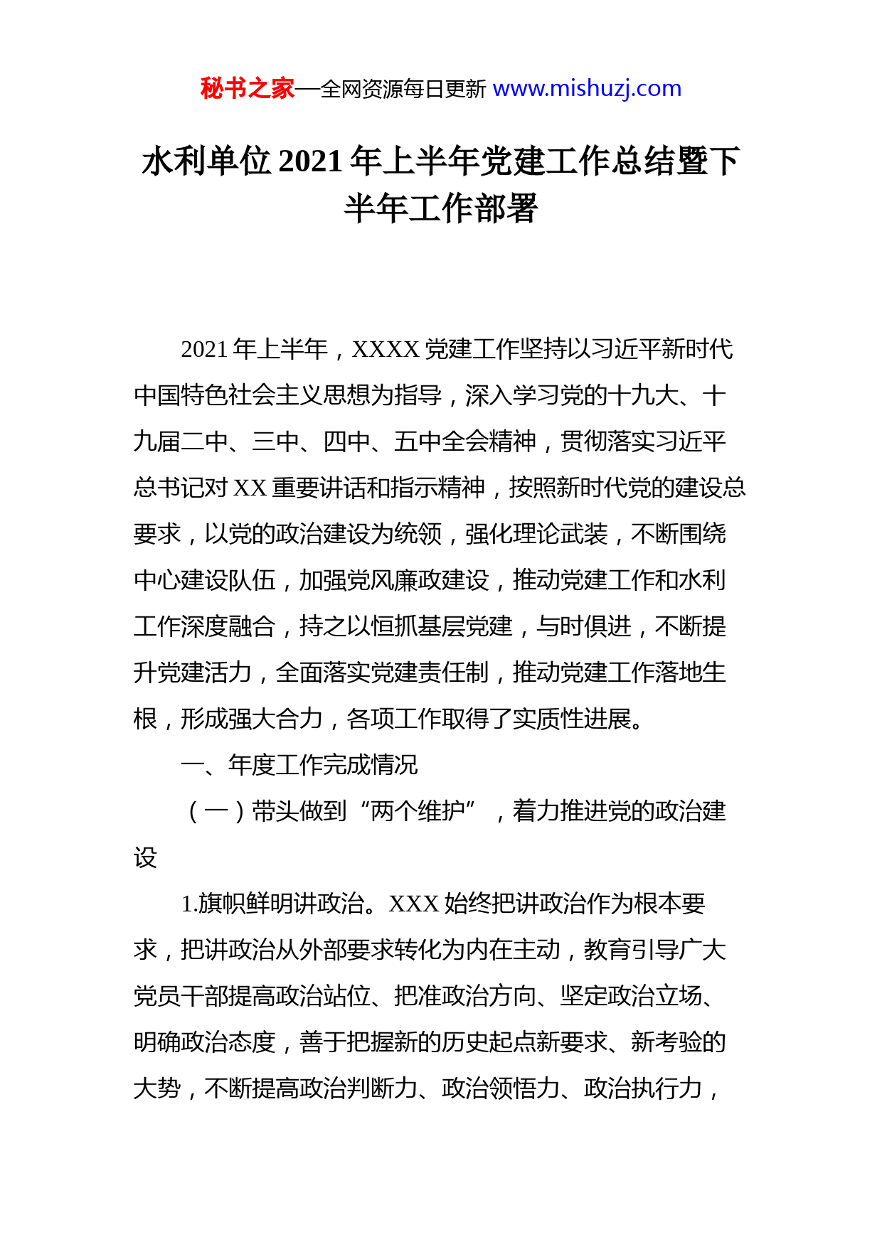 秘书之家—全网资源每日更新www.mishuzj.com水利单位2021年上半年党建工作总结暨下半年工作部署2021年上半年,XXXX党建工作坚持以习近平新时代中国特色社会主义思想为指导,深入学习党的十九大、十九届二中、三中、四中、五中全会精神,贯彻落实习近平总书记对XX重要讲话和指示精神,按照新时代党的建设总要求,以党的政治建设为统领,强化理论武装,不断围绕中心建设队伍,加强党风廉政建设,推动党建工作和水利工作深度融合,持之以恒抓基层党建,与时俱进,不断提升党建活力,全面落实党建责任制,推动党建工作落地生根,形成强大合力,各项工作取得了实质性进展。一、年度工作完成情况(一)带头做到“两个维护”,着力推进党的政治建设1.旗帜鲜明讲政治。XXX始终把讲政治作为根本要求,把讲政治从外部要求转化为内在主动,教育引导广大党员干部提高政治站位、把准政治方向、坚定政治立场、明确政治态度,善于把握新的历史起点新要求、新考验的大势,不断提高政治判断力、政治领悟力、政治执行力,秘书之家—全网资源每日更新www.mishuzj.com不断增强科学把握形势变化、精准识别现象本质、清醒明辨行为是非、有效抵御风险的能力。始终坚持在重大问题和关键环节上保持清醒,善于从苗头性、倾向性问题中发现问题,善于从丰富生动的历史中总结经验。切实做到党中央提倡的坚决响应,党中央决定的坚决执行,党中央禁止的坚决反对,教育引导广大党员干部不断增强“四个意识”,坚定“四个自信”,做到“两个维护”,不断提高执行之能,夯实执行之责,紧盯关键环节,做到慎终如始,永葆政治本色。2.严明政治纪律和政治规矩。牢固树立红线意识、底线思维,严格落实《关于加强党的政治建设的意见》《中国共产党重大事项请示报告条例》。组织开展重温入党誓词、参观红色教育基地、“五讲”(领导讲党课、专家讲理论、书记讲政策、先进讲事迹、党员讲体会)、警示教育等活动,切实加强党员理想信念教育、党性修养,强化组织观念,对党忠诚,党内政治文化不断巩固,趋于良好。全面将“三重一大”、XXXXXX重点工作安排部署等事项,全部纳入总支委员会决策范畴,既实行重大问题集体研究,又实行个人分工负责制,既发挥党支部集体领导、总揽全局、协调各方的作用,又发挥班子成员个人分工负责、相互配合、齐心协力的作用。(二)切实加强理论武装,不断把学习成效转化为工秘书之家—全网资源每日更新www.mishuzj.com作成效。3.认真扎实开展党史学习教育。XXXX始终把党史学习教育作为一项贯穿全年的政治任务,坚持学习党史与学习新中国史、改革开放史、社会主义发展史相贯通,通过领学、个人自学、研讨交流、专题讲座、观看视频等形式,对习近平《论中国共产党历史》等重点必读书籍深学细悟,《习近平新时代中国特色社会主义思想学习纲要》等辅助读本做到应学尽学,对党内各项制度法规长期学习。明确学习落实标准,即书本有痕迹、学习有笔记、读后有心得,制定详细学习计划,定期开展知识测试,展评学习成果,不断增强理论学习的指导性和规范性。极拓宽学习渠道。利用学习强国、XX党建等平台“党史学习教育”专栏学习,推行学习积分制,积极号召参加线上线下知识竞赛,着力打造传统资源与网络载体灵活结合的学习模式。XXXXX、各党支部已开展集中学习9次,专题辅导1次,开展研讨交流7次,参加读书班2次,组织专题讲座2次,集中分享学习心得3次,组织观看视频8次,开展党史知识测试2次。4.理论联系实际学。弘扬理论联系实际的马克思主义作风,组织干部职工赴XXXX参观,开展重走长征路等主题党日活动,在生动教育中坚定为社会主义事业、XX事业不渝奋斗的理想信念。举办了“迎五一、庆五四”红色经典秘书之家—全网资源每日更新www.mishuzj.com诵读暨XXX故事分享会,开展学习袁隆平院士等榜样模范,用XXX故事、XXX发展史、典型人物端正价值追求。积极参加知识竞赛3次、参演XXXX“奋斗百年路,圆梦疏勒河”庆祝中国共产党成立100周年文艺晚会,用文化引领唱响主流旋律。5.切实开展“我为群众办实事”实践活动。结合党史学习教育,切实为群众办实事解难题。举办了职工健康知识讲座、安全生产讲座,组织开展了防震、禁毒、防洪安全演练,引导职工形成健康安全的生活生产方式。为XXX职工续缴互助保险金,报销XX人次,投入XX万元对生病住院的XX名职工进行慰问,解除了职工的后顾之忧。持续开展“XXX”志愿行动,对XXX内孤寡老人、留守儿童、困难群众进行节前节后慰问,不断XXX等实践活动项目,确定4项实事项目,完成3项,1项正在推进中。(三)贯彻落实党的组织路线,充分发挥党组织的战斗堡垒作用。6.抓好组织体系建设。认真贯彻落实党委(党组)工作条例和党的机关工作条例,打通党中央决策部署“最后一公里”,持续深化巩固“让党中央放心、让人民群众满意的模范机关”创建活动、“党章党规落实”专项行动、“党支部建设标准化提质增效”行动成果,不断深化“划区设岗”“三亮五比三评一争”等特色长期坚持的活动,秘书之家—全网资源每日更新www.mishuzj.com落实中心党委“省直机关标准化建设示范党支部”创建活动,再选树1个党支部打造“标准化”特色品牌。XXX始终坚持走在前、做表率,带头做好班子队伍建设,落实XXXX年度各项工