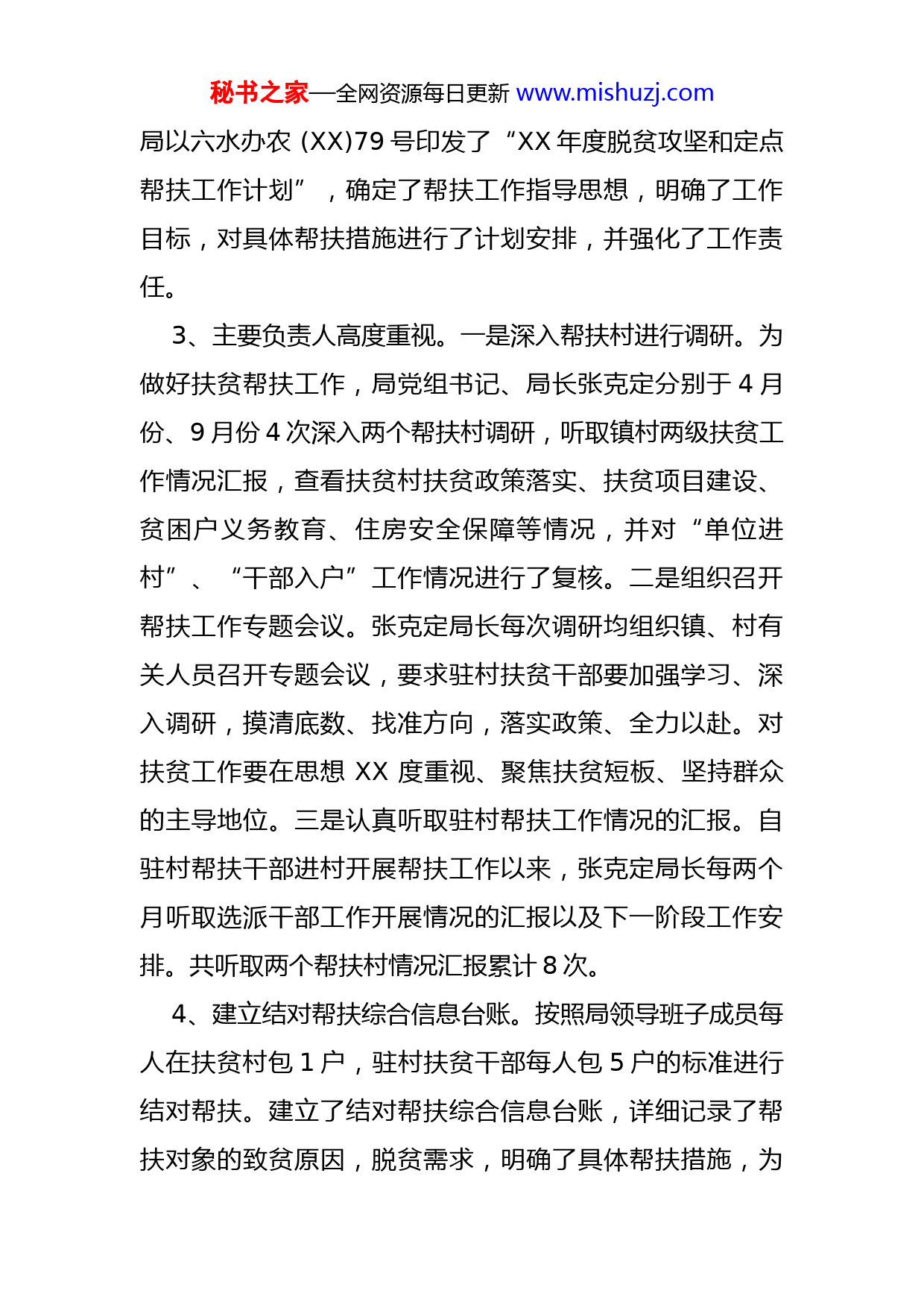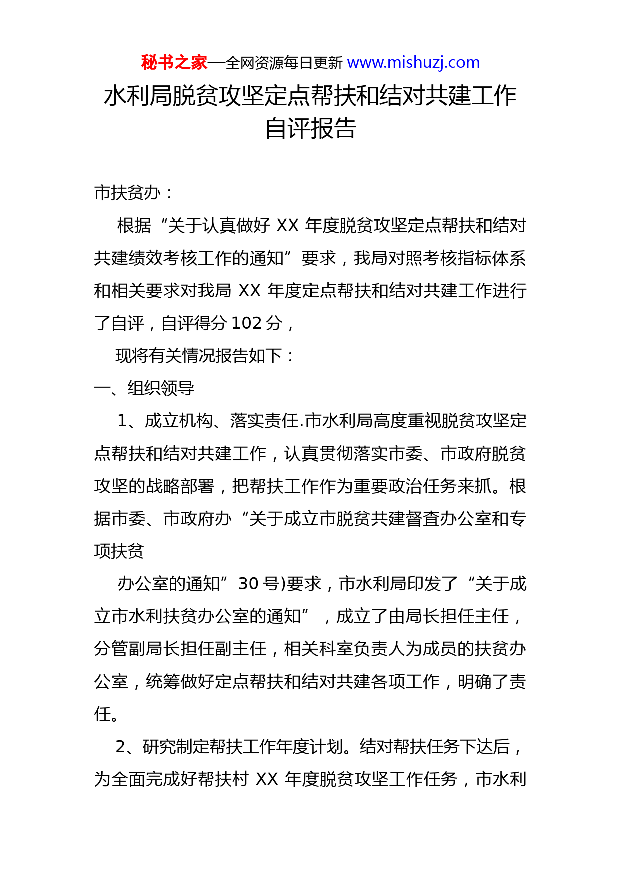 秘书之家—全网资源每日更新www.mishuzj.com水利局脱贫攻坚定点帮扶和结对共建工作自评报告市扶贫办:根据“关于认真做好XX年度脱贫攻坚定点帮扶和结对共建绩效考核工作的通知”要求,我局对照考核指标体系和相关要求对我局XX年度定点帮扶和结对共建工作进行了自评,自评得分102分,现将有关情况报告如下:一、组织领导1、成立机构、落实责任.市水利局高度重视脱贫攻坚定点帮扶和结对共建工作,认真贯彻落实市委、市政府脱贫攻坚的战略部署,把帮扶工作作为重要政治任务来抓。根据市委、市政府办“关于成立市脱贫共建督査办公室和专项扶贫办公室的通知”30号)要求,市水利局印发了“关于成立市水利扶贫办公室的通知”,成立了由局长担任主任,分管副局长担任副主任,相关科室负责人为成员的扶贫办公室,统筹做好定点帮扶和结对共建各项工作,明确了责任。2、研究制定帮扶工作年度计划。结对帮扶任务下达后,为全面完成好帮扶村XX年度脱贫攻坚工作任务,市水利秘书之家—全网资源每日更新www.mishuzj.com局以六水办农(XX)79号印发了“XX年度脱贫攻坚和定点帮扶工作计划”,确定了帮扶工作指导思想,明确了工作目标,对具体帮扶措施进行了计划安排,并强化了工作责任。3、主要负责人高度重视。一是深入帮扶村进行调研。为做好扶贫帮扶工作,局党组书记、局长张克定分别于4月份、9月份4次深入两个帮扶村调研,听取镇村两级扶贫工作情况汇报,查看扶贫村扶贫政策落实、扶贫项目建设、贫困户义务教育、住房安全保障等情况,并对“单位进村”、“干部入户”工作情况进行了复核。二是组织召开帮扶工作专题会议。张克定局长每次调研均组织镇、村有关人员召开专题会议,要求驻村扶贫干部要加强学习、深入调研,摸清底数、找准方向,落实政策、全力以赴。对扶贫工作要在思想XX度重视、聚焦扶贫短板、坚持群众的主导地位。三是认真听取驻村帮扶工作情况的汇报。自驻村帮扶干部进村开展帮扶工作以来,张克定局长每两个月听取选派干部工作开展情况的汇报以及下一阶段工作安排。共听取两个帮扶村情况汇报累计8次。4、建立结对帮扶综合信息台账。按照局领导班子成员每人在扶贫村包1户,驻村扶贫干部每人包5户的标准进行结对帮扶。建立了结对帮扶综合信息台账,详细记录了帮扶对象的致贫原因,脱贫需求,明确了具体帮扶措施,为秘书之家—全网资源每日更新www.mishuzj.com后期帮扶工作开展打下了良好的基础。二、选派干部1、选派干部驻村帮扶。市水利局高度重视帮扶工作,选派了基层工作经验丰富、专业素质高的局党组成员、总工鲍家章,治淮副指挥张功义2名副处级干部分别赴苏北村、杨集村驻村开展扶贫帮扶工作。2、选派干部按要求驻村。两位选派干部严格按要求驻村开展工作,严格执行省、市、区关于驻村扶贫各项规定,与单位所有业务脱钩,未发生中途换人、召回等情况,驻村工作时间远远超过省、市规定的时间。3、选派干部日志和双月报。两位驻村干部按要求认真记录工作日志,每两月总结工作开展情况并提出下阶段工作计划,工作日志和双月报均形成了电子档案,且双月报均按时上报镇党委和区政府。三、驻村工作1、坚持工作日在岗。两位选派干部5月初驻村开展工作,工作日严格到岗到位,遇特殊情况,两位干部放弃休息坚持在岗开展工作,且经常加班加点。XX年度鲍家章驻村工作180天,张功义驻村工作190天,均超出169个工作日。2、帮助贫困村制定扶贫规划计划并落实。为加快实现村出列、户脱贫目标,驻村扶贫工作队和贫困村两委认真研究,并广泛征求村党员及群众意见,制定了苏北村XX-秘书之家—全网资源每日更新www.mishuzj.com2019年脱贫攻坚三年规划,修改完善了杨集村十三五精准扶贫项目规划,并按照扶贫规划要求制定了XX年年度工作计划。贫困村均严格按照规划计划要求落实扶贫各项工作,XX年度苏北村和杨集村均通过省脱贫攻坚第三方监测评估,杨集村还顺利实现了整村出列的脱贫攻坚任务。3、工作队贫困户落实帮扶责任人。两村驻村工作队均按要求为每位贫困户落实帮扶责任人,其中处级干部包5户,其他干部包3户。杨集村68个贫困户,落实了21名帮扶责任人;苏北村106个贫困户,落实了29名帮扶责任人。四、干部包户1、单位按要求落实干部包户。市水利局严格按要求落实干部包户任务,每位局党组成员在苏北村包贫困户1户,驻村扶贫干部包贫困户5户。2、包户干部按要求走访贫困户。包户干部均积极主动联系贫困户,按要求定期走访,了解贫困户生产生活和身体状况,宣传扶贫有关政策,了解有关扶贫项目、扶贫措施落地情况,并为贫困户解决实际困难。各位帮扶干部XX年每月走访均为1~2次。3、对贫困户有帮扶措施。针对贫困户的自身实际情况,局包户干部多次上门沟通谈心,因户施策,帮助他解开思想上的包袱,让贫困户真心想脱贫、真心想致富,增强自我求变、自我发展的志气,为实现预期脱贫激发自身发展秘书之家—全网资源每日更新www.mishuzj.com动力。帮助贫困户落实各项扶贫政策,结合水利实际,为未通水贫困户解决自来水,在各节日上门慰问,并送去慰问金。4、贫困户综合信息规范。贫困户扶贫手册中家庭基本情况、主要致贫原因等信息填写详细,提出了有针对性的帮扶措施,并落实了帮扶措施责