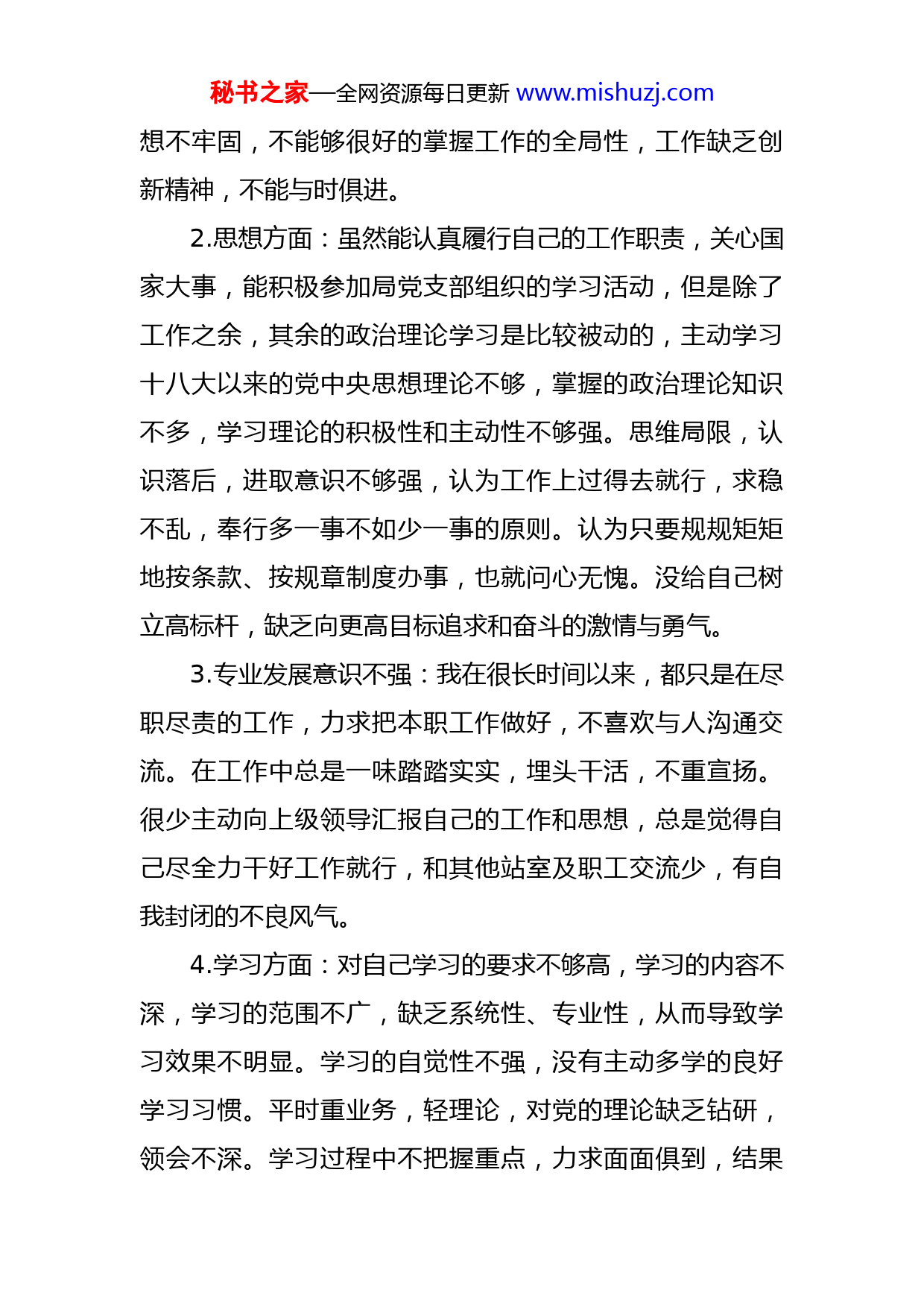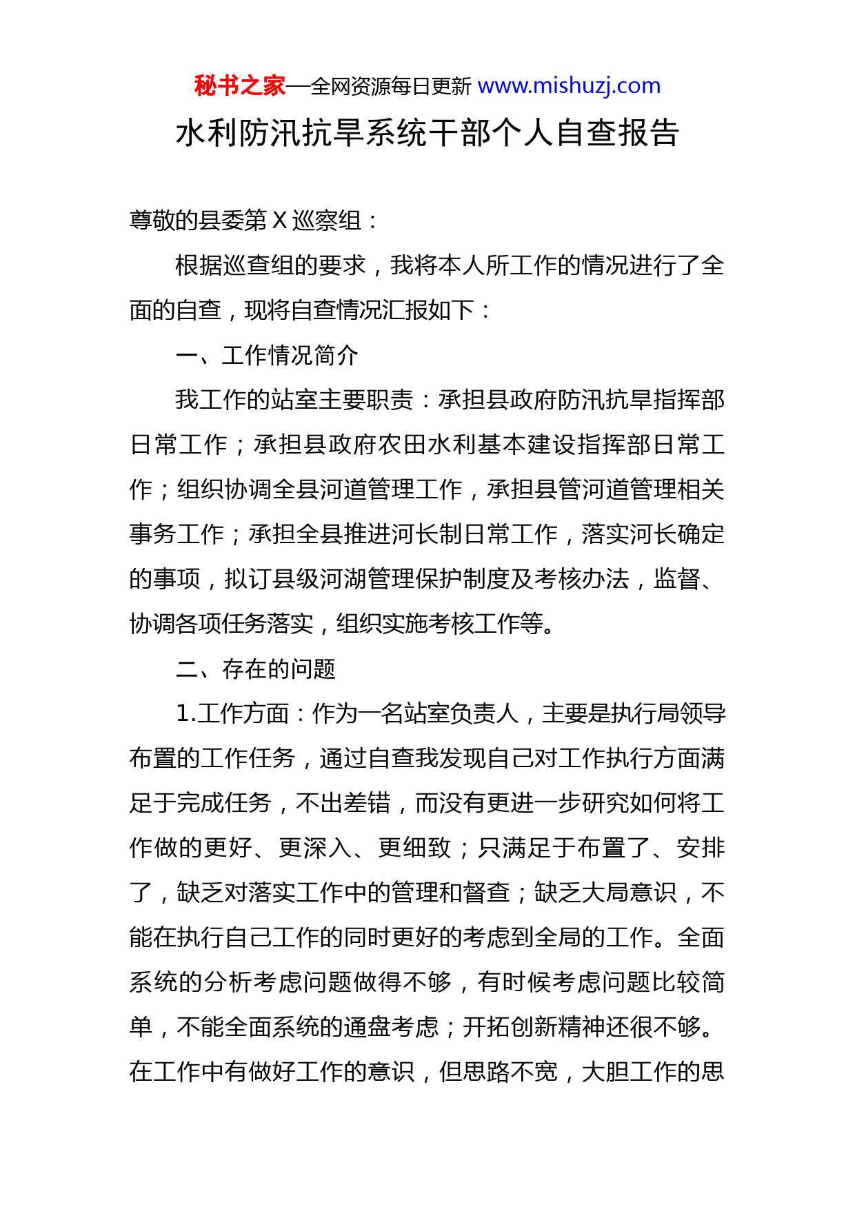 秘书之家—全网资源每日更新www.mishuzj.com水利防汛抗旱系统干部个人自查报告尊敬的县委第X巡察组:根据巡查组的要求,我将本人所工作的情况进行了全面的自查,现将自查情况汇报如下:一、工作情况简介我工作的站室主要职责:承担县政府防汛抗旱指挥部日常工作;承担县政府农田水利基本建设指挥部日常工作;组织协调全县河道管理工作,承担县管河道管理相关事务工作;承担全县推进河长制日常工作,落实河长确定的事项,拟订县级河湖管理保护制度及考核办法,监督、协调各项任务落实,组织实施考核工作等。二、存在的问题1.工作方面:作为一名站室负责人,主要是执行局领导布置的工作任务,通过自查我发现自己对工作执行方面满足于完成任务,不出差错,而没有更进一步研究如何将工作做的更好、更深入、更细致;只满足于布置了、安排了,缺乏对落实工作中的管理和督查;缺乏大局意识,不能在执行自己工作的同时更好的考虑到全局的工作。全面系统的分析考虑问题做得不够,有时候考虑问题比较简单,不能全面系统的通盘考虑;开拓创新精神还很不够。在工作中有做好工作的意识,但思路不宽,大胆工作的思秘书之家—全网资源每日更新www.mishuzj.com想不牢固,不能够很好的掌握工作的全局性,工作缺乏创新精神,不能与时俱进。2.思想方面:虽然能认真履行自己的工作职责,关心国家大事,能积极参加局党支部组织的学习活动,但是除了工作之余,其余的政治理论学习是比较被动的,主动学习十八大以来的党中央思想理论不够,掌握的政治理论知识不多,学习理论的积极性和主动性不够强。思维局限,认识落后,进取意识不够强,认为工作上过得去就行,求稳不乱,奉行多一事不如少一事的原则。认为只要规规矩矩地按条款、按规章制度办事,也就问心无愧。没给自己树立高标杆,缺乏向更高目标追求和奋斗的激情与勇气。3.专业发展意识不强:我在很长时间以来,都只是在尽职尽责的工作,力求把本职工作做好,不喜欢与人沟通交流。在工作中总是一味踏踏实实,埋头干活,不重宣扬。很少主动向上级领导汇报自己的工作和思想,总是觉得自己尽全力干好工作就行,和其他站室及职工交流少,有自我封闭的不良风气。4.学习方面:对自己学习的要求不够高,学习的内容不深,学习的范围不广,缺乏系统性、专业性,从而导致学习效果不明显。学习的自觉性不强,没有主动多学的良好学习习惯。平时重业务,轻理论,对党的理论缺乏钻研,领会不深。学习过程中不把握重点,力求面面俱到,结果秘书之家—全网资源每日更新www.mishuzj.com忽视了直接相关工作需要的重点内容。尽管我也经常学习,但学习的深度不够。结果分析问题和处理问题的方法简单,对具体问题分析力度不够,不能全面应用发展的观点处理问题。通过这次巡查,我认真剖析了自己的思想根源,觉得我所存在的一系列问题,归根结底是放松了政治理论学习,放松了自己的思想改造,宗旨观念有所淡化,导致自己在许多方面虽知道不足,但常找借口来回避问题。三、整改措施通过这次巡查,我认真反思了自己的不足,决心边学边改,立查立纠。在今后的工作中,认真把握好以下几个方面:首先做解放思想的排头兵。在今后的工作中,自己要着眼于新思路、新视野、新举措来做好本职工作。坚持严于律已,实事求是的思想路线,时刻牢记党的宗旨,不断加强党性锻炼,堂堂正正做人、扎扎实实办事。其次加强学习,提高素质。全面认真系统地学习党的方针政策,以XXX新时代中国特色社会主义思想武装自己的头脑,注重政治理论和专业知识同时发展,多学习,多反思,勤工作,让思想落到实处。按照合格的共产党员的标准要求自己,时刻把坚定共产主义理想信念放在首位,把它作为自己的立身之本、奋斗动力和行为坐标,立党为秘书之家—全网资源每日更新www.mishuzj.com公,甘于奉献。最后在今后将以这次活动为契机,进一步提高思想认识,转变工作作风,改正不足,提高自己,真正使自己的思想得到进一步净化、工作得到进一步提高、作风得到进一步改进、行为得到进一步规范,努力把自己的各项工作做好,取得成效,坚持不懈,坚持到底。