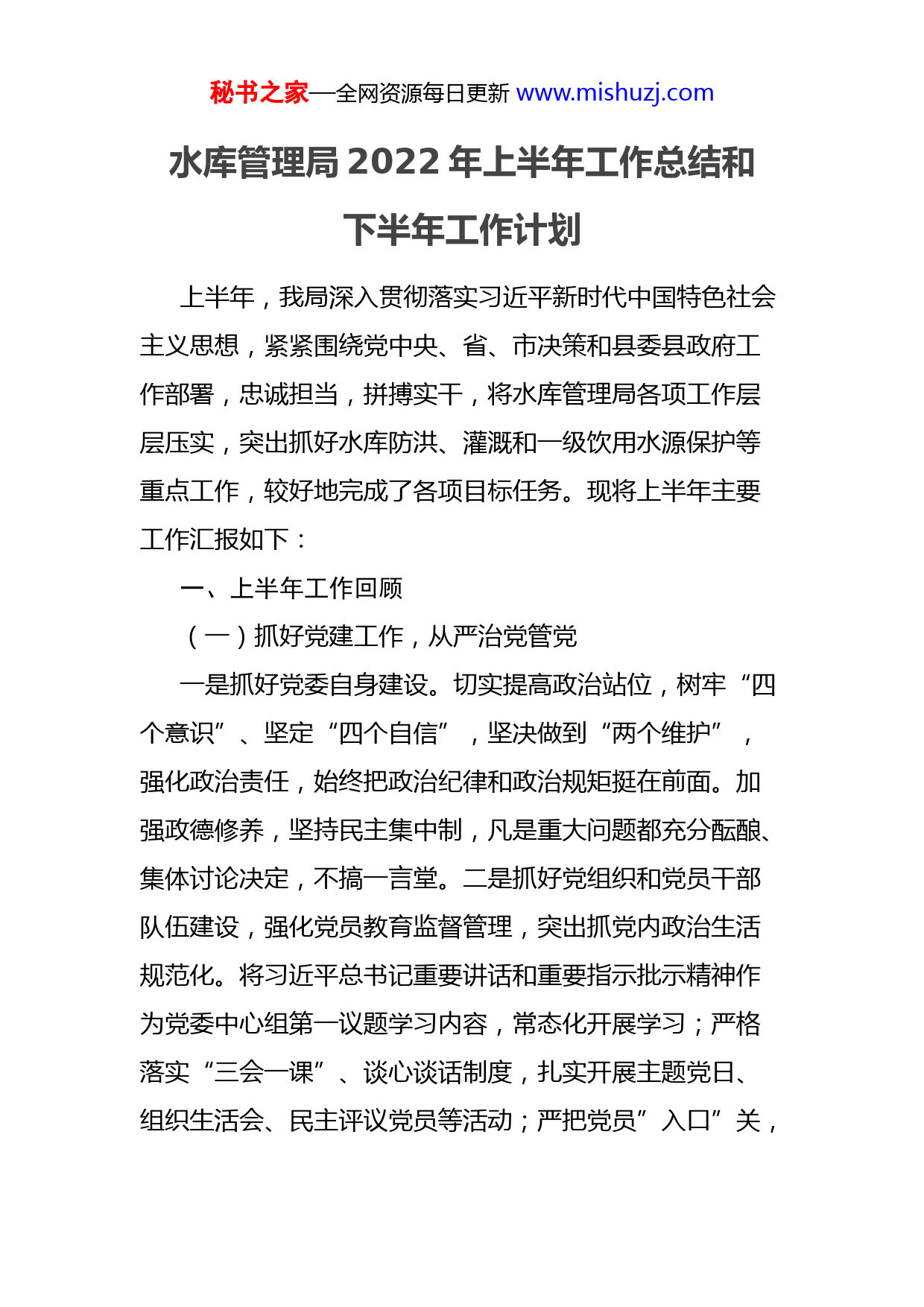 秘书之家—全网资源每日更新www.mishuzj.com水库管理局2022年上半年工作总结和下半年工作计划上半年,我局深入贯彻落实习近平新时代中国特色社会主义思想,紧紧围绕党中央、省、市决策和县委县政府工作部署,忠诚担当,拼搏实干,将水库管理局各项工作层层压实,突出抓好水库防洪、灌溉和一级饮用水源保护等重点工作,较好地完成了各项目标任务。现将上半年主要工作汇报如下:一、上半年工作回顾(一)抓好党建工作,从严治党管党一是抓好党委自身建设。切实提高政治站位,树牢“四个意识”、坚定“四个自信”,坚决做到“两个维护”,强化政治责任,始终把政治纪律和政治规矩挺在前面。加强政德修养,坚持民主集中制,凡是重大问题都充分酝酿、集体讨论决定,不搞一言堂。二是抓好党组织和党员干部队伍建设,强化党员教育监督管理,突出抓党内政治生活规范化。将习近平总书记重要讲话和重要指示批示精神作为党委中心组第一议题学习内容,常态化开展学习;严格落实“三会一课”、谈心谈话制度,扎实开展主题党日、组织生活会、民主评议党员等活动;严把党员”入口”关,秘书之家—全网资源每日更新www.mishuzj.com保证发展党员的质量,上半年,全局共发展党员1名,预备党员转正2名。三是严格履行“一岗双责”,抓好党风廉政建设。坚持把党风廉政建设工作列入党委重要议事日程,与防洪灌溉、工程管理、安全生产、一级饮用水源保护等工作同部署、同落实、同检查、同考核,使党风廉政建设与全局中心工作同步推进、协调发展。四是加强基层服务型党组织建设。结合“党旗领航、部门下沉”结对共建、乡村振兴活动,推动领导力量和组织资源下基层,建立党建工作联系点,发挥基层党组织战斗堡垒作用。五是严格落实中央八项规定精神、厉行节约、公车改革、办公用房、公务接待、婚丧嫁娶报备、因私出国(境)管理等规定,重点抓好重大节日前后、重要领域、关键环节、重要岗位的执纪监督。认真开展谈话提醒工作,及时对一些苗头性、倾向性问题进行制止,做到早发现、早提醒、早纠正。上半年,全局共开展谈话提醒22人次、问询笔录6人次。(二)抓好疫情防控,严守防疫阵地自疫情防控工作开展以来,我局高度重视疫情防控工作,充分发挥局疫情防控工作领导小组作用。上半年,疫情防控分管领导主持召开疫情防控工作政务会议4次,党委领导班子会议反复强调疫情防控工作,严格按照上级文件要求,坚持“外防输入、内防反弹”的总策略,做好疫情防秘书之家—全网资源每日更新www.mishuzj.com控相关工作。一是落实主体责任。主要领导靠前指挥,统筹部署,牵头制定《xx县xx水库管理局新冠肺炎疫情防控和应急处置工作方案》,扛牢疫情防控政治责任,落实落细疫情防控措施,守好守牢疫情防控工作底线。二是开展广泛宣传。加强正面引导,积极发布关于疫情防控工作的最新官方消息,引导大家要严肃对待、积极防护,坚决做到不造谣、不传谣、不信谣,保持乐观心态,督促干部职工在公共区域必须佩戴口罩,做好示范带头作用。三是整治环境卫生。疫情防控期间,我局除及时调配充足口罩、消毒液、测温枪等防疫物资外,经常性开展对办公区域特别是楼梯间、卫生间、电梯间、食堂、办公桌椅、电脑键盘等重点部位等进行保洁消杀,最大限度降低病毒感染风险。四是严守防疫纪律。严格外出审批制度,按照“谁审批、谁负责”原则,全体干部职工坚决做到非必要不离惠,不到中、高风险地区逗留。同时,积极引导全局干部职工落实节假日返岗前核酸检测工作。五是及时接种疫苗。大力发动全局干部职工及退休人员及时接种疫苗。针对年龄大、行动不便的退休人员,我局主动安排专人专车接送往返,全力保障退休人员安全有序接种疫苗。截至目前,全局干部职工及退休人员中,适宜接种疫苗的人员已基本完成疫苗接种。六是支援抗疫一线。积极响应县委关于疫情防控的工作部署和《关于组建县直机关疫情防控应急先锋秘书之家—全网资源每日更新www.mishuzj.com队的通知》要求,上半年,全局共派出5名党员干部下沉支援抗疫一线工作,守好我县疫情防控阵地堡垒。七是开展专项检查。局纪委专项监督检查工作小组不定期对局机关办公楼、大坝事务部及发电公司的门岗设置、来访登记、防疫物资准备、环境卫生情况进行专项检查。要求各部门在办公场所设置测温点,每天上、下午对到岗的干部职工进行2次及以上体温检测及落实场所码打卡,严格对外来到访人员进行测温并登记在册,认真执行县疫情防控工作要求,时刻紧绷疫情防控这根弦,坚决打赢疫情防控保卫战。(三)履行岗位职责,突出重点工作1、抓好水库防洪灌溉工作。落实防汛责任制,认真贯彻“安全第一、常备不懈、以防为主、全力抢险”的工作方针,坚持24小时领导带班和值班值守制度。5月10日到13日我县有一次大范围的暴雨到大暴雨局地特大暴雨降水过程,根据上级调度指令对电站三台机组满负荷发电降低水位,及时腾出库容迎接强降雨,此次强降雨导致水库水位上升了6米多。强降雨过后,根据上级指令,再次对电站三台发电机组发电降低水库水位腾出库容,为迎接端午节“龙舟水”降雨作好充分准备。在做好水库防汛工作的同时,积极落实下游十万亩农田的灌溉任务,按照保春耕和保生态用