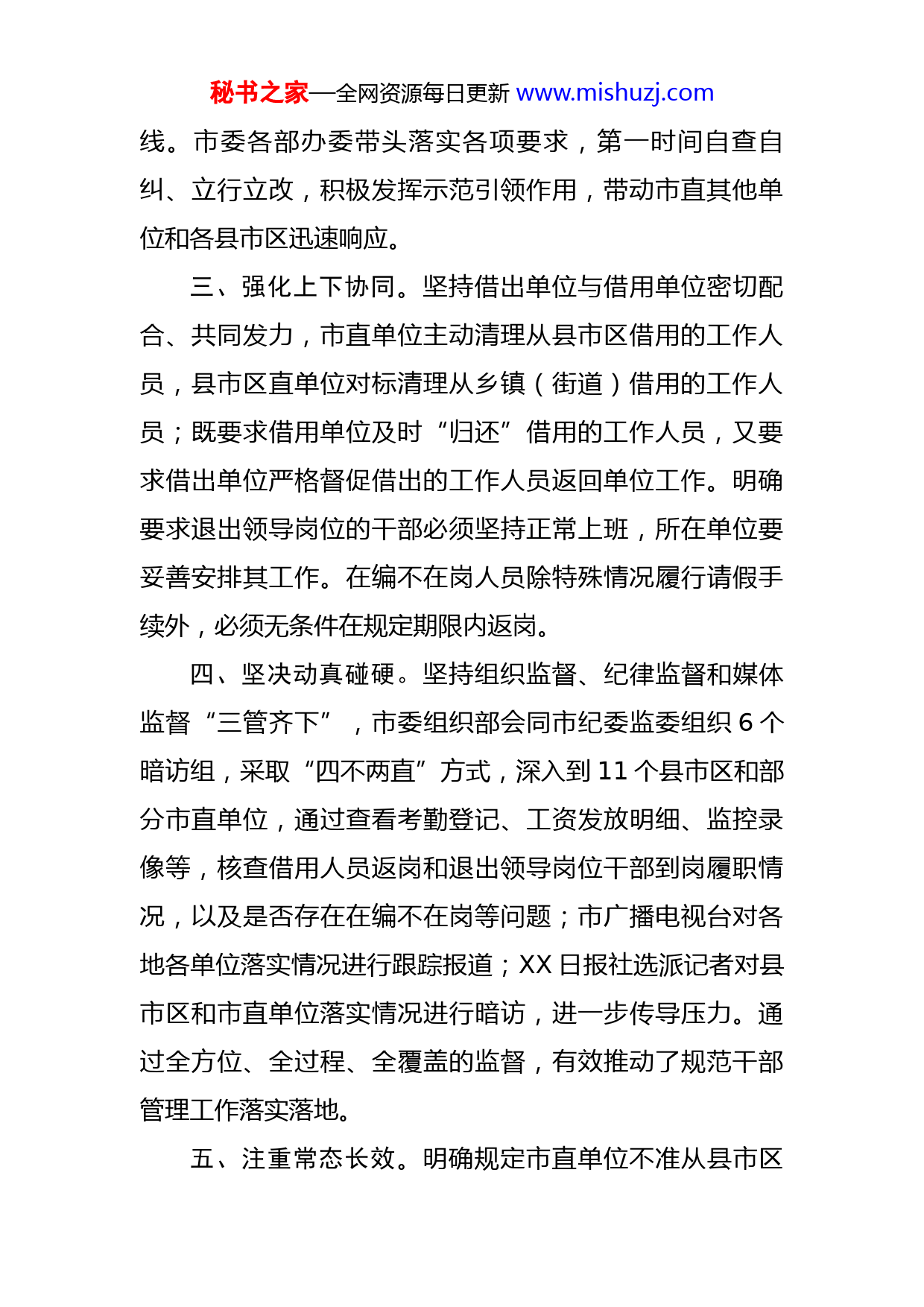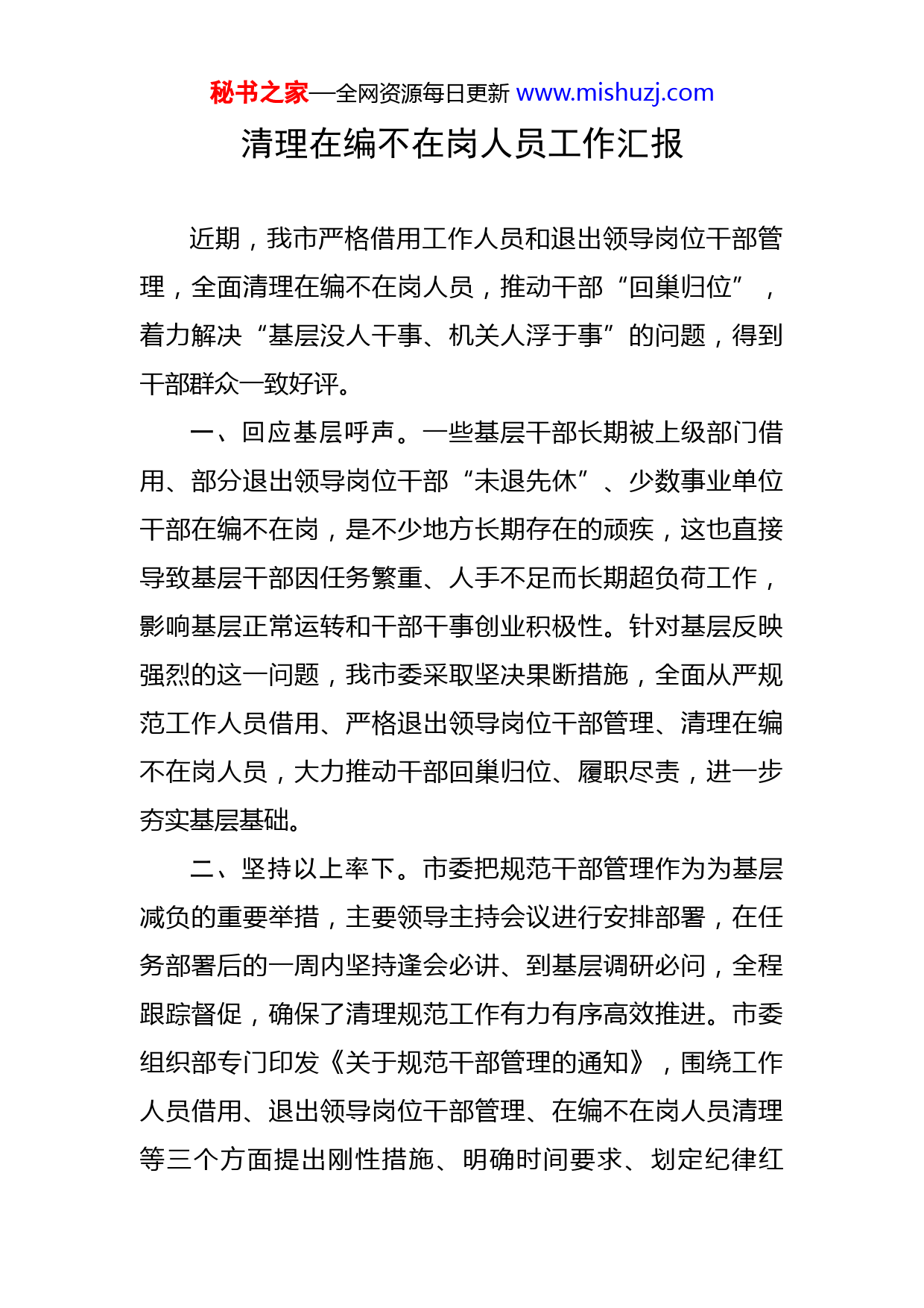 秘书之家—全网资源每日更新www.mishuzj.com清理在编不在岗人员工作汇报近期,我市严格借用工作人员和退出领导岗位干部管理,全面清理在编不在岗人员,推动干部“回巢归位”,着力解决“基层没人干事、机关人浮于事”的问题,得到干部群众一致好评。一、回应基层呼声。一些基层干部长期被上级部门借用、部分退出领导岗位干部“未退先休”、少数事业单位干部在编不在岗,是不少地方长期存在的顽疾,这也直接导致基层干部因任务繁重、人手不足而长期超负荷工作,影响基层正常运转和干部干事创业积极性。针对基层反映强烈的这一问题,我市委采取坚决果断措施,全面从严规范工作人员借用、严格退出领导岗位干部管理、清理在编不在岗人员,大力推动干部回巢归位、履职尽责,进一步夯实基层基础。二、坚持以上率下。市委把规范干部管理作为为基层减负的重要举措,主要领导主持会议进行安排部署,在任务部署后的一周内坚持逢会必讲、到基层调研必问,全程跟踪督促,确保了清理规范工作有力有序高效推进。市委组织部专门印发《关于规范干部管理的通知》,围绕工作人员借用、退出领导岗位干部管理、在编不在岗人员清理等三个方面提出刚性措施、明确时间要求、划定纪律红秘书之家—全网资源每日更新www.mishuzj.com线。市委各部办委带头落实各项要求,第一时间自查自纠、立行立改,积极发挥示范引领作用,带动市直其他单位和各县市区迅速响应。三、强化上下协同。坚持借出单位与借用单位密切配合、共同发力,市直单位主动清理从县市区借用的工作人员,县市区直单位对标清理从乡镇(街道)借用的工作人员;既要求借用单位及时“归还”借用的工作人员,又要求借出单位严格督促借出的工作人员返回单位工作。明确要求退出领导岗位的干部必须坚持正常上班,所在单位要妥善安排其工作。在编不在岗人员除特殊情况履行请假手续外,必须无条件在规定期限内返岗。四、坚决动真碰硬。坚持组织监督、纪律监督和媒体监督“三管齐下”,市委组织部会同市纪委监委组织6个暗访组,采取“四不两直”方式,深入到11个县市区和部分市直单位,通过查看考勤登记、工资发放明细、监控录像等,核查借用人员返岗和退出领导岗位干部到岗履职情况,以及是否存在在编不在岗等问题;市广播电视台对各地各单位落实情况进行跟踪报道;XX日报社选派记者对县市区和市直单位落实情况进行暗访,进一步传导压力。通过全方位、全过程、全覆盖的监督,有效推动了规范干部管理工作落实落地。五、注重常态长效。明确规定市直单位不准从县市区秘书之家—全网资源每日更新www.mishuzj.com借用工作人员,县市区直单位不准从乡镇(街道)借用工作人员,县市区不准跨行政区域借用工作人员,党委政府中心工作或重大项目指挥部确需借用工作人员的,原则上从本级有关单位借用,借用工作由组织部门统一管理;各单位党委(党组)对规范干部管理工作负主体责任,党委(党组)书记是第一责任人,一旦发现违反规定的情形,首先追究领导班子和党委(党组)书记的责任。通过健全机制、压实责任,确保常抓长严、常态长效。