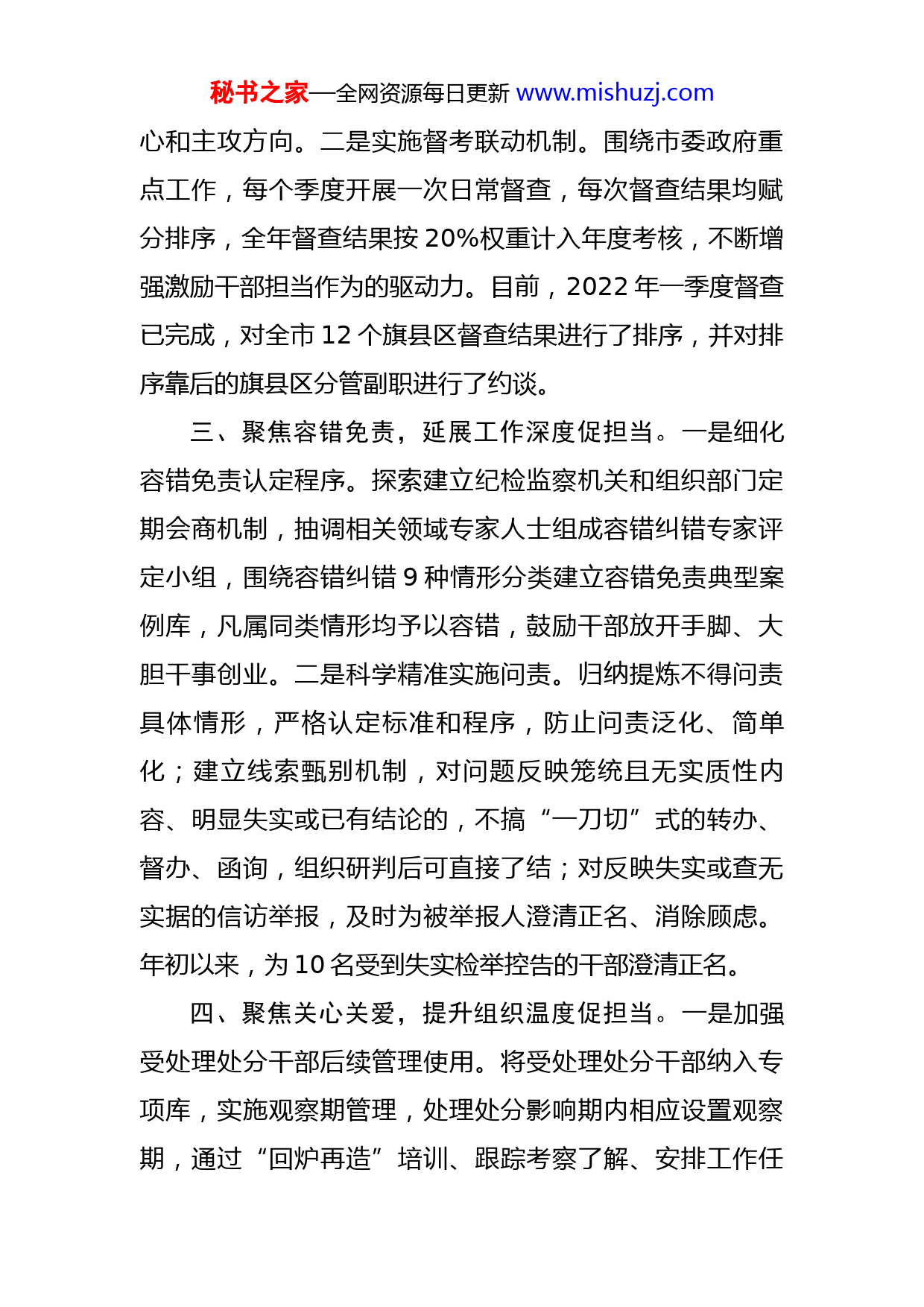 秘书之家—全网资源每日更新www.mishuzj.com激励干部担当作为工作情况汇报今年以来,我市聚焦激励干部担当作为堵点痛点问题,从多个维度入手,探索建立有效管用工作机制,激励全市干部在推动高质量发展中干事创业、担当作为。一、聚焦精准识别,加大选用力度促担当。一是建立“担当作为专项清单”。将组织部门日常了解、督考联动、年度考核“三位一体”紧密结合,列出担当作为专项清单,对清单中排序靠前且组织掌握一贯表现突出的干部,同等条件下优先提拔使用、晋升职级和评优评先;对清单中排序靠后且始终慵懒散拖、长期完不成工作任务的干部,果断进行调整。年初以来,全市提拔重用疫情防控、乡村振兴等一线表现突出的干部379人,对70名不胜任、不适宜担任现职干部进行了调整。二是常态化开展“择优比选”。根据市直机关干部队伍建设情况,每次拿出一定数量正副科级岗位面向全市进行择优比选,通过竞争性选拔,发现使用一批优秀年轻干部。二、聚焦考核驱动,突出考核精度促担当。一是实施精准化差异化考核。建立“绩效考核+年终考核+领导评价+日常督查”四位一体考核体系,对旗县区和市直机关领导班子实施精准化差异化考核,对招商引资、企业培育成效明显的班子,设置加分项,上不封顶,进一步明确工作重秘书之家—全网资源每日更新www.mishuzj.com心和主攻方向。二是实施督考联动机制。围绕市委政府重点工作,每个季度开展一次日常督查,每次督查结果均赋分排序,全年督查结果按20%权重计入年度考核,不断增强激励干部担当作为的驱动力。目前,2022年一季度督查已完成,对全市12个旗县区督查结果进行了排序,并对排序靠后的旗县区分管副职进行了约谈。三、聚焦容错免责,延展工作深度促担当。一是细化容错免责认定程序。探索建立纪检监察机关和组织部门定期会商机制,抽调相关领域专家人士组成容错纠错专家评定小组,围绕容错纠错9种情形分类建立容错免责典型案例库,凡属同类情形均予以容错,鼓励干部放开手脚、大胆干事创业。二是科学精准实施问责。归纳提炼不得问责具体情形,严格认定标准和程序,防止问责泛化、简单化;建立线索甄别机制,对问题反映笼统且无实质性内容、明显失实或已有结论的,不搞“一刀切”式的转办、督办、函询,组织研判后可直接了结;对反映失实或查无实据的信访举报,及时为被举报人澄清正名、消除顾虑。年初以来,为10名受到失实检举控告的干部澄清正名。四、聚焦关心关爱,提升组织温度促担当。一是加强受处理处分干部后续管理使用。将受处理处分干部纳入专项库,实施观察期管理,处理处分影响期内相应设置观察期,通过“回炉再造”培训、跟踪考察了解、安排工作任秘书之家—全网资源每日更新www.mishuzj.com务等方式,综合分析研判受处理处分干部思想教育、改进提升、工作表现等方面情况,影响期满随即开展观察期综合评估,对表现突出的,及时合理使用。二是落实干部待遇保障。严格执行干部待遇保障相关制度,对家庭确有困难或遭受重大变故的,加大帮扶力度,及时给予组织关怀;制发《市委管理的易地交流任职领导干部往返交通保障办法》,因地制宜为易地交流任职干部提供工作保障和生活便利。
