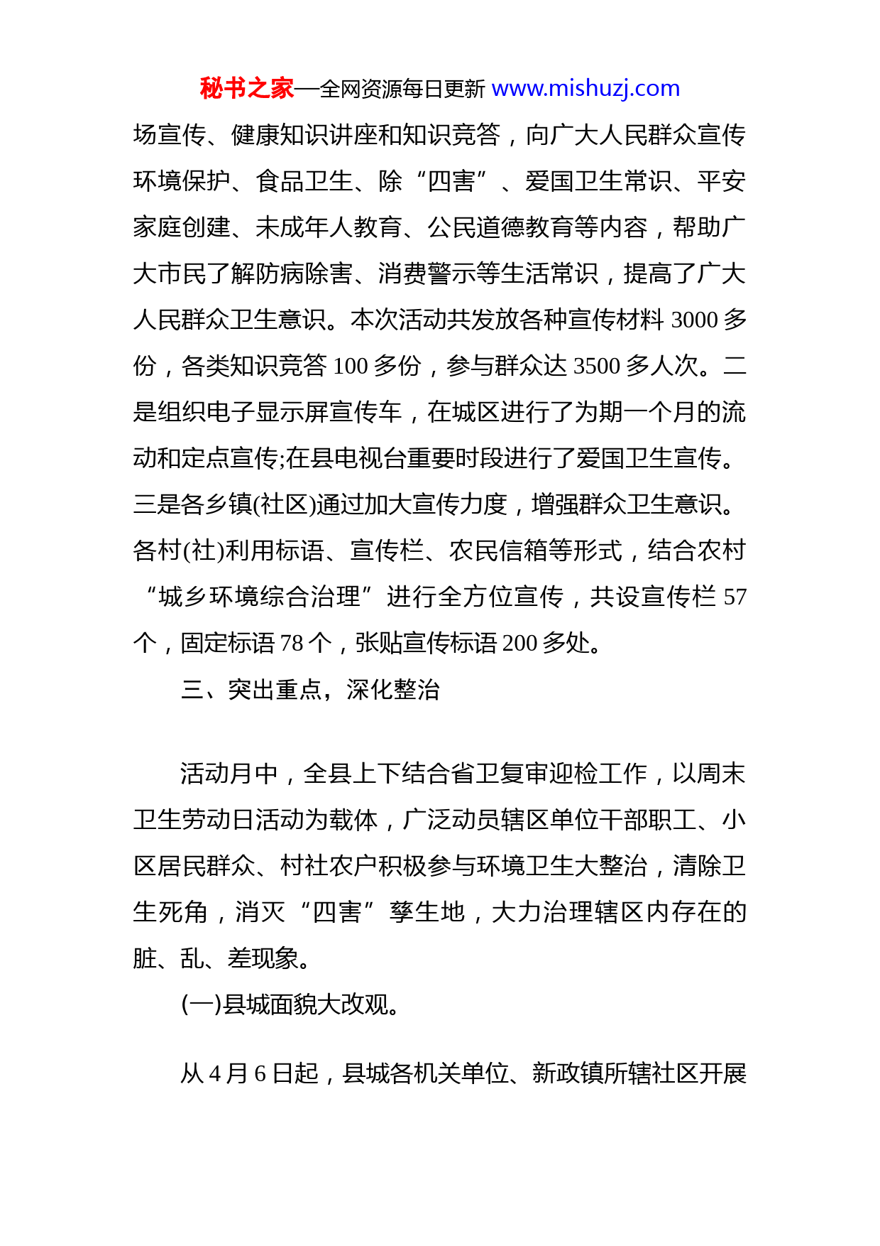 秘书之家—全网资源每日更新www.mishuzj.com爱国卫生月活动总结今年四月是第xx个爱国卫生月。县爱卫办从xx月xx日-xx月xx日,在全县城乡广泛深入开展以“整洁城乡,促进健康,省卫复审优先”为主题的爱国卫生月活动。现将活动开展情况总结如下。一、加强领导,精心组织我县精心组织,认真部署第xx个爱国卫生月活动。制定下发了x卫办〔20xx〕6号《xx县开展爱国卫生月活动的通知》文件,在全县范围内广泛开展爱国卫生月活动。要求各乡镇(社区)、县直各单位要结合迎接省级卫生县城复审活动,制定爱国卫生月活动计划,认真组织开展爱国卫生月活动。二、广泛宣传,增强意识爱国卫生月活动期间,围绕“整洁城乡,促进健康,省卫复审优先”、“新政是我家,环境靠大家”,开展了形式多样、内容丰富的健康教育宣传,增强了广大群众的卫生意识。一是由县城管执法局牵头组织县爱卫会各成员单位,举办第xx个爱国卫生月现场宣传活动。活动采取现秘书之家—全网资源每日更新www.mishuzj.com场宣传、健康知识讲座和知识竞答,向广大人民群众宣传环境保护、食品卫生、除“四害”、爱国卫生常识、平安家庭创建、未成年人教育、公民道德教育等内容,帮助广大市民了解防病除害、消费警示等生活常识,提高了广大人民群众卫生意识。本次活动共发放各种宣传材料3000多份,各类知识竞答100多份,参与群众达3500多人次。二是组织电子显示屏宣传车,在城区进行了为期一个月的流动和定点宣传;在县电视台重要时段进行了爱国卫生宣传。三是各乡镇(社区)通过加大宣传力度,增强群众卫生意识。各村(社)利用标语、宣传栏、农民信箱等形式,结合农村“城乡环境综合治理”进行全方位宣传,共设宣传栏57个,固定标语78个,张贴宣传标语200多处。三、突出重点,深化整治活动月中,全县上下结合省卫复审迎检工作,以周末卫生劳动日活动为载体,广泛动员辖区单位干部职工、小区居民群众、村社农户积极参与环境卫生大整治,清除卫生死角,消灭“四害”孳生地,大力治理辖区内存在的脏、乱、差现象。(一)县城面貌大改观。从4月6日起,县城各机关单位、新政镇所辖社区开展秘书之家—全网资源每日更新www.mishuzj.com了卫生整治和保洁行动,对各自办公楼室内外、城区的主次干道、背街小巷、城乡结合部等场所的脏、乱、差进行分片定点包干整治保洁,全面清除卫生死角;对摊子乱摆卖、车辆乱停放、广告乱张贴等问题及时整改;各窗口单位根据各自责任范围,进行了强有力的环境卫生整治,提高了管理水平,环境卫生面貌显著改观。据统计,共出各类宣传专刊64期,共有200多个单位对170个责任地段区域进行责任包干,出动4000余人次,清理卫生死角260余处,修剪绿化带、花圃约6000余平方米,清洗乱张贴19000余张,清理乱堆放杂物、废土等大小车辆约20余车,清掏化粪池210个,疏通沟渠、下水道80余条,整改、规范垃圾容器100多处。(二)农村面貌大改善。农村在环境整治中,在乡镇爱卫机构的统一指挥协调下,村社干部带头,广大村民参与,清除了粪堆、草堆、垃圾污物,规范散养禽畜,深入开展农村环境专项整治,较好地解决了农村“五乱”(柴草乱垛、粪土乱堆、污水乱泼、垃圾乱倒、禽畜乱放)现象,清除了暴露垃圾,减少了污染源。同时加快了农村卫生厕所的改造力度,提高了农村环境卫生质量,减少和预防疾病的发生。同时加大了农村卫生村和卫生户的创建活动,通过创建带动了农村环境秘书之家—全网资源每日更新www.mishuzj.com卫生治理,以示范带动,推动了农村爱国卫生工作的新进展。据统计:农村共出动6.5万人(次)参加环境卫生整治行动,清理卫生死角6000多处,清理垃圾280余吨,疏通沟渠23公里,种植绿化8000平方米。(三)开展病媒生物防制。扎实做好春夏季传染病防控工作,有针对性地开展春季灭鼠等防控工作,清除暴露垃圾、污水坑塘等病媒生物孳生场所;结合农村改厕工作,教育、引导群众正确使用卫生厕所,提高改厕的防病效果;宣传普及以春夏季传染病预防为重点的卫生知识,不断提高广大群众的文明卫生意识和自我防病能力。通过活动的开展和综合整治,我县环境卫生面貌不断改善,四害密度得到有效控制,使爱国卫生月真正起到以月促年的作用,为省卫复审顺利过关打下良好的基础。