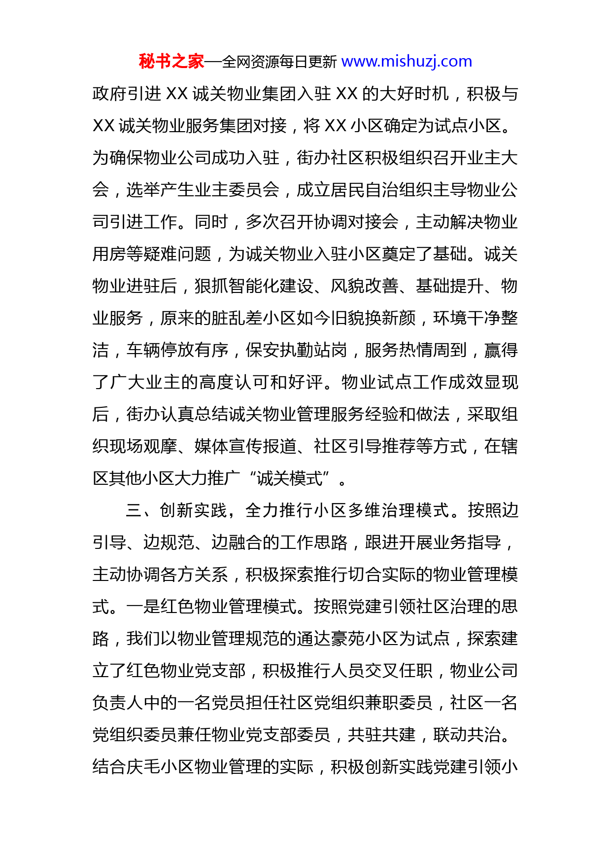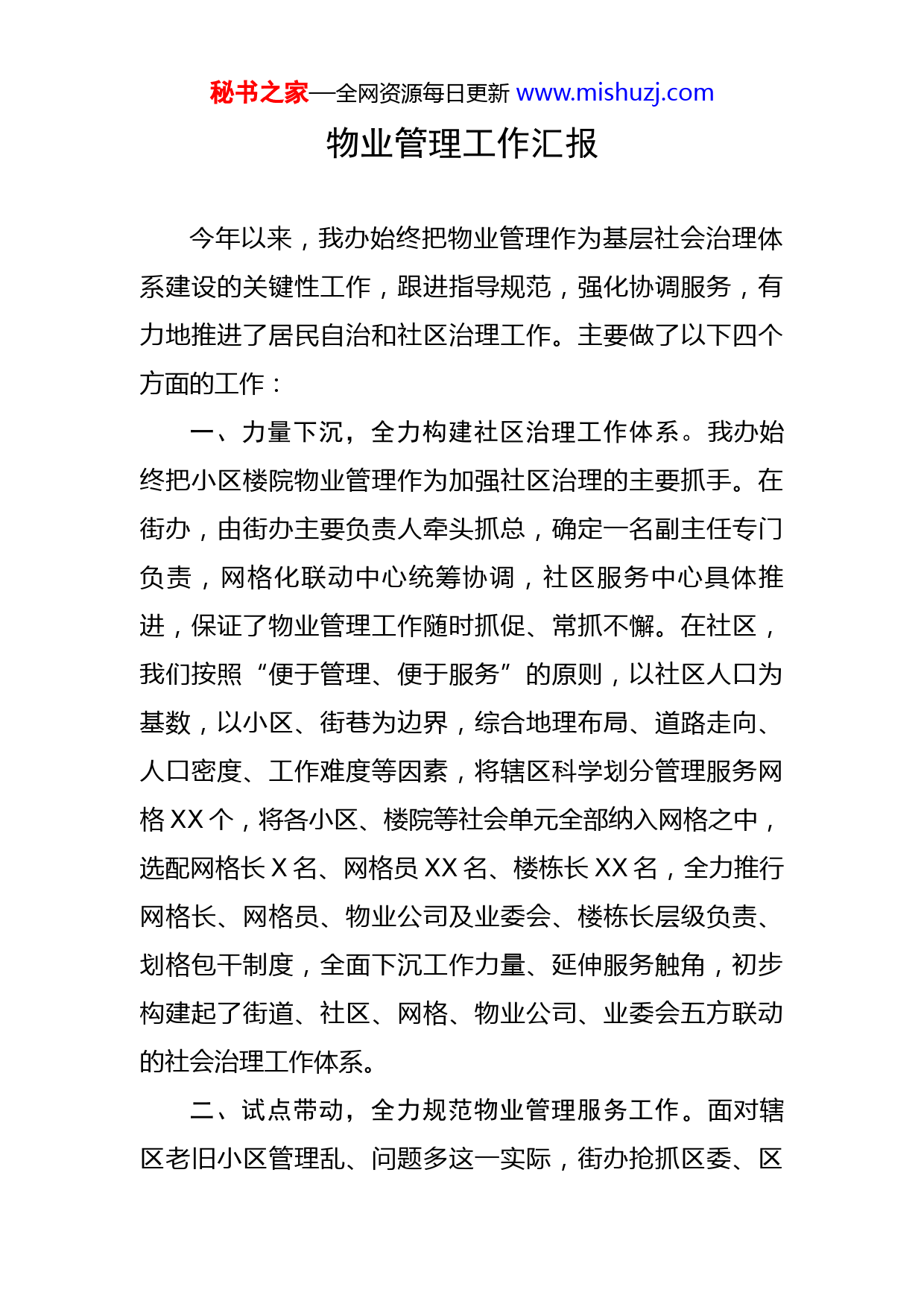 秘书之家—全网资源每日更新www.mishuzj.com物业管理工作汇报今年以来,我办始终把物业管理作为基层社会治理体系建设的关键性工作,跟进指导规范,强化协调服务,有力地推进了居民自治和社区治理工作。主要做了以下四个方面的工作:一、力量下沉,全力构建社区治理工作体系。我办始终把小区楼院物业管理作为加强社区治理的主要抓手。在街办,由街办主要负责人牵头抓总,确定一名副主任专门负责,网格化联动中心统筹协调,社区服务中心具体推进,保证了物业管理工作随时抓促、常抓不懈。在社区,我们按照“便于管理、便于服务”的原则,以社区人口为基数,以小区、街巷为边界,综合地理布局、道路走向、人口密度、工作难度等因素,将辖区科学划分管理服务网格XX个,将各小区、楼院等社会单元全部纳入网格之中,选配网格长X名、网格员XX名、楼栋长XX名,全力推行网格长、网格员、物业公司及业委会、楼栋长层级负责、划格包干制度,全面下沉工作力量、延伸服务触角,初步构建起了街道、社区、网格、物业公司、业委会五方联动的社会治理工作体系。二、试点带动,全力规范物业管理服务工作。面对辖区老旧小区管理乱、问题多这一实际,街办抢抓区委、区秘书之家—全网资源每日更新www.mishuzj.com政府引进XX诚关物业集团入驻XX的大好时机,积极与XX诚关物业服务集团对接,将XX小区确定为试点小区。为确保物业公司成功入驻,街办社区积极组织召开业主大会,选举产生业主委员会,成立居民自治组织主导物业公司引进工作。同时,多次召开协调对接会,主动解决物业用房等疑难问题,为诚关物业入驻小区奠定了基础。诚关物业进驻后,狠抓智能化建设、风貌改善、基础提升、物业服务,原来的脏乱差小区如今旧貌换新颜,环境干净整洁,车辆停放有序,保安执勤站岗,服务热情周到,赢得了广大业主的高度认可和好评。物业试点工作成效显现后,街办认真总结诚关物业管理服务经验和做法,采取组织现场观摩、媒体宣传报道、社区引导推荐等方式,在辖区其他小区大力推广“诚关模式”。三、创新实践,全力推行小区多维治理模式。按照边引导、边规范、边融合的工作思路,跟进开展业务指导,主动协调各方关系,积极探索推行切合实际的物业管理模式。一是红色物业管理模式。按照党建引领社区治理的思路,我们以物业管理规范的通达豪苑小区为试点,探索建立了红色物业党支部,积极推行人员交叉任职,物业公司负责人中的一名党员担任社区党组织兼职委员,社区一名党组织委员兼任物业党支部委员,共驻共建,联动共治。结合庆毛小区物业管理的实际,积极创新实践党建引领小秘书之家—全网资源每日更新www.mishuzj.com区治理“1+4”模式,小区楼院党支部牵头负责,退休党员、楼栋长、社区志愿者服务队、居民代表共同参与小区治理。二是居民自主管理模式。针对XX园小区热心公益事业人员多、物业管理习惯已经养成等实际情况,街办社区积极动员组织业主中的党员、退休干部和热心公益事业的业主代表组建业委会,自主管理小区日常事务,物业服务费用较低,广大业主积极参与小区管理。三是商住一体管理模式。对于XXX等商住一体小区物业管理问题,我们积极汇报区房产服务中心,主动协调解决业委会与物业公司矛盾纠纷,严格按程序推进业委会选举和新物业公司进驻等事宜,确保广大业主生活不受影响。四、主动作为,全力协调解决各类矛盾纠纷。业主与物业公司、业委会与物业公司之间的矛盾纠纷成因复杂、协调解决难度大,我们始终围绕“问题解决在社区”这一目标,从问题最突出、反映最强烈的小区楼院入手,扎实做好最基层、最基础的工作。一方面,各社区网格员对日常入网工作过程中发现的物业管理矛盾和问题,及时联系物业公司、业委会和业主了解事情原委,积极居中协调,争取问题解决。对于无法解决的,及时汇报社区书记协调相关部门予以解决。另一方面,对于业主反映强烈的物业管理小区问题,街办及时安排联社科级干部、司法所等相关部门人员组成工作组,积极协调争取市、区相关部门支秘书之家—全网资源每日更新www.mishuzj.com持,下沉小区楼院一线,依法依规解决各类问题,确保问题在消化在社区。今年,我办虽然在物业管理方面做了大量力所能及的工作,但各类问题仍然比较突出:一是三无小区住户成分复杂,大多为低收入群体,多年来无人关注楼栋管理,处于托管状态,尽管街办社区积极引导,但自治自管能力仍然较弱,物业管理模式还需要进一步探索。二是部分小区楼院业主缺乏主人翁意识,在业委会选举、物业公司引进等工作中不参与,有的为了谋求私利,人为制造障碍,致使各项工作推进缓慢。三是物业管理工作政策性强,涉及广大业主根本利益,还需要住建、发改、公安等部门全力支持。下一步,我办将继续坚持为民服务理念,积极创新小区治理模式,大力推进各小区楼院物业服务星级标准评定等工作,全力协调解决各类矛盾问题,进一步提升广大居民对物业管理工作的满意度。