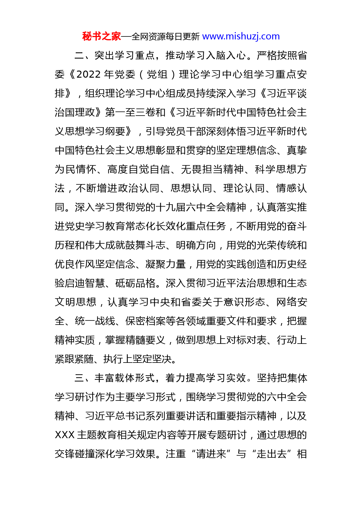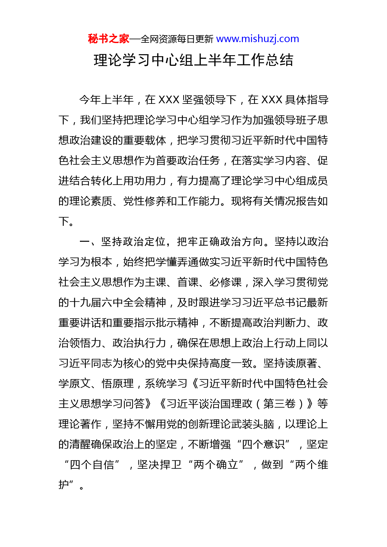 秘书之家—全网资源每日更新www.mishuzj.com理论学习中心组上半年工作总结今年上半年,在XXX坚强领导下,在XXX具体指导下,我们坚持把理论学习中心组学习作为加强领导班子思想政治建设的重要载体,把学习贯彻习近平新时代中国特色社会主义思想作为首要政治任务,在落实学习内容、促进结合转化上用功用力,有力提高了理论学习中心组成员的理论素质、党性修养和工作能力。现将有关情况报告如下。一、坚持政治定位,把牢正确政治方向。坚持以政治学习为根本,始终把学懂弄通做实习近平新时代中国特色社会主义思想作为主课、首课、必修课,深入学习贯彻党的十九届六中全会精神,及时跟进学习习近平总书记最新重要讲话和重要指示批示精神,不断提高政治判断力、政治领悟力、政治执行力,确保在思想上政治上行动上同以习近平同志为核心的党中央保持高度一致。坚持读原著、学原文、悟原理,系统学习《习近平新时代中国特色社会主义思想学习问答》《习近平谈治国理政(第三卷)》等理论著作,坚持不懈用党的创新理论武装头脑,以理论上的清醒确保政治上的坚定,不断增强“四个意识”,坚定“四个自信”,坚决捍卫“两个确立”,做到“两个维护”。秘书之家—全网资源每日更新www.mishuzj.com二、突出学习重点,推动学习入脑入心。严格按照省委《2022年党委(党组)理论学习中心组学习重点安排》,组织理论学习中心组成员持续深入学习《习近平谈治国理政》第一至三卷和《习近平新时代中国特色社会主义思想学习纲要》,引导党员干部深刻体悟习近平新时代中国特色社会主义思想彰显和贯穿的坚定理想信念、真挚为民情怀、高度自觉自信、无畏担当精神、科学思想方法,不断增进政治认同、思想认同、理论认同、情感认同。深入学习贯彻党的十九届六中全会精神,认真落实推进党史学习教育常态化长效化重点任务,不断用党的奋斗历程和伟大成就鼓舞斗志、明确方向,用党的光荣传统和优良作风坚定信念、凝聚力量,用党的实践创造和历史经验启迪智慧、砥砺品格。深入贯彻习近平法治思想和生态文明思想,认真学习中央和省委关于意识形态、网络安全、统一战线、保密档案等各领域重要文件和要求,把握精神实质,掌握精髓要义,做到思想上对标对表、行动上紧跟紧随、执行上坚定坚决。三、丰富载体形式,着力提高学习实效。坚持把集体学习研讨作为主要学习形式,围绕学习贯彻党的六中全会精神、习近平总书记系列重要讲话和重要指示精神,以及XXX主题教育相关规定内容等开展专题研讨,通过思想的交锋碰撞深化学习效果。注重“请进来”与“走出去”相秘书之家—全网资源每日更新www.mishuzj.com结合,邀请省委党校XXX同志作专题辅导,积极参加省委组织部、宣传部等组织的专题讲座XXX余次。充分利用红色资源,组织参观XXX主题展览、XXX等红色场馆5处,在体验式学习中接受精神洗礼。寓理论学习于故事再现之中,组织观看XXX、XXX等红色影视剧,增强直观学习效果。把专题调研作为深化理论学习重要途径,就XXX问题到等相关XXX单位走访调研。不断拓宽学习渠道,用好XXX、XXX等载体,推动理论学习往深里走、往心里走、往实里走。四、坚持示范引领,带动学习型机关建设。充分发挥理论学习中心组头雁效应,坚持以少数带多数,努力当好建设学习型机关的精心组织者、积极促进者、自觉实践者。XXX同志充分履行第一责任人的责任,年初组织研究制定理论学习中心组学习计划》,每次中心组学习都亲自研究审定学习计划、确定主题、把好导向、主持研讨,还多次围绕XXX、XXX,亲自为全办作了宣讲辅导。XXX同志发挥理论功底深厚优势,每次都带头撰写体会,带头交流研讨。局级以上领导干部把理论学习作为一种责任、一种精神追求、一种生活方式,人人制定年度理论学习计划,把理论学习融入日常、抓在经常,不断把领学促学作用有效传导到每个党支部和每名党员。大力弘扬马克思主义学风,发挥科学理论对实践的重要指导作用,努力把学秘书之家—全网资源每日更新www.mishuzj.com习成果转化为推动国安工作高质量发展的内生动力和工作思路,有效促进了各项工作落实。上半年,理论学习中心组不断强化政治理论学习,持续加强理论武装,虽取得了一定成效,但距离省委高标准严要求还有差距。下一步,我们将进一步提高政治站位,坚持把理论学习中心组学习作为重要工作摆在突出位置,认真研究思考新形势下加强理论武装的特点规律和思路招法,以走在前、作表率的鲜明态度和坚定决心,不断把理论学习中心组学习引向深入,把学习成果切实转化坚定捍卫“两个确立”、坚决做到“两个维护”的实际行动,转化为服务构建新发展格局、推动经济社会高质量发展的实际成效,以优异成绩迎接党的二十大胜利召开!