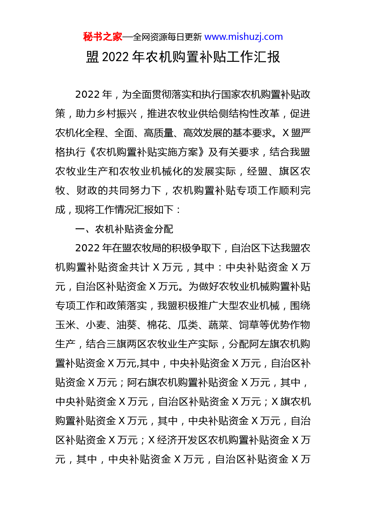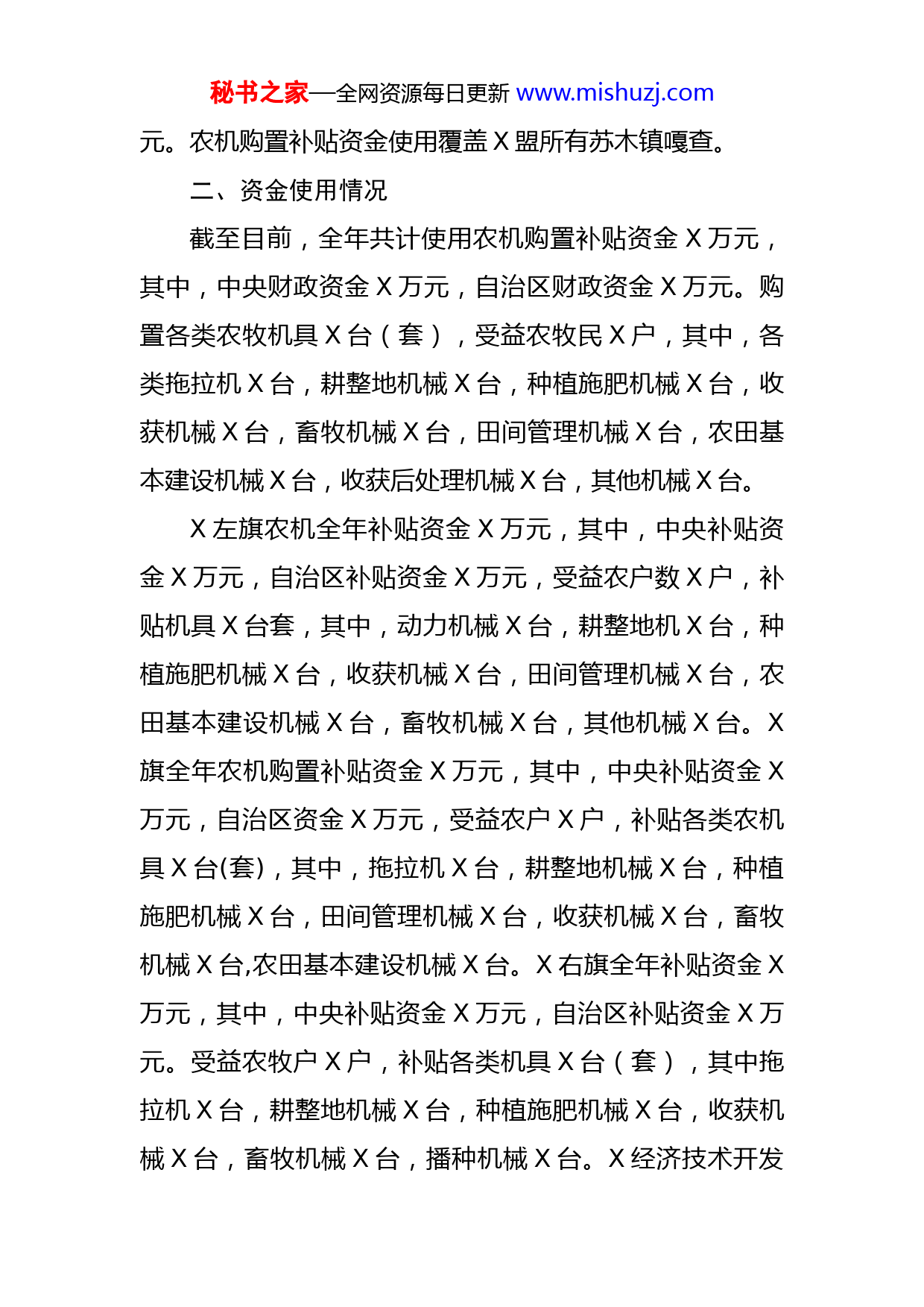 秘书之家—全网资源每日更新www.mishuzj.com盟2022年农机购置补贴工作汇报2022年,为全面贯彻落实和执行国家农机购置补贴政策,助力乡村振兴,推进农牧业供给侧结构性改革,促进农机化全程、全面、高质量、高效发展的基本要求。X盟严格执行《农机购置补贴实施方案》及有关要求,结合我盟农牧业生产和农牧业机械化的发展实际,经盟、旗区农牧、财政的共同努力下,农机购置补贴专项工作顺利完成,现将工作情况汇报如下:一、农机补贴资金分配2022年在盟农牧局的积极争取下,自治区下达我盟农机购置补贴资金共计X万元,其中:中央补贴资金X万元,自治区补贴资金X万元。为做好农牧业机械购置补贴专项工作和政策落实,我盟积极推广大型农业机械,围绕玉米、小麦、油葵、棉花、瓜类、蔬菜、饲草等优势作物生产,结合三旗两区农牧业生产实际,分配阿左旗农机购置补贴资金X万元,其中,中央补贴资金X万元,自治区补贴资金X万元;阿右旗农机购置补贴资金X万元,其中,中央补贴资金X万元,自治区补贴资金X万元;X旗农机购置补贴资金X万元,其中,中央补贴资金X万元,自治区补贴资金X万元;X经济开发区农机购置补贴资金X万元,其中,中央补贴资金X万元,自治区补贴资金X万秘书之家—全网资源每日更新www.mishuzj.com元。农机购置补贴资金使用覆盖X盟所有苏木镇嘎查。二、资金使用情况截至目前,全年共计使用农机购置补贴资金X万元,其中,中央财政资金X万元,自治区财政资金X万元。购置各类农牧机具X台(套),受益农牧民X户,其中,各类拖拉机X台,耕整地机械X台,种植施肥机械X台,收获机械X台,畜牧机械X台,田间管理机械X台,农田基本建设机械X台,收获后处理机械X台,其他机械X台。X左旗农机全年补贴资金X万元,其中,中央补贴资金X万元,自治区补贴资金X万元,受益农户数X户,补贴机具X台套,其中,动力机械X台,耕整地机X台,种植施肥机械X台,收获机械X台,田间管理机械X台,农田基本建设机械X台,畜牧机械X台,其他机械X台。X旗全年农机购置补贴资金X万元,其中,中央补贴资金X万元,自治区资金X万元,受益农户X户,补贴各类农机具X台(套),其中,拖拉机X台,耕整地机械X台,种植施肥机械X台,田间管理机械X台,收获机械X台,畜牧机械X台,农田基本建设机械X台。X右旗全年补贴资金X万元,其中,中央补贴资金X万元,自治区补贴资金X万元。受益农牧户X户,补贴各类机具X台(套),其中拖拉机X台,耕整地机械X台,种植施肥机械X台,收获机械X台,畜牧机械X台,播种机械X台。X经济技术开发秘书之家—全网资源每日更新www.mishuzj.com区全年补贴资金X万元,其中,中央补贴资金X万元,自治区补贴资金X万元,受益农户X户,各类农机具X台(套),其中:拖拉机X台,种植施肥机械X台,耕整地机X台,打捆机X台,割草机X台,搂草机X台,喷杆喷雾机X台。三、带动作用与成效2022年,通过实施国家农机补贴政策,我盟农机化程度有了较大的提高,在农机购置补贴政策引导下,使用购置补贴资金X万元,受益农牧户X户,销售总价逐年增加,本年度为X万元,为带动农牧区经济水平高效发展起到了至关重要的作用。全盟未发生一起重特大农机安全事故,农机安全形势持续稳定。农机购置补贴政策为保持经济平稳较快增长,提高农牧业机械化水平,增强农牧业综合生产能力,拉动农机工业发展,增加收入、促进农牧业增产起到了积极推动作用。四、主要工作措施(一)加强组织领导,做好政策宣传为更好地落实购机补贴惠农惠牧政策,盟党政部门高度重视,认真研究上级购机补贴文件精神,成立X盟农机购置补贴工作领导小组,制定农机购置补贴实施方案,研究确定补贴资金使用、补贴机具种类等重大事项,对补贴政策实施过程进行监督管理,明确分工、层层细化,将工秘书之家—全网资源每日更新www.mishuzj.com作落实到个人,不断增强每个参与补贴工作人员的责任感和使命感。同时,由农牧、财政部门牵头,协调相关部门加大农机购置补贴宣传,全方位,多渠道地做好政策宣传工作,深入农牧区、生产、经营企业,利用广播、电视、报刊、手机信息开展蒙汉两种语言文字的政策宣传,共发放各种宣传材料X余份,其他各种形式的宣传近X次,收益农牧民X人次,同时,搞好政策咨询服务,认真答疑解惑,将农机购置补贴政策实施情况列入政务公开服务内容,宣传效果明显。(二)开展市场调研,把握资金使用盟、旗、苏木镇农机、农牧、财政部门根据今年购置补贴资金规模、涉及品种范围及购机农牧户数量等实际情况,结合我盟农牧业生产现状和农机化发展开展市场调研,确定资金分配向牧区牧民、农机大户、农机合作组织和设施农业设备、玉米收获、饲料饲草作物收储加工机械购置补贴倾斜,使我盟三旗两区所有苏木镇农牧民普遍受益。(三)公开信息,接受监督按照X自治区农牧厅要求,进一步完善与自治区农业机械化信息网的链接,将近年所有农机购置补贴有关补贴实施方案、补贴目录、补贴额一览表、投诉举报电话、受益农户信息等内容在公开栏中公示,方便购机者了解资金秘书之家—全网资源每日更新www.mishuzj.com情况,及时申请补贴。同时把购置补贴政策制作成图片、展板,到各苏木镇进行巡回宣传展出,以接受社会和群众及有关部门的监督。(四)加大监督力度,落实监察制度根据农机购置补贴监察、督查相关规定,结合我盟农牧业生产督查工作,将农机购置补贴工作列入重要督