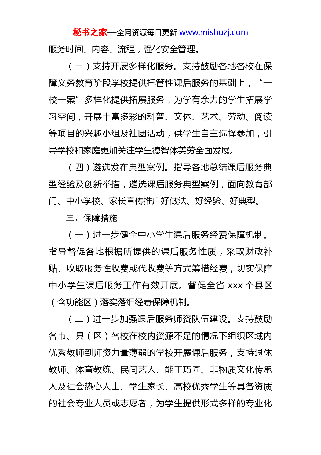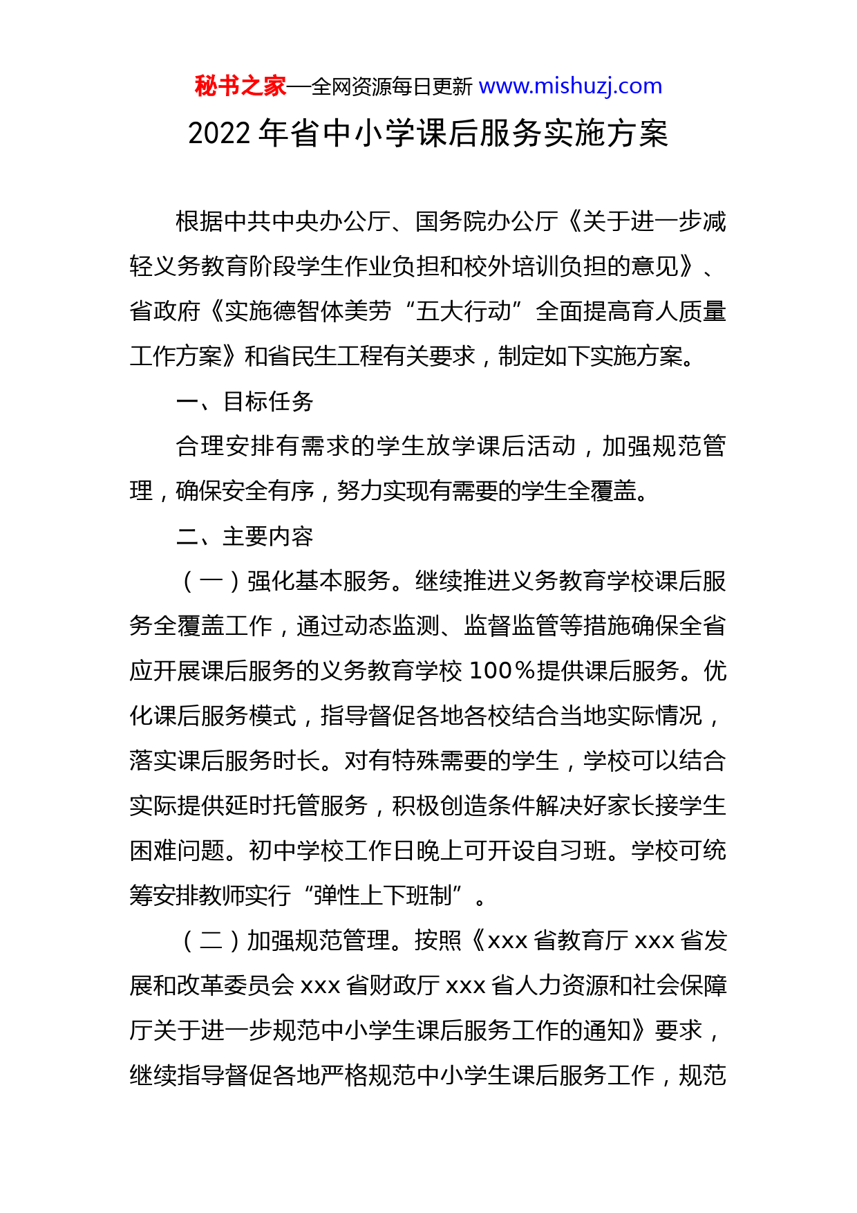秘书之家—全网资源每日更新www.mishuzj.com2022年省中小学课后服务实施方案根据中共中央办公厅、国务院办公厅《关于进一步减轻义务教育阶段学生作业负担和校外培训负担的意见》、省政府《实施德智体美劳“五大行动”全面提高育人质量工作方案》和省民生工程有关要求,制定如下实施方案。一、目标任务合理安排有需求的学生放学课后活动,加强规范管理,确保安全有序,努力实现有需要的学生全覆盖。二、主要内容(一)强化基本服务。继续推进义务教育学校课后服务全覆盖工作,通过动态监测、监督监管等措施确保全省应开展课后服务的义务教育学校100%提供课后服务。优化课后服务模式,指导督促各地各校结合当地实际情况,落实课后服务时长。对有特殊需要的学生,学校可以结合实际提供延时托管服务,积极创造条件解决好家长接学生困难问题。初中学校工作日晚上可开设自习班。学校可统筹安排教师实行“弹性上下班制”。(二)加强规范管理。按照《xxx省教育厅xxx省发展和改革委员会xxx省财政厅xxx省人力资源和社会保障厅关于进一步规范中小学生课后服务工作的通知》要求,继续指导督促各地严格规范中小学生课后服务工作,规范秘书之家—全网资源每日更新www.mishuzj.com服务时间、内容、流程,强化安全管理。(三)支持开展多样化服务。支持鼓励各地各校在保障义务教育阶段学校提供托管性课后服务的基础上,“一校一案”多样化提供拓展服务,为学有余力的学生拓展学习空间,开展丰富多彩的科普、文体、艺术、劳动、阅读等项目的兴趣小组及社团活动,供学生自主选择参加,引导学校和家庭更加关注学生德智体美劳全面发展。(四)遴选发布典型案例。指导各地总结课后服务典型经验及创新举措,遴选课后服务典型案例,面向教育部门、中小学校、家长宣传推广好做法、好经验、好典型。三、保障措施(一)进一步健全中小学生课后服务经费保障机制。指导督促各地根据所提供的课后服务性质,采取财政补贴、收取服务性收费或代收费等方式筹措经费,切实保障中小学生课后服务工作有效开展。督促全省xxx个县区(含功能区)落实落细经费保障机制。(二)进一步加强课后服务师资队伍建设。支持鼓励各市、县(区)各校在校内资源不足的情况下组织区域内优秀教师到师资力量薄弱的学校开展课后服务,支持退休教师、体育教练、民间艺人、能工巧匠、非物质文化传承人及社会热心人士、学生家长、高校优秀学生等具备资质的社会专业人员或志愿者,为学生提供形式多样的专业化秘书之家—全网资源每日更新www.mishuzj.com课程服务,提升学校课后服务能力和吸引力。在教育部门指导下,积极与(青)少年宫、青少年活动中心、妇女儿童活动中心、科技馆、社区活动中心等具备资质、规范的社会组织和专业机构联合提供服务。(三)进一步激活并健全课后服务工作激励机制。督促推动各地结合当地实际,综合考虑物价水平等各种因素,不断完善课后服务参与教师和校外相关人员补助办法和合理补助标准,落实教师绩效工资,合理支付校外相关人员劳务报酬。落实课后服务参与教师职称评聘、表彰奖励相关政策。