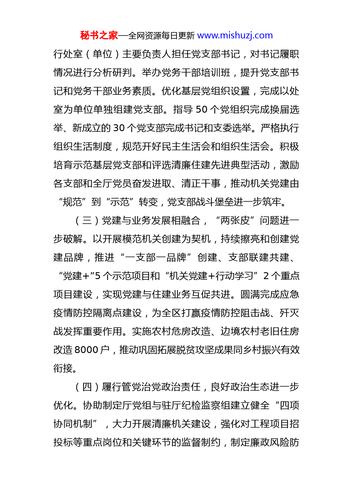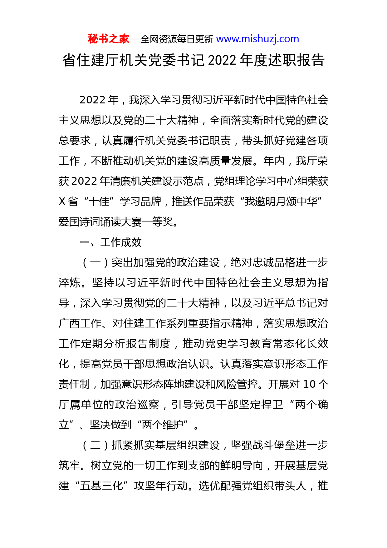 秘书之家—全网资源每日更新www.mishuzj.com省住建厅机关党委书记2022年度述职报告2022年,我深入学习贯彻习近平新时代中国特色社会主义思想以及党的二十大精神,全面落实新时代党的建设总要求,认真履行机关党委书记职责,带头抓好党建各项工作,不断推动机关党的建设高质量发展。年内,我厅荣获2022年清廉机关建设示范点,党组理论学习中心组荣获X省“十佳”学习品牌,推送作品荣获“我邀明月颂中华”爱国诗词诵读大赛一等奖。一、工作成效(一)突出加强党的政治建设,绝对忠诚品格进一步淬炼。坚持以习近平新时代中国特色社会主义思想为指导,深入学习贯彻党的二十大精神,以及习近平总书记对广西工作、对住建工作系列重要指示精神,落实思想政治工作定期分析报告制度,推动党史学习教育常态化长效化,提高党员干部思想政治认识。认真落实意识形态工作责任制,加强意识形态阵地建设和风险管控。开展对10个厅属单位的政治巡察,引导党员干部坚定捍卫“两个确立”、坚决做到“两个维护”。(二)抓紧抓实基层组织建设,坚强战斗堡垒进一步筑牢。树立党的一切工作到支部的鲜明导向,开展基层党建“五基三化”攻坚年行动。选优配强党组织带头人,推秘书之家—全网资源每日更新www.mishuzj.com行处室(单位)主要负责人担任党支部书记,对书记履职情况进行分析研判。举办党务干部培训班,提升党支部书记和党务干部业务素质。优化基层党组织设置,完成以处室为单位单独组建党支部。指导50个党组织完成换届选举、新成立的30个党支部完成书记和支委选举。严格执行组织生活制度,规范开好民主生活会和组织生活会。积极培育示范基层党支部和评选清廉住建先进典型活动,激励各支部和全厅党员奋发进取、清正干事,推动机关党建由“规范”到“示范”转变,党支部战斗堡垒进一步筑牢。(三)党建与业务发展相融合,“两张皮”问题进一步破解。以开展模范机关创建为契机,持续擦亮和创建党建品牌,推进“一支部一品牌”创建、支部联建共建、“党建+”5个示范项目和“机关党建+行动学习”2个重点项目建设,实现党建与住建业务互促共进。圆满完成应急疫情防控隔离点建设,为全区打赢疫情防控阻击战、歼灭战发挥重要作用。实施农村危房改造、边境农村老旧住房改造8000户,推动巩固拓展脱贫攻坚成果同乡村振兴有效衔接。(四)履行管党治党政治责任,良好政治生态进一步优化。协助制定厅党组与驻厅纪检监察组建立健全“四项协同机制”,大力开展清廉机关建设,强化对工程项目招投标等重点岗位和关键环节的监督制约,制定廉政风险防秘书之家—全网资源每日更新www.mishuzj.com控措施303条,开展活动、廉政知识测试,发放“清风住建廉洁倡议书,打造廉洁文化长廊。扎实开展以案促改工作,制定实施方案,召开警示教育大会和专题民主生活会,深刻汲取案教训,加强对党员教育管理监督。开展落实中央八项规定精神情况专项检查,开展“力戒形式主义,推动‘疫情要防住、经济要稳住、发展要安全’落实”工作,深入整治形式主义突出问题。二、存在问题及原因分析一年来,虽然我厅机关党建工作取得了良好成效,但与新时代党的建设要求相比,与引领全区住建事业高质量发展的需求相比,还存在一些差距和不足。(一)对党员干部理论学习抓得还不够紧。党员干部理论学习的主动意识不够强,主要通过厅党组中心组扩大会带动学、邀请专家和厅党组成员上党课学、开展培训班集中学、“三会一课”支部学等常规方式进行,有时把“听过了”“学过了”作为完成理论学习任务的标准,没有抓实读原著、学原文、悟原理各环节。对贯穿习近平新时代中国特色社会主义思想的立场观点方法领会不够深刻,在整体把握、全面理解、融会贯通方面还需要加大力度。学用结合的实效性不够强,持续深入用理论学习成果指导解决群众关心的领域热点、难点问题效果不够显著,与“学懂、弄通、做实”的要求还有差距。秘书之家—全网资源每日更新www.mishuzj.com(二)党建与业务工作深度融合还不够全面。对党建工作的督促指导不够,以系统思维推动实现新形势下党建和业务工作深度融合还需进一步加强。有的基层党组织对新时代党建工作的特点规律研究和把握不够到位,不善于“借”党建之力为业务工作谋篇布局,找不准党建工作与业务工作的结合点和切入点,就党建抓党建,在坚持围绕中心、建设队伍、服务群众,推动机关党建与业务工作深度融合、相互促进等方面存在不足,以党建促业务工作的能力和水平还不够高。(三)在推动基层党组织高质量落实组织生活制度方面还有差距。对基层党组织落实“三会一课”制度情况检查力度不够,部分基层党组织的组织生活质量还有待提升。例如,有的基层党组织因为业务工作冲突,“三会一课”开得不够及时;有的党组织生活内容不够丰富,方式方法单一,党建活动的内涵和活力不足,吸引力和凝聚力不够强;在个别基层党组织的组织生活会上,党员批评和自我批评不够深入,存在“老好人”思想,用提出希望和工作建议代替批评意见,相互批评力度还不够大,批评利器作用发挥不充分,未达到“红脸出汗、排毒治病”的效果。存在以上问题的主要原因:一是思想认识不够。对习近平新时代中国特色社会主义思想是系统全