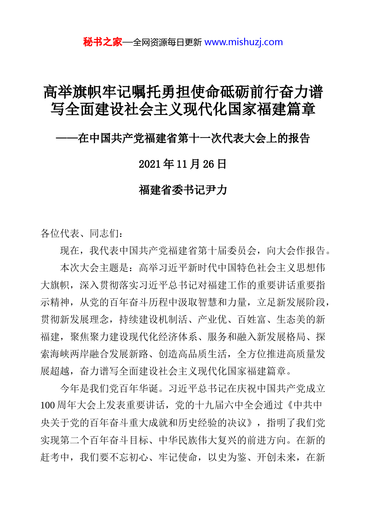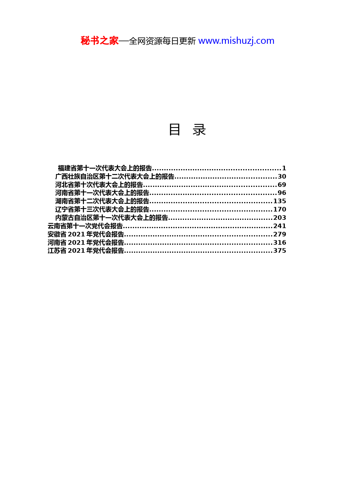 秘书之家—全网资源每日更新www.mishuzj.com目录福建省第十一次代表大会上的报告......................................................1广西壮族自治区第十二次代表大会上的报告...........................................30河北省第十次代表大会上的报告........................................................69河南省第十一次代表大会上的报告.....................................................96湖南省第十二次代表大会上的报告...................................................135辽宁省第十三次代表大会上的报告...................................................170内蒙古自治区第十一次代表大会上的报告............................................203云南省第十一次党代会报告...............................................................241安徽省2021年党代会报告..............................................................279河南省2021年党代会报告..............................................................316江苏省2021年党代会报告..............................................................375秘书之家—全网资源每日更新www.mishuzj.com高举旗帜牢记嘱托勇担使命砥砺前行奋力谱写全面建设社会主义现代化国家福建篇章——在中国共产党福建省第十一次代表大会上的报告2021年11月26日福建省委书记尹力各位代表、同志们:现在,我代表中国共产党福建省第十届委员会,向大会作报告。本次大会主题是:高举习近平新时代中国特色社会主义思想伟大旗帜,深入贯彻落实习近平总书记对福建工作的重要讲话重要指示精神,从党的百年奋斗历程中汲取智慧和力量,立足新发展阶段,贯彻新发展理念,持续建设机制活、产业优、百姓富、生态美的新福建,聚焦聚力建设现代化经济体系、服务和融入新发展格局、探索海峡两岸融合发展新路、创造高品质生活,全方位推进高质量发展超越,奋力谱写全面建设社会主义现代化国家福建篇章。今年是我们党百年华诞。习近平总书记在庆祝中国共产党成立100周年大会上发表重要讲话,党的十九届六中全会通过《中共中央关于党的百年奋斗重大成就和历史经验的决议》,指明了我们党实现第二个百年奋斗目标、中华民族伟大复兴的前进方向。在新的赶考中,我们要不忘初心、牢记使命,以史为鉴、开创未来,在新秘书之家—全网资源每日更新www.mishuzj.com时代新征程上展现新气象新作为,书写无愧于历史、无愧于人民的答卷!一、过去五年的工作省第十次党代会以来,全省各级党组织和广大党员、干部群众,在以习近平同志为核心的党中央坚强领导下,增强“四个意识”、坚定“四个自信”、做到“两个维护”,团结一心、真抓实干,决战脱贫攻坚、决胜全面建成小康社会,积极应对各种风险挑战,完成了省第十次党代会确定的主要任务,推动新福建建设迈上了新台阶。深入学习贯彻习近平新时代中国特色社会主义思想,推动习近平总书记对福建工作的重要讲话重要指示精神和党中央决策部署落地见效。开展“两学一做”学习教育、“不忘初心、牢记使命”主题教育、党史学习教育和庆祝新中国成立70周年、建党100周年活动。持续推进“大学习”,建立“三四八”贯彻落实机制,开展“再学习、再调研、再落实”活动。用科学理论武装头脑、指导实践、推动工作,以新福建建设的实际成效,充分彰显习近平新时代中国特色社会主义思想的强大真理力量。提前一年实现脱贫,全面建成小康社会。以老区苏区为重点的脱贫攻坚战取得胜利。深化东西部协作,“闽宁模式”成为全国脱贫攻坚的成功范例。乡村振兴开局良好,农村人居环境整治三年行动任务全面完成。坚持以人民为中心,每年全省财政支出七成以上投向民生领域。所有县达到义务教育发展基本均衡要求,职业教育特色发展,高等教育加快发展。实施健康福建战略,三明医改经验在全国推广。养老保险待遇水平稳步提高,社会保障覆盖面进一步秘书之家—全网资源每日更新www.mishuzj.com扩大。100万户困难居民通过棚户区改造、公租房建设等解决了住房问题,一批老旧小区得到改造。坚持人民至上、生命至上,新冠疫情防控有序有效。面对突如其来的新冠疫情,全省上下众志成城、英勇奋战,在较短时间内打赢了疫情防控人民战争、总体战、阻击战。落实“外防输入、内防反弹”,强化联防联控、群防群治,组织试剂疫苗和消杀设备技术攻关,实施人防技防、人物同防,有序推进各年龄组人群疫苗接种,科学精准做好常态化疫情防控工作。突出快、严、实、细要求,迅速控制莆田、厦门等疫情,最大限度减少对群众健康和经济社会发展的影响。推动高质量发展,经济综合实力显著增强。全省地区生产总值连跨3万亿元、4万亿元两个台阶,人均地区生产总值突破10万元。一般公共预算总收入突破5000亿元。常住人口城镇化率达到68.7%。基础设施日益完善,港口整合扎实推进,全省港口货物吞吐能力达8亿吨;实现市市通动车、县县通高速、镇镇通干线、村村通客车,福州、厦门迈入“地铁时代”。推进创新型省份建设,产业转型升级步伐加快。福厦泉国家自主创新示范区加快建设,全社会研发经费支出年均增长17%,战略性新兴产业规模倍增。实施百亿龙头成长、千亿集群培育计划,产值超千亿产业集群达21个。数字中国建设峰会影响日益扩大,数字经济增加值超过2万亿元。海洋生产总值突破1万亿元。我省科技特