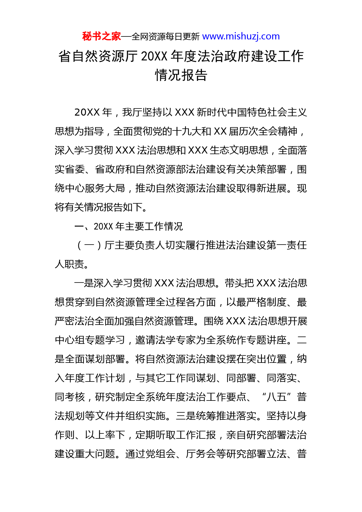 秘书之家—全网资源每日更新www.mishuzj.com省自然资源厅20XX年度法治政府建设工作情况报告20XX年,我厅坚持以XXX新时代中国特色社会主义思想为指导,全面贯彻党的十九大和XX届历次全会精神,深入学习贯彻XXX法治思想和XXX生态文明思想,全面落实省委、省政府和自然资源部法治建设有关决策部署,围绕中心服务大局,推动自然资源法治建设取得新进展。现将有关情况报告如下。一、20XX年主要工作情况(一)厅主要负责人切实履行推进法治建设第一责任人职责。一是深入学习贯彻XXX法治思想。带头把XXX法治思想贯穿到自然资源管理全过程各方面,以最严格制度、最严密法治全面加强自然资源管理。围绕XXX法治思想开展中心组专题学习,邀请法学专家为全系统作专题讲座。二是全面谋划部署。将自然资源法治建设摆在突出位置,纳入年度工作计划,与其它工作同谋划、同部署、同落实、同考核,研究制定全系统年度法治工作要点、“八五”普法规划等文件并组织实施。三是统筹推进落实。坚持以身作则、以上率下,定期听取工作汇报,亲自研究部署法治建设重大问题。通过党组会、厅务会等研究部署立法、普秘书之家—全网资源每日更新www.mishuzj.com法等工作X次,先后对制度建设、重大案件办理等工作批示XX次,推动中央和部省法治建设决策部署落地落实。自觉将履行推进法治建设第一责任人职责情况纳入年终述职内容。(二)健全完善自然资源重点领域法规政策。一是加强重点领域立法。完成省土地管理法实施办法修订草案代拟稿起草和省地质灾害防治条例、自然资源督察办法立法调研。科学申报20XX-2025年重点推进立法项目X个、20XX年立法项目X个。二是出台一批务实管用的政策文件。推动落实最严格的耕地保护制度,制定印发全国首个耕地保护党政同责省级考评细则。研究出台以片区为单元编制乡村国土空间规划、工业用地“标准地”改革、地质灾害全域综合整治三年行动计划和地勘单位改革等政策,有效助推高质量发展。三是加强法规政策管理。对涉及行政处罚法、长江保护法等内容的自然资源地方性法规规章和规范性文件进行专项清理。启动厅规范性文件全面清理。依法制定并报备规范性文件X件。(三)持续优化自然资源营商环境。一是有序下放省级用地审批权。将天府新区、中国(XX)科技城等范围内省级用地审批权分别委托XX市、XX市等市政府行使,大力提升用地审批效率。二是着力保障重大项目建设用地。对重点项目一对一确定“用地秘书之家—全网资源每日更新www.mishuzj.com保姆”,省级核发重大项目用地预审与选址意见书XX个,全年获批建设用地XXX万亩,川藏铁路、成渝中线高铁、大运会主场馆及配套工程、白鹤滩水电站、乌东德电站、夹金山隧道等一大批国省重大项目用地得到及时有力保障。三是持续深化“放管服”改革。建设项目用地预审与选址阶段实现“多论合一”,论证审查时间减少XX%以上;工程建设项目“多测合一”实现一次委托联合测绘成果共享。“一网通办”实现自建业务系统与省一体化政务服务平台100%对接,建设用地预审与选址等XX个事项和不动产登记X个高频事项实现“一件事一次办”,“川渝通办”矿业权登记走在全国前列。四是深化矿产资源管理改革。出台省级矿业权出让网上交易规则,营造公平公正公开的矿业权出让环境。会同财政厅公布钒钛磁铁矿等X个矿种矿业权出让收益基准率,缓解企业资金压力,在全国率先采取“固定采矿权收益率+竞价探矿权出让收益”方式出让X宗锂钾资源矿业权。20XX年度,我厅被省政府评为全省深化“放管服”改革优化营商环境工作先进集体、省级政务服务大厅先进窗口单位。(四)从严开展自然资源督察执法。一是扎实开展自然资源督察。以省政府名义召开全省20XX年耕地保护督察动员部署电视电话会议。积极配合做好20XX年国家耕地保护督察。在XX市、峨XX市、高县秘书之家—全网资源每日更新www.mishuzj.com开展省级耕地保护专项督察。二是加强卫片执法。完善早发现早制止严查处工作机制,严格执行“月清、季核、年度评估”要求,全省发现违法用地XXX宗、XXX万亩,立案查处土地违法案件XXX件,其中省级直接立案查处X件、挂牌督办X件。三是大力推动违法违规问题整改。向XX个土地违法违规问题突出的县(市、区)党委、政府主要负责同志印送提醒函,采取定期通报调度、点对点提醒约谈、暂停用地审批、追责问责等方式持续督促整改。历年国家土地督察反馈问题综合整改率达XX%,历年卫片执法发现违法用地整改率达XX%。四是积极开展各类专项整治。扎实开展农村乱占耕地建房、挖田造湖、挖湖造景、长江黄河流域违法用地采矿等问题专项整治,有力有效维护自然资源管理良好秩序。(五)不断强化权力制约监督。一是规范行政决策活动。严格落实重大行政决策法定程序,坚持科学决策、民主决策、依法决策。全年开展合法性审核XX次、公平竞争审查X次。二是深化政务公开。形成主动公开事项清单,拓展主动公开内容;依法依规、高质高效办理政府信息公开申请XXX件,实现连续X年依申请公开答复办理零逾期。三是持续推进自然资源领域工程招投标突出问题系统治理。清理涉及工程招投标制度规则。土地整理、地灾防治等项目全流程电子招标系统在省秘书之家—全网资源