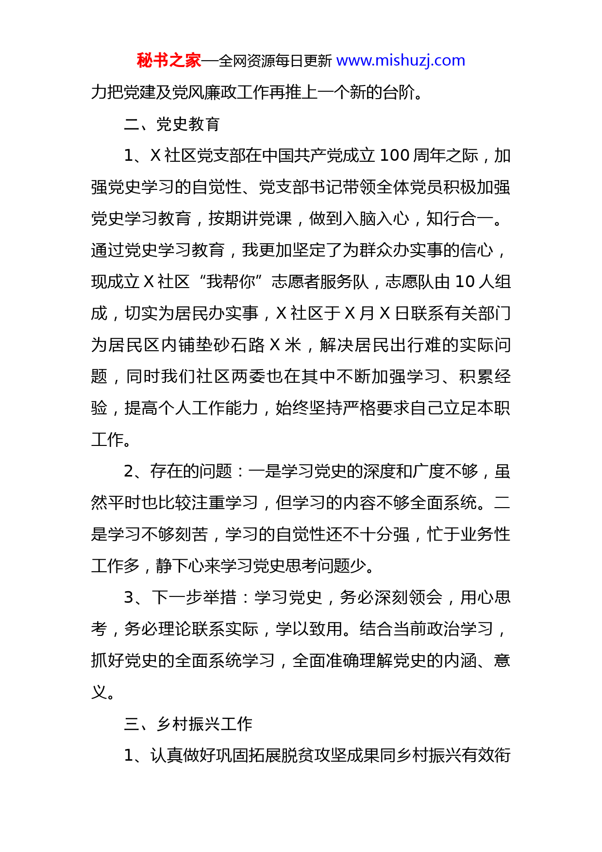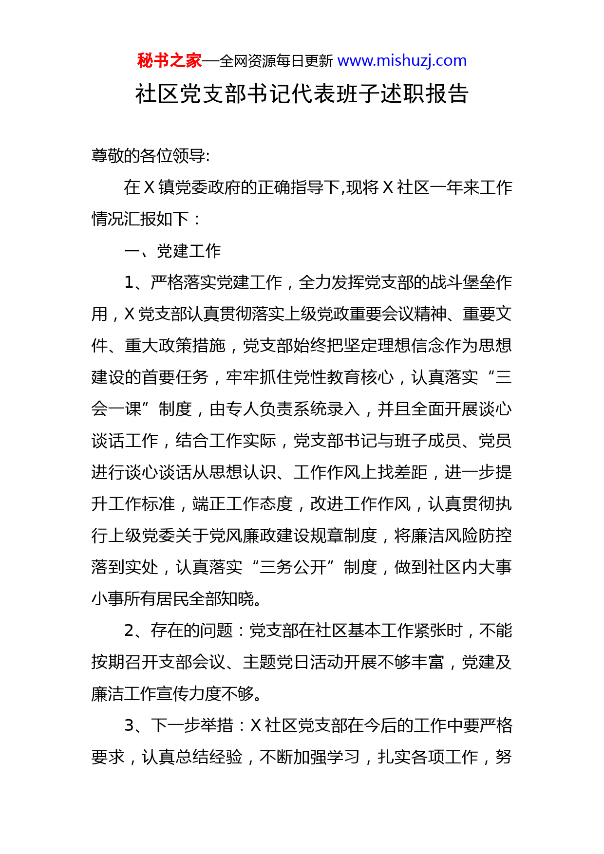 秘书之家—全网资源每日更新www.mishuzj.com社区党支部书记代表班子述职报告尊敬的各位领导:在X镇党委政府的正确指导下,现将X社区一年来工作情况汇报如下:一、党建工作1、严格落实党建工作,全力发挥党支部的战斗堡垒作用,X党支部认真贯彻落实上级党政重要会议精神、重要文件、重大政策措施,党支部始终把坚定理想信念作为思想建设的首要任务,牢牢抓住党性教育核心,认真落实“三会一课”制度,由专人负责系统录入,并且全面开展谈心谈话工作,结合工作实际,党支部书记与班子成员、党员进行谈心谈话从思想认识、工作作风上找差距,进一步提升工作标准,端正工作态度,改进工作作风,认真贯彻执行上级党委关于党风廉政建设规章制度,将廉洁风险防控落到实处,认真落实“三务公开”制度,做到社区内大事小事所有居民全部知晓。2、存在的问题:党支部在社区基本工作紧张时,不能按期召开支部会议、主题党日活动开展不够丰富,党建及廉洁工作宣传力度不够。3、下一步举措:X社区党支部在今后的工作中要严格要求,认真总结经验,不断加强学习,扎实各项工作,努秘书之家—全网资源每日更新www.mishuzj.com力把党建及党风廉政工作再推上一个新的台阶。二、党史教育1、X社区党支部在中国共产党成立100周年之际,加强党史学习的自觉性、党支部书记带领全体党员积极加强党史学习教育,按期讲党课,做到入脑入心,知行合一。通过党史学习教育,我更加坚定了为群众办实事的信心,现成立X社区“我帮你”志愿者服务队,志愿队由10人组成,切实为居民办实事,X社区于X月X日联系有关部门为居民区内铺垫砂石路X米,解决居民出行难的实际问题,同时我们社区两委也在其中不断加强学习、积累经验,提高个人工作能力,始终坚持严格要求自己立足本职工作。2、存在的问题:一是学习党史的深度和广度不够,虽然平时也比较注重学习,但学习的内容不够全面系统。二是学习不够刻苦,学习的自觉性还不十分强,忙于业务性工作多,静下心来学习党史思考问题少。3、下一步举措:学习党史,务必深刻领会,用心思考,务必理论联系实际,学以致用。结合当前政治学习,抓好党史的全面系统学习,全面准确理解党史的内涵、意义。三、乡村振兴工作1、认真做好巩固拓展脱贫攻坚成果同乡村振兴有效衔秘书之家—全网资源每日更新www.mishuzj.com接工作,在脱贫攻坚后评估工作中入户走访全面排查,形成问题清单,按照镇政府工作部署及时反馈问题整改到位。同时发挥好社区公益岗的作用,将公益岗人员分派到各街道负责街道卫生,形成制度,并且将分红款及时分配到贫困户手中。2、存在的问题:对贫困户的产业扶贫相对薄弱,社区没有产业发展项目。3、下一步举措:进一步入户走访,及时发现问题解决问题,进一步扶持发展X社区的养殖产业,提高居民的生活水平。四、信访工作1、我们把工作重点从事后处理转移到事前排查化解上来,坚持经常排查与集中排查、普遍排查与重点排查相结合,规定党支部书记、副书记为主要责任人,以抓治安隐患、矛盾纠纷、信访热点、群体性事件和重大灾害事故的排查治理为重点,以丰富多彩的宣传教育活动为载体,切实解决群众的合理诉求,真正做到了发现得早、化解得了、控制得住、处理得好。对群众反映强烈的热点、难点问题,认真查找原因,严格落实责任,工作开展有力、有序、有效。基本做到小事不出村,大事不出镇,为群众解决实际问题。如养殖户(王海英)造成环境污染问题,社秘书之家—全网资源每日更新www.mishuzj.com区联合综合执法局进行处理,现以得到合理的解决。2、存在的问题:信访老户缠访问题时有发生,信访问题的处理难度越来越大,给社区工作造成被动。3、下一步举措:切实强化群众合理诉求的解决力度,这项工作要持之以恒的开展下去,对重点人群和重点人员要落实工作措施,确保将各种矛盾纠纷化解在萌芽、把问题解决在初始,把群众吸附在当地,有重大紧急信息随时发现随时报送。五、防疫工作1、按照镇党委政府部署要求,在疫情期间为了做好疫情防控工作,联防联控、建立了网格员管理机制,社区两委成员全天坚守岗位,分工明确,对红彦镇火车站每天来往人员进行登记造册,并成立由21人组成的“X社区疫情防控突击队”对社区内外来人员及时排查并上报,杜绝居民被疫情感染的风险,保障辖区居民生命安全。2、存在的问题:因社区来往人员较频繁,出租车与私家车流动较大,社区工作人员不能及时掌握外来人员的动态信息。3、下一步举措:进一步加强镇村之间的协调联动,加大对外来人员筛查和检测,继续落实好摸排管控制度,发挥社区两委及网格员的作用。做好深入细致的排查,确保不遗漏任何一个人,确保不出现任何问题。秘书之家—全网资源每日更新www.mishuzj.com以上是我这一年来的具体工作,如有不妥之处请领导批评指正。
