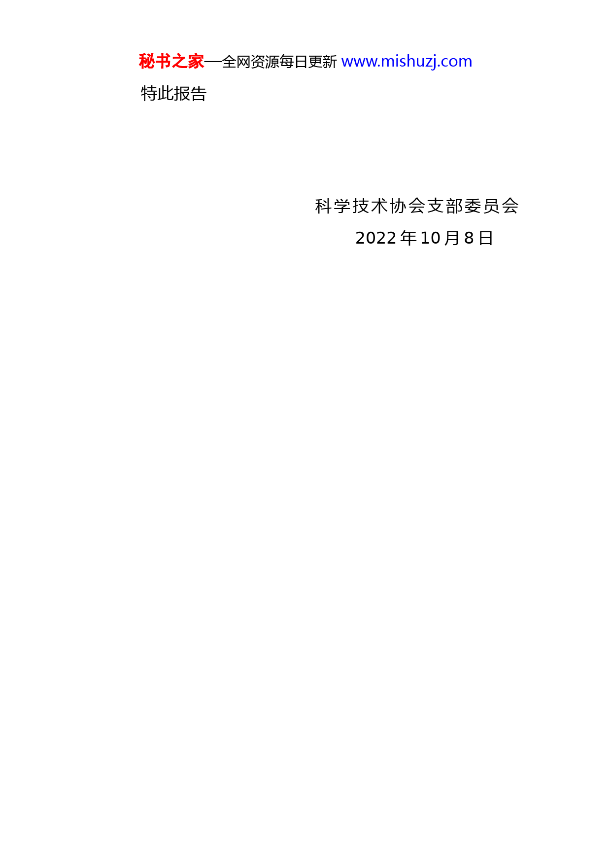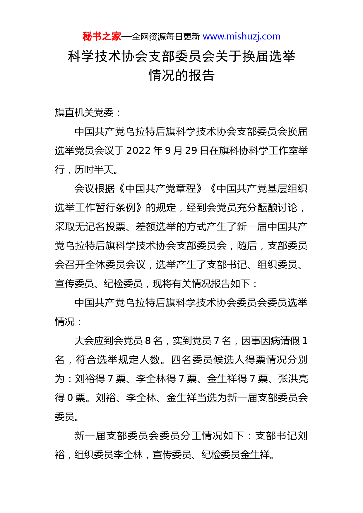 秘书之家—全网资源每日更新www.mishuzj.com科学技术协会支部委员会关于换届选举情况的报告旗直机关党委:中国共产党乌拉特后旗科学技术协会支部委员会换届选举党员会议于2022年9月29日在旗科协科学工作室举行,历时半天。会议根据《中国共产党章程》《中国共产党基层组织选举工作暂行条例》的规定,经到会党员充分酝酿讨论,采取无记名投票、差额选举的方式产生了新一届中国共产党乌拉特后旗科学技术协会支部委员会,随后,支部委员会召开全体委员会议,选举产生了支部书记、组织委员、宣传委员、纪检委员,现将有关情况报告如下:中国共产党乌拉特后旗科学技术协会委员会委员选举情况:大会应到会党员8名,实到党员7名,因事因病请假1名,符合选举规定人数。四名委员候选人得票情况分别为:刘裕得7票、李全林得7票、金生祥得7票、张洪亮得0票。刘裕、李全林、金生祥当选为新一届支部委员会委员。新一届支部委员会委员分工情况如下:支部书记刘裕,组织委员李全林,宣传委员、纪检委员金生祥。秘书之家—全网资源每日更新www.mishuzj.com特此报告科学技术协会支部委员会2022年10月8日