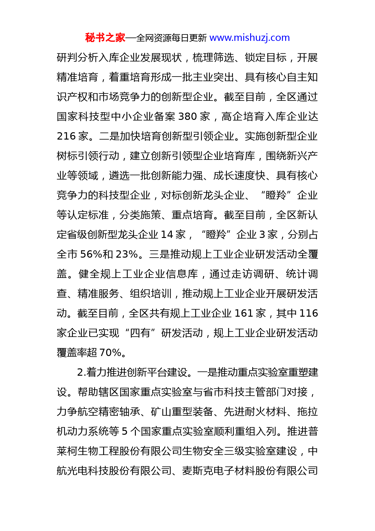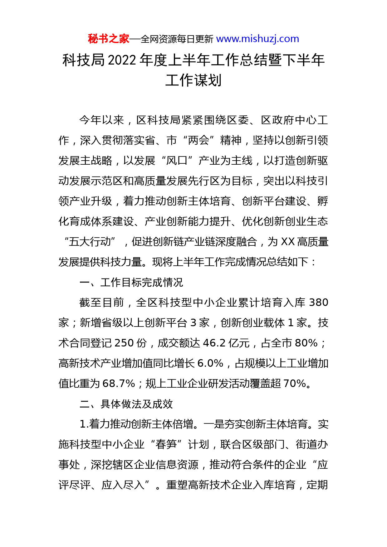 秘书之家—全网资源每日更新www.mishuzj.com科技局2022年度上半年工作总结暨下半年工作谋划今年以来,区科技局紧紧围绕区委、区政府中心工作,深入贯彻落实省、市“两会”精神,坚持以创新引领发展主战略,以发展“风口”产业为主线,以打造创新驱动发展示范区和高质量发展先行区为目标,突出以科技引领产业升级,着力推动创新主体培育、创新平台建设、孵化育成体系建设、产业创新能力提升、优化创新创业生态“五大行动”,促进创新链产业链深度融合,为XX高质量发展提供科技力量。现将上半年工作完成情况总结如下:一、工作目标完成情况截至目前,全区科技型中小企业累计培育入库380家;新增省级以上创新平台3家,创新创业载体1家。技术合同登记250份,成交额达46.2亿元,占全市80%;高新技术产业增加值同比增长6.0%,占规模以上工业增加值比重为68.7%;规上工业企业研发活动覆盖超70%。二、具体做法及成效1.着力推动创新主体倍增。一是夯实创新主体培育。实施科技型中小企业“春笋”计划,联合区级部门、街道办事处,深挖辖区企业信息资源,推动符合条件的企业“应评尽评、应入尽入”。重塑高新技术企业入库培育,定期秘书之家—全网资源每日更新www.mishuzj.com研判分析入库企业发展现状,梳理筛选、锁定目标,开展精准培育,着重培育形成一批主业突出、具有核心自主知识产权和市场竞争力的创新型企业。截至目前,全区通过国家科技型中小企业备案380家,高企培育入库企业达216家。二是加快培育创新型引领企业。实施创新型企业树标引领行动,建立创新引领型企业培育库,围绕新兴产业等领域,遴选一批创新能力强、成长速度快、具有核心竞争力的科技型企业,对标创新龙头企业、“瞪羚”企业等认定标准,分类施策、重点培育。截至目前,全区新认定省级创新型龙头企业14家,“瞪羚”企业3家,分别占全市56%和23%。三是推动规上工业企业研发活动全覆盖。健全规上工业企业信息库,通过走访调研、统计调查、精准服务、组织培训,推动规上工业企业开展研发活动。截至目前,全区共有规上工业企业161家,其中116家企业已实现“四有”研发活动,规上工业企业研发活动覆盖率超70%。2.着力推进创新平台建设。一是推动重点实验室重塑建设。帮助辖区国家重点实验室与省市科技主管部门对接,力争航空精密轴承、矿山重型装备、先进耐火材料、拖拉机动力系统等5个国家重点实验室顺利重组入列。推进普莱柯生物工程股份有限公司生物安全三级实验室建设,中航光电科技股份有限公司、麦斯克电子材料股份有限公司秘书之家—全网资源每日更新www.mishuzj.com重点实验室晋级省级行列。二是推动创新平台扩量提质。健全完善创新平台梯度建设体系,支持企业联合高校院所创建提升各类创新平台。聚焦装备制造、新材料等优势领域,构建覆盖基础研究、应用研究的研发平台,形成技术持续供给能力,实现创新平台量质齐升。目前,全区新增省级创新平台3个(河南省产业研究院3家,普莱柯生物工程股份有限公司、中钢洛耐科技股份有限公司、XXLYC轴承有限公司)。3.着力实施重大科技专项。一是开展重大科研项目攻关。聚焦先进制造、新材料等优势产业领域,组织实施重大科技专项,争取原创性突破。截止目前,申报省重大专项2项、省重点研发计划7项,申报市级重大科技专项15项,占全市53%。二是组织申报科技发展计划项目。帮助辖区企业开展2022年XX市科技发展计划项目申报工作,我区河南科技大学第一附属医院、XX东方医院、XX市第六人民医院、X医院4家单位共申报41个项目,目前已受理公示。三是积极开展“三新”项目备案工作。为了更好地落实国家鼓励企业技术创新的政策措施,鼓励企业增加科技投入,增强科技创新能力,推动科技成果落地转化,XX市对企业自主实施的具有先进性、新颖性和适用性的新产品、新技术和新工艺进行备案管理。截至目前,全区成功备案108项。秘书之家—全网资源每日更新www.mishuzj.com4.着力推动科技成果落地转化。一是推进中试基地建设。依托龙头企业、高校院所、新型研发机构等,布局建设集技术集成、熟化和工程化试验服务为一体的中试基地,实现重点产业中试基地全覆盖。帮助XX拖拉机研究所有限公司申报省级中试基地,中科慧远视觉技术有限公司、中色科技股份有限公司、普莱柯生物工程股份有限公司等7家企业申报市级中试基地,现已受理。截止目前,全区新增河南省中试基地1家(中钢集团XX耐火材料研究院有限公司)。二是持续开展技术合同登记工作。帮助企业对接技术需求,积极开展技术合同认定登记服务,分类别、分层次进行政策培训及业务辅导,促进企业技术合同交易力度。截至目前,累计登记技术合同250份,合同成交额46.2亿元,占全市完成额80%。三是搭建产学研合作平台。举办“西苑论涧”、“周山汇”系列活动,搭建产学研紧密结合的对接交流平台,形成畅通的科技成果转移转化通道。截止目前,聚焦先进装备制造领域,举办2022年XX市科创成果直通车高新区专场,通过邀请省内外专家、学者和高校、院所,开展科技项目推介、技术需求发布和科研成果对接,形成了畅通的科技成果转移转化通道。推介发布科技成果6项,征集技术合作需求105项,签约合作项目5个。5.创新创业环境不断优化。一是加大科技创新金融