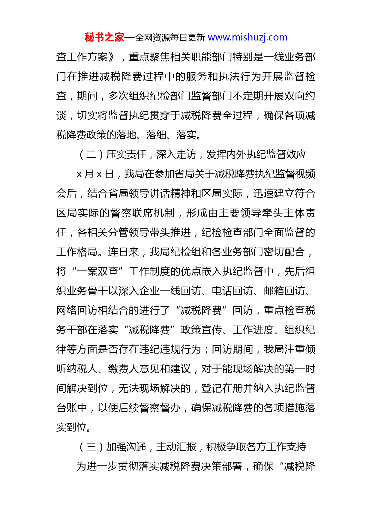 秘书之家—全网资源每日更新www.mishuzj.com税务局局长在减税降费监督执纪会议上的汇报尊敬的xx区长,各位领导,同志们:今年以来,xx区税务局立足实际,主动作为,积极抓好减税降费政策宣传,力争辖区每位纳税人、缴费人切实享受减税降费红利,取得显著效果。为进一步贯彻落实中央和上级税务部门关于减税降费政策措施工作要求,加强对执行减税降费工作的监督执纪问责,确保各项减税降费政策措施落地生根,xx区税务局高度重视发挥纪检监察职能作用,盯紧盯牢减税降费工作节点,以强有力的措施为减税降费各项政策落地提供坚实的纪律保障。主要工作如下:一、减税降费执纪监督主要情况(一)提高站位,狠抓部署,形成执纪监督工作格局自减税降费工作推行以来,xx区税务局党委高度重视,多次召开党委会议,迅速研究部署,同时,第一时间组织召开动员大会,传达中央和总局、省市局坚决将减税降费工作提升到政治的高度来抓,强调要以“抓好减税降费是本职,不抓减税降费是失职,抓不好减税降费是渎职”为思想统领,落实好减税降费的主体责任和监督责任;同时,结合全区税务系统实际制定了《xx区减税降费监督检秘书之家—全网资源每日更新www.mishuzj.com查工作方案》,重点聚焦相关职能部门特别是一线业务部门在推进减税降费过程中的服务和执法行为开展监督检查,期间,多次组织纪检部门监督部门不定期开展双向约谈,切实将监督执纪贯穿于减税降费全过程,确保各项减税降费政策的落地、落细、落实。(二)压实责任,深入走访,发挥内外执纪监督效应x月x日,我局在参加省局关于减税降费执纪监督视频会后,结合省局领导讲话精神和区局实际,迅速建立符合区局实际的督察联席机制,形成由主要领导牵头主体责任,各相关分管领导带头推进,纪检检查部门全面监督的工作格局。连日来,我局纪检组和各业务部门密切配合,将“一案双查”工作制度的优点嵌入执纪监督中,先后组织业务骨干以深入企业一线回访、电话回访、邮箱回访、网络回访相结合的进行了“减税降费”回访,重点检查税务干部在落实“减税降费”政策宣传、工作进度、组织纪律等方面是否存在违纪违规行为;回访期间,我局注重倾听纳税人、缴费人意见和建议,对于能现场解决的第一时间解决到位,无法现场解决的,登记在册并纳入执纪监督台账中,以便后续督察督办,确保减税降费的各项措施落实到位。(三)加强沟通,主动汇报,积极争取各方工作支持为进一步贯彻落实减税降费决策部署,确保“减税降秘书之家—全网资源每日更新www.mishuzj.com费”工作在xx区顺利开展。我局通过在全区各办税服务大厅一楼大厅设置投诉信箱,向纳税人、缴费人公布监督举报电话,做到内部督促与外部监督“双重”管理,做到规定动作到位,同时,创新开发减税降费小游戏,并将执纪监督电话嵌入游戏中,引导广大纳税人缴费人利用好渠道监督减税降费效果,做到自选动作有亮点。除此之外,我局以集中座谈交流、专题汇报和简讯专报等多种形式,定期主动向市局和区纪委监委汇报我局的减税降费政策落实监督检查工作方案以及在落实减税降费工作中组织领导、制度建设、政策宣传、内外培训、工作进度等情况和遇到的困难,争取市局和区纪委监委的指导支持,有效保证了减税降费政策执行不变通、不打折扣。二、存在的问题虽然我局在减税降费工作上取得较好成效,但在相应的执纪监督工作上仍存在个别问题,如减税降费执纪监督队伍专业化水平不高,新形势下减税降费工作要求高、时间紧、任务重,紧靠纪检组的人员力量难以完全监督到位;监督手段还有待进一步丰富,当前我局执纪监督大多停留在查资料和现场检查层面,难以深入发现问题。这些问题,我局将在下一步工作中认真研究,加以解决。三、下一步工作一是强化运用执纪监督“四种形态”。将践行“四种秘书之家—全网资源每日更新www.mishuzj.com形态”的模式运用到减税降费执纪监督中,进一步加强形态间相互转化,切实提高执纪监督的灵活性和有效性。二是完善减税降费执纪监督工作体制机制。探索建立对外协作联动机制,针对减税降费监督工作涉及面广的特点,建立健全政府、企业、社会三者协同监督的联动机制,增强监督合力。三是加强减税降费执纪监督人才队伍建设。定期组织开展纪律教育培训和业务工作培训,强化全体税务人员减税降费纪律意识、大局意识和政治意识,不断提升监督执纪工作水平,为减税降费政策落地保驾护航。