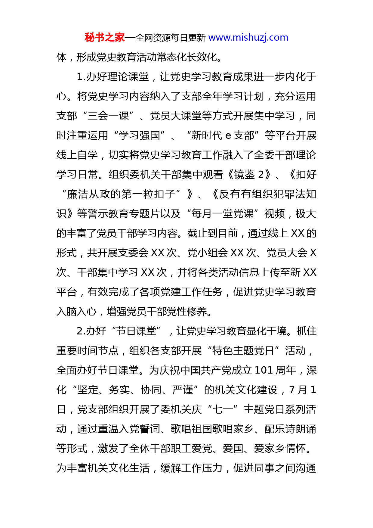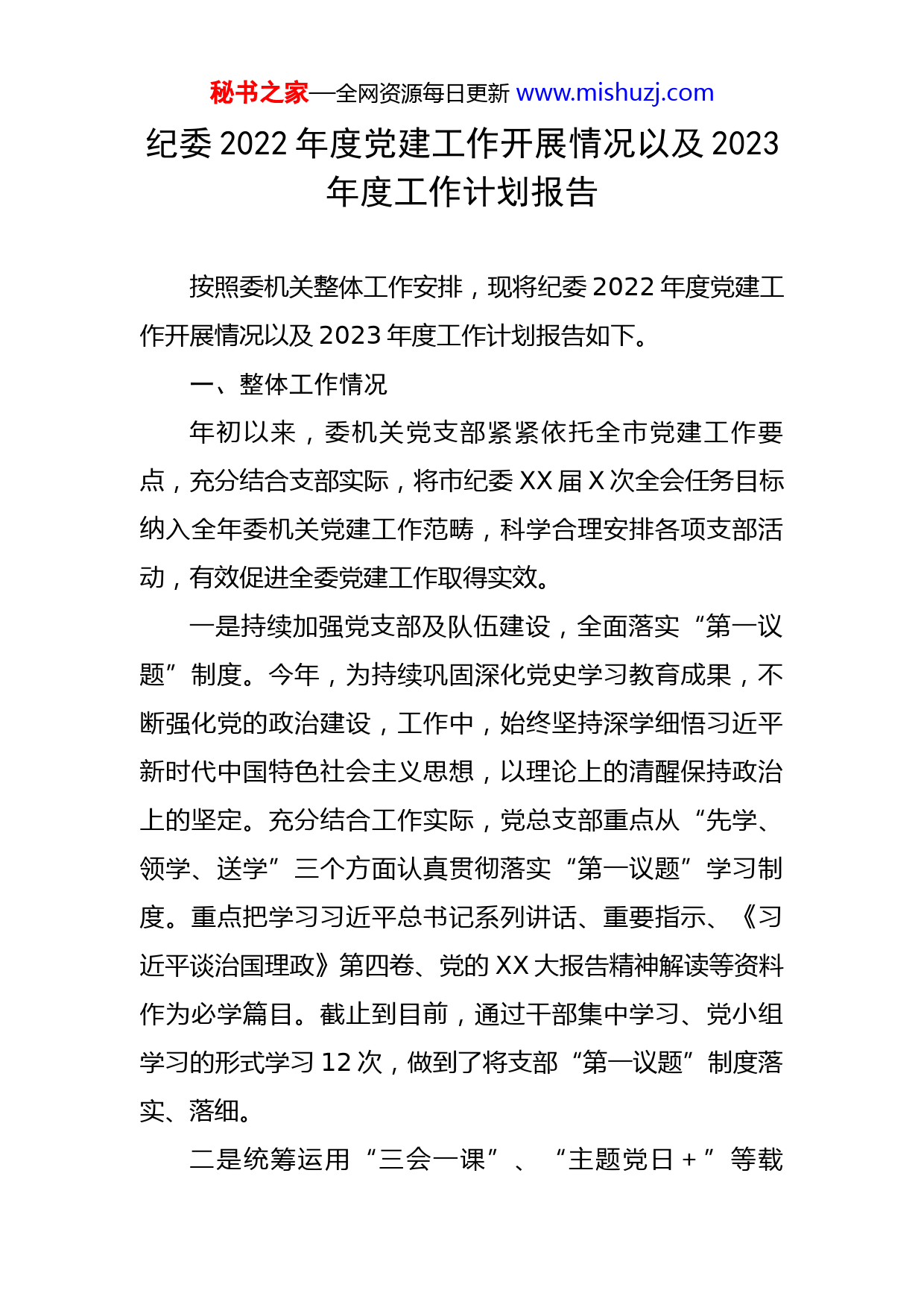 秘书之家—全网资源每日更新www.mishuzj.com纪委2022年度党建工作开展情况以及2023年度工作计划报告按照委机关整体工作安排,现将纪委2022年度党建工作开展情况以及2023年度工作计划报告如下。一、整体工作情况年初以来,委机关党支部紧紧依托全市党建工作要点,充分结合支部实际,将市纪委XX届X次全会任务目标纳入全年委机关党建工作范畴,科学合理安排各项支部活动,有效促进全委党建工作取得实效。一是持续加强党支部及队伍建设,全面落实“第一议题”制度。今年,为持续巩固深化党史学习教育成果,不断强化党的政治建设,工作中,始终坚持深学细悟习近平新时代中国特色社会主义思想,以理论上的清醒保持政治上的坚定。充分结合工作实际,党总支部重点从“先学、领学、送学”三个方面认真贯彻落实“第一议题”学习制度。重点把学习习近平总书记系列讲话、重要指示、《习近平谈治国理政》第四卷、党的XX大报告精神解读等资料作为必学篇目。截止到目前,通过干部集中学习、党小组学习的形式学习12次,做到了将支部“第一议题”制度落实、落细。二是统筹运用“三会一课”、“主题党日+”等载秘书之家—全网资源每日更新www.mishuzj.com体,形成党史教育活动常态化长效化。1.办好理论课堂,让党史学习教育成果进一步内化于心。将党史学习内容纳入了支部全年学习计划,充分运用支部“三会一课”、党员大课堂等方式开展集中学习,同时注重运用“学习强国”、“新时代e支部”等平台开展线上自学,切实将党史学习教育工作融入了全委干部理论学习日常。组织委机关干部集中观看《镜鉴2》、《扣好“廉洁从政的第一粒扣子”》、《反有有组织犯罪法知识》等警示教育专题片以及“每月一堂党课”视频,极大的丰富了党员干部学习内容。截止到目前,通过线上XX的形式,共开展支委会XX次、党小组会XX次、党员大会X次、干部集中学习XX次,并将各类活动信息上传至新XX平台,有效完成了各项党建工作任务,促进党史学习教育入脑入心,增强党员干部党性修养。2.办好“节日课堂”,让党史学习教育显化于境。抓住重要时间节点,组织各支部开展“特色主题党日”活动,全面办好节日课堂。为庆祝中国共产党成立101周年,深化“坚定、务实、协同、严谨”的机关文化建设,7月1日,党支部组织开展了委机关庆“七一”主题党日系列活动,通过重温入党誓词、歌唱祖国歌唱家乡、配乐诗朗诵等形式,激发了全体干部职工爱党、爱国、爱家乡情怀。为丰富机关文化生活,缓解工作压力,促进同事之间沟通秘书之家—全网资源每日更新www.mishuzj.com交流,增强机关的凝聚力、向心力和战斗力,X月XX日,党支部组织全委干部职工到XXX开展了“欢度国庆喜迎XX大”召开健步行“主题党日”活动,既促进了干部交流又增进了团队凝聚力。截止到目前,委机关各支部共开展“主题党日”XX次,其中开展特色“主题党日”活动2次。3.办好“实践课堂”,让党史学习教育外化于行。充分结合“在职党员进社区”工作,把“我为群众办实事”工作贯穿党史学习教育始终,利用党员干部志愿服务、“微心愿”等形式,有效促进委机关党史学习进一步走深走实。4月下旬,组织委机关干部职工到XX和XX乡日新村开展了“万人万亩植树造林日”义务植树活动,共计植树400余棵,为我市的自然生态添绿增色。6月中旬,组织在家党员干部,深入XX乡XX屯、XX屯、等20余户村民家中,开展了为“重点户”打扫卫生志愿服务活动。积极组织开展党组织及在职党员进社区报道活动,主动认领“微心愿”59个,现已全部兑现完成。8月上旬,又在包保小区选取9户重点困难群众,开展了“点亮微心愿,圆梦暖人心”帮扶慰问活动,通过释放“微能量”、递送“微服务”,切实解决了群众的小困难、小需求、小梦想,帮助群众实现“微心愿”,真正做到了在实现扶贫帮困的同时,打通了服务群众“最后一公里”。截止到目前,委机秘书之家—全网资源每日更新www.mishuzj.com关在职党员干部共兑现完成“微心愿”68个。同时,充分以常态化开展“我为群众办实事”实践活动为依托,走访基层20余次,排查群众操心事、烦心事、揪心事10件,现已全部协助解决。三是认真开展好党建共建活动。为深入推进全委党建工作统筹联动开展,强化党组织的政治功能和服务功能,充分发挥党支部联建的优势互补作用,提升基层党建工作整体质量。委机关自建成党史长廊、纪检监察展室和廉政书画墙以来,充分发挥阵地作用,按照党史学习教育制度化常态化的工作要求,将“规定动作”与“自选动作”相结合,先后与市国税局、烟草专局、政法系统等9个部门开展了党建共建活动,推进了党史教育走深走实,把学习教育成果转化为“为群众办实事”的有效举措。截止到目前,通过党建共建活动,进一步推动了委机关与各部门间的党建阵地建设,激发了部门间党建队伍活力,充分发挥了部门间的政治优势,以服务群众为宗旨,以提高基层党组织服务水平为目标,共同构建“资源共享、优势互补、互相促进、共同提高”的党建工作新格局。二、存在的问题及建议通过一年来的工作,虽然取得了一些成绩,但从目前实际情况来看,委机关党建明显存在“灯下黑”的问题。主要表现就是部分党员干部对委机关党建工作站位不高、秘书之家—全网资源每日更新