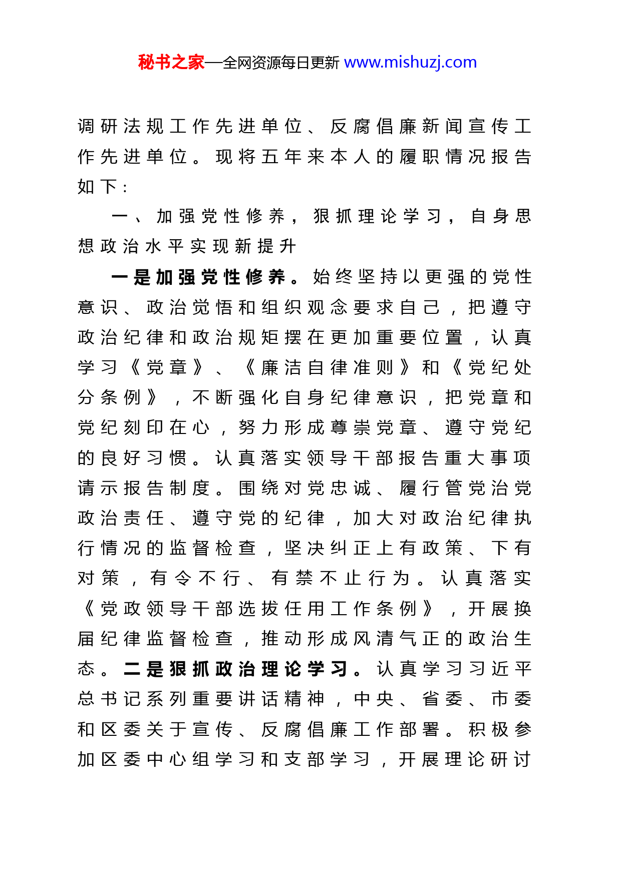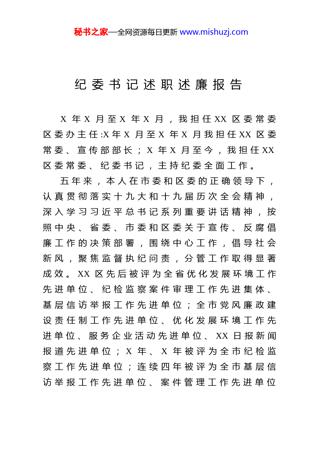 秘书之家—全网资源每日更新www.mishuzj.com纪委书记述职述廉报告X年X月至X年X月,我担任XX区委常委区委办主任:X年X月至X年X月我担任XX区委常委、宣传部部长;X年X月至今,我担任XX区委常委、纪委书记,主持纪委全面工作。五年来,本人在市委和区委的正确领导下,认真贯彻落实十九大和十九届历次全会精神,深入学习习近平总书记系列重要讲话精神,按照中央、省委、市委和区委关于宣传、反腐倡廉工作的决策部署,围绕中心工作,倡导社会新风,聚焦监督执纪问责,分管工作取得显著成效。XX区先后被评为全省优化发展环境工作先进单位、纪检监察案件审理工作先进集体、基层信访举报工作先进单位;全市党风廉政建设责任制工作先进单位、优化发展环境工作先进单位、服务企业活动先进单位、XX日报新闻报道先进单位;X年、X年被评为全市纪检监察工作先进单位;连续四年被评为全市基层信访举报工作先进单位、案件管理工作先进单位秘书之家—全网资源每日更新www.mishuzj.com调研法规工作先进单位、反腐倡廉新闻宣传工作先进单位。现将五年来本人的履职情况报告如下:一、加强党性修养,狠抓理论学习,自身思想政治水平实现新提升一是加强党性修养。始终坚持以更强的党性意识、政治觉悟和组织观念要求自己,把遵守政治纪律和政治规矩摆在更加重要位置,认真学习《党章》、《廉洁自律准则》和《党纪处分条例》,不断强化自身纪律意识,把党章和党纪刻印在心,努力形成尊崇党章、遵守党纪的良好习惯。认真落实领导干部报告重大事项请示报告制度。围绕对党忠诚、履行管党治党政治责任、遵守党的纪律,加大对政治纪律执行情况的监督检查,坚决纠正上有政策、下有对策,有令不行、有禁不止行为。认真落实《党政领导干部选拔任用工作条例》,开展换届纪律监督检查,推动形成风清气正的政治生态。二是狠抓政治理论学习。认真学习习近平总书记系列重要讲话精神,中央、省委、市委和区委关于宣传、反腐倡廉工作部署。积极参加区委中心组学习和支部学习,开展理论研讨秘书之家—全网资源每日更新www.mishuzj.com撰写心得体会。在市级以上媒体刊登廉政文章X篇。深入办事处、区直部门、辖区企业院所开展调研,掌握区委决策部署贯彻落实情况。向市纪委上报调研文章X篇,调研信息X篇,被市级以上媒体采用X篇。三是深入开展系列主题专题教育。开展党的群众路线教育实践活动、“三严三实”专题教育、“两学一做”学习教育、“不忘初心、牢记使命”主题教育,通过集中上党课、重温入党誓词、组织专题研讨,民主生活会,观看警示教育片等,聚焦对党忠诚、个人干净、敢于担当,查找问题和不足,不断改进工作作风。二、聚焦主责主业,强化执纪监督,分管工作取得显著成效X年X月至X年X月,我先后担任XX区委常委、区委办公室主任,XX区委常委、宣传部部长,担任XX区委常委、办公室主任期间,认真履行参谋助手职责,文稿起草力求把握区委工作思路和领导意图,开展督查促进重点工作落实。发挥协调综合作用,做好区委机关文件审核,重大会议做到“会场、会议通知、与会人员、后勤保障”四落实。对区委安排的工作秘书之家—全网资源每日更新www.mishuzj.com及时转办,督促结果;对基层和部门请示的事项,及时呈批,反馈意见;对部门之间需要沟通的问题,主动协调。担任XX区委常委、宣传部部长期间,强化理论学习,开展区委中心组集中学习研讨活动X次,被市评为组织工作先进单位,全市学习贯彻党的十八九精神集中宣讲活动启动仪式暨首场报告会在XX区举行。强化新闻宣传,市级以上新闻媒体发表X篇,《今日XX》出版X期,《XX要闻》X期。强化网络舆情办理,完成网评文章X篇,办理网民诉求X件,办理网络舆情督办X件。强化文化建设,举办春节联欢晚会、元宵节音乐焰火晚会,举办“文明大讲堂”专题讲座X余场X万余人志愿者参与志愿服务活动。X年X月至今,我担任区委常委、纪委书记。按照中央省委、市委和区委关于党风廉政建设和反腐败工作的决策部署,强化监督执纪问责,坚持挺纪在前,反腐倡廉工作取得突出成绩、(一)坚持高压传导,“两个责任”落实更加有力。按照“主体责任落实年”和“生体贵任深化年”要求,对主体责任进行细化,制定区委主体责任清单,明确工作职责。下发落实秘书之家—全网资源每日更新www.mishuzj.com“两个责任”意见、落实“两个责任”监督检查和责任追究办法、基层党风政风监督检查办法。通过落实主体责任目标考核、签订责任书“一案双查”等推动主体责任落实,下发纪工委(纪检组)监督责任负面清单,制定履行监督责任约谈制度,约谈区直单位主要领导X人,X次集中约谈办事处纪工委书记、纪检组组长(纪工委书记),X个区直单位主要领导向区纪委常委会述责述廉,对X名新任科级干部进行任前廉政谈话。在落实“两个”责任、构建制度体系等方面建立健全制度X项,通过召开推进会督导等推动制度措施向制度成果转化。受理重大事项报告X项,发放《重大事项廉政提示函》X件。查办责任追究案件X起,问责X人,其中纪律处分X人,组织处理X人,点名道姓通报曝光问题X起。(二)坚持肃纪正风,作风建设成果更加突出。深入开展“严守政治纪律、严明政治规矩”专项治理,把检查政治纪律和政治规矩、组织纪律执行情况作为巡察
