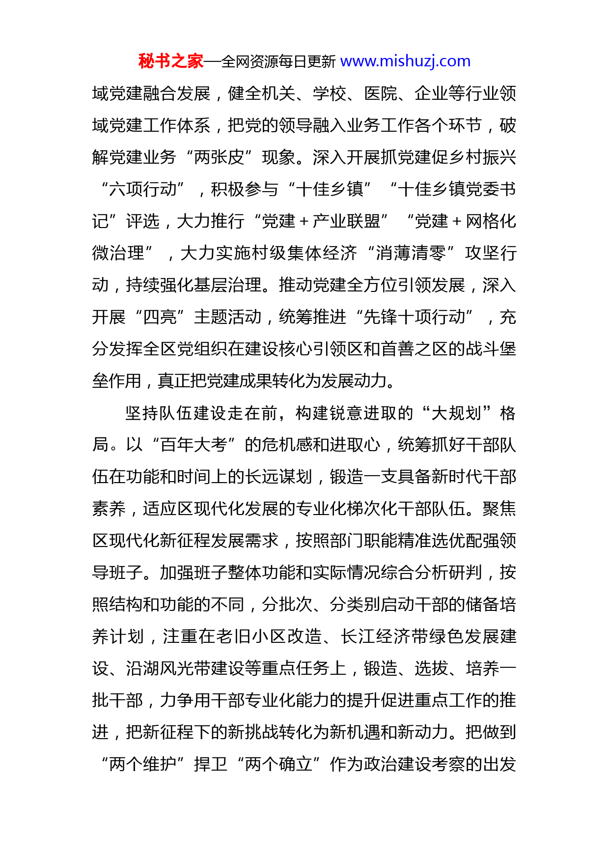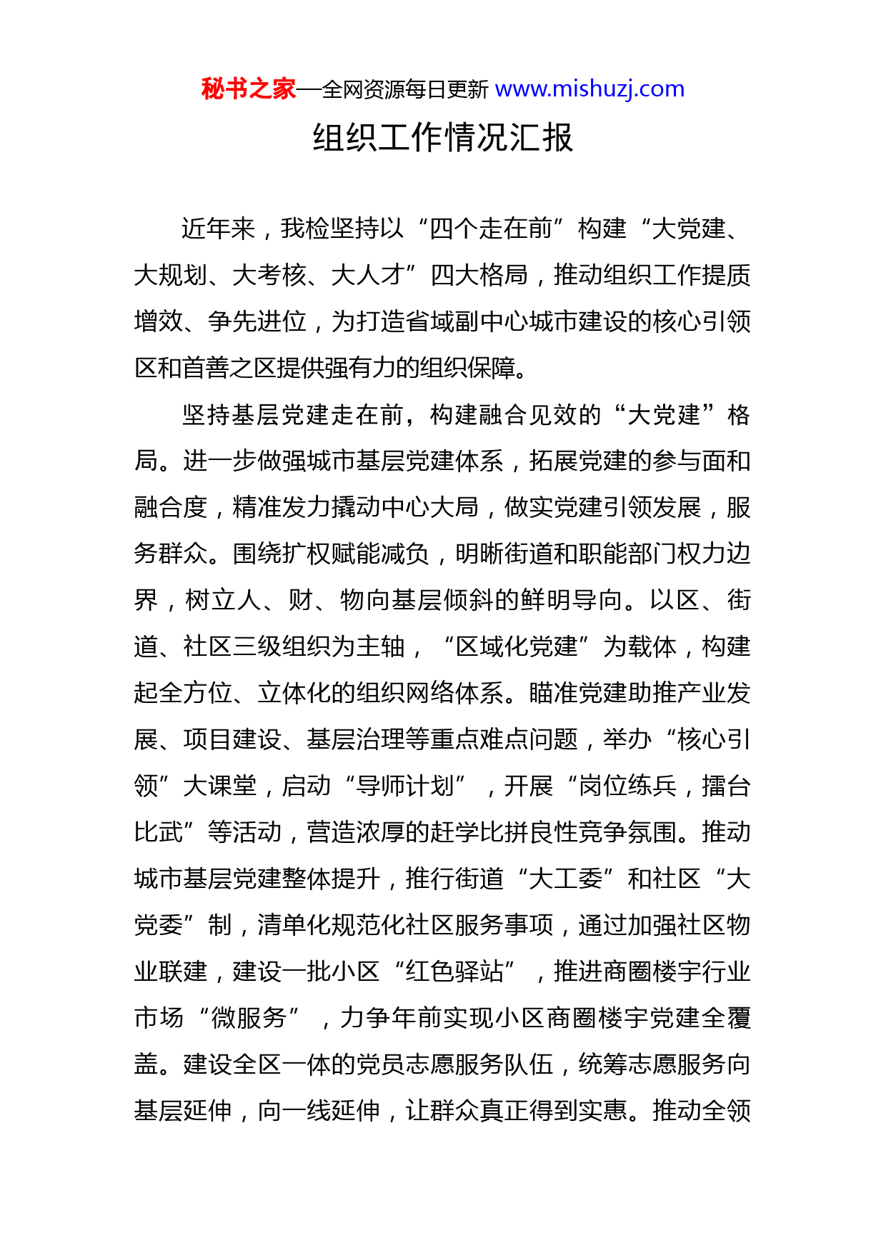 秘书之家—全网资源每日更新www.mishuzj.com组织工作情况汇报近年来,我检坚持以“四个走在前”构建“大党建、大规划、大考核、大人才”四大格局,推动组织工作提质增效、争先进位,为打造省域副中心城市建设的核心引领区和首善之区提供强有力的组织保障。坚持基层党建走在前,构建融合见效的“大党建”格局。进一步做强城市基层党建体系,拓展党建的参与面和融合度,精准发力撬动中心大局,做实党建引领发展,服务群众。围绕扩权赋能减负,明晰街道和职能部门权力边界,树立人、财、物向基层倾斜的鲜明导向。以区、街道、社区三级组织为主轴,“区域化党建”为载体,构建起全方位、立体化的组织网络体系。瞄准党建助推产业发展、项目建设、基层治理等重点难点问题,举办“核心引领”大课堂,启动“导师计划”,开展“岗位练兵,擂台比武”等活动,营造浓厚的赶学比拼良性竞争氛围。推动城市基层党建整体提升,推行街道“大工委”和社区“大党委”制,清单化规范化社区服务事项,通过加强社区物业联建,建设一批小区“红色驿站”,推进商圈楼宇行业市场“微服务”,力争年前实现小区商圈楼宇党建全覆盖。建设全区一体的党员志愿服务队伍,统筹志愿服务向基层延伸,向一线延伸,让群众真正得到实惠。推动全领秘书之家—全网资源每日更新www.mishuzj.com域党建融合发展,健全机关、学校、医院、企业等行业领域党建工作体系,把党的领导融入业务工作各个环节,破解党建业务“两张皮”现象。深入开展抓党建促乡村振兴“六项行动”,积极参与“十佳乡镇”“十佳乡镇党委书记”评选,大力推行“党建+产业联盟”“党建+网格化微治理”,大力实施村级集体经济“消薄清零”攻坚行动,持续强化基层治理。推动党建全方位引领发展,深入开展“四亮”主题活动,统筹推进“先锋十项行动”,充分发挥全区党组织在建设核心引领区和首善之区的战斗堡垒作用,真正把党建成果转化为发展动力。坚持队伍建设走在前,构建锐意进取的“大规划”格局。以“百年大考”的危机感和进取心,统筹抓好干部队伍在功能和时间上的长远谋划,锻造一支具备新时代干部素养,适应区现代化发展的专业化梯次化干部队伍。聚焦区现代化新征程发展需求,按照部门职能精准选优配强领导班子。加强班子整体功能和实际情况综合分析研判,按照结构和功能的不同,分批次、分类别启动干部的储备培养计划,注重在老旧小区改造、长江经济带绿色发展建设、沿湖风光带建设等重点任务上,锻造、选拔、培养一批干部,力争用干部专业化能力的提升促进重点工作的推进,把新征程下的新挑战转化为新机遇和新动力。把做到“两个维护”捍卫“两个确立”作为政治建设考察的出发秘书之家—全网资源每日更新www.mishuzj.com点和落脚点,坚决落实区委提出的《关于进一步加强全区领导班子政治建设的若干措施》,在重大安全事件、突发事件、自然灾害等关键事件上锤炼干部政治能力和政治素养,有力有序提升全区党员干部的政治领悟力、判断力和执行力。牢牢把握好事业发展“后继有人”这个根本大计,实行“六带六促”导师帮带行动,推动年轻干部成长“薪火工程”,与市里同步联动开展“墩苗”“铸魂”“赋能”“优配”四大行动,同时统筹抓好女干部、少数民族干部和党外干部的培养选拔,实现干部队伍梯次更合理、结构更优化,推动形成青蓝相继、薪火相传的生动局面。坚持精准考核走在前,构建实干担当的“大考核”格局。完善联合考核体系,找准考核方向和标准,用考核指挥棒校准正确政绩观,强化考核结果的综合运用,用精准考事促进精准用人。建立区委统一领导、组织部牵头统筹、其他单位联动的一体化考核机制。进一步完善综合绩效评价指标体系,把党的建设、经济高质量发展、民生改善等中央重要部署作为领导班子和个人政绩考核的重要标准,引导各部门在疫情防控、重大项目建设、防汛抗灾等重大事件上,不折不扣贯彻落实上级指示。鲜明倡导“重品德、重才干、重担当、重实绩、重公认”的考核导向,区分党务群团、经济管理、社会服务、行政执法等不同领秘书之家—全网资源每日更新www.mishuzj.com域,实行差异化指标权重考核,引导各级各部门立足实际抓发展。充分运用考核成果,将领导班子和个人量化考核结果作为干部表彰表扬、评先评优、提拔重用的重要依据,引导干部树立正确政绩观,为发展出实招,为群众谋实惠。坚持人才汇聚走在前,构建创新创业的“大人才”格局。坚持人才助推经济,引领发展的战略地位,把环境做优加强吸纳,把联动抓实发挥优势,把资源用好激发活力。对标“人才新政45条”,细化制定“人才强区”建设措施等具体落实细则,构建具有特色的“1+N”人才新政体系。持续推动区级领导与人才专家结对,为人才创业发展、成果转化、住房保障、子女就学等方向提供全方位服务。加强与省、市之间的联动,围绕“12+N”优势产业链,与省、市专家合作,柔性引进科技、教育、卫生、文旅等领域高技能人才,建立起医联体、教共体、合作研发部等联动体系,并探索促进先进理念和管理模式的更新。与市同步开展“学成XX,创业XX”“四海揽才”“人才评选表彰”等活动,积极对接开通人才综合服务平台“绿色通道”,完善人才信息服