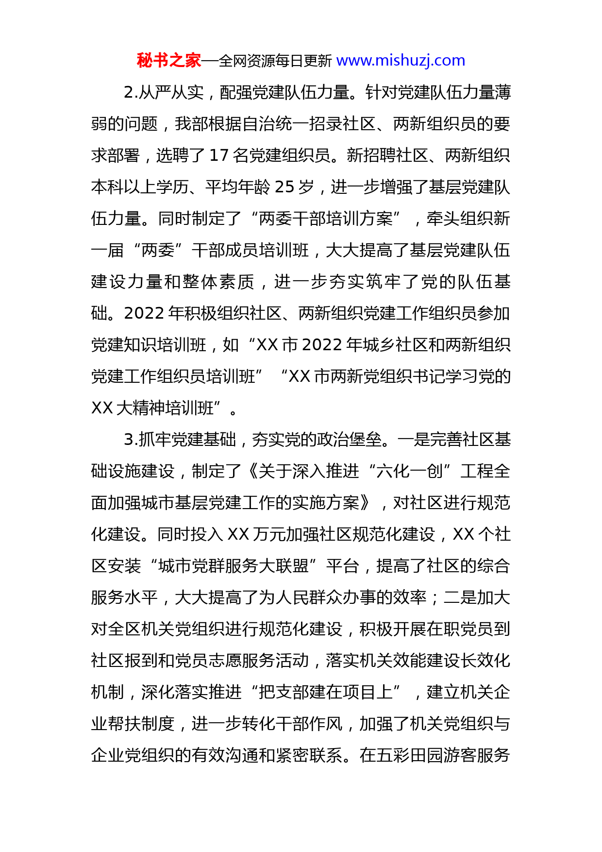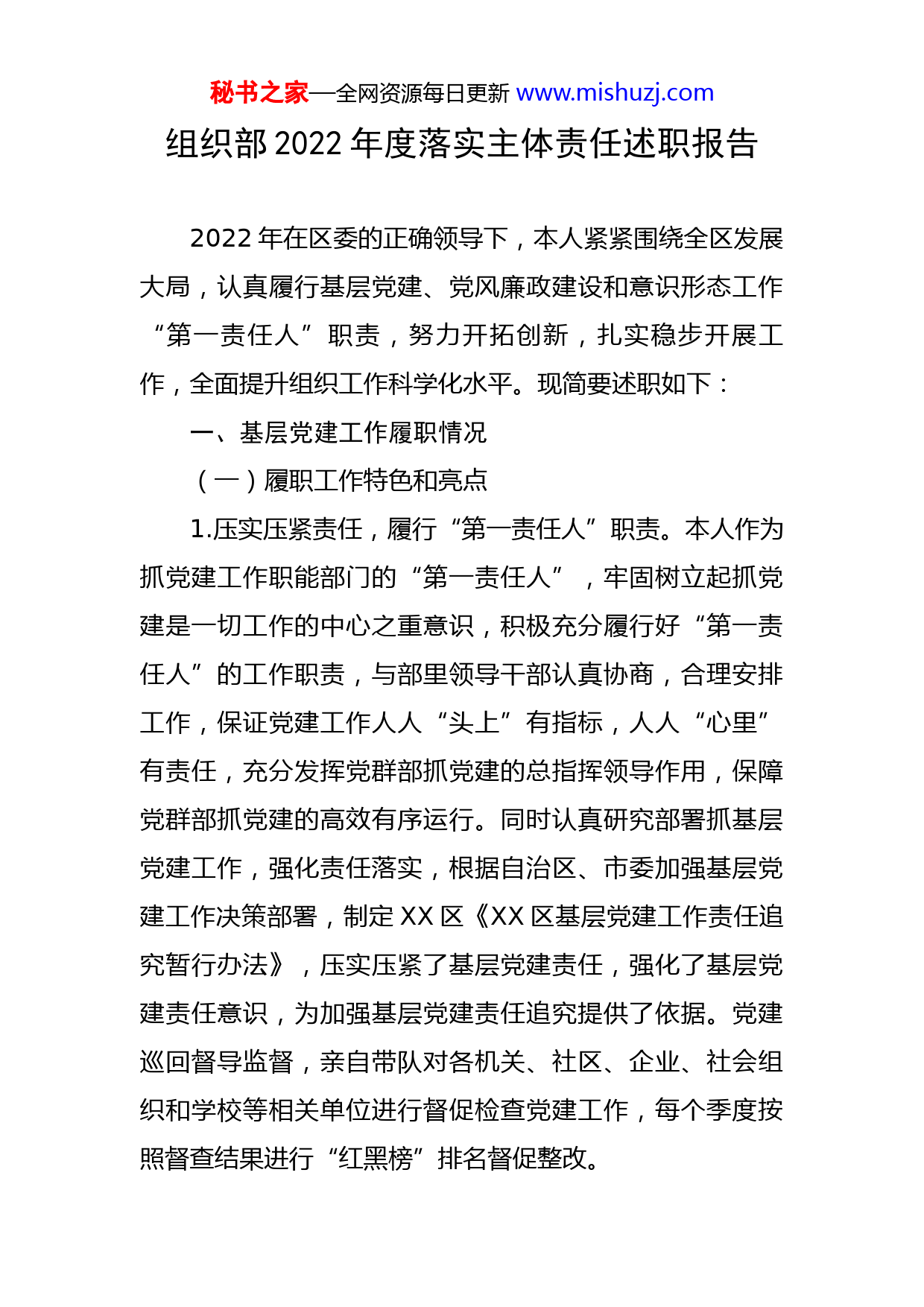 秘书之家—全网资源每日更新www.mishuzj.com组织部2022年度落实主体责任述职报告2022年在区委的正确领导下,本人紧紧围绕全区发展大局,认真履行基层党建、党风廉政建设和意识形态工作“第一责任人”职责,努力开拓创新,扎实稳步开展工作,全面提升组织工作科学化水平。现简要述职如下:一、基层党建工作履职情况(一)履职工作特色和亮点1.压实压紧责任,履行“第一责任人”职责。本人作为抓党建工作职能部门的“第一责任人”,牢固树立起抓党建是一切工作的中心之重意识,积极充分履行好“第一责任人”的工作职责,与部里领导干部认真协商,合理安排工作,保证党建工作人人“头上”有指标,人人“心里”有责任,充分发挥党群部抓党建的总指挥领导作用,保障党群部抓党建的高效有序运行。同时认真研究部署抓基层党建工作,强化责任落实,根据自治区、市委加强基层党建工作决策部署,制定XX区《XX区基层党建工作责任追究暂行办法》,压实压紧了基层党建责任,强化了基层党建责任意识,为加强基层党建责任追究提供了依据。党建巡回督导监督,亲自带队对各机关、社区、企业、社会组织和学校等相关单位进行督促检查党建工作,每个季度按照督查结果进行“红黑榜”排名督促整改。秘书之家—全网资源每日更新www.mishuzj.com2.从严从实,配强党建队伍力量。针对党建队伍力量薄弱的问题,我部根据自治统一招录社区、两新组织员的要求部署,选聘了17名党建组织员。新招聘社区、两新组织本科以上学历、平均年龄25岁,进一步增强了基层党建队伍力量。同时制定了“两委干部培训方案”,牵头组织新一届“两委”干部成员培训班,大大提高了基层党建队伍建设力量和整体素质,进一步夯实筑牢了党的队伍基础。2022年积极组织社区、两新组织党建工作组织员参加党建知识培训班,如“XX市2022年城乡社区和两新组织党建工作组织员培训班”“XX市两新党组织书记学习党的XX大精神培训班”。3.抓牢党建基础,夯实党的政治堡垒。一是完善社区基础设施建设,制定了《关于深入推进“六化一创”工程全面加强城市基层党建工作的实施方案》,对社区进行规范化建设。同时投入XX万元加强社区规范化建设,XX个社区安装“城市党群服务大联盟”平台,提高了社区的综合服务水平,大大提高了为人民群众办事的效率;二是加大对全区机关党组织进行规范化建设,积极开展在职党员到社区报到和党员志愿服务活动,落实机关效能建设长效化机制,深化落实推进“把支部建在项目上”,建立机关企业帮扶制度,进一步转化干部作风,加强了机关党组织与企业党组织的有效沟通和紧密联系。在五彩田园游客服务秘书之家—全网资源每日更新www.mishuzj.com中心建设党建主题园,创建党建品牌与产业党建联动机制;三是加强两新党组织“两个覆盖”建设,持续开展“百日攻坚”行动,稳定巩固党组织在两新领域的覆盖率。亲自带队到两新开展党建工作督查,对薄弱党组进行帮扶,建立防瘫预警机制,整顿软散瘫的“两新”党组织。四是积极推进党的XX大精神贯彻执行。建立换届提醒机制,对未按时换届的基层党组织提前预警,实施销号管理,现已全部按照要求完成换届;进一步规范党费缴纳时限和方式,追缴应缴党费。(二)存在的主要问题及原因1.党建工作不够严实。党建工作不实,部门党员同志不注重结合基层党建实际工作,提出的新思路、新方法上只体现在口头和文字上,只在党建的形式上翻花样,在声势上做文章,存在流于形式的现象,只做表面功夫,党建中心工作没有压实压紧,落到实处。2.党员队伍先锋模范作用不强。有的党员满足于“平平淡淡”,在遵守党的纪律、维护党的形象方面信奉“既不出事、也不多事”,没有充分发挥好党员的先锋模范作用;参加党员活动、履行党员义务时积极性、主动性不够,只关注与自己切身利益有关的事情。3.党内民主生活会单一缺乏创新。支部组织生活形式还较为单一,按部就班,个别党员对理论学习的重要性认识秘书之家—全网资源每日更新www.mishuzj.com不足,自觉性不够,在支部开展民主生活会的时候,民主生活会形式过于单一,新意不够,缺乏创新等原因,使得理论学习的深度不够,成效不甚显著,党员的政治理论水平和综合素质有待于进一步提高。党内民主生活会是党的重要政治生活之一,开展好党内民主生活有利于团结党组织队伍,充分发挥党员的智慧,增强党组织凝聚力。出现上述问题的原因尽管很多,但主因还在本人没有确实履行好“第一责任人”的职责。究其原因,主要有三个方面:一是缺乏有效的监督管理机制。党群工作部统筹新区党建工作全面发展,涉及部门广、任务重,尽管前期已经指定了压实党建责任监督细则,但是在具体实施过程中,有些单位和部门大打折,还在党建工作形式主义现象,缺乏行之有效的监督管理机制。二是缺乏有效的激励机制。有效的激励机制能够很好的激发党员干部的积极性和主动性,平时关注点主要是抓党建失责追究,没有系统的研究抓党建正激励机制,只罚不赏,大大挫伤了党员干部的积极性,导致党员干部过于“安分守己”,形成“只求无过”思想,最终束缚了党员干部的先锋模范作用的发挥。三是意识过于僵化,传统观念过强。民主生活缺乏新意,缺乏创新,主要是传统观念过强,墨守成规,保持原有的模式,缺