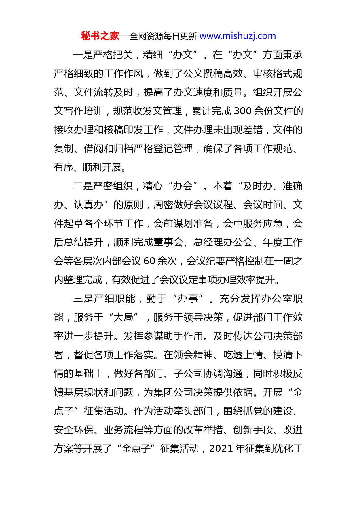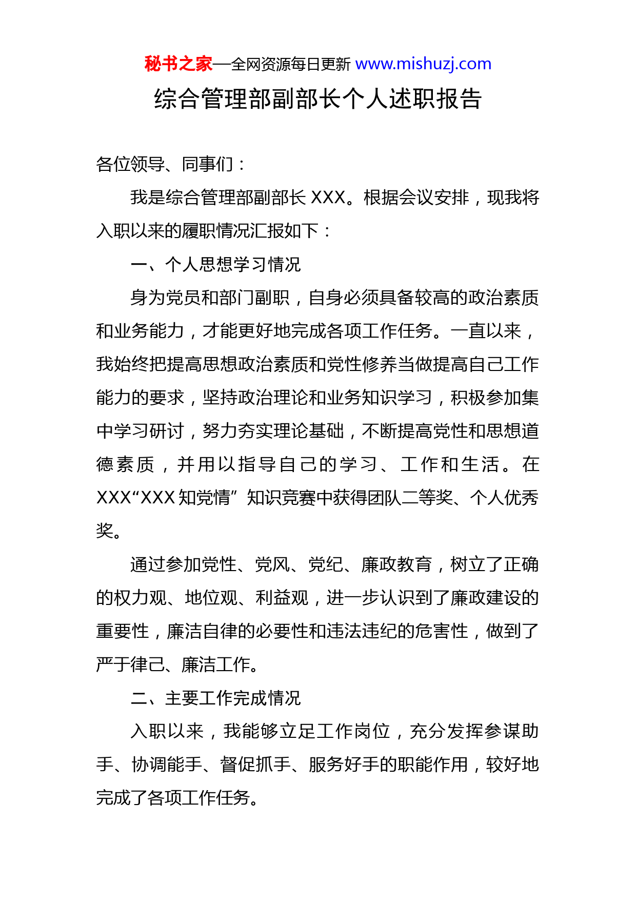 秘书之家—全网资源每日更新www.mishuzj.com综合管理部副部长个人述职报告各位领导、同事们:我是综合管理部副部长XXX。根据会议安排,现我将入职以来的履职情况汇报如下:一、个人思想学习情况身为党员和部门副职,自身必须具备较高的政治素质和业务能力,才能更好地完成各项工作任务。一直以来,我始终把提高思想政治素质和党性修养当做提高自己工作能力的要求,坚持政治理论和业务知识学习,积极参加集中学习研讨,努力夯实理论基础,不断提高党性和思想道德素质,并用以指导自己的学习、工作和生活。在XXX“XXX知党情”知识竞赛中获得团队二等奖、个人优秀奖。通过参加党性、党风、党纪、廉政教育,树立了正确的权力观、地位观、利益观,进一步认识到了廉政建设的重要性,廉洁自律的必要性和违法违纪的危害性,做到了严于律己、廉洁工作。二、主要工作完成情况入职以来,我能够立足工作岗位,充分发挥参谋助手、协调能手、督促抓手、服务好手的职能作用,较好地完成了各项工作任务。秘书之家—全网资源每日更新www.mishuzj.com一是严格把关,精细“办文”。在“办文”方面秉承严格细致的工作作风,做到了公文撰稿高效、审核格式规范、文件流转及时,提高了办文速度和质量。组织开展公文写作培训,规范收发文管理,累计完成300余份文件的接收办理和核稿印发工作,文件办理未出现差错,文件的复制、借阅和归档严格登记管理,确保了各项工作规范、有序、顺利开展。二是严密组织,精心“办会”。本着“及时办、准确办、认真办”的原则,周密做好会议议程、会议时间、文件起草各个环节工作,会前谋划准备,会中服务应急,会后总结提升,顺利完成董事会、总经理办公会、年度工作会等各层次内部会议60余次,会议纪要严格控制在一周之内整理完成,有效促进了会议议定事项办理效率提升。三是严细职能,勤于“办事”。充分发挥办公室职能,服务于“大局”,服务于领导决策,促进部门工作效率进一步提升。发挥参谋助手作用。及时传达公司决策部署,督促各项工作落实。在领会精神、吃透上情、摸清下情的基础上,做好各部门、子公司协调沟通,同时积极反馈基层现状和问题,为集团公司决策提供依据。开展“金点子”征集活动。作为活动牵头部门,围绕抓党的建设、安全环保、业务流程等方面的改革举措、创新手段、改进方案等开展了“金点子”征集活动,2021年征集到优化工秘书之家—全网资源每日更新www.mishuzj.com作模式、破解工作难题的“金点子”27条,10条被评定为优秀“金点子”,2022年截至目前累计征集到“金点子”22条,为公司实现精细化管理起到了较好的推动作用。加强公务用车管理。修订完善《办公车辆管理办法》,监督按时进行车辆年检、续保、保养等工作,以安全行驶、高效使用为原则,协调调配管委会及集团公司业务用车200余次,未发生重大交通安全事故。严控办公费用支出。每年初,根据各部门、子公司人数及工作实际,制定办公用品采购预算,统筹采购,通过询价比价,选定供应商,保证质良价优,同时建立采购及发放台账。开展档案归类整理活动。建立并逐步完善了档案管理标准及制度体系,对历年1400余份收发文、会议纪等文件资料立卷整理,建立电子目录,实现了文档精细化管理。开展困难职工帮扶活动。2021年根据上级工会要求及公司工会安排,通过材料审核、入户调查、建档立卡,3名职工被市总工会认定为相对困难职工,2022年对困难职工档案开展全面核查、动态管理,有效发挥了工会的帮扶服务职能,使工会组织真正成为困难职工的第一知情人、第一帮助人。开展团支部主题教育实践活动。自团组织成立以来,积极组织集中开展党史教育学习、青年大学习、“喜迎二十大,永远跟党走,奋进新征程”主题教育实践活动,督促青年员工铭记要以执著的信念、优良的品德、丰富的知秘书之家—全网资源每日更新www.mishuzj.com识、过硬的本领,认真完成做好自己本职工作。2021年集团公司团支部被上级团组织评定为“四星团支部”。助推企业文化建设。通过规章制度的建立和完善、职责上墙、员工集体活动开展、新闻宣传等方式,不断提升职责意识和团队精神,企业文化建设初步不如轨道。全力做好疫情防控各项工作。督促疫苗接种,截至目前,集团公司三剂疫苗接种完成率95%;疫情期间,组织集团公司人员配合管委会开展多轮核酸检测工作,累计核酸检测人数2000余人次;根据疫情防控需要,多次统一采购消毒水、消毒酒精、防护口罩等疫情防控物资并组织发放,确保防护到位;注重摸底排查,对公司外出及来银返银情况精细排查,并严格遵守“日报告、零报告”制度,确保全覆盖、情况清、底数明、数字准,严格落实常态化疫情防控各项工作要求。三、存在的问题和不足回顾和梳理个人工作,虽然取得了一定的成绩,但也存在诸多不足和问题。一是主动深入学习不够。现有业务知识和不能完全适应精细化管理要求,业务知识需要进一步提高。二是工作意识有待加强。工作中落实、落细、落小还不够具体,工作的主动性有待进一步加强,工作效率亟待进一步提高,服务意识还需进一步提升。三是考虑问题站位不高,大局意识不强。在工作生活中,缺乏敢于碰秘书之家—全网资源每日更新www.mishuzj.com硬、敢于创新的作风,遇事善于