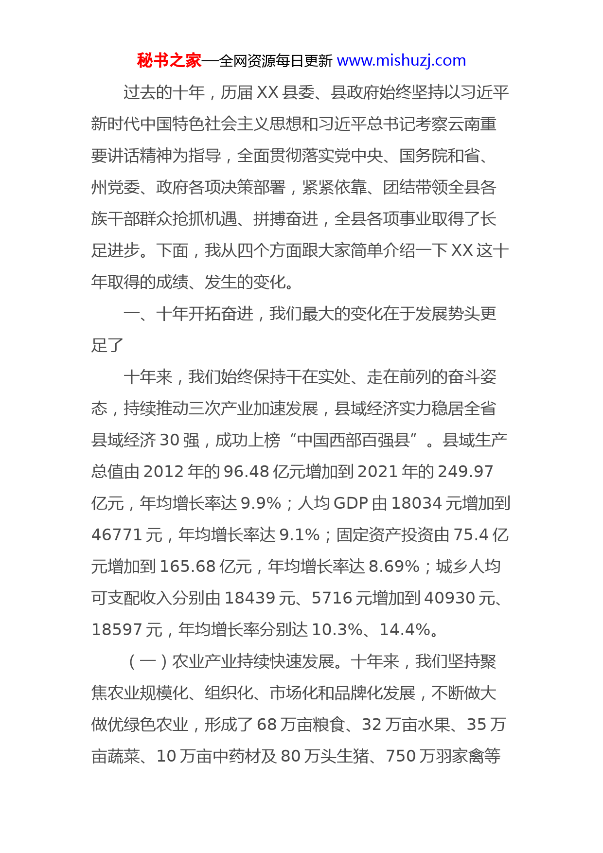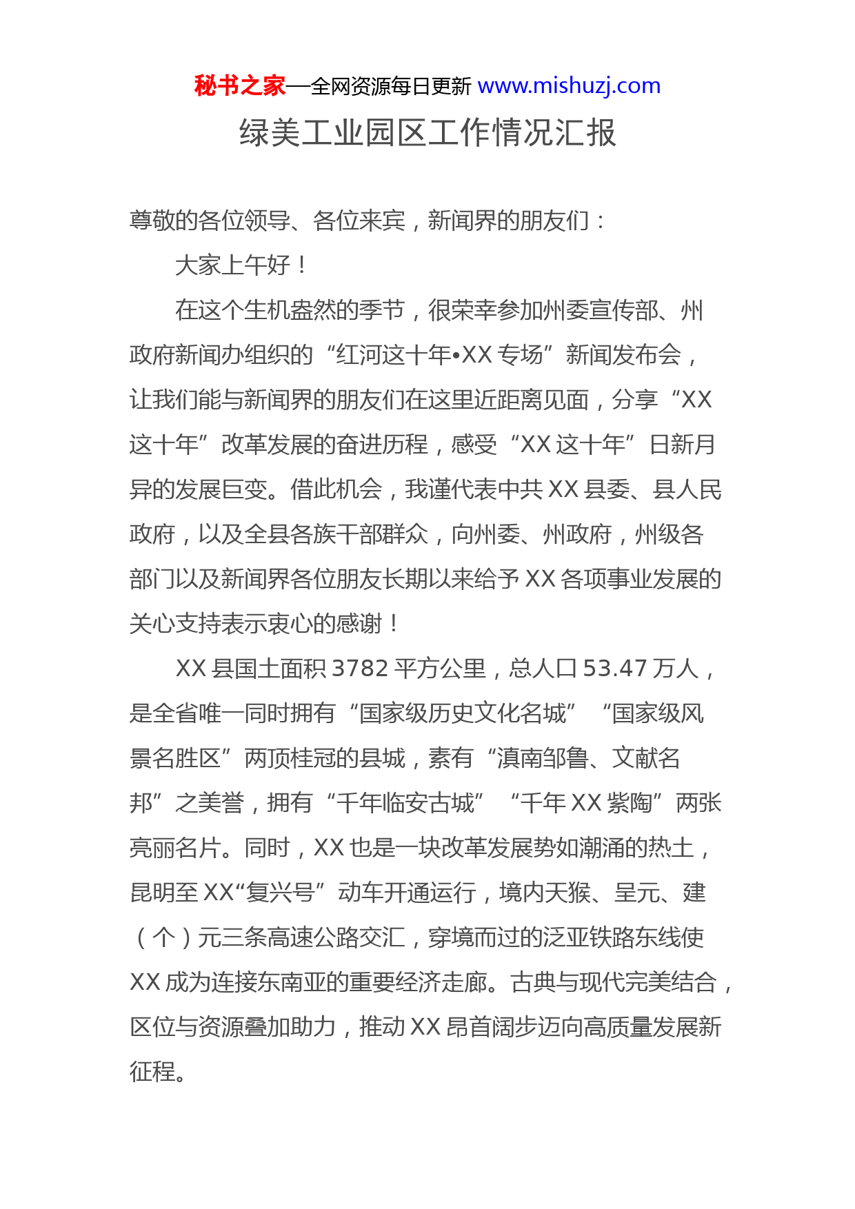 秘书之家—全网资源每日更新www.mishuzj.com绿美工业园区工作情况汇报尊敬的各位领导、各位来宾,新闻界的朋友们:大家上午好!在这个生机盎然的季节,很荣幸参加州委宣传部、州政府新闻办组织的“红河这十年•XX专场”新闻发布会,让我们能与新闻界的朋友们在这里近距离见面,分享“XX这十年”改革发展的奋进历程,感受“XX这十年”日新月异的发展巨变。借此机会,我谨代表中共XX县委、县人民政府,以及全县各族干部群众,向州委、州政府,州级各部门以及新闻界各位朋友长期以来给予XX各项事业发展的关心支持表示衷心的感谢!XX县国土面积3782平方公里,总人口53.47万人,是全省唯一同时拥有“国家级历史文化名城”“国家级风景名胜区”两顶桂冠的县城,素有“滇南邹鲁、文献名邦”之美誉,拥有“千年临安古城”“千年XX紫陶”两张亮丽名片。同时,XX也是一块改革发展势如潮涌的热土,昆明至XX“复兴号”动车开通运行,境内天猴、呈元、建(个)元三条高速公路交汇,穿境而过的泛亚铁路东线使XX成为连接东南亚的重要经济走廊。古典与现代完美结合,区位与资源叠加助力,推动XX昂首阔步迈向高质量发展新征程。秘书之家—全网资源每日更新www.mishuzj.com过去的十年,历届XX县委、县政府始终坚持以习近平新时代中国特色社会主义思想和习近平总书记考察云南重要讲话精神为指导,全面贯彻落实党中央、国务院和省、州党委、政府各项决策部署,紧紧依靠、团结带领全县各族干部群众抢抓机遇、拼搏奋进,全县各项事业取得了长足进步。下面,我从四个方面跟大家简单介绍一下XX这十年取得的成绩、发生的变化。一、十年开拓奋进,我们最大的变化在于发展势头更足了十年来,我们始终保持干在实处、走在前列的奋斗姿态,持续推动三次产业加速发展,县域经济实力稳居全省县域经济30强,成功上榜“中国西部百强县”。县域生产总值由2012年的96.48亿元增加到2021年的249.97亿元,年均增长率达9.9%;人均GDP由18034元增加到46771元,年均增长率达9.1%;固定资产投资由75.4亿元增加到165.68亿元,年均增长率达8.69%;城乡人均可支配收入分别由18439元、5716元增加到40930元、18597元,年均增长率分别达10.3%、14.4%。(一)农业产业持续快速发展。十年来,我们坚持聚焦农业规模化、组织化、市场化和品牌化发展,不断做大做优绿色农业,形成了68万亩粮食、32万亩水果、35万亩蔬菜、10万亩中药材及80万头生猪、750万羽家禽等秘书之家—全网资源每日更新www.mishuzj.com多元化特色产业规模,葡萄、蓝莓、柑橘、生猪养殖等产业集群化效应不断凸显,电子商务进农村、农民合作社质量提升整县推进、农产品产地冷藏保鲜整县推进等国家级改革试点扎实推进,先后荣获国家级出口食品农产品质量安全示范区、国家级农业现代化示范县、中国果品之乡、中国早熟优质葡萄第一县等一系列“国字号”荣誉,成功入选2022年云南省“一县一业”特色县(柑橘)名单。全县农业总产值由2012年的35.81亿元增加到2021年的81.34亿元,年均增长率达11.37%。(二)绿色工业加速聚集发展。十年来,我们坚持聚焦工业园区建设和绿色铝材产业聚集发展,先后投入100余亿元建设完善园区水、电、路、气等基础设施,基本形成“一核四区”工业园区布局,入园企业达56户,60万吨炭素阳极、30万吨绿色铝材、15万吨中高端铝合金新材料等重点项目先后建成投产,全县铝材链条逐步完善、产业集群逐步形成。同时,大力开发利用光伏发电、风电等绿色清洁能源,亚洲最大单体山地阵列式光伏项目南庄光伏发电站建成投用,中石化、中石油成品油管道投入运营,液体天然气气化站建成投产;全面加快轻工业园区建设,以食品加工为主的一批民营企业快速发展,逐步成为工业经济生力军,涌现出天第、宏斌等一批专精特新和成长型秘书之家—全网资源每日更新www.mishuzj.com中小企业。全县工业总产值由2012年的91.31亿元增加到2021年的160.05亿元,年均增长率达17.6%。(三)文化旅游深度融合发展。十年来,我们充分发挥“千年临安古城”“千年XX紫陶”和480余栋保存完好的连片明清古建筑、500余处造册挂牌保护的地面不可移动文物的文化底蕴优势,立足“滇南最美乡愁之旅”建设和古城保护修复,深度推进文旅融合发展,古城观光小火车开通运营,临安府署修缮完成,半山酒店、智慧景区等配套设施逐步完善,临安古城主题特色街区、小桂湖市井文化街等一批主题街区先后建成,现有3A级景区6家、4A级景区5家,区域景区景点全面联动,夜游经济蓬勃发展,旅游服务水平大幅提升、热度持续上升。临安古城创建为全州首个省级旅游度假区,临安古城主题特色街区被认定为国家级旅游休闲街区,XX连续四年上榜“中国县域旅游综合竞争力百强县市”。全县接待游客总数由2012年的276.62万人次增加到2021年的1256.96万人次,年均增长率达18%;旅游总收入由13.89亿元增加到138.76亿元,年均增长率达27.9%。同时,坚持把紫陶产业与文化旅游深度融合,紫陶街、紫陶里、蚁工坊、紫陶博物馆建成投用,紫陶里创建为云南省第一批省级夜间文化和旅游消费集聚区,数字紫陶产业加快发展,XX紫陶文化产业园区成功创建为国家级文化产业示范园区、国家秘书之家—全网资源每日更新www.mishuzj.com级版权示范园区,均为全省唯一上榜园区,XX荣获“中国紫陶之都”称号,紫陶知名度