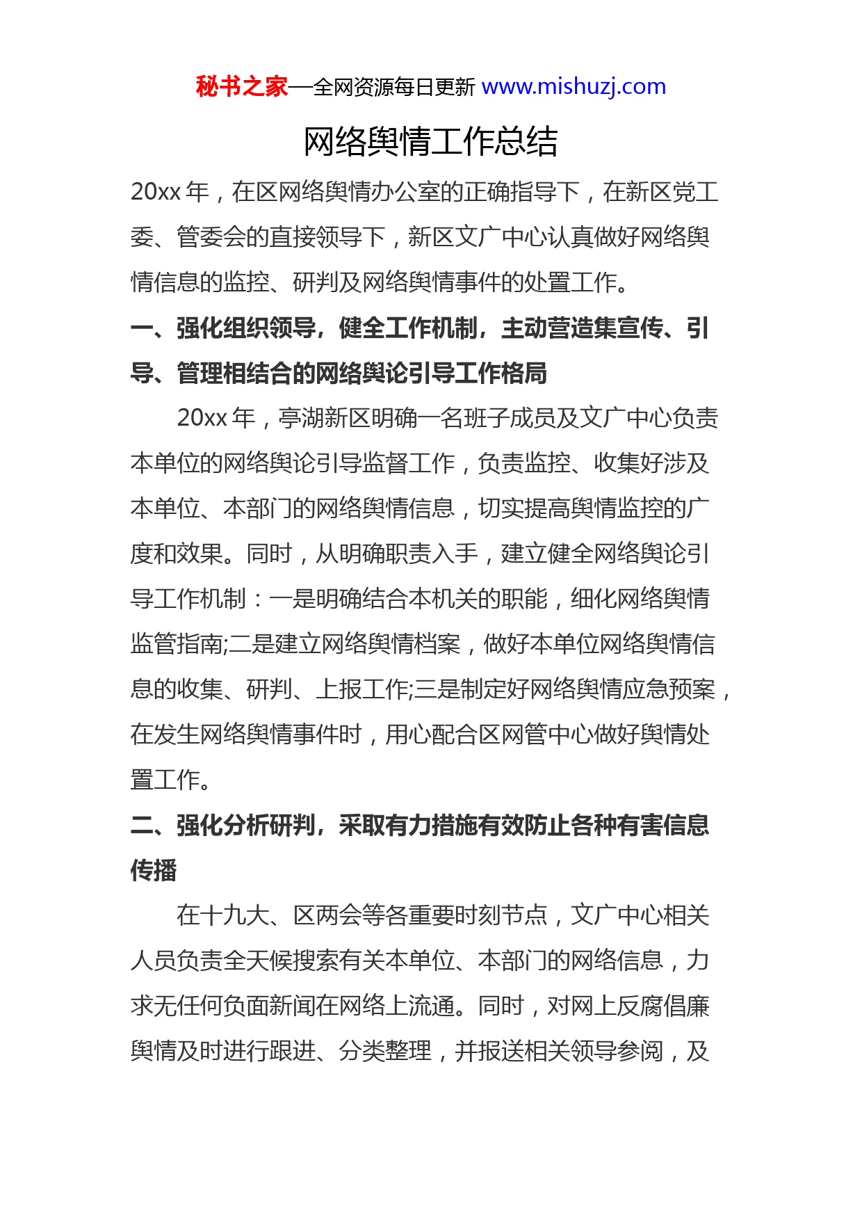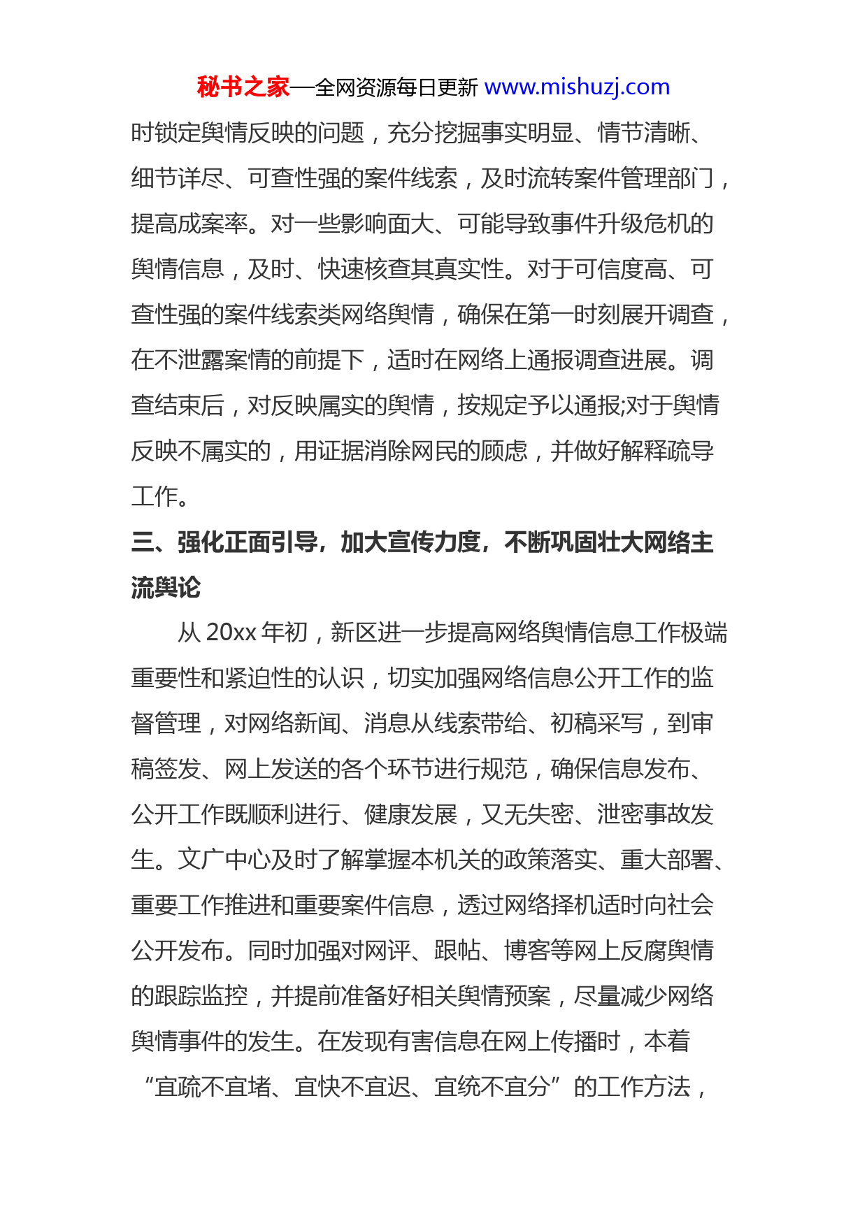秘书之家—全网资源每日更新www.mishuzj.com网络舆情工作总结20xx年,在区网络舆情办公室的正确指导下,在新区党工委、管委会的直接领导下,新区文广中心认真做好网络舆情信息的监控、研判及网络舆情事件的处置工作。一、强化组织领导,健全工作机制,主动营造集宣传、引导、管理相结合的网络舆论引导工作格局20xx年,亭湖新区明确一名班子成员及文广中心负责本单位的网络舆论引导监督工作,负责监控、收集好涉及本单位、本部门的网络舆情信息,切实提高舆情监控的广度和效果。同时,从明确职责入手,建立健全网络舆论引导工作机制:一是明确结合本机关的职能,细化网络舆情监管指南;二是建立网络舆情档案,做好本单位网络舆情信息的收集、研判、上报工作;三是制定好网络舆情应急预案,在发生网络舆情事件时,用心配合区网管中心做好舆情处置工作。二、强化分析研判,采取有力措施有效防止各种有害信息传播在十九大、区两会等各重要时刻节点,文广中心相关人员负责全天候搜索有关本单位、本部门的网络信息,力求无任何负面新闻在网络上流通。同时,对网上反腐倡廉舆情及时进行跟进、分类整理,并报送相关领导参阅,及秘书之家—全网资源每日更新www.mishuzj.com时锁定舆情反映的问题,充分挖掘事实明显、情节清晰、细节详尽、可查性强的案件线索,及时流转案件管理部门,提高成案率。对一些影响面大、可能导致事件升级危机的舆情信息,及时、快速核查其真实性。对于可信度高、可查性强的案件线索类网络舆情,确保在第一时刻展开调查,在不泄露案情的前提下,适时在网络上通报调查进展。调查结束后,对反映属实的舆情,按规定予以通报;对于舆情反映不属实的,用证据消除网民的顾虑,并做好解释疏导工作。三、强化正面引导,加大宣传力度,不断巩固壮大网络主流舆论从20xx年初,新区进一步提高网络舆情信息工作极端重要性和紧迫性的认识,切实加强网络信息公开工作的监督管理,对网络新闻、消息从线索带给、初稿采写,到审稿签发、网上发送的各个环节进行规范,确保信息发布、公开工作既顺利进行、健康发展,又无失密、泄密事故发生。文广中心及时了解掌握本机关的政策落实、重大部署、重要工作推进和重要案件信息,透过网络择机适时向社会公开发布。同时加强对网评、跟帖、博客等网上反腐舆情的跟踪监控,并提前准备好相关舆情预案,尽量减少网络舆情事件的发生。在发现有害信息在网上传播时,本着“宜疏不宜堵、宜快不宜迟、宜统不宜分”的工作方法,秘书之家—全网资源每日更新www.mishuzj.com加强与报刊、广播、电视等主流媒体和以互联网展开合作,拓宽掌握网络舆情的渠道,及时做好宣传引导工作,壮大网络主流舆论,使网友能在第一时刻了解事情真相,明辨是非。四、强化平台建设,用心做好突发事件网上舆论引导新区根据市、区相关领导的要求,认真履行工作职责,认真做好网络舆情的日常监控工作。相关工作人员每一天负责对涉及新区的相关舆情进行监控,并在下班前跟分管领导汇报当日舆情信息。在重大会议、重要庆典活动、重大项目建设期间,坚持做到24小时监控,并落实舆情汇报工作制度。20xx年,新区整改开通了亭湖新区新城街道网站,主动向社会各届公布新区发展、新城建设的相关资料。为创新政府信息公开工作的载体和渠道,今年下半年,对亭湖新区新城街道门户网站进行进一步完善、提升;从而有效整合政务资源,提高办公效率,创新办公模式。新区用心将网络、广播、电视、报纸相结合,建立公众沟通互动平台,便于公众查询,节省查阅成本,保证信息公开的质量和效率。20xx年度共主动公开政府信息304条,其中全文电子化达100%。在主动公开信息工作中,为方便公众了解信息,亭湖新区在主动公开政府信息的形式上采用了政府的网站信息公开栏目重点加强政府信息公开受理处的建设,构成秘书之家—全网资源每日更新www.mishuzj.com统一受理、统一办理、规范服务的工作流程,为公众了解信息带给便利。