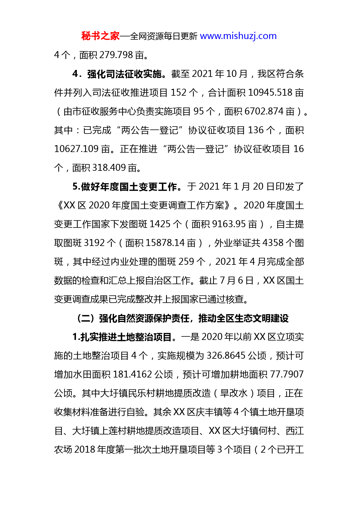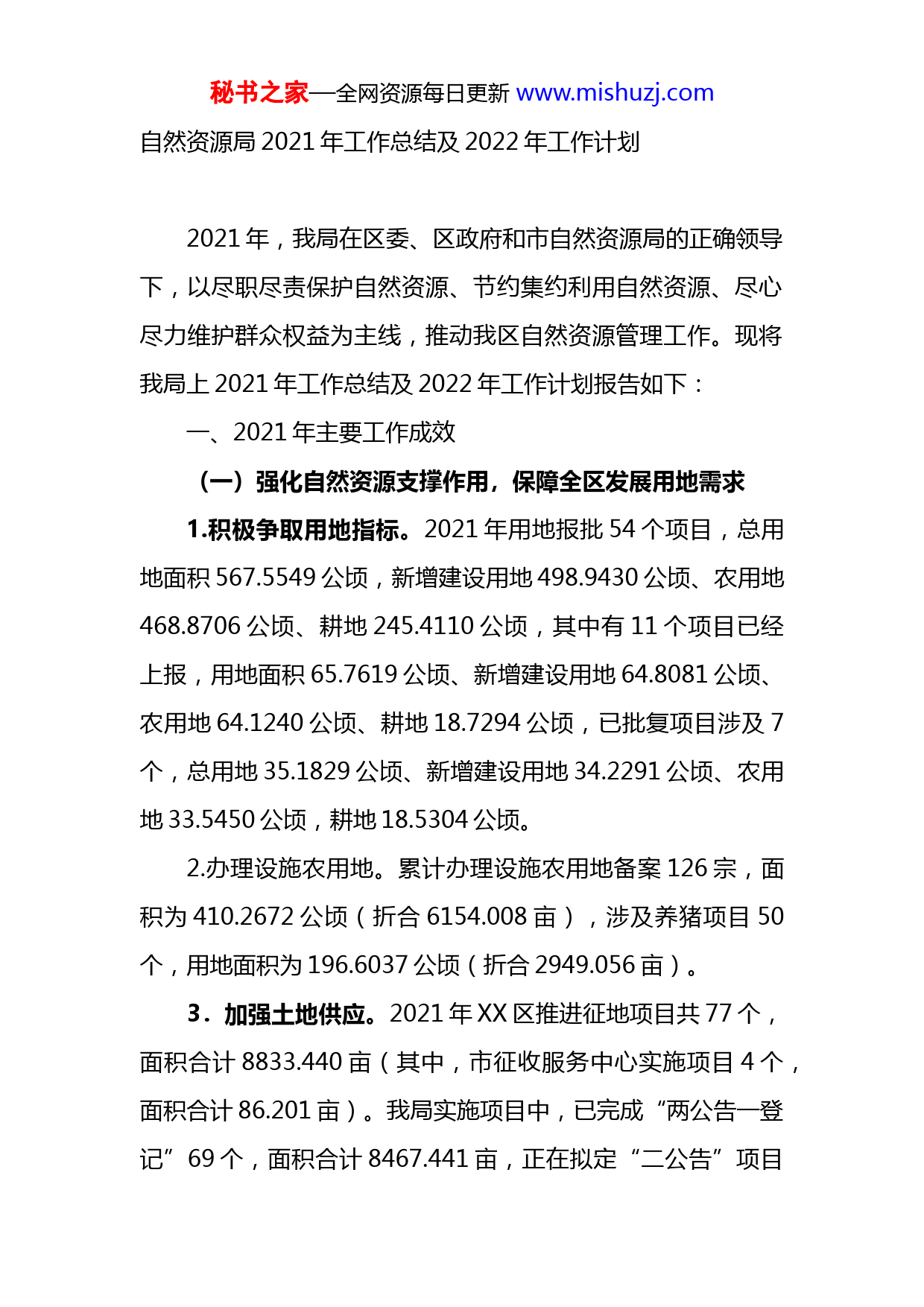 秘书之家—全网资源每日更新www.mishuzj.com自然资源局2021年工作总结及2022年工作计划2021年,我局在区委、区政府和市自然资源局的正确领导下,以尽职尽责保护自然资源、节约集约利用自然资源、尽心尽力维护群众权益为主线,推动我区自然资源管理工作。现将我局上2021年工作总结及2022年工作计划报告如下:一、2021年主要工作成效(一)强化自然资源支撑作用,保障全区发展用地需求1.积极争取用地指标。2021年用地报批54个项目,总用地面积567.5549公顷,新增建设用地498.9430公顷、农用地468.8706公顷、耕地245.4110公顷,其中有11个项目已经上报,用地面积65.7619公顷、新增建设用地64.8081公顷、农用地64.1240公顷、耕地18.7294公顷,已批复项目涉及7个,总用地35.1829公顷、新增建设用地34.2291公顷、农用地33.5450公顷,耕地18.5304公顷。2.办理设施农用地。累计办理设施农用地备案126宗,面积为410.2672公顷(折合6154.008亩),涉及养猪项目50个,用地面积为196.6037公顷(折合2949.056亩)。3.加强土地供应。2021年XX区推进征地项目共77个,面积合计8833.440亩(其中,市征收服务中心实施项目4个,面积合计86.201亩)。我局实施项目中,已完成“两公告一登记”69个,面积合计8467.441亩,正在拟定“二公告”项目秘书之家—全网资源每日更新www.mishuzj.com4个,面积279.798亩。4.强化司法征收实施。截至2021年10月,我区符合条件并列入司法征收推进项目152个,合计面积10945.518亩(由市征收服务中心负责实施项目95个,面积6702.874亩)。其中:已完成“两公告一登记”协议征收项目136个,面积10627.109亩。正在推进“两公告一登记”协议征收项目16个,面积318.409亩。5.做好年度国土变更工作。于2021年1月20日印发了《XX区2020年度国土变更调查工作方案》。2020年度国土变更工作国家下发图斑1425个(面积9163.95亩),自主提取图斑3192个(面积15878.14亩),外业举证共4358个图斑,其中经过内业处理的图斑259个,2021年4月完成全部数据的检查和汇总上报自治区工作。截止7月6日,XX区国土变更调查成果已完成整改并上报国家已通过核查。(二)强化自然资源保护责任,推动全区生态文明建设1.扎实推进土地整治项目。一是2020年以前XX区立项实施的土地整治项目4个,实施规模为326.8645公顷,预计可增加水田面积181.4162公顷,预计可增加耕地面积77.7907公顷。其中大圩镇民乐村耕地提质改造(旱改水)项目,正在收集材料准备进行自验。其余XX区庆丰镇等4个镇土地开垦项目、大圩镇上莲村耕地提质改造项目、XX区大圩镇何村、西江农场2018年度第一批次土地开垦项目等3个项目(2个已开工秘书之家—全网资源每日更新www.mishuzj.com建设,1个未开工)已移交给市农投实施;二是2020年XX区获批复立项土地综合整治项目5个,实施规模为765.6742公顷,预计可增加水田面积503.7114公顷,预计可增加耕地面积139.2117公顷。拟流转土地面积为7260亩,涉及武乐镇、大圩镇、港城街道、根竹镇等4个乡镇,截至9月29日已完成土地流转5253.43亩,流转比例为72.34%,交地比例为58.88%。三是全域土地综合整治完成情况按照《XX市全面推进乡村振兴加快农业农村现代化的实施方案》的要求,2021年每个县(市、区)全域土地综合整治项目入库累计要达到5个以上,其中XX区要求有2个以上进入自治区国土空间生态保护修复项目储备库,截止2021年7月26日,全域土地综合整治项目获得立项批复累计完成1个,其中2020年0个,2021年1个,正在申请全域土地综合整治项目立项1个。2.加强矿产资源管理。督促指导本辖区符合条件的6家采矿企业和4家探矿企业开展矿业权信息填报工作。目前10家矿业权人已全部完成填报公示工作。严格按照“党政同责、一岗双责”落实各项工作,明确了相关职责,分别与6家矿山企业签订了2021年度安全生产责任书,并督促其按安全生产责任书要求开展生产活动。(三)强化自然资源服务意识,促进全区营商环境优化1.提升行政审批效能。优化政务窗口运转机制,按照“一窗受理,集成服务”改革要求,推行“前台综合受理,后台分秘书之家—全网资源每日更新www.mishuzj.com类审批,统一出件”模式。2.做好农村不动产权发证工作。我区选定中里乡平安村5个屯作为农村不动产确权登记权籍调查工作试点,2021年6月21日止,该项工作已经完成519宗房地一体权籍调查,颁发了481本不动产权证书,其余的38宗房地也已完善登记材料,正在录入不动产权籍系统,准备提交不动产登记办证中心申请办理不动产权证。3.做好不动产登记前期调查和划拨土地补办出让前期工作。截止9月份,共进行不动产登记前期调查工作材料454宗;完成划拨土地补办出让249宗,补交出让金582.4563万元;完成拟定并在门户网站和实地公告15份;完成土地确权登记调查46宗,完成郁江所有权首次登记的实地张贴通告工作,配合技术单位完成外业调查,包括村界的核查和实地调查。(四)强化自然资源政策支持,助力全区乡村振兴建设1.承接城乡规划管理职能工作。今年以来,我局共办理了21宗项目用地规划设计条件设置、2本建设工程规划许可证、1本建设用地规划许可证、15宗规划条件核实。2.推进城乡建设用地增减挂钩。积极推进城乡建设用地增减挂钩工作。XX区已完成2017-2020年实施的26个项目,并已报自治区自然资源厅审核通过。3.抓好地质灾害防治工作。印发了《XX市XX区自然资源局关于进一步加强XX区重点区域地质灾害隐患排查工作的秘书