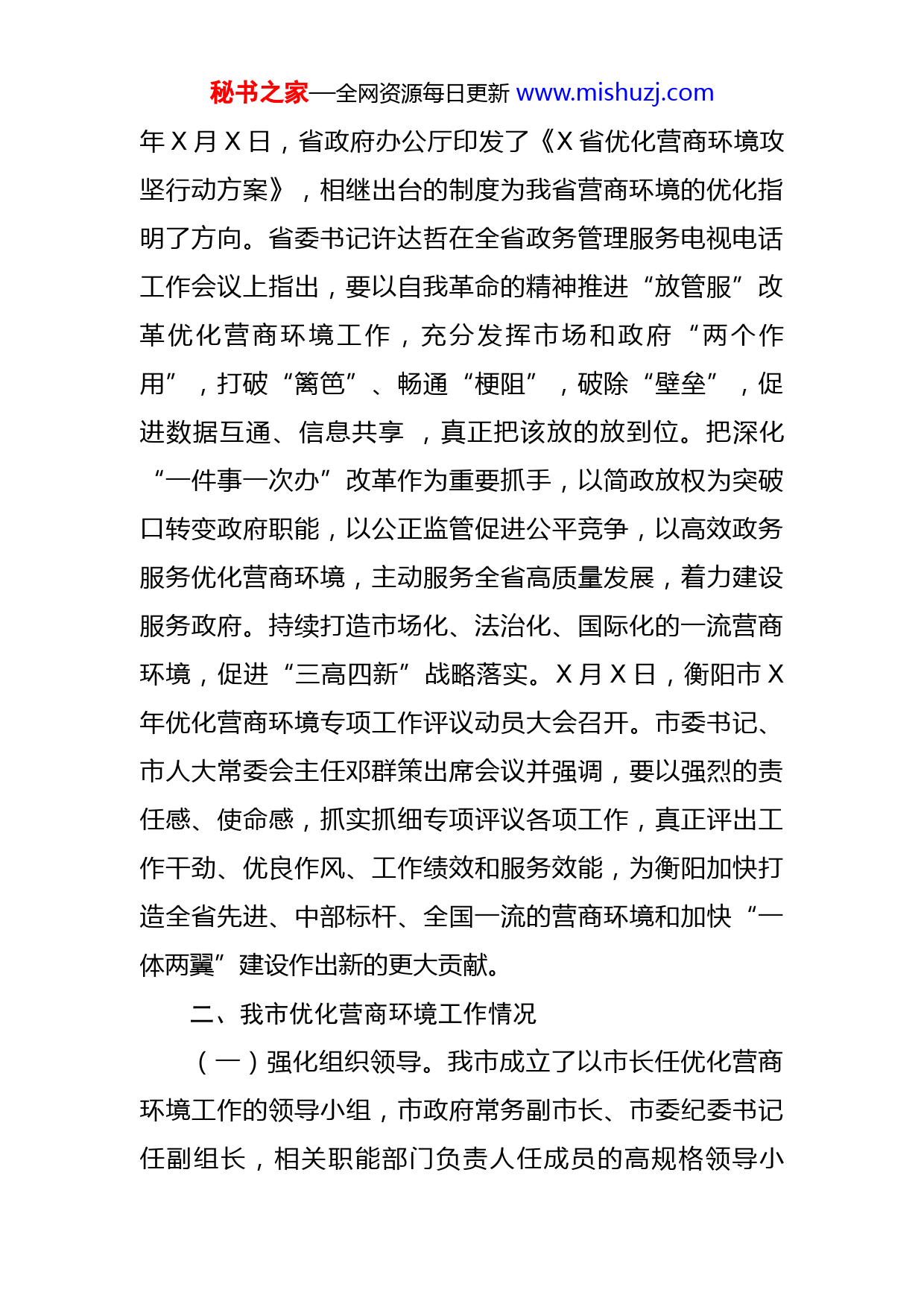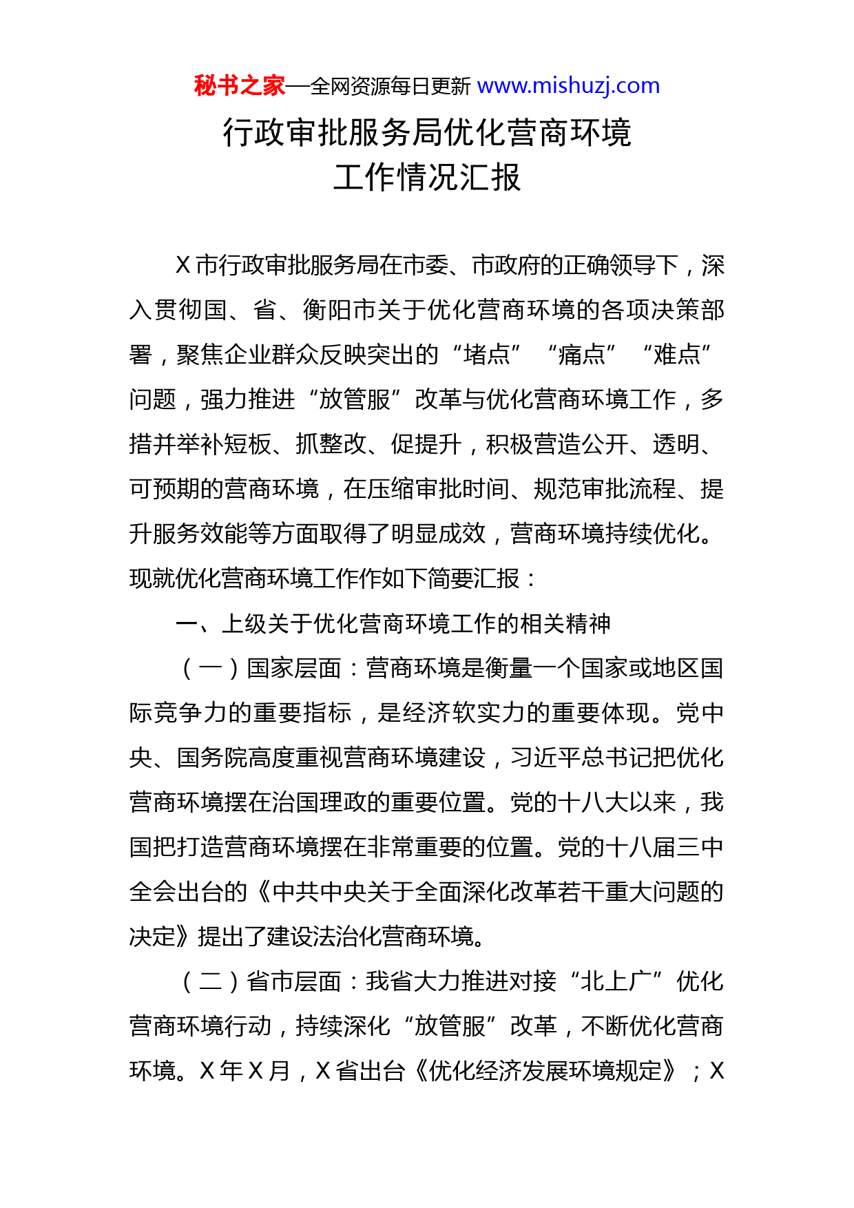 秘书之家—全网资源每日更新www.mishuzj.com行政审批服务局优化营商环境工作情况汇报X市行政审批服务局在市委、市政府的正确领导下,深入贯彻国、省、衡阳市关于优化营商环境的各项决策部署,聚焦企业群众反映突出的“堵点”“痛点”“难点”问题,强力推进“放管服”改革与优化营商环境工作,多措并举补短板、抓整改、促提升,积极营造公开、透明、可预期的营商环境,在压缩审批时间、规范审批流程、提升服务效能等方面取得了明显成效,营商环境持续优化。现就优化营商环境工作作如下简要汇报:一、上级关于优化营商环境工作的相关精神(一)国家层面:营商环境是衡量一个国家或地区国际竞争力的重要指标,是经济软实力的重要体现。党中央、国务院高度重视营商环境建设,习近平总书记把优化营商环境摆在治国理政的重要位置。党的十八大以来,我国把打造营商环境摆在非常重要的位置。党的十八届三中全会出台的《中共中央关于全面深化改革若干重大问题的决定》提出了建设法治化营商环境。(二)省市层面:我省大力推进对接“北上广”优化营商环境行动,持续深化“放管服”改革,不断优化营商环境。X年X月,X省出台《优化经济发展环境规定》;X秘书之家—全网资源每日更新www.mishuzj.com年X月X日,省政府办公厅印发了《X省优化营商环境攻坚行动方案》,相继出台的制度为我省营商环境的优化指明了方向。省委书记许达哲在全省政务管理服务电视电话工作会议上指出,要以自我革命的精神推进“放管服”改革优化营商环境工作,充分发挥市场和政府“两个作用”,打破“篱笆”、畅通“梗阻”,破除“壁垒”,促进数据互通、信息共享,真正把该放的放到位。把深化“一件事一次办”改革作为重要抓手,以简政放权为突破口转变政府职能,以公正监管促进公平竞争,以高效政务服务优化营商环境,主动服务全省高质量发展,着力建设服务政府。持续打造市场化、法治化、国际化的一流营商环境,促进“三高四新”战略落实。X月X日,衡阳市X年优化营商环境专项工作评议动员大会召开。市委书记、市人大常委会主任邓群策出席会议并强调,要以强烈的责任感、使命感,抓实抓细专项评议各项工作,真正评出工作干劲、优良作风、工作绩效和服务效能,为衡阳加快打造全省先进、中部标杆、全国一流的营商环境和加快“一体两翼”建设作出新的更大贡献。二、我市优化营商环境工作情况(一)强化组织领导。我市成立了以市长任优化营商环境工作的领导小组,市政府常务副市长、市委纪委书记任副组长,相关职能部门负责人任成员的高规格领导小秘书之家—全网资源每日更新www.mishuzj.com组,X年X月调整为市委书记任工作领导小组组长,以强有力的组织保障高位推进全市优化营商环境工作。领导小组定期召开优化营商环境工作调度会,“四大家”领导不定期对我市营商环境各项指标进行监测,保证各项惠企利企政策落地,为企业创造良好的营商环境。(二)加强制度建设。近年来,我市陆续出台了相关办法、规定、方案制度,出台并落实《关于开展治理“三乱”严查“不作为慢作为乱作为”专项活动实施方案》、《查处取缔无证照经营工作方案》、《严厉打击公职人员滥用职权、玩忽职守等影响经济发展环境渎职行为的实施方案》、《关于优化园区企业发展环境的若干规定》、《X市推进“一件事一次办”改革工作实施方案》、《X市推进工程建设项目审批制度改革实施方案》、《扶持奖励入园民营工业企业的实施办法》、《X市优化营商环境实施方案》、《X市深入推进“三集中三到位”工作实施方案》、《X市政务服务中心窗口及窗口工作人员管理与考核办法》、《X市营商环境优化年行动方案》、《关于调整X市优化营商环境工作领导小组的通知》等文件精神,进一步规范各部门和全市公职干部的行为,为优化我市营商环境织牢了制度的笼子。(三)政务服务提质增效。加强政务办事大厅的管理与运营。一是建设了高标准的市级政务服务大厅。在市秘书之家—全网资源每日更新www.mishuzj.com委、市政府的强力推动下,重新选址装修了新的政务服务大厅,新大厅总面积X余平方米,新的大厅设施设配齐全,办事环境宽敞、明亮、舒适;二是强力推进了“三集中三到位”改革。按“放管服”改革的工作要求,进驻中心的各窗口单位必须积极推进行政审批“三集中、三到位”改革。各行政审批部门及公共服务部门必须设立行政审批股室;实行“首席代表制”,各部门行政审批股室要成建制进驻政务大厅,并由行政审批股股长担任派驻政务中心窗口工作人员的首席代表,由首席代表对本单位的审批办理事项负总责;各部门主要负责人要与首席代表签订授权委托书(一式四份),授予首席代表本部门审批决定权、审核上报权、组织协调权;刻制“行政审批专用章”。根据省、衡阳市要求,去年X月份,我局为全市X个乡镇、X个村刻制了一枚行政审批专用章。各市直单位行政审批专用章也已刻制到位并投入使用三是继续抓好三大改革。一方面继续推进“一件事一次办”改革。全面落实省、市“一件事一次办”改革总要求,从群众和企业办事的角度出发,围绕公民、企业发展需要,按照《X市推进“一件事一次办”改革工作实施方案》,按要求设立“一件事一次办”综合窗
