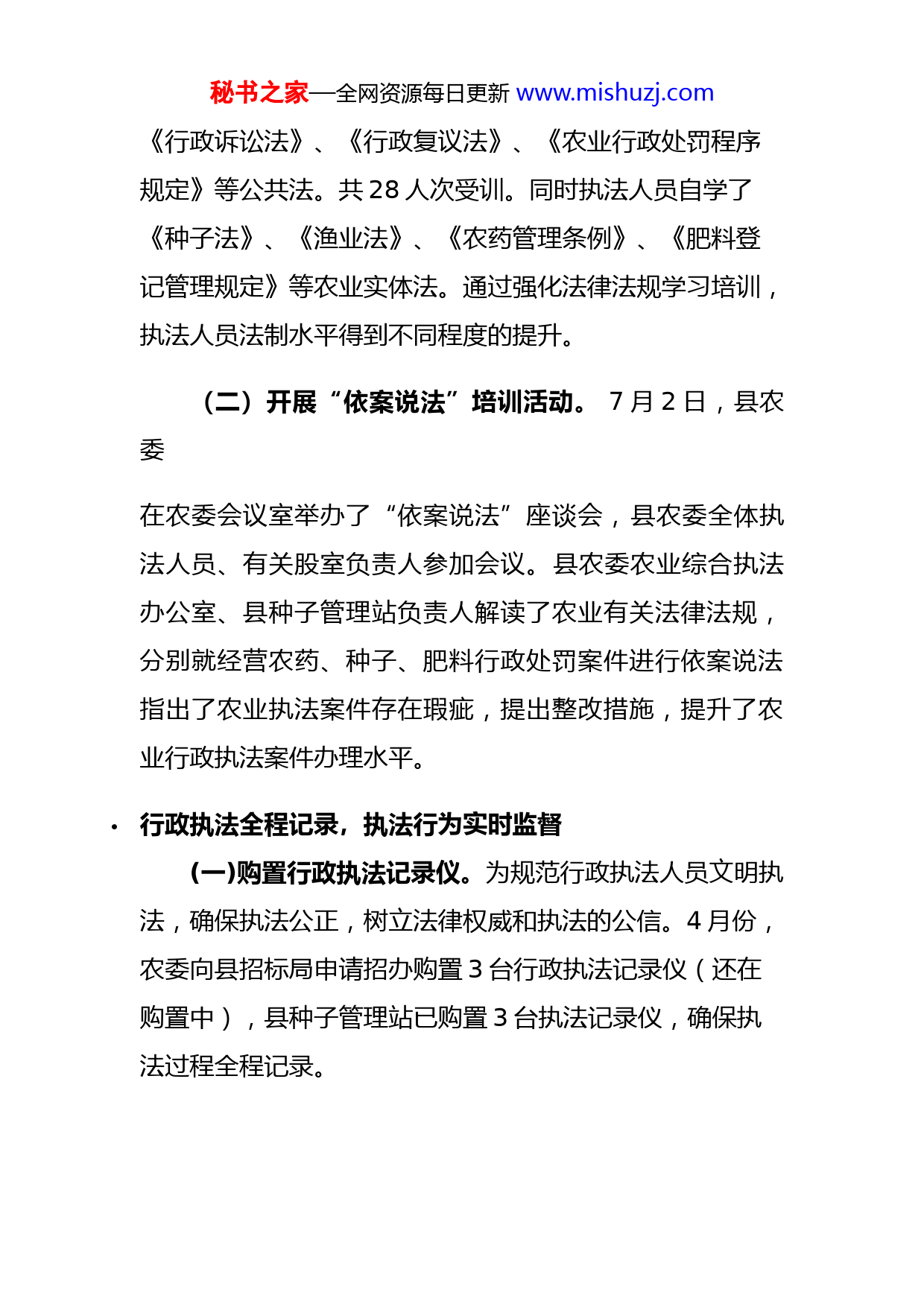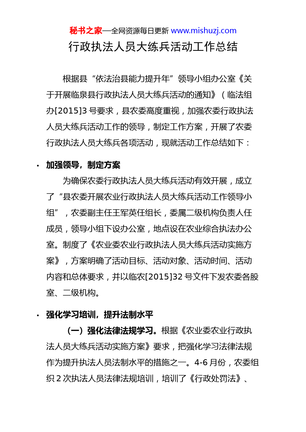 秘书之家—全网资源每日更新www.mishuzj.com行政执法人员大练兵活动工作总结根据县“依法治县能力提升年”领导小组办公室《关于开展临泉县行政执法人员大练兵活动的通知》(临法组办[2015]3号要求,县农委高度重视,加强农委行政执法人员大练兵活动工作的领导,制定工作方案,开展了农委行政执法人员大练兵各项活动,现就活动工作总结如下:加强领导,制定方案为确保农委行政执法人员大练兵活动有效开展,成立了“县农委开展农业行政执法人员大练兵活动工作领导小组”,农委副主任王军英任组长,委属二级机构负责人任成员,领导小组下设办公室,地点设在农业综合执法办公室。制度了《农业委农业行政执法人员大练兵活动实施方案》,方案明确了活动目标、活动对象、活动时间、活动内容和总体要求,并以临农[2015]32号文件下发农委各股室、二级机构。强化学习培训,提升法制水平(一)强化法律法规学习。根据《农业委农业行政执法人员大练兵活动实施方案》要求,把强化学习法律法规作为提升执法人员法制水平的措施之一。4-6月份,农委组织2次执法人员法律法规培训,培训了《行政处罚法》、秘书之家—全网资源每日更新www.mishuzj.com《行政诉讼法》、《行政复议法》、《农业行政处罚程序规定》等公共法。共28人次受训。同时执法人员自学了《种子法》、《渔业法》、《农药管理条例》、《肥料登记管理规定》等农业实体法。通过强化法律法规学习培训,执法人员法制水平得到不同程度的提升。(二)开展“依案说法”培训活动。7月2日,县农委在农委会议室举办了“依案说法”座谈会,县农委全体执法人员、有关股室负责人参加会议。县农委农业综合执法办公室、县种子管理站负责人解读了农业有关法律法规,分别就经营农药、种子、肥料行政处罚案件进行依案说法指出了农业执法案件存在瑕疵,提出整改措施,提升了农业行政执法案件办理水平。行政执法全程记录,执法行为实时监督(一)购置行政执法记录仪。为规范行政执法人员文明执法,确保执法公正,树立法律权威和执法的公信。4月份,农委向县招标局申请招办购置3台行政执法记录仪(还在购置中),县种子管理站已购置3台执法记录仪,确保执法过程全程记录。秘书之家—全网资源每日更新www.mishuzj.com(二)实行农业执法巡查记录制度。在农业行政执法过程中,执法人员对被执法检查单位、检查内容、存在问题进行现场记录,填写《农业行政执法巡查记录表》,一式二份,被检查当事人确认签字后,当事人、行政执法单位各保存一份。实行农业执法巡查记录制度是对农业执法人员的保护,也是对执法人员执法行为的监督。四、积极参与行政执法,进行业务大练兵按照《农业委农业行政执法人员大练兵活动实施方案》要求,农业执法人员全部积极参与农业行政执法和行政处罚案件办理活动,学用结合,学以致用。通过执法检查、案件办理在规范执法行为,规范执法程序,提高执法技能和案件办理质量等方面,全面提升执法人员执法能力。4-6月份,参与农业执法人员共434人次,检查市场117个次,办理行政执法案件14件。通过执法人员大练兵活动,执法人员的执法行为规范、执法效率、案件办理质量都有所提升。