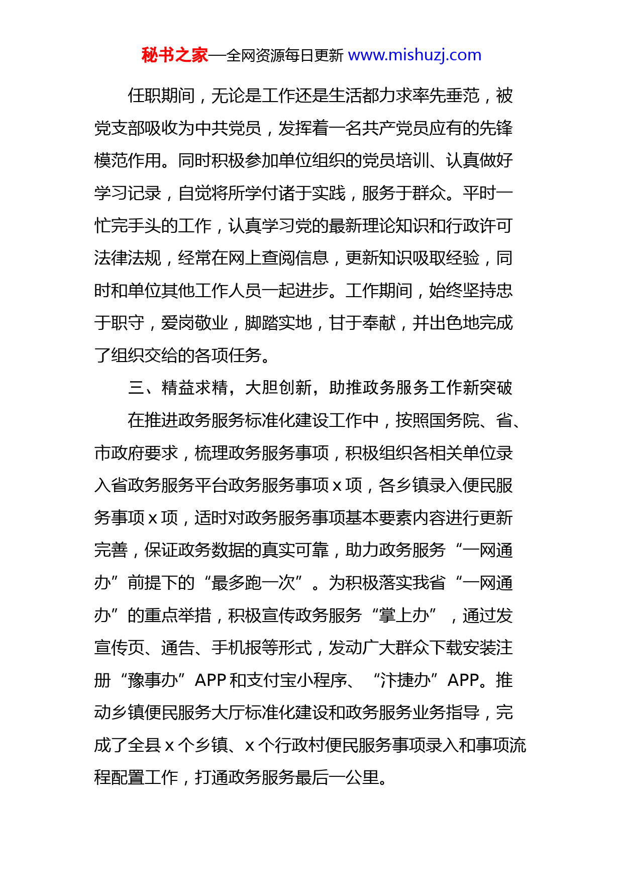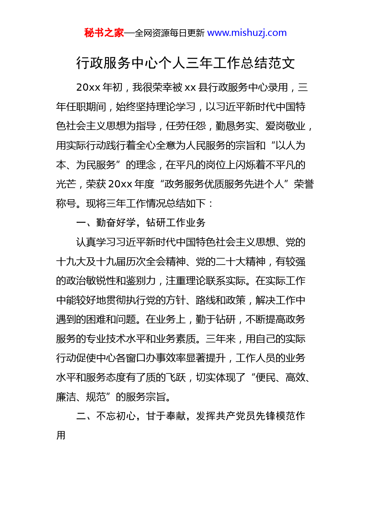 秘书之家—全网资源每日更新www.mishuzj.com行政服务中心个人三年工作总结范文20xx年初,我很荣幸被xx县行政服务中心录用,三年任职期间,始终坚持理论学习,以习近平新时代中国特色社会主义思想为指导,任劳任怨,勤恳务实、爱岗敬业,用实际行动践行着全心全意为人民服务的宗旨和“以人为本、为民服务”的理念,在平凡的岗位上闪烁着不平凡的光芒,荣获20xx年度“政务服务优质服务先进个人”荣誉称号。现将三年工作情况总结如下:一、勤奋好学,钻研工作业务认真学习习近平新时代中国特色社会主义思想、党的十九大及十九届历次全会精神、党的二十大精神,有较强的政治敏锐性和鉴别力,注重理论联系实际。在实际工作中能较好地贯彻执行党的方针、路线和政策,解决工作中遇到的困难和问题。在业务上,勤于钻研,不断提高政务服务的专业技术水平和业务素质。三年来,用自己的实际行动促使中心各窗口办事效率显著提升,工作人员的业务水平和服务态度有了质的飞跃,切实体现了“便民、高效、廉洁、规范”的服务宗旨。二、不忘初心,甘于奉献,发挥共产党员先锋模范作用秘书之家—全网资源每日更新www.mishuzj.com任职期间,无论是工作还是生活都力求率先垂范,被党支部吸收为中共党员,发挥着一名共产党员应有的先锋模范作用。同时积极参加单位组织的党员培训、认真做好学习记录,自觉将所学付诸于实践,服务于群众。平时一忙完手头的工作,认真学习党的最新理论知识和行政许可法律法规,经常在网上查阅信息,更新知识吸取经验,同时和单位其他工作人员一起进步。工作期间,始终坚持忠于职守,爱岗敬业,脚踏实地,甘于奉献,并出色地完成了组织交给的各项任务。三、精益求精,大胆创新,助推政务服务工作新突破在推进政务服务标准化建设工作中,按照国务院、省、市政府要求,梳理政务服务事项,积极组织各相关单位录入省政务服务平台政务服务事项x项,各乡镇录入便民服务事项x项,适时对政务服务事项基本要素内容进行更新完善,保证政务数据的真实可靠,助力政务服务“一网通办”前提下的“最多跑一次”。为积极落实我省“一网通办”的重点举措,积极宣传政务服务“掌上办”,通过发宣传页、通告、手机报等形式,发动广大群众下载安装注册“豫事办”APP和支付宝小程序、“汴捷办”APP。推动乡镇便民服务大厅标准化建设和政务服务业务指导,完成了全县x个乡镇、x个行政村便民服务事项录入和事项流程配置工作,打通政务服务最后一公里。秘书之家—全网资源每日更新www.mishuzj.com四、恪尽职守,防控疫情,助力企业有序复工复产面对近年来突发的新冠疫情,始终牢记肩负的责任和使命,不顾个人安危、不退缩、不畏惧,以身作则,积极学习宣传防控知识,通过LED屏滚动播放疫情防控便民服务信息,制作宣传版面、制作政务服务办事指引,积极帮助群众疏导情绪、解答群众办事、疫情防控疑难点,并多次通过不同途径进行捐款,充分发挥了一名共产党员的先锋模范作用。疫情防控稳定的同时,为满足企业群众办事需求,白天在大厅一线现场指导企业网上办理流程,为企业更好更快投入生产提供优质服务。晚上加班加点制定大厅有序开放实施方案、完善办事公告及办事流程、合理设置人员进出通道等各项大厅开放前的准备工作。疫情监测工作是大厅开放的重中之重,严把入口关,保证我县广大企业群众的安全问题,配合现代化智能感温仪等设备,通过高灵敏红外探测器对进入行政服务中心所有人员进行快速体温检测,可实时预警并捕捉体温异常人员人像信息。为了大厅疫情防控工作更精准,积极协助领导谋划,想办法和相关公司对接,打破传统的纸质登记模式,运用手机APP无接触身份登记方式,对到大厅现场办事的群众实行扫描读取身份证全程零接触登记。同时,组织大厅工作人员做好定时对大厅、楼道、垃圾桶等公共设施、公共区域的高频次消毒工作。为维护我县正常经济社会秩序,助力秘书之家—全网资源每日更新www.mishuzj.com企业复工复产,作为一名政务服务工作者,积极推行政务服务“非接触”、“不见面”办理,第一时间梳理出与企业群众生产生活密切相关的21个审批单位的434项政务服务事项,并向社会发布。引导企业通过河南政务服务网“网上办”“预约办”“邮寄办”,向企业推广使用“豫事办”“汴捷办”APP掌上办,在做好疫情防控工作的同时,不断为企业提供优质的政务服务,为企业稳步有序复工复产保驾护航。五、吃苦耐劳,打赢抗洪保卫战我县受强降雨及上游泄洪影响,发生重大汛情,为帮助受灾同胞振奋精神、渡过难关、恢复生产、重建家园。按照县委、县政府要求,积极协助领导组织单位人员第一时间前往抗汛救灾前线疏散群众、守护大堤。经过长达20余天的日夜奋战,万众一心、众志成城、全力以赴,夺取防汛工作的全面胜利。同时积极参与我局举行的防汛抗洪抢险救灾捐款活动,用实际行动践行“我为群众办实事”。总之,三年任职期间,做为一名政务服务工作者,我始终坚持把方便企业群众放在第一位,行政服务中心既代表着各职能部门的形象,同时也代表着xx的整体形象,因此我严格要求自己,一丝不苟地做好政务服务工作。工作中不仅较好地完成了领导交办的各项工作任务,而且得到群众和领导的一致好评。秘书