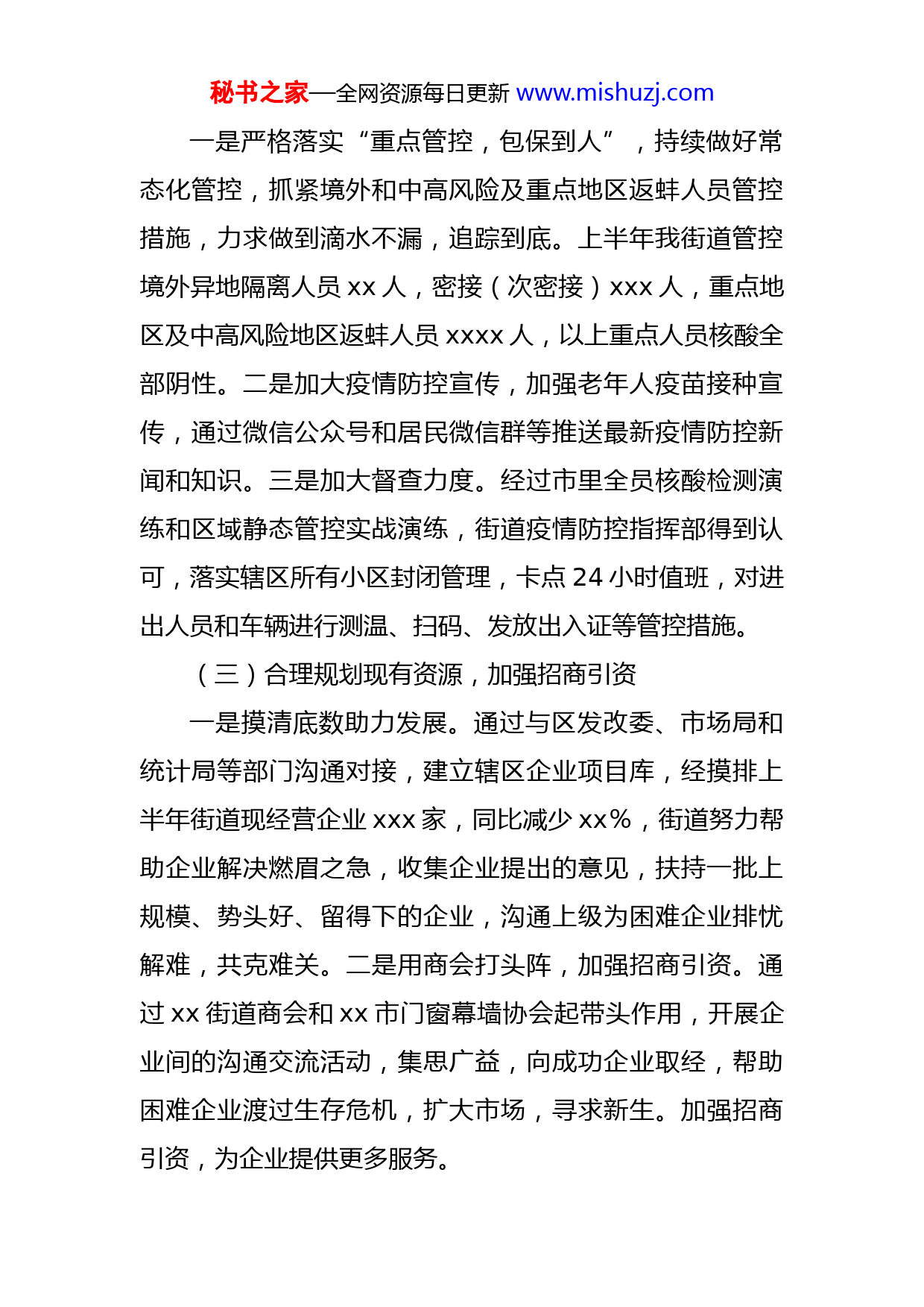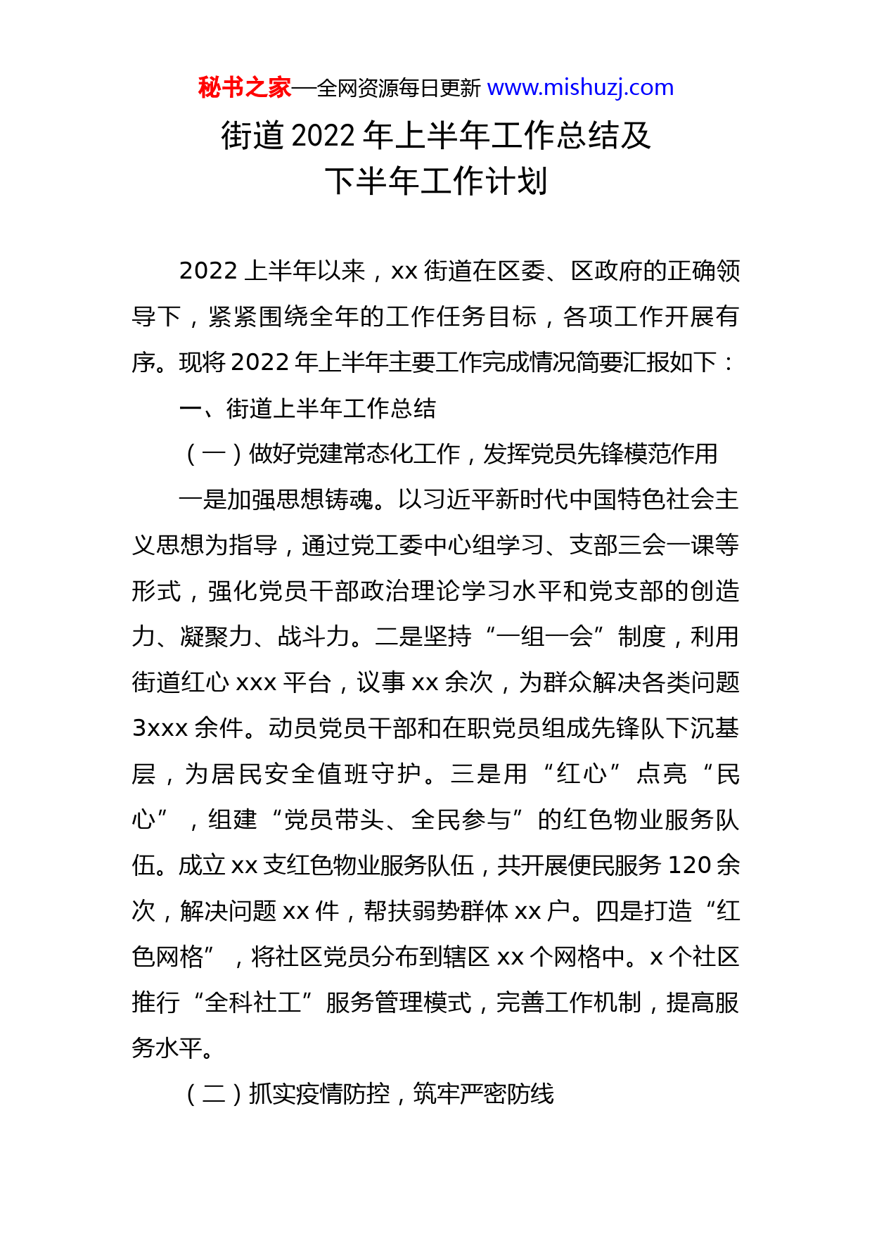 秘书之家—全网资源每日更新www.mishuzj.com街道2022年上半年工作总结及下半年工作计划2022上半年以来,xx街道在区委、区政府的正确领导下,紧紧围绕全年的工作任务目标,各项工作开展有序。现将2022年上半年主要工作完成情况简要汇报如下:一、街道上半年工作总结(一)做好党建常态化工作,发挥党员先锋模范作用一是加强思想铸魂。以习近平新时代中国特色社会主义思想为指导,通过党工委中心组学习、支部三会一课等形式,强化党员干部政治理论学习水平和党支部的创造力、凝聚力、战斗力。二是坚持“一组一会”制度,利用街道红心xxx平台,议事xx余次,为群众解决各类问题3xxx余件。动员党员干部和在职党员组成先锋队下沉基层,为居民安全值班守护。三是用“红心”点亮“民心”,组建“党员带头、全民参与”的红色物业服务队伍。成立xx支红色物业服务队伍,共开展便民服务120余次,解决问题xx件,帮扶弱势群体xx户。四是打造“红色网格”,将社区党员分布到辖区xx个网格中。x个社区推行“全科社工”服务管理模式,完善工作机制,提高服务水平。(二)抓实疫情防控,筑牢严密防线秘书之家—全网资源每日更新www.mishuzj.com一是严格落实“重点管控,包保到人”,持续做好常态化管控,抓紧境外和中高风险及重点地区返蚌人员管控措施,力求做到滴水不漏,追踪到底。上半年我街道管控境外异地隔离人员xx人,密接(次密接)xxx人,重点地区及中高风险地区返蚌人员xxxx人,以上重点人员核酸全部阴性。二是加大疫情防控宣传,加强老年人疫苗接种宣传,通过微信公众号和居民微信群等推送最新疫情防控新闻和知识。三是加大督查力度。经过市里全员核酸检测演练和区域静态管控实战演练,街道疫情防控指挥部得到认可,落实辖区所有小区封闭管理,卡点24小时值班,对进出人员和车辆进行测温、扫码、发放出入证等管控措施。(三)合理规划现有资源,加强招商引资一是摸清底数助力发展。通过与区发改委、市场局和统计局等部门沟通对接,建立辖区企业项目库,经摸排上半年街道现经营企业xxx家,同比减少xx%,街道努力帮助企业解决燃眉之急,收集企业提出的意见,扶持一批上规模、势头好、留得下的企业,沟通上级为困难企业排忧解难,共克难关。二是用商会打头阵,加强招商引资。通过xx街道商会和xx市门窗幕墙协会起带头作用,开展企业间的沟通交流活动,集思广益,向成功企业取经,帮助困难企业渡过生存危机,扩大市场,寻求新生。加强招商引资,为企业提供更多服务。秘书之家—全网资源每日更新www.mishuzj.com(四)巩固创城成果,提升工作质量一是采取建管并重原则,做好基础设施提升工作。上半年整治辖区内xx个生活小区环境卫生xx余次,累计约xxx人参与整治活动。排查并更换公益广告xx处,清理乱堆放近xxx车,恢复毁绿种菜面积xxx平方米,拆除违建x次,新建充电桩xx个,开展综合执法进小区x次,修补小区破损路面xxxx平方米,对楼道墙面粉刷xx余处,新增晾衣架xxx个,安装雨水篦子铁丝网百余个,进一步精细化小区基础设施和卫生环境。二是提升工作质量。用“党建+创建”的服务模式,打造xx支多元化志愿服务队伍,依托“红心365”工作平台,扎实开展“我为群众办实事”实践活动,开展各类精神文明建设活动xx余场,受益人群x万余人。上半年,xx街道成功申报市级文明市民x人,上报区级月评十佳志愿者x人、好人x人,积极开展各类新时代文明实践活动xx余场,展现良好的工作面貌。(五)提升社会事务服务质量,保障改善民生一是提升服务水平。强化窗口工作人员业务培训及全科社工工作,在疫情防控期特殊时期,利用小区微信群和公众号,开展线上服务和政策宣传,便民利民。二是大力促进就业工作,新增实名制就业xxx人,失业再就业xxx人,就业困难再就业xx人,就业帮扶xxx人次,成功报批小额贷款xx万元。三是维护退休人员工作,上半年共办理秘书之家—全网资源每日更新www.mishuzj.comxxx名退休工人死亡结算手续,新增退休人员xxx人,疑似伪造档案办理退休人员追缴共xx人。三代金融社保卡更换xxx人。四是做好医疗救助工作。帮助居民补缴城乡居民医保xx人,医疗救助共xx人,救助金额共xxxxx.xx元。(六)及时排查化解矛盾,营造平安建设氛围一是及时化解矛盾纠纷。上半年共排查解决矛盾纠纷xx起,纠纷通过调解委员会及时化解,矛盾纠纷总体情况比较平稳。矛盾纠纷排查处做到及时梳理,不偏不倚,为居民全心全意服务。二是对重点信访案件进行梳理,落实重点信访案件包保工作责任制,一案一策,目前有效稳控xx件,正在化解x件。三是强化信息网络管理,构建网上治安防控体系,同时加强流动人口服务和管理,构建辖区内流动人口服务管理平台。利用新媒体,有计划、分步骤地组织好平安建设系列宣传工作。(七)切实抓好党风廉政建设一是积极配合巡察工作。街道全力配合区委第二巡察组开展巡察工作,积极提供相关材料。后期围绕巡察出的问题,立刻整改。二是大力宣传“小微权利监督一点通”平台。通过在小区内张贴海报,提高居民知晓率,让居民有途径进行实时、有效的监督。三是贯彻落实中央八项规定精神。积极主动下基层调研,“从群众中来,到群众中秘书之家—全网资源每日更新www.mishuzj.com去”。二、存在的问题一是党建工作方面。在推动党建任务落实上,党建工作亮点不足,支部建
