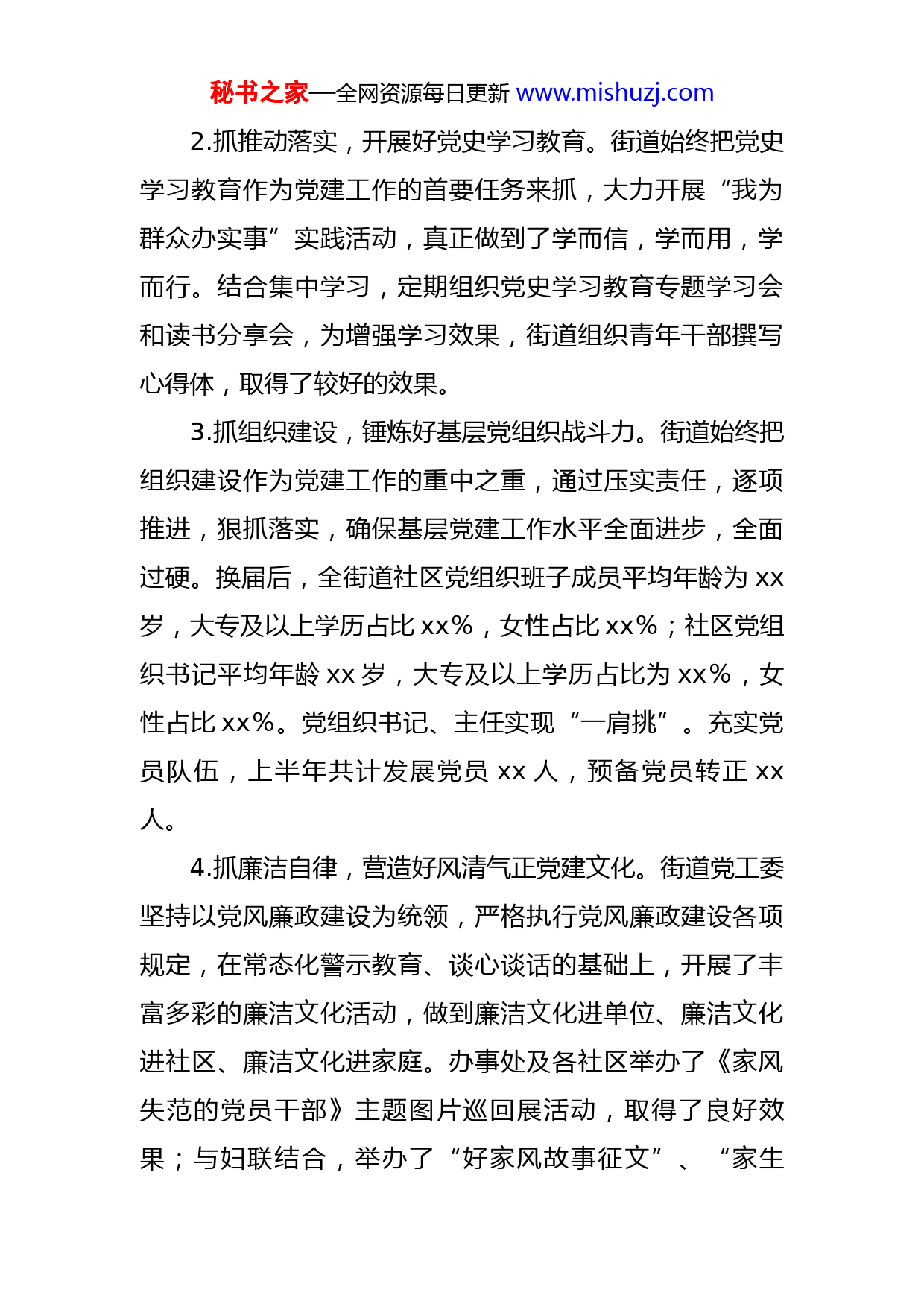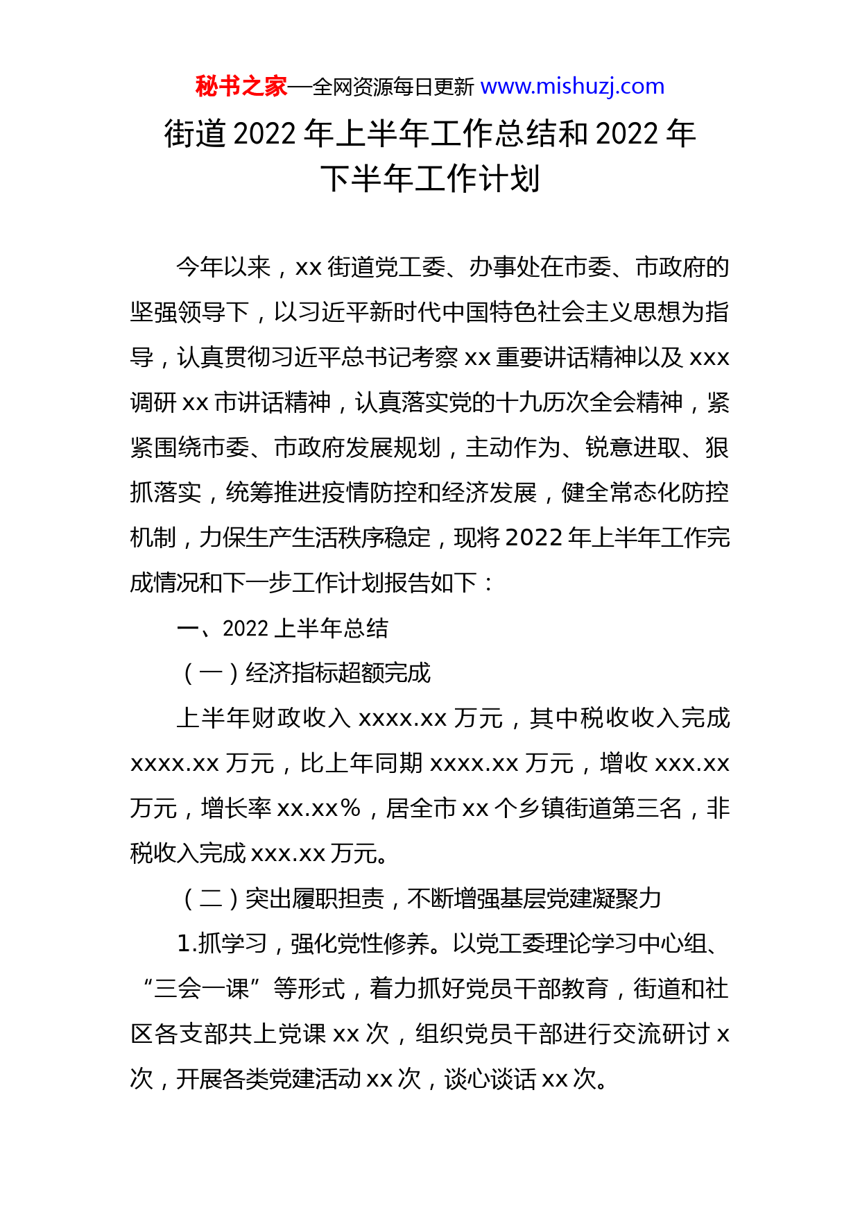 秘书之家—全网资源每日更新www.mishuzj.com街道2022年上半年工作总结和2022年下半年工作计划今年以来,xx街道党工委、办事处在市委、市政府的坚强领导下,以习近平新时代中国特色社会主义思想为指导,认真贯彻习近平总书记考察xx重要讲话精神以及xxx调研xx市讲话精神,认真落实党的十九历次全会精神,紧紧围绕市委、市政府发展规划,主动作为、锐意进取、狠抓落实,统筹推进疫情防控和经济发展,健全常态化防控机制,力保生产生活秩序稳定,现将2022年上半年工作完成情况和下一步工作计划报告如下:一、2022上半年总结(一)经济指标超额完成上半年财政收入xxxx.xx万元,其中税收收入完成xxxx.xx万元,比上年同期xxxx.xx万元,增收xxx.xx万元,增长率xx.xx%,居全市xx个乡镇街道第三名,非税收入完成xxx.xx万元。(二)突出履职担责,不断增强基层党建凝聚力1.抓学习,强化党性修养。以党工委理论学习中心组、“三会一课”等形式,着力抓好党员干部教育,街道和社区各支部共上党课xx次,组织党员干部进行交流研讨x次,开展各类党建活动xx次,谈心谈话xx次。秘书之家—全网资源每日更新www.mishuzj.com2.抓推动落实,开展好党史学习教育。街道始终把党史学习教育作为党建工作的首要任务来抓,大力开展“我为群众办实事”实践活动,真正做到了学而信,学而用,学而行。结合集中学习,定期组织党史学习教育专题学习会和读书分享会,为增强学习效果,街道组织青年干部撰写心得体,取得了较好的效果。3.抓组织建设,锤炼好基层党组织战斗力。街道始终把组织建设作为党建工作的重中之重,通过压实责任,逐项推进,狠抓落实,确保基层党建工作水平全面进步,全面过硬。换届后,全街道社区党组织班子成员平均年龄为xx岁,大专及以上学历占比xx%,女性占比xx%;社区党组织书记平均年龄xx岁,大专及以上学历占比为xx%,女性占比xx%。党组织书记、主任实现“一肩挑”。充实党员队伍,上半年共计发展党员xx人,预备党员转正xx人。4.抓廉洁自律,营造好风清气正党建文化。街道党工委坚持以党风廉政建设为统领,严格执行党风廉政建设各项规定,在常态化警示教育、谈心谈话的基础上,开展了丰富多彩的廉洁文化活动,做到廉洁文化进单位、廉洁文化进社区、廉洁文化进家庭。办事处及各社区举办了《家风失范的党员干部》主题图片巡回展活动,取得了良好效果;与妇联结合,举办了“好家风故事征文”、“家生秘书之家—全网资源每日更新www.mishuzj.com态”建设座谈会、读书分享会、家庭读书思廉等廉洁教育活动,不断筑牢反腐倡廉的家庭防线;解放社区建立廉洁文化一条巷,开展了廉洁寄语、家风家训微宣讲活动,营造了风清气正的党建文化。5.深入推进改革创新,丰富“善治”内涵。立足街道管理体制改革,将人员队伍、机制职能融合、智慧赋能等作为重要的创新抓手和驱动引擎,初步蹚出了一条可覆盖和联动的改革路径。针对群众反映的难点痛点,持续推进精细化管理、智慧化建设、常态化执法,城市面貌、环境和秩序都发生了大变化,人民群众的幸福指数显著提高。助力城市治理。街道综合执法大队,联合城市管理、安监、市监等部门对辖区沿街商铺、超市店外经营的巡查力度,规划了育红幼儿园和崇文中学旁边的摊点,按时按指定地点有序摆放,并规定每个摊位自备垃圾桶,做到车走地净。并实施全天候执法、全方位整治,并不定期开展“回头看”,有效遏制反弹。半年来受理投诉xx件,办结xx件。强化信息化治理。持续推广微信小程序,半年来收集群众反映的各种问题xxx余条,综合解决率在xx%以上,极大地解决了群众反映难、解决慢的问题,居民满意度直线上升,xxxxx热线和市长信箱关于xx辖区投诉量明显下降。(三)突出宣传教育,不断增强党员队伍向心力秘书之家—全网资源每日更新www.mishuzj.com1.把牢意识形态工作主动权。加强意识形态工作,制定中心组学习计划,强化意识形态工作的主体责任,用习近平新时代中国特色社会主义思想武装广大党员干部,强化党在意识形态工作中的领导权。建立“周巡查、月报送”的日常巡查制度,强化动态管理,实时掌握宗教领域动态信息,定期排查安全隐患,及时报告重大情况和突发事件,确保辖区内无非法宗教活动及私设聚会点。坚持分类施策,定期谈心谈话、走访慰问,宣传党的宗教政策,确保意识形态阵地可管可控。上半年专题研究意识形态工作x次。2.扎实开展党史学习教育。将党史学习教育作为一项重大政治任务,制定中心组学习计划和行事历,坚持每日一学,每半月开展一次学习研讨。2022年上半年重点学习了《中国共产党简史》《中华人民共和国简史》《改革开放简史》《社会主义发展简史》、习近平总书记讲话精神等。围绕“四聚焦四整肃”内容,开展对照检查研讨专题会。督促街道党员加强对“学习强国”的学习,目前已取得良好成效,市级排名逐步提升。(四)突出廉洁教育,不断增强从严治党管控力1.扎实开展专题警示教育。今年以来,围绕作风建设,扎实开展了“四聚焦四整肃”专题警示教育工作,召开全办党员干部大会、纪检委员例会,安排部署年轻干部廉政秘书之家—全网资源每日更新www.mishuzj.com警示教育月活动,同时建立“传帮带”机制,班子成员落实x-x名联系对象,进行一对一“传帮带”培养,并制定了工作行事历。组织学习了《关于