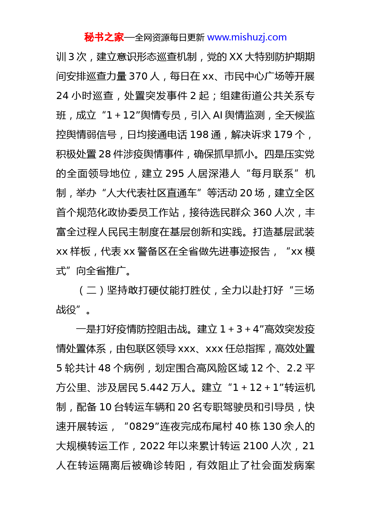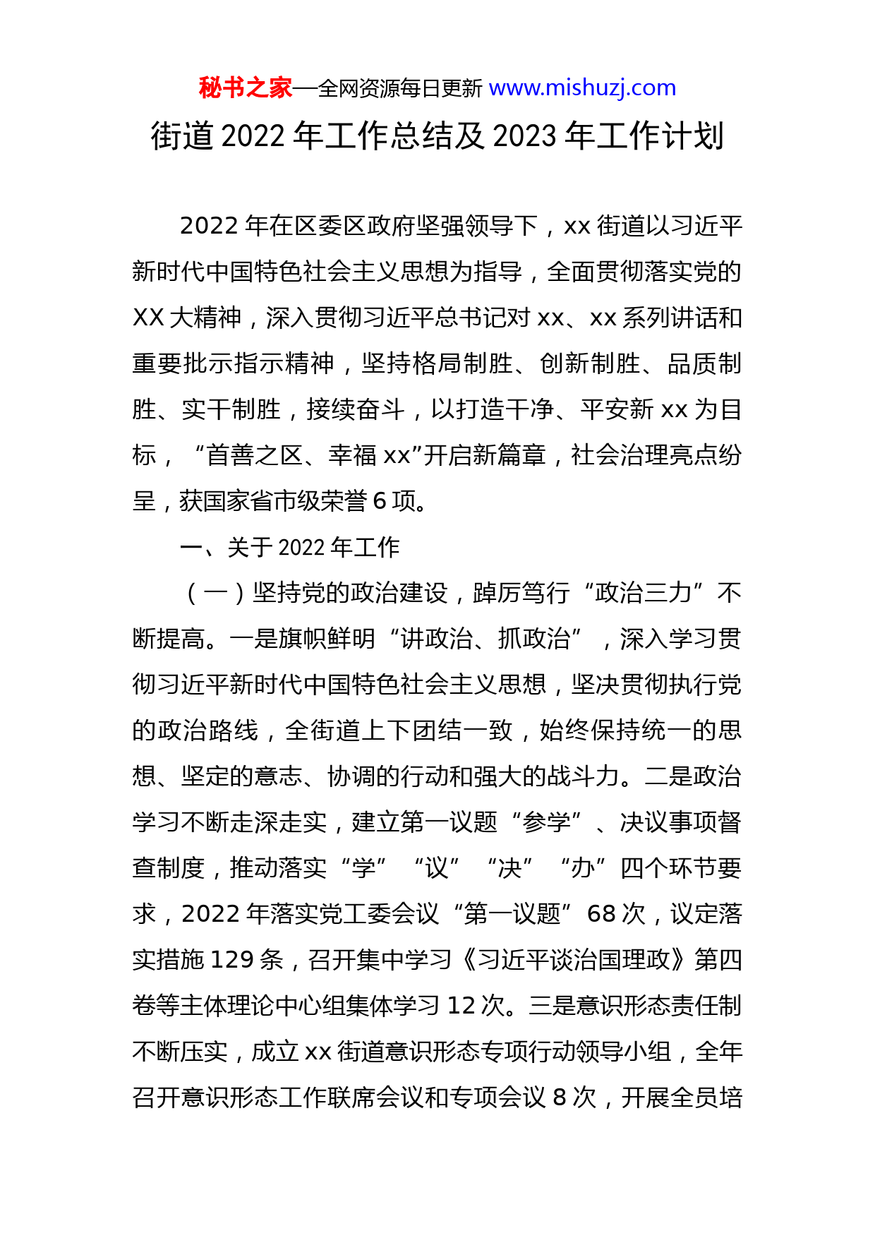 秘书之家—全网资源每日更新www.mishuzj.com街道2022年工作总结及2023年工作计划2022年在区委区政府坚强领导下,xx街道以习近平新时代中国特色社会主义思想为指导,全面贯彻落实党的XX大精神,深入贯彻习近平总书记对xx、xx系列讲话和重要批示指示精神,坚持格局制胜、创新制胜、品质制胜、实干制胜,接续奋斗,以打造干净、平安新xx为目标,“首善之区、幸福xx”开启新篇章,社会治理亮点纷呈,获国家省市级荣誉6项。一、关于2022年工作(一)坚持党的政治建设,踔厉笃行“政治三力”不断提高。一是旗帜鲜明“讲政治、抓政治”,深入学习贯彻习近平新时代中国特色社会主义思想,坚决贯彻执行党的政治路线,全街道上下团结一致,始终保持统一的思想、坚定的意志、协调的行动和强大的战斗力。二是政治学习不断走深走实,建立第一议题“参学”、决议事项督查制度,推动落实“学”“议”“决”“办”四个环节要求,2022年落实党工委会议“第一议题”68次,议定落实措施129条,召开集中学习《习近平谈治国理政》第四卷等主体理论中心组集体学习12次。三是意识形态责任制不断压实,成立xx街道意识形态专项行动领导小组,全年召开意识形态工作联席会议和专项会议8次,开展全员培秘书之家—全网资源每日更新www.mishuzj.com训3次,建立意识形态巡查机制,党的XX大特别防护期期间安排巡查力量370人,每日在xx、市民中心广场等开展24小时巡查,处置突发事件2起;组建街道公共关系专班,成立“1+12”舆情专员,引入AI舆情监测,全天候监控舆情弱信号,日均接通电话198通,解决诉求179个,积极处置28件涉疫舆情事件,确保抓早抓小。四是压实党的全面领导地位,建立295人居深港人“每月联系”机制,举办“人大代表社区直通车”等活动20场,建立全区首个规范化政协委员工作站,接待选民群众360人次,丰富全过程人民民主制度在基层创新和实践。打造基层武装xx样板,代表xx警备区在全省做先进事迹报告,“xx模式”向全省推广。(二)坚持敢打硬仗能打胜仗,全力以赴打好“三场战役”。一是打好疫情防控阻击战。建立1+3+4”高效突发疫情处置体系,由包联区领导xxx、xxx任总指挥,高效处置5轮共计48个病例,划定围合高风险区域12个、2.2平方公里、涉及居民5.442万人。建立“1+12+1”转运机制,配备10台转运车辆和20名专职驾驶员和引导员,快速开展转运,“0829”连夜完成布尾村40栋130余人的大规模转运工作,2022年以来累计转运2100人次,21人在转运隔离后被确诊转阳,有效阻止了社会面发病案秘书之家—全网资源每日更新www.mishuzj.com例。建立“1+1+10”常态化社会面管控机制,获主要领导批示在全区推广。CAT高效落地管控,组建80人数据核查、隔离管控专班,全年核查专项数据40.1919万条,管理居家隔离1.7547万人,居家健康监测5317人,未出现脱管漏管的现象。高质量开展白名单核酸,2022年共完成3400万人次的核酸检测任务。重兵压阵社会面防控,每天投入巡查人员390人,制定《xx街道特殊行业清亮行动方案》,每日逐一巡查32个快递网点、1926个三小门店,停业整顿685个,实现9月7日后无新增病例,迅速把本土疫情“围住、捞干、扑灭”。二是打好安全生产攻坚战。压实安全生产“一岗双责”,制定《xx街道安全生生产大检查工作方案》,签订责任书1.2万张,实现辖区800多家纳管企业每季度自查自报,全年出动1.328万人次,检查7640家次场所,发现安全隐患3105处,开具现场检查记录72份,立案8宗,行政处罚4例,经济行政罚款2.93万元。攻坚自建房百日整治,针对布尾村42栋制定专项解危方案,通过“查、测、封、改、拆、固”,累计拆除布尾村42栋楼顶存在严重安全隐患约320平方米、119车次,清运量总计约660立方米,获得区主要领导批示、省住建厅调研肯定。高压推进查违控违,持续推行“小散+查违”联防联控机制,2022年街道违法建设治理任务完成23948.96平秘书之家—全网资源每日更新www.mishuzj.com方米,共计48宗执法任务。专项整治电动车停放充电,打造全市首个城中村电动自行车充电集群,整合3000平方米绿地及零星空地,高效建成景田南绿地电动自行车充电场,累计建设90座充电柜,2000余个充电端口,实现保有量与充电口1:1配置,2022年街道未发生因电动车入户充电引发的安全事故。三是打好平安稳定保卫战。充分发挥综治中心大平台作用,“一人一策一专班一预案”落实包案责任,24小时全时段服务66名重点人,科学稳妥处置东部集团投资未兑付事件等重点事件,及时化解万科金色家园停车位纠纷,圆满完成党的XX大、冬奥会、全国“两会”、冬残奥会等特别防护期信访稳定任务,未发生跨级上访事件。稳步化解涉众金融风险,上门核查涉众金融企业357家,约谈风险企业74次,待偿金额同比压降68.84%,人数同比压降58.47%。建立“四级”全覆盖心理服务网络,接受个案咨询707人次,开展心理疏导活动61场,实施危机干预9起。推进基层普法阵地建设,全力打造“法治xx”样板,2022年康欣社区获评xx省级民主法治示范社区,2022年xx街道人民调解委员会获评xx市优秀人民调解组织。(三)坚持“绣花功夫”,推动城区品质高质量可持续发展。秘书之家—全网资源每日更新www.mishuzj.com一是打造CBD金融街区。主动揭榜区委“一榜三令”项目,通过金融景观、主题雕塑、文化活动等特色金融元素,点缀丰富xxx、xxx等七栋金融地标建筑,全面提升CBD金融