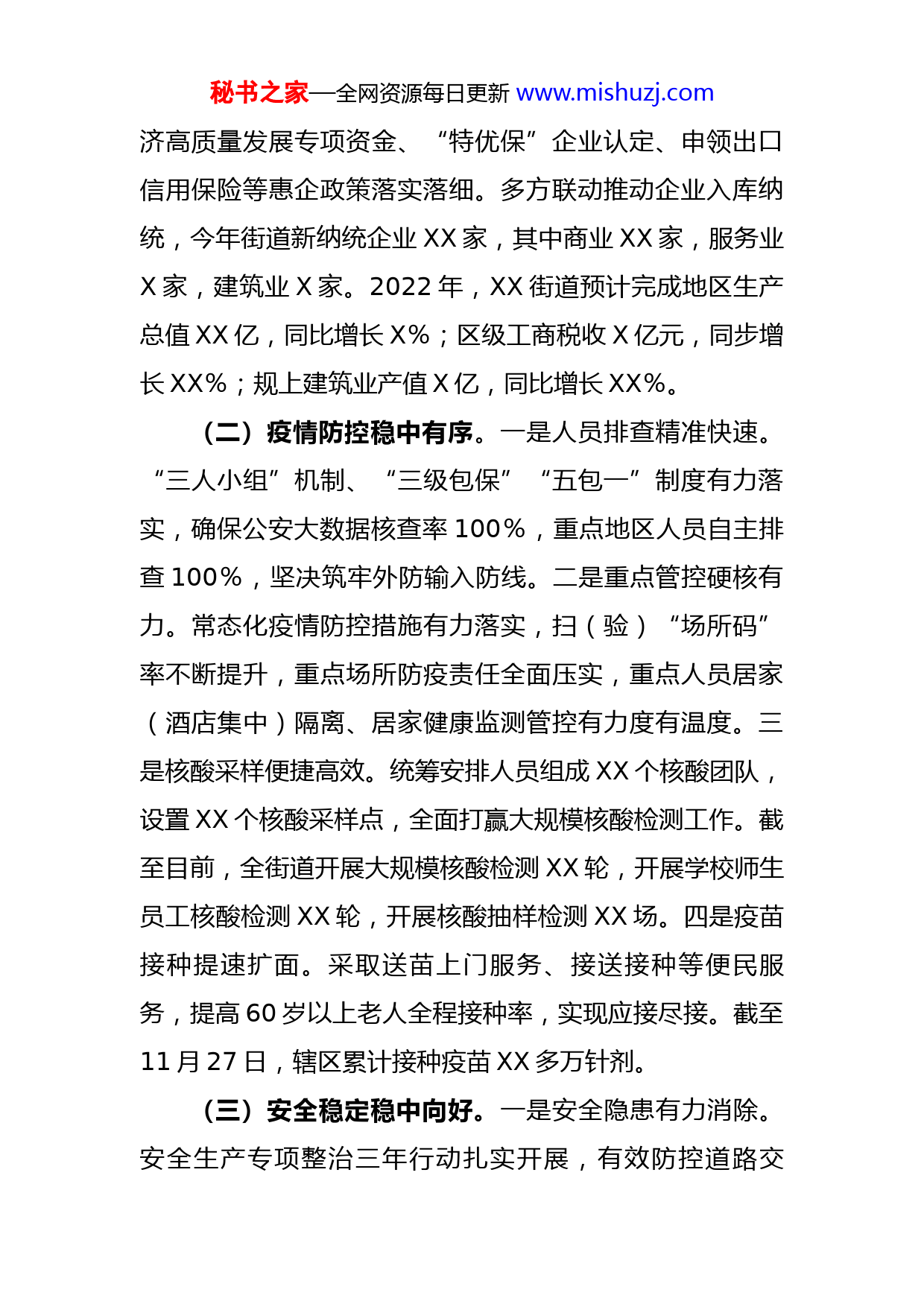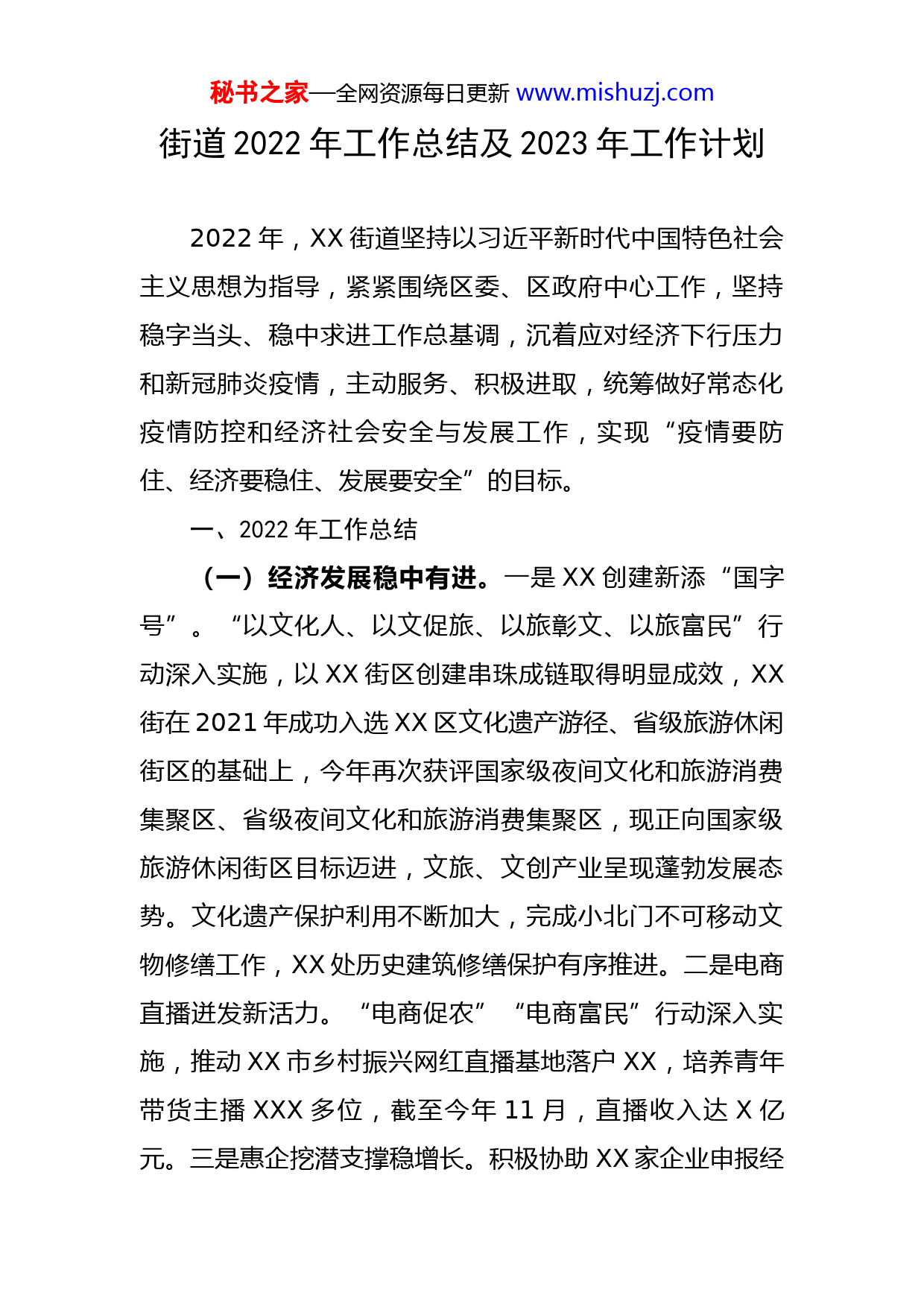 秘书之家—全网资源每日更新www.mishuzj.com街道2022年工作总结及2023年工作计划2022年,XX街道坚持以习近平新时代中国特色社会主义思想为指导,紧紧围绕区委、区政府中心工作,坚持稳字当头、稳中求进工作总基调,沉着应对经济下行压力和新冠肺炎疫情,主动服务、积极进取,统筹做好常态化疫情防控和经济社会安全与发展工作,实现“疫情要防住、经济要稳住、发展要安全”的目标。一、2022年工作总结(一)经济发展稳中有进。一是XX创建新添“国字号”。“以文化人、以文促旅、以旅彰文、以旅富民”行动深入实施,以XX街区创建串珠成链取得明显成效,XX街在2021年成功入选XX区文化遗产游径、省级旅游休闲街区的基础上,今年再次获评国家级夜间文化和旅游消费集聚区、省级夜间文化和旅游消费集聚区,现正向国家级旅游休闲街区目标迈进,文旅、文创产业呈现蓬勃发展态势。文化遗产保护利用不断加大,完成小北门不可移动文物修缮工作,XX处历史建筑修缮保护有序推进。二是电商直播迸发新活力。“电商促农”“电商富民”行动深入实施,推动XX市乡村振兴网红直播基地落户XX,培养青年带货主播XXX多位,截至今年11月,直播收入达X亿元。三是惠企挖潜支撑稳增长。积极协助XX家企业申报经秘书之家—全网资源每日更新www.mishuzj.com济高质量发展专项资金、“特优保”企业认定、申领出口信用保险等惠企政策落实落细。多方联动推动企业入库纳统,今年街道新纳统企业XX家,其中商业XX家,服务业X家,建筑业X家。2022年,XX街道预计完成地区生产总值XX亿,同比增长X%;区级工商税收X亿元,同步增长XX%;规上建筑业产值X亿,同比增长XX%。(二)疫情防控稳中有序。一是人员排查精准快速。“三人小组”机制、“三级包保”“五包一”制度有力落实,确保公安大数据核查率100%,重点地区人员自主排查100%,坚决筑牢外防输入防线。二是重点管控硬核有力。常态化疫情防控措施有力落实,扫(验)“场所码”率不断提升,重点场所防疫责任全面压实,重点人员居家(酒店集中)隔离、居家健康监测管控有力度有温度。三是核酸采样便捷高效。统筹安排人员组成XX个核酸团队,设置XX个核酸采样点,全面打赢大规模核酸检测工作。截至目前,全街道开展大规模核酸检测XX轮,开展学校师生员工核酸检测XX轮,开展核酸抽样检测XX场。四是疫苗接种提速扩面。采取送苗上门服务、接送接种等便民服务,提高60岁以上老人全程接种率,实现应接尽接。截至11月27日,辖区累计接种疫苗XX多万针剂。(三)安全稳定稳中向好。一是安全隐患有力消除。安全生产专项整治三年行动扎实开展,有效防控道路交秘书之家—全网资源每日更新www.mishuzj.com通、危险化学品、燃气安全等重点行业领域安全风险,截至11月底,检查各类场所XXXX多家次,消除安全隐患XXX多处,建设电动自行车智能充电点XXX个,完成“封墙破窗”工程XX处,改造困难群众老旧线路XXX处。XXX社区获评“2021年省交通安全文明示范社区”称号。食品药品安全专项整治、校园周边“三无”食品专项整治、病媒生物防控专项整治、健康教育和健康促进专项工作、爱国卫生运动扎实推进,维护了辖区食品与卫生健康安全。二是专项整治卓有成效。自建房安全专项整治扎实推进,排查自建房XXXX栋,如期完成存在安全隐患经营性自建房整治XX栋。易涝点、排水排涝设施排查整治,住宅、楼宇用电安全隐患排查治理深入开展,及时消除了各类安全隐患。停车秩序整治扎实推进,从疏导、管控、整治、宣传等多管齐下,有力改变违停乱象,推动文明停车逐渐养成,为惠城区破解老旧片区“停车难”“停车乱”难题提供了思路与参考。“南方+”惠城发布专题报道了这一系列治理的好做法、好经验。三是社会大局和谐稳定。社会矛盾大化解专项行动深入开展,成功化解重点矛盾纠纷XX多宗,稳控重点人员XX多人;妥善处理群众来信来访XXXX件次,案件化解率达XX%。禁毒“雷霆宣教”深入开展,开展禁毒知识“进万家”宣传活动XXX场、发放禁毒宣传品XXXXX多份。突出治安问题排查整秘书之家—全网资源每日更新www.mishuzj.com治、“平安细胞”创建、反邪教工作、法治宣传教育、政法队伍教育整顿、打击整治养老诈骗专项行动扎实推进,维护了社会和谐稳定。(四)民生福祉稳中提质。一是公共服务效能提升。社保、民政、老龄、残疾人等各项公共服务实现“一窗通办”,取消社区各种“奇葩”证明、循环证明、重复证明事项XX项。拥军优属工作扎实推进,开展集中预约办理、上门入户办理优待证服务。二是幸福养老触手可及。长者照护之家示范项目顺利建成运营,XXXX长者饭堂助餐补贴深受社区长者欢迎和好评,“双百工程”社工站(点)不断拓展延伸,“三社联动”服务实现全覆盖。三是群团组织活力增强。成立全市首个社区基金,开创了XX市社区慈善工作创新建设的先河。工青妇在扶危济困、维护权益、维护稳定、志愿服务等方面发挥积极重要的作用,建成了一批惠民驿站、青春社区志愿服务站、妇女儿童之家等志愿服务阵地,XXX村、XXX社区团支部分别荣获获得2021-2022年度省级和区级五四红旗团支部,XX市首个青春社区志愿服务站示范站落户XX街区。四是人居环境品质提升。XXX个老旧小区微改造有序推进,维护整治内街小巷、排水排污设施XX宗。生活垃圾分类工作深入人