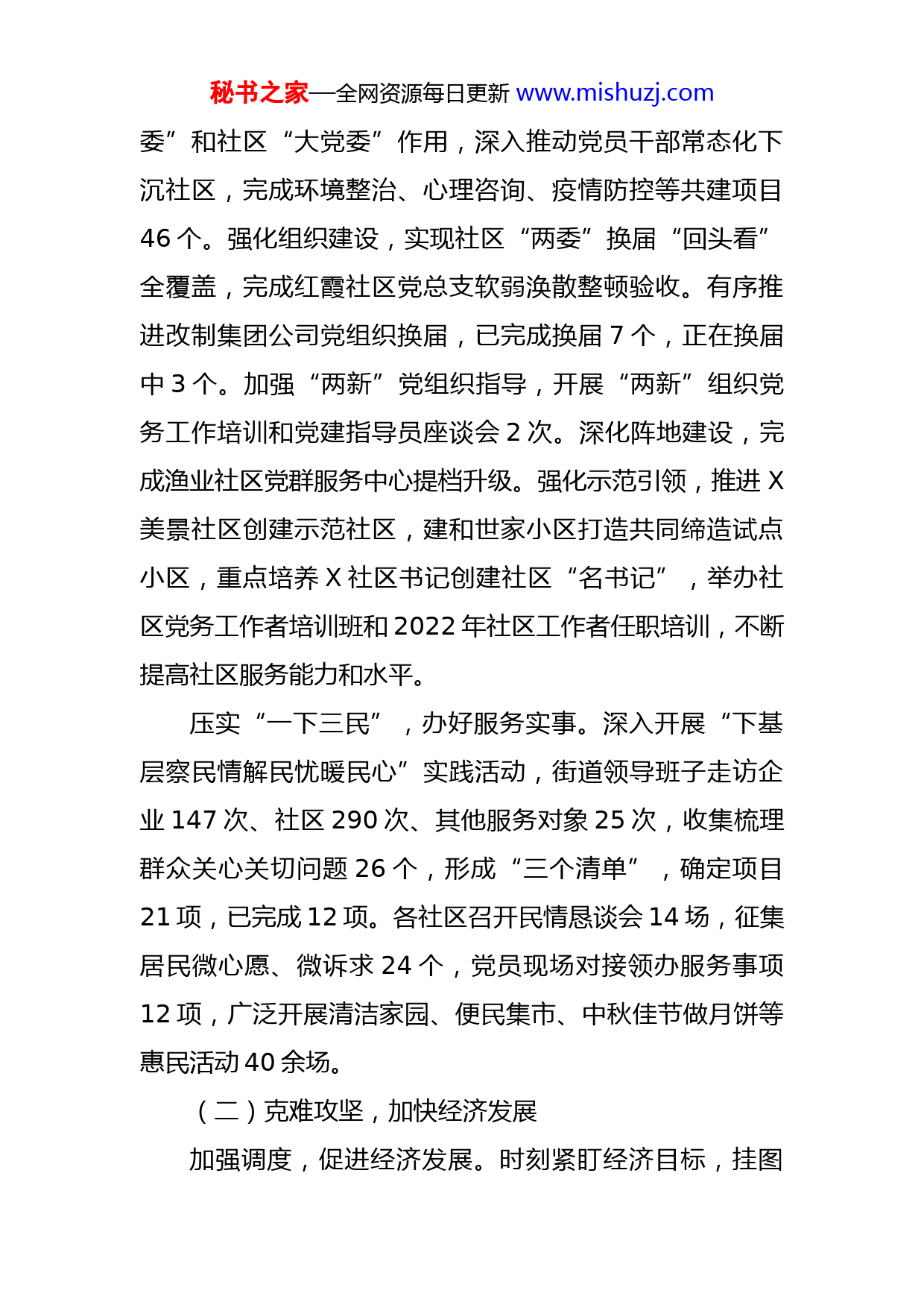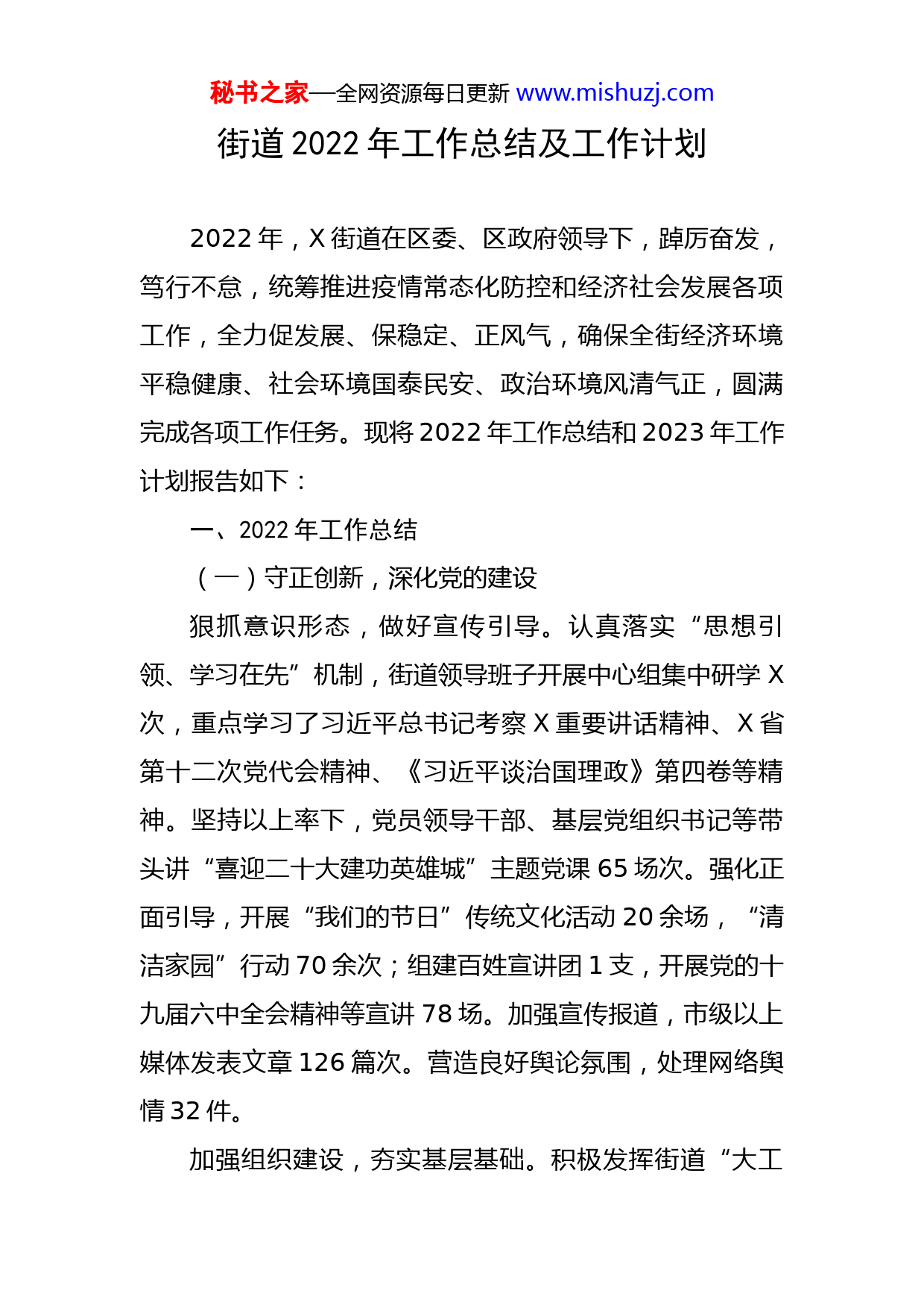 秘书之家—全网资源每日更新www.mishuzj.com街道2022年工作总结及工作计划2022年,X街道在区委、区政府领导下,踔厉奋发,笃行不怠,统筹推进疫情常态化防控和经济社会发展各项工作,全力促发展、保稳定、正风气,确保全街经济环境平稳健康、社会环境国泰民安、政治环境风清气正,圆满完成各项工作任务。现将2022年工作总结和2023年工作计划报告如下:一、2022年工作总结(一)守正创新,深化党的建设狠抓意识形态,做好宣传引导。认真落实“思想引领、学习在先”机制,街道领导班子开展中心组集中研学X次,重点学习了习近平总书记考察X重要讲话精神、X省第十二次党代会精神、《习近平谈治国理政》第四卷等精神。坚持以上率下,党员领导干部、基层党组织书记等带头讲“喜迎二十大建功英雄城”主题党课65场次。强化正面引导,开展“我们的节日”传统文化活动20余场,“清洁家园”行动70余次;组建百姓宣讲团1支,开展党的十九届六中全会精神等宣讲78场。加强宣传报道,市级以上媒体发表文章126篇次。营造良好舆论氛围,处理网络舆情32件。加强组织建设,夯实基层基础。积极发挥街道“大工秘书之家—全网资源每日更新www.mishuzj.com委”和社区“大党委”作用,深入推动党员干部常态化下沉社区,完成环境整治、心理咨询、疫情防控等共建项目46个。强化组织建设,实现社区“两委”换届“回头看”全覆盖,完成红霞社区党总支软弱涣散整顿验收。有序推进改制集团公司党组织换届,已完成换届7个,正在换届中3个。加强“两新”党组织指导,开展“两新”组织党务工作培训和党建指导员座谈会2次。深化阵地建设,完成渔业社区党群服务中心提档升级。强化示范引领,推进X美景社区创建示范社区,建和世家小区打造共同缔造试点小区,重点培养X社区书记创建社区“名书记”,举办社区党务工作者培训班和2022年社区工作者任职培训,不断提高社区服务能力和水平。压实“一下三民”,办好服务实事。深入开展“下基层察民情解民忧暖民心”实践活动,街道领导班子走访企业147次、社区290次、其他服务对象25次,收集梳理群众关心关切问题26个,形成“三个清单”,确定项目21项,已完成12项。各社区召开民情恳谈会14场,征集居民微心愿、微诉求24个,党员现场对接领办服务事项12项,广泛开展清洁家园、便民集市、中秋佳节做月饼等惠民活动40余场。(二)克难攻坚,加快经济发展加强调度,促进经济发展。时刻紧盯经济目标,挂图秘书之家—全网资源每日更新www.mishuzj.com作战,做到“应统尽统,颗粒归仓”。加强服务,优化营商环境。制定《X区关于加快X都市工业园高质量发展的若干措施》,优化《X市X区X都市工业园招商项目入园流程》,完成工业园水土保持、地质灾害危险性等六个专题区域性评价评估工作,提高项目入园审批效率,促进招商引资工作科学化、制度化、规范化。实行班子成员包保联系企业制度,建立班子成员联系重点项目、重点企业工作机制,班子成员人均联系7-8家重点企业,每月开展实地走访调研,及时协调解决江苏吴中项目分期验收、东湖高新科创中心项目分期建设、楚安项目和万科理想城市项目开设道口等问题。加强惠企政策宣传,制发《X街企业服务指导手册》1000余份。举办银企对接座谈会,协助23家企业融资贷款3亿余元。搭建线上招聘平台,为十多家企业解决招工困难。加强财源建设,促进55家企业将税收关系迁入我街。做好保交楼工作,对绿地大都会和长江美好首玺2个房地产项目进行资金监管。(三)精细管理,优化城市环境加强城市管理。积极开展乱牵乱挂、乱搭乱建、乱堆乱放、乱涂乱画行为集中整治,整治违法占道5637起、清理乱堆乱放4921处,规整共享单车9607辆,拆除广告立面379处。大力开展X农副产品大市场周边环境综合整治秘书之家—全网资源每日更新www.mishuzj.com工作,组织突击整治80余次,清理各类垃圾约100吨。做好城建保障。加快推动2项市级重点工程征地征收,目前,完善城市基础设施建设,新增充电桩X个,新增停车泊位4088个,在建和世家建成集中式充电站1个,超额完成年度任务。加强市政设施维护管理,组织维修道路680余处,约X㎡,处置破损井盖230余处,整治架空管线92处,约19280余米。优化生态环境。认真落实河湖长制、林长制,铲除沿岸菜地面积约800㎡,拆除棚子1个约15㎡,拆除野湖简易厕所1处、拆除长江历史遗留建筑1处。开展长江流域重点水域禁捕退捕日常巡查工作,出动巡查人员约1830余人次,出动车辆820余台次,发放禁捕宣传资料1200余份,设置宣传标牌23块,劝阻不规范垂钓人员9200余人次,缴获非法钓具60根,清除地笼、丝网100余个,清理暴露垃圾约82吨。加强大气污染防治,处理工地扬尘案件17件,罚款25150元。针对东澜岸53栋油烟扰民问题,对5家餐饮门店组织第三方进行油烟排放检测,并采取更换油烟净化设备、迁改烟道、改变油烟排放方式等措施,确保油烟排放达标。(四)人民至上,强化服务保障积极推进社会保障。加强社区建设,配齐配强社区干事,申报成立江悦府社区和美好新城社区。加强社会救秘书之家—全网资源每日更新www.mishuzj.com济,及时发放特困人员、事实无人抚养儿童、城市低保户等困难人员生活补贴,临时救助43人,新增残疾人证4人,发放独生子女保健费781户,慰问特殊计生家庭39户。深化老年人服务,办理老年证683人,实