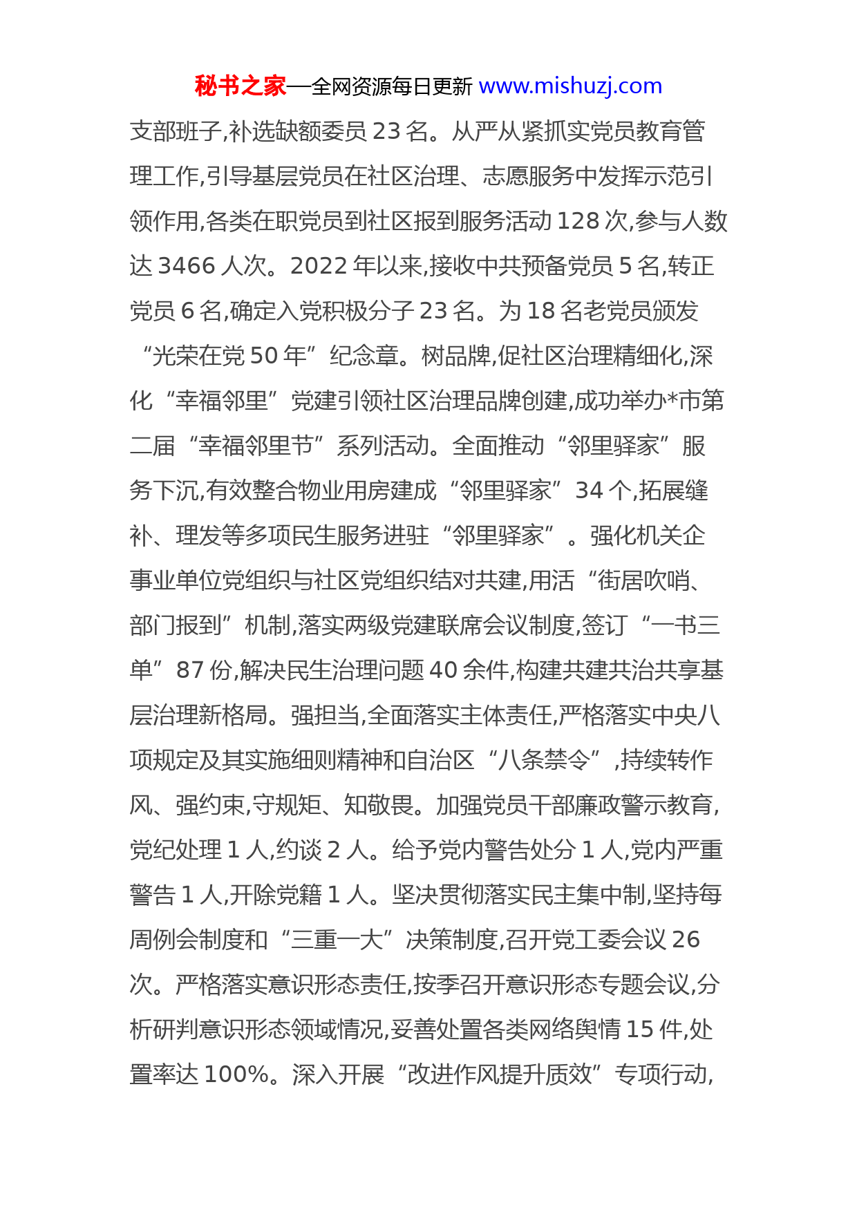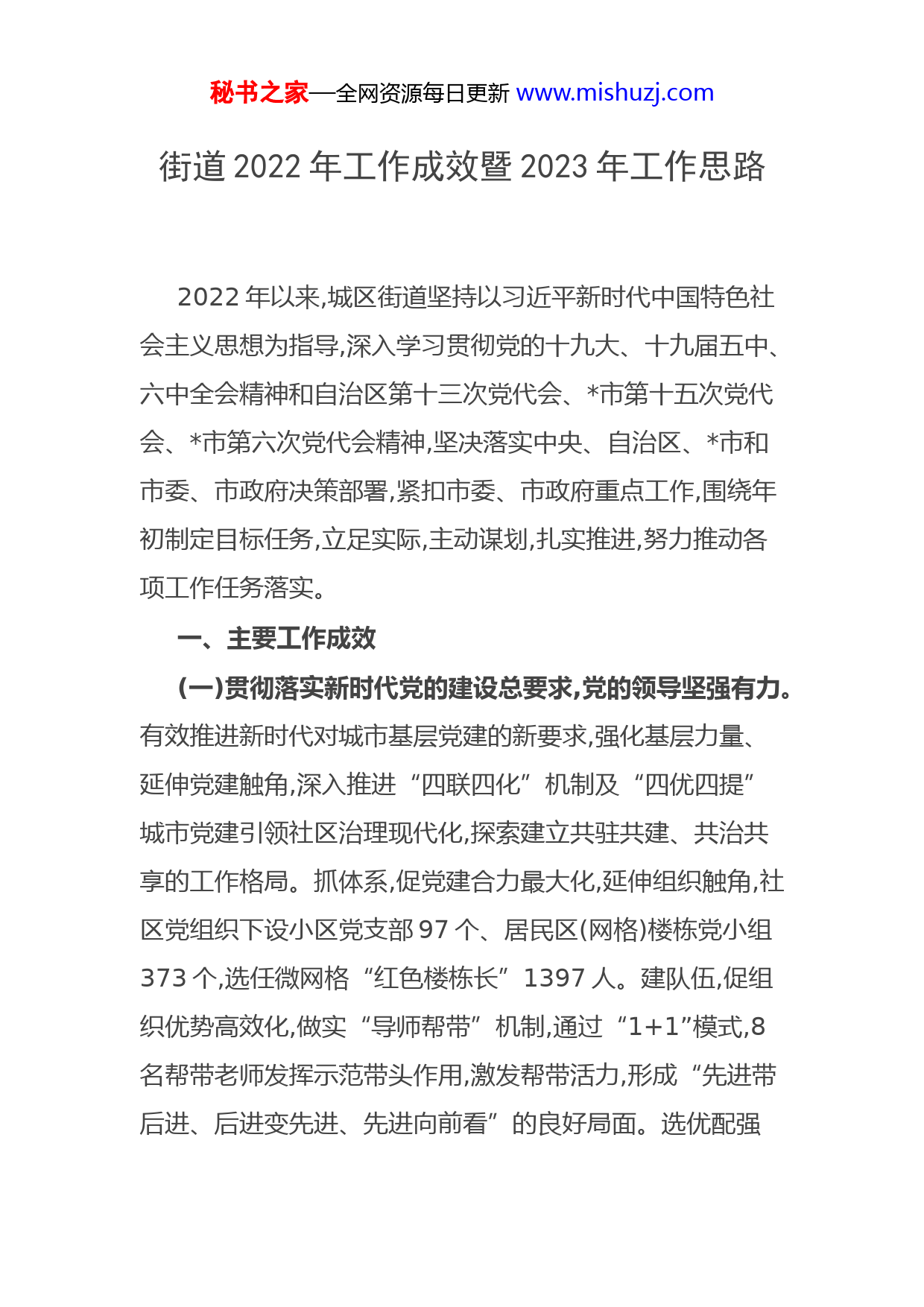 秘书之家—全网资源每日更新www.mishuzj.com街道2022年工作成效暨2023年工作思路2022年以来,城区街道坚持以习近平新时代中国特色社会主义思想为指导,深入学习贯彻党的十九大、十九届五中、六中全会精神和自治区第十三次党代会、市第十五次党代会、市第六次党代会精神,坚决落实中央、自治区、市和市委、市政府决策部署,紧扣市委、市政府重点工作,围绕年初制定目标任务,立足实际,主动谋划,扎实推进,努力推动各项工作任务落实。一、主要工作成效(一)贯彻落实新时代党的建设总要求,党的领导坚强有力。有效推进新时代对城市基层党建的新要求,强化基层力量、延伸党建触角,深入推进“四联四化”机制及“四优四提”城市党建引领社区治理现代化,探索建立共驻共建、共治共享的工作格局。抓体系,促党建合力最大化,延伸组织触角,社区党组织下设小区党支部97个、居民区(网格)楼栋党小组373个,选任微网格“红色楼栋长”1397人。建队伍,促组织优势高效化,做实“导师帮带”机制,通过“1+1”模式,8名帮带老师发挥示范带头作用,激发帮带活力,形成“先进带后进、后进变先进、先进向前看”的良好局面。选优配强秘书之家—全网资源每日更新www.mishuzj.com支部班子,补选缺额委员23名。从严从紧抓实党员教育管理工作,引导基层党员在社区治理、志愿服务中发挥示范引领作用,各类在职党员到社区报到服务活动128次,参与人数达3466人次。2022年以来,接收中共预备党员5名,转正党员6名,确定入党积极分子23名。为18名老党员颁发“光荣在党50年”纪念章。树品牌,促社区治理精细化,深化“幸福邻里”党建引领社区治理品牌创建,成功举办市第二届“幸福邻里节”系列活动。全面推动“邻里驿家”服务下沉,有效整合物业用房建成“邻里驿家”34个,拓展缝补、理发等多项民生服务进驻“邻里驿家”。强化机关企事业单位党组织与社区党组织结对共建,用活“街居吹哨、部门报到”机制,落实两级党建联席会议制度,签订“一书三单”87份,解决民生治理问题40余件,构建共建共治共享基层治理新格局。强担当,全面落实主体责任,严格落实中央八项规定及其实施细则精神和自治区“八条禁令”,持续转作风、强约束,守规矩、知敬畏。加强党员干部廉政警示教育,党纪处理1人,约谈2人。给予党内警告处分1人,党内严重警告1人,开除党籍1人。坚决贯彻落实民主集中制,坚持每周例会制度和“三重一大”决策制度,召开党工委会议26次。严格落实意识形态责任,按季召开意识形态专题会议,分析研判意识形态领域情况,妥善处置各类网络舆情15件,处置率达100%。深入开展“改进作风提升质效”专项行动,秘书之家—全网资源每日更新www.mishuzj.com强化“严细深实勤俭廉+快”的工作作风,整改问题62个。扎实开展违规收送红包礼金和不当收益及违规借转贷或高额放贷专项整治活动,大力培育干部清正、政府清廉、社会清朗的政治生态和发展环境。(二)牢固树立以人民为中心的发展思想,民生福祉向善向好。移民致富增收得到新提升,紧盯产业、就业、社会融入三件大事,实施“七个一批”推进就业,借力镇河塔市场、就业帮扶车间等产业平台引擎,镇河塔、西湖社区移民就业率达87.6%。以“城南工人”建筑劳务、“红石榴”家政公司、西湖社区劳务服务站为载体,带动就业91人次,移民自我的发展能力明显增强。成立全市首家村(社区)一级供销合作社,59名社员中42户成功申请小额贴息贷款,完成奶牛托管84头,每户年增收5000元。及时兑付乡村振兴“健康保”、就业补贴、务工补贴、劳务输出奖励、创业贷款等奖补政策,让困难群众享受发展成果。民生保障得到全面落实,持续释放民政救助政策红利,全面核查低保户信息,实现低保动态管理。现有低保户435户661人,接受临时救助申请47人,发放临时救助金8.8万元。保障残疾人合法权益,残疾人两项补贴动态管理,发放残疾人两项补贴14287人次,累计发放金额211.81万元。办理独生子女证、一孩、二孩、三孩生育服务清单593余件。核查申请公共租赁住房126秘书之家—全网资源每日更新www.mishuzj.com户。基本公共服务全面提升,落实社保补贴扶持政策,受理社保补贴700人次、审核公益性岗位人员145人。推进农村劳动力转移就业,转移就业累计人数为2782人,“零就业家庭”实现动态消零。加强劳动监察,解决劳动纠纷51起,涉及劳动者52人,为劳动者追讨拖欠工资款12.3万元。举办网络直播、中级电工、中级焊工、中级保育师等不同类别培训班21期846人次。新增备案类社区社会组织10家,指导“红领巾志愿者协会”“长青艺术团”等社会组织申报和开展公益创投项目。(三)持续优化人居环境整治各项措施,城市品质显著提升。以创建全国文明城市为抓手,实施城区绿化和城区人居环境提升行动,春季补植树木23.9万株,完成民生佳苑和枣园雅居小区路面硬化、围栏、座椅、路灯安装、车棚修建改造工程,老旧小区基础设施有效改善。深入开展爱国卫生运动专项整治和执法巡查活动,清理乱点4300余处、拆除违建337平方米,小区环境持续好转。垃圾分类有效推进,回收资源垃圾近16吨,生活垃圾分类积分达621万份。深入开展安全生产整治三年专项行动,全面排查整治自建房、飞线充电、占用消防通道等安全隐患,排查存在安全隐患自建房21户,下发告知书23