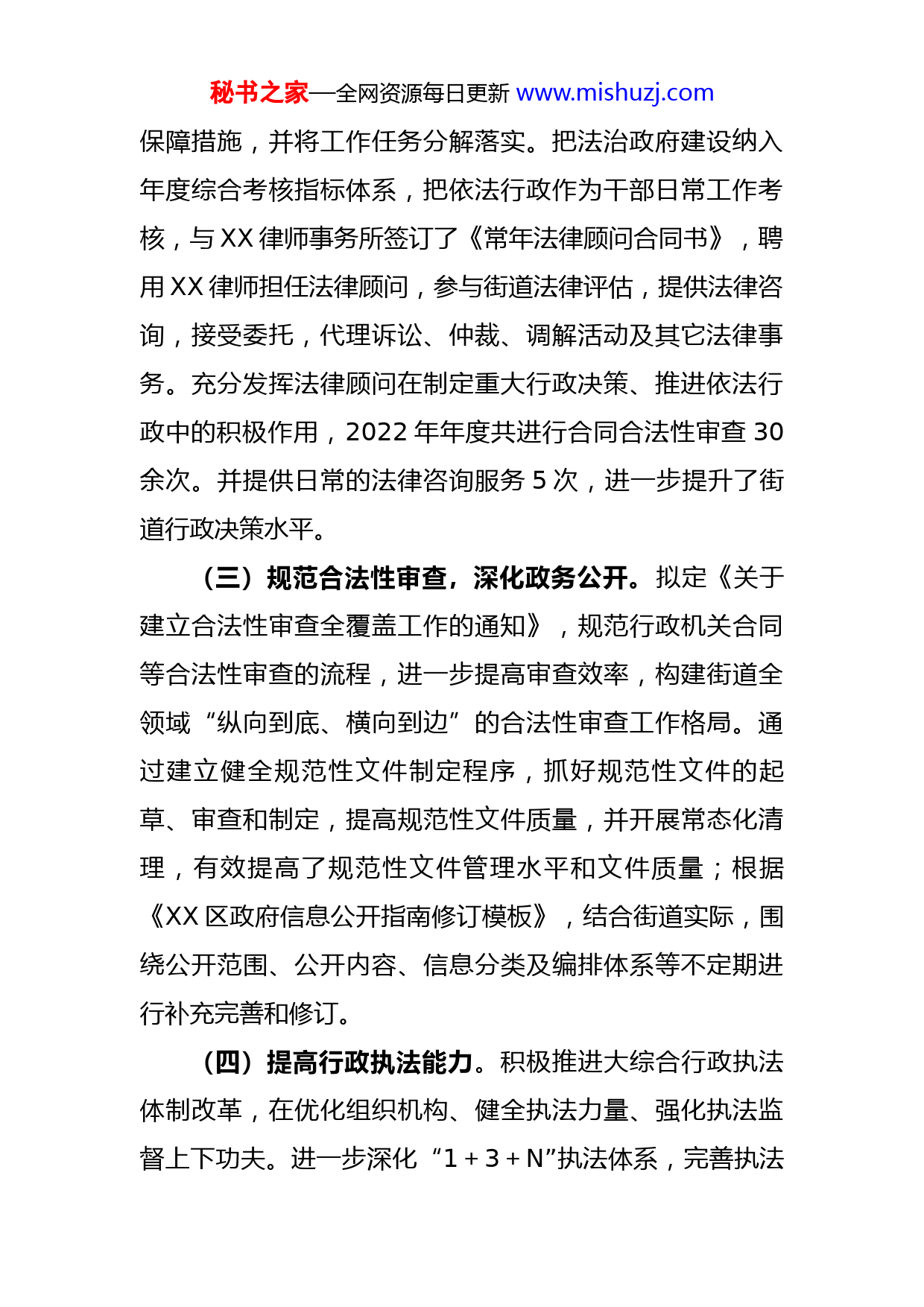 秘书之家—全网资源每日更新www.mishuzj.com街道2022年年度法治政府建设工作总结今年以来,XX街道坚持以习近平新时代中国特色社会主义思想为指导,深入学习贯彻党的XX大精神及习近平总书记全面依法治国新理念新思想新战略,坚定不移贯彻落实全面依法治国基本方略,统筹推进依法执政和依法行政,有力促进了经济社会的全面发展。现将有关事项报告如下:一、主要工作及成效(一)不断加强对法治政府建设的组织领导。全面落实中央关于法治建设决策部署和省、市、区委关于法治建设的工作要求,明确党政主要负责人为全面依法治县及法治政府建设的第一责任人,成立专门议事协调机构,召开专题会议,研究安排法治政府建设、行政执法监督、法治宣传等方面工作。严格执行法治建设情况报告制度,加强层级检查和社会监督。不断加大法治政府建设的统筹协调力度,努力发挥法治建设牵引突破作用。大力推进依法执政,逐步形成了党委统一领导,人大、政府、政协各负其责,部门协同推进,人民群众广泛参与的法治政府建设工作格局。(二)提升依法行政和科学决策水平。将法治政府建设列入年度党委和政府工作报告,明确各单位工作任务和秘书之家—全网资源每日更新www.mishuzj.com保障措施,并将工作任务分解落实。把法治政府建设纳入年度综合考核指标体系,把依法行政作为干部日常工作考核,与XX律师事务所签订了《常年法律顾问合同书》,聘用XX律师担任法律顾问,参与街道法律评估,提供法律咨询,接受委托,代理诉讼、仲裁、调解活动及其它法律事务。充分发挥法律顾问在制定重大行政决策、推进依法行政中的积极作用,2022年年度共进行合同合法性审查30余次。并提供日常的法律咨询服务5次,进一步提升了街道行政决策水平。(三)规范合法性审查,深化政务公开。拟定《关于建立合法性审查全覆盖工作的通知》,规范行政机关合同等合法性审查的流程,进一步提高审查效率,构建街道全领域“纵向到底、横向到边”的合法性审查工作格局。通过建立健全规范性文件制定程序,抓好规范性文件的起草、审查和制定,提高规范性文件质量,并开展常态化清理,有效提高了规范性文件管理水平和文件质量;根据《XX区政府信息公开指南修订模板》,结合街道实际,围绕公开范围、公开内容、信息分类及编排体系等不定期进行补充完善和修订。(四)提高行政执法能力。积极推进大综合行政执法体制改革,在优化组织机构、健全执法力量、强化执法监督上下功夫。进一步深化“1+3+N”执法体系,完善执法秘书之家—全网资源每日更新www.mishuzj.com人员下沉融合办公机制。开展护航XX大除险保安、文明城市创建、常态化疫情防控等专项检查行动,累计发现问题161件,全部完成整改。(五)提升行政复议和行政应诉工作水平。深化行政复议体制改革、健全行政复议工作制度、提高行政复议运转效率,全年共立案受理行政复议1件、审结1件,行政复议办结率达100%。通过提升行政机关负责人出庭应诉率加强行政应诉工作,今年街道行政机关负责人出庭应诉率达100%,有力推动了全县行政应诉工作水平不断提升。(六)提高普法依法治理水平。充分利用国家宪法日、宪法宣传周和法治宣传教育月等时间节点,深入开展宪法学习宣传教育。普法宣传“线上线下”全面发力,群众法治观念日益增强。利用三八妇女节、扫黑除恶、国家安全日、禁毒日、公民道德宣传日、法治扶贫日等组织开展专题活动,宣传宪法、民法总则、刑法、反家暴法、劳动合同法、法律援助条例等常用法律法规。发放《宪法》宣传折页250余册、《民法典》宣传折页350余册、《法律十问十答》宣传折页200余册、《中华人民共和国未成年人保护法》宣传折页120余册、《中华人民共和国劳动法》宣传折页100余册等。二、存在的不足秘书之家—全网资源每日更新www.mishuzj.com今年以来,在上级部门的正确领导下,我街道法治政府建设工作取得了一定的成绩,但也存在着一些问题和不足,主要表现在:法治政府建设工作还存在工作落实、推进和成效不平衡,工作制度机制有待完善;行政执法部门在行政处罚等执法工作中存在细节上的纰漏;行政执法监督信息不对称,不能有效第一时间介入,行政执法工作监督难度较大;一些具体工作完成后没有及时在网上公开发布,行政执法能力和水平尚有不足。三、下步工作打算一是持续深化法治政府建设,严格遵守宪法法律,把政府工作全面纳入法治轨道。健全重大行政决策公众参与、专家论证、风险评估、合法性审查制度,做到依法科学民主决策。自觉接受人大法律和工作监督、政协民主监督、纪检监察监督和社会舆论监督,做到依法秉公用权。健全督查督办机制,提高人大代表建议和政协提案办理质量。二是畅通社情民意诉求渠道,加强行政复议应诉能力建设。深入推进政务公开和政府信息公开,让行政权力在法治轨道上公开透明运行。三是加强执法队伍管理,严格实行持证上岗和资格管理制度,健全纪律约束机制,狠抓执法纪律和职业道德教育,定期组织执法人员参加法律法规知识、执法技能等各秘书之家—全网资源每日更新www.mishuzj.com类培训,提高其解决执法中突出矛盾和问题的能力。四是推行行政执法责任制和执法过错责任追究制,解决执法不公、执法不严等问题,为推动经济社会发