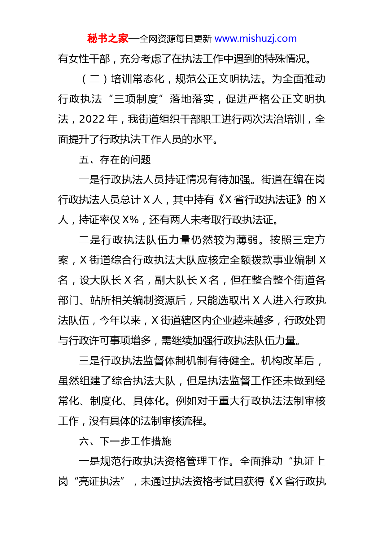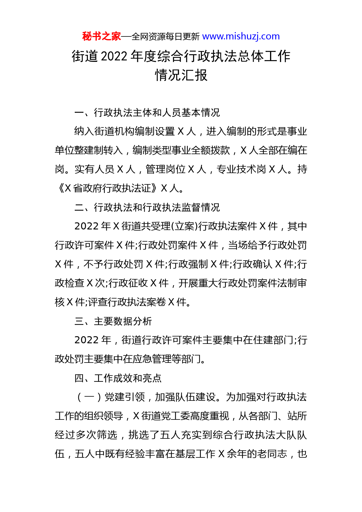 秘书之家—全网资源每日更新www.mishuzj.com街道2022年度综合行政执法总体工作情况汇报一、行政执法主体和人员基本情况纳入街道机构编制设置X人,进入编制的形式是事业单位整建制转入,编制类型事业全额拨款,X人全部在编在岗。实有人员X人,管理岗位X人,专业技术岗X人。持《X省政府行政执法证》X人。二、行政执法和行政执法监督情况2022年X街道共受理(立案)行政执法案件X件,其中行政许可案件X件;行政处罚案件X件,当场给予行政处罚X件,不予行政处罚X件;行政强制X件;行政确认X件;行政检查X次;行政征收X件,开展重大行政处罚案件法制审核X件;评查行政执法案卷X件。三、主要数据分析2022年,街道行政许可案件主要集中在住建部门;行政处罚主要集中在应急管理等部门。四、工作成效和亮点(一)党建引领,加强队伍建设。为加强对行政执法工作的组织领导,X街道党工委高度重视,从各部门、站所经过多次筛选,挑选了五人充实到综合行政执法大队队伍,五人中既有经验丰富在基层工作X余年的老同志,也秘书之家—全网资源每日更新www.mishuzj.com有女性干部,充分考虑了在执法工作中遇到的特殊情况。(二)培训常态化,规范公正文明执法。为全面推动行政执法“三项制度”落地落实,促进严格公正文明执法,2022年,我街道组织干部职工进行两次法治培训,全面提升了行政执法工作人员的水平。五、存在的问题一是行政执法人员持证情况有待加强。街道在编在岗行政执法人员总计X人,其中持有《X省行政执法证》的X人,持证率仅X%,还有两人未考取行政执法证。二是行政执法队伍力量仍然较为薄弱。按照三定方案,X街道综合行政执法大队应核定全额拨款事业编制X名,设大队长X名,副大队长X名,但在整合整个街道各部门、站所相关编制资源后,只能选取出X人进入行政执法队伍,今年以来,X街道辖区内企业越来越多,行政处罚与行政许可事项增多,需继续加强行政执法队伍力量。三是行政执法监督体制机制有待健全。机构改革后,虽然组建了综合执法大队,但是执法监督工作还未做到经常化、制度化、具体化。例如对于重大行政执法法制审核工作,没有具体的法制审核流程。六、下一步工作措施一是规范行政执法资格管理工作。全面推动“执证上岗“亮证执法”,未通过执法资格考试且获得《X省行政执秘书之家—全网资源每日更新www.mishuzj.com法证》,不得从事执法活动。落实省司法厅新一轮行政执法人员换证工作,广泛发动在编在岗人员参加2022年全省行政执法人员通用法律知识网络考试,至少行政执法大队人员每人要拥有行政执法资格证。二是稳步提高行政执法人员能力。牢牢把握政治、业务、责任、纪律、作风“五过硬”要求,坚持“正规化、专业化、职业化”方向,加强行政执法人员学法用法能力建设工作,对街道行政执法人员进行行政执法“三项制度”培训,建设一支信念坚定、执法为民、敢于担当、清正廉洁的行政执法队伍。三是持续强化行政执法监督工作。落实行政执法责任制,实施依法、科学和民主决策﹐以重大行政执法决定法制审核、行政执法案卷评查等工作为抓手,进一步强化监督,让制度落地落实。