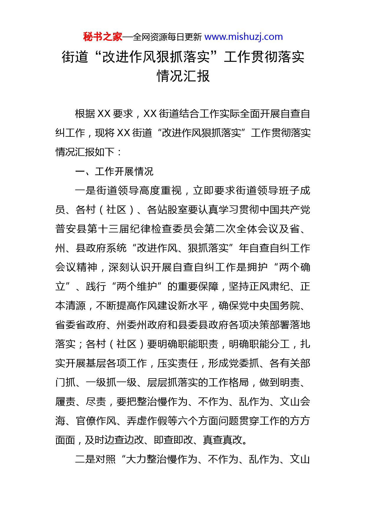 秘书之家—全网资源每日更新www.mishuzj.com街道“改进作风狠抓落实”工作贯彻落实情况汇报根据XX要求,XX街道结合工作实际全面开展自查自纠工作,现将XX街道“改进作风狠抓落实”工作贯彻落实情况汇报如下:一、工作开展情况一是街道领导高度重视,立即要求街道领导班子成员、各村(社区)、各站股室要认真学习贯彻中国共产党普安县第十三届纪律检查委员会第二次全体会议及省、州、县政府系统“改进作风、狠抓落实”年自查自纠工作会议精神,深刻认识开展自查自纠工作是拥护“两个确立”、践行“两个维护”的重要保障,坚持正风肃纪、正本清源,不断提高作风建设新水平,确保党中央国务院、省委省政府、州委州政府和县委县政府各项决策部署落地落实;各村(社区)要明确职能职责,明确职能分工,扎实开展基层各项工作,压实责任,形成党委抓、各有关部门抓、一级抓一级、层层抓落实的工作格局,做到明责、履责、尽责,要把整治慢作为、不作为、乱作为、文山会海、官僚作风、弄虚作假等六个方面问题贯穿工作的方方面面,及时边查边改、即查即改、真查真改。二是对照“大力整治慢作为、不作为、乱作为、文山秘书之家—全网资源每日更新www.mishuzj.com会海、官僚作风、弄虚作假”六个方面要求,紧密联系实际,迅速开展自查自纠工作,严格按照中央、省、州、县的有关规定,坚持问题导向和目标导向,对查摆出的问题进行梳理分类,对标对表开展“改进作风、狠抓落实”年自查自纠和“六个大力整治”要求,结合职能职责,深入推进“改进作风、狠抓落实”年自查自纠全覆盖,对照“六个大力整治”自查,并上交自查台账。同时要紧紧围绕查摆出来的问题,找准突破口、找准方法路径,切实加以整改,坚决不走过场,杜绝弄虚作假,确保各项工作扎实推进。要持之以恒推进作风建设,把改革创新贯穿机关作风建设始终,建立制度作保障,确保广大干部作风持续转变、落实更加有力、服务明显提升;坚持不准光讲客观不讲主观,不准只查问题不追责任。做讲规矩、有纪律的合格干部,要始终把严明政治纪律和政治规矩摆在首要位置,牢固树立底线思维,强化责任落实,时时把纪律和规矩挺在前面,提高谋事干事成事的本领能力。二、自查自纠情况(一)慢作为方面。街道严格按照相关制度落实到人,责任到人,做到有令必行,有令必止,不折不扣抓好工作落实,全面推动各项工作上一个新的台阶。但存在部分干部工作激情减退,缺乏吃苦耐劳精神,工作不着急、不上心,该做的事拖、该办的事缓;办事拖沓、效率低秘书之家—全网资源每日更新www.mishuzj.com下,表面认真做事,实则“出工不出力”。有的股室室对工作上一些有难度,有压力的事缓办、拖办的现象还不同程度的存在;部分同志面对困难和矛盾,瞻前顾后,存在不求有功、但求无过的思想,工作被动应付,思路不宽、措施不力、办法不多,缺乏锲而不舍、一抓到底的韧劲和狠劲,导致工作推不动、文件难落实、效果无保障。(二)不作为方面。部分干部工作中存在在其位不谋其政,不执行会议纪律,存在迟到、旷会情况。有的干部自由散漫,抱着混日子的心态,遇到事情就“推”,遇到困难就“畏”,遇到责任就“躲”,因素全找遍了,从不反省自身原因。(三)乱作为方面。街道干部严格按照法律、法规和单位规章制度的规定履行职责,经认真梳理,我街道不存在乱作为问题。(四)文山会海方面。我街道对文件、会议情况进行自查自纠。整改治理了文件层层转发情况,需要转发到各村(社区)、站股室的才进行转发,其余未要求转发和制定相关文件或涉及不到相关部门的一律停止转发和印发,按照能简就简、能并就并、能停就停的原则,严格控制各类文件,减少和控制会议次数,经自查,我街道未发现文山文海的情况。(五)官僚作风方面。部分党员干部对工作不负责,秘书之家—全网资源每日更新www.mishuzj.com缺乏事业心和敬业精神。有的表面上作风好了,门也好进,话也好听,但就是擅长踢皮球,对群众急需解决的问题推来推去,打官腔应付;有的延误重大决策的落地生根,阻滞政令通达的渠道。(六)弄虚作假方面。我街道干部在工作中尽职尽责认真帮助每一位到街道办事的群众,绝不做表面文章,绝不欺上瞒下、弄虚作假。三、原因剖析(一)理想信念不坚定。心中想的是党的事业为先,人民利益至上,信奉的是马列主义,但落实在行动上却不自觉变成实用主义和功利主义,理念和实践产生脱节,使理想信念出现扭曲。(二)管理制度存在短板。责任与职权的不匹配和界限模糊不清,是滋生不作为、乱作为基层干部的土壤:基层干部责大但权小是一个长期以来的矛盾,职权不足、协调上级部门难度大,成为许多基层干部不作为的借口;责任界定的模糊不清,提供了基层干部乱作为的机会。(三)成长机制不完善。基层干部在执政的一线,应享有与工作内容相匹配的尊严和权威,但基层发展空间小、工资待遇低,工作任务纷繁复杂,部分基层干部工作消极,甚至信仰缺失,变得不作为或者乱作为,走向群众的对立面。秘书之家—全网资源每日更新www.mishuzj.com四、下步工作打算(一)开展形式多样的思想教育。用好各种特色教育平台、廉政教育基地,就理想信念、宗旨意识、廉政法规等继续开展多角度、大力度、深层次的宣传教育。提高思想干部思想认识