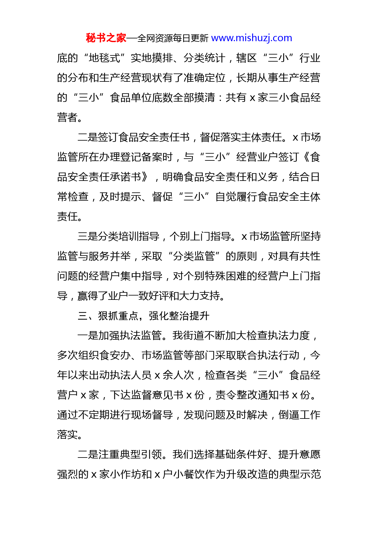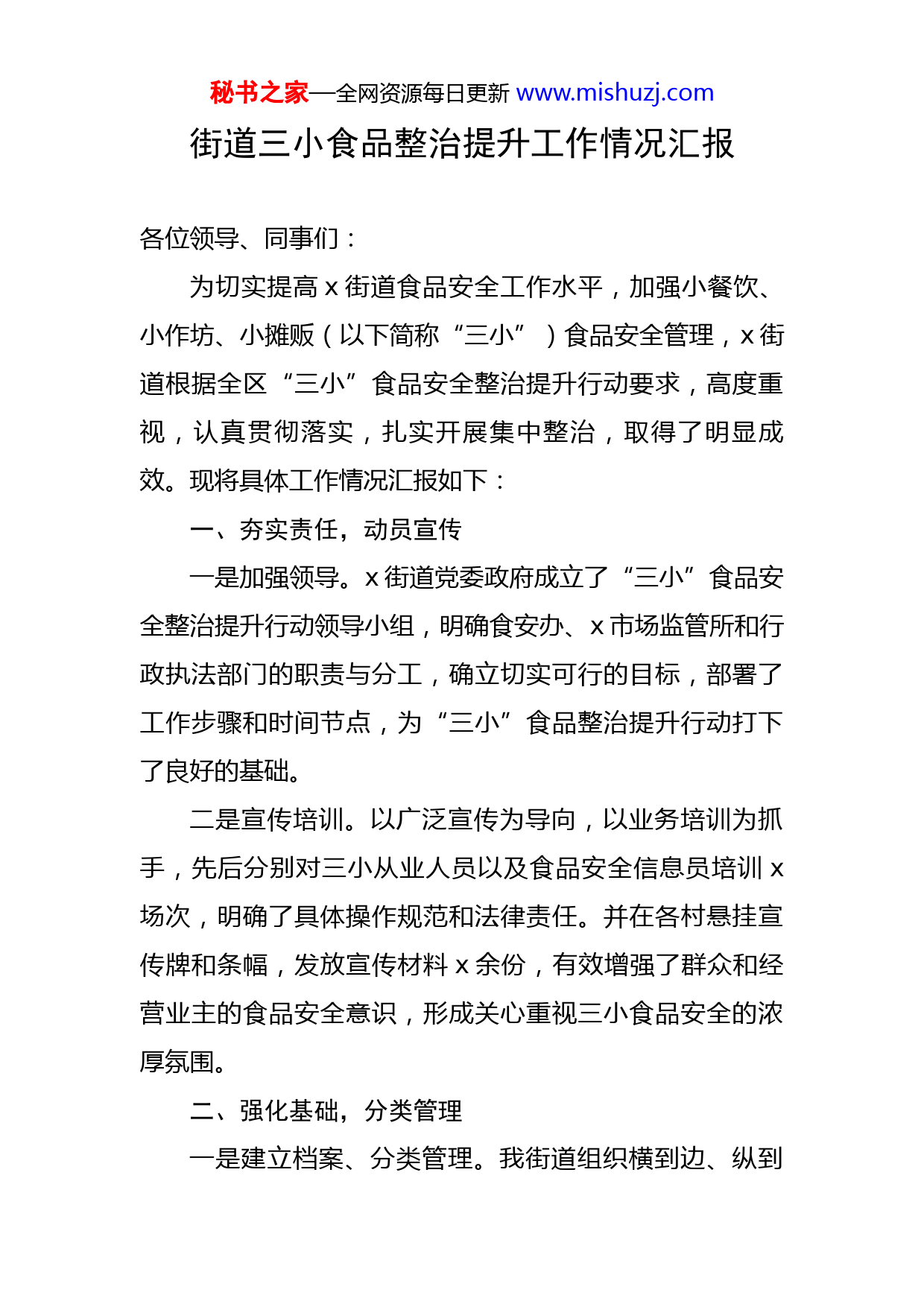 秘书之家—全网资源每日更新www.mishuzj.com街道三小食品整治提升工作情况汇报各位领导、同事们:为切实提高x街道食品安全工作水平,加强小餐饮、小作坊、小摊贩(以下简称“三小”)食品安全管理,x街道根据全区“三小”食品安全整治提升行动要求,高度重视,认真贯彻落实,扎实开展集中整治,取得了明显成效。现将具体工作情况汇报如下:一、夯实责任,动员宣传一是加强领导。x街道党委政府成立了“三小”食品安全整治提升行动领导小组,明确食安办、x市场监管所和行政执法部门的职责与分工,确立切实可行的目标,部署了工作步骤和时间节点,为“三小”食品整治提升行动打下了良好的基础。二是宣传培训。以广泛宣传为导向,以业务培训为抓手,先后分别对三小从业人员以及食品安全信息员培训x场次,明确了具体操作规范和法律责任。并在各村悬挂宣传牌和条幅,发放宣传材料x余份,有效增强了群众和经营业主的食品安全意识,形成关心重视三小食品安全的浓厚氛围。二、强化基础,分类管理一是建立档案、分类管理。我街道组织横到边、纵到秘书之家—全网资源每日更新www.mishuzj.com底的“地毯式”实地摸排、分类统计,辖区“三小”行业的分布和生产经营现状有了准确定位,长期从事生产经营的“三小”食品单位底数全部摸清:共有x家三小食品经营者。二是签订食品安全责任书,督促落实主体责任。x市场监管所在办理登记备案时,与“三小”经营业户签订《食品安全责任承诺书》,明确食品安全责任和义务,结合日常检查,及时提示、督促“三小”自觉履行食品安全主体责任。三是分类培训指导,个别上门指导。x市场监管所坚持监管与服务并举,采取“分类监管”的原则,对具有共性问题的经营户集中指导,对个别特殊困难的经营户上门指导,赢得了业户一致好评和大力支持。三、狠抓重点,强化整治提升一是加强执法监管。我街道不断加大检查执法力度,多次组织食安办、市场监管等部门采取联合执法行动,今年以来出动执法人员x余人次,检查各类“三小”食品经营户x家,下达监督意见书x份,责令整改通知书x份。通过不定期进行现场督导,发现问题及时解决,倒逼工作落实。二是注重典型引领。我们选择基础条件好、提升意愿强烈的x家小作坊和x户小餐饮作为升级改造的典型示范秘书之家—全网资源每日更新www.mishuzj.com户,引导其积极投资改造,充分发挥典型带动辐射作用。三是强化重点整治。我街道重点围绕大学城教育园区、x社区、x社区等重点区域,紧扣“三小”的加工工艺、关键控制点、添加剂使用,突出加工环境、卫生条件、索证索票等内容,强化专项检查,重拳打击违法行为,对整改不到位的进行处罚。“三小”食品安全是全社会关注的热点和焦点,直接关系着人民群众的身体健康和生命安全,关系着食品行业的健康发展,关系到党和政府的形象。下一步,我们将进一步细化监管和服务手段,强化食品安全执法力度,保质保量完成“三小”食品整治提升工作。我的汇报完毕,谢谢大家!